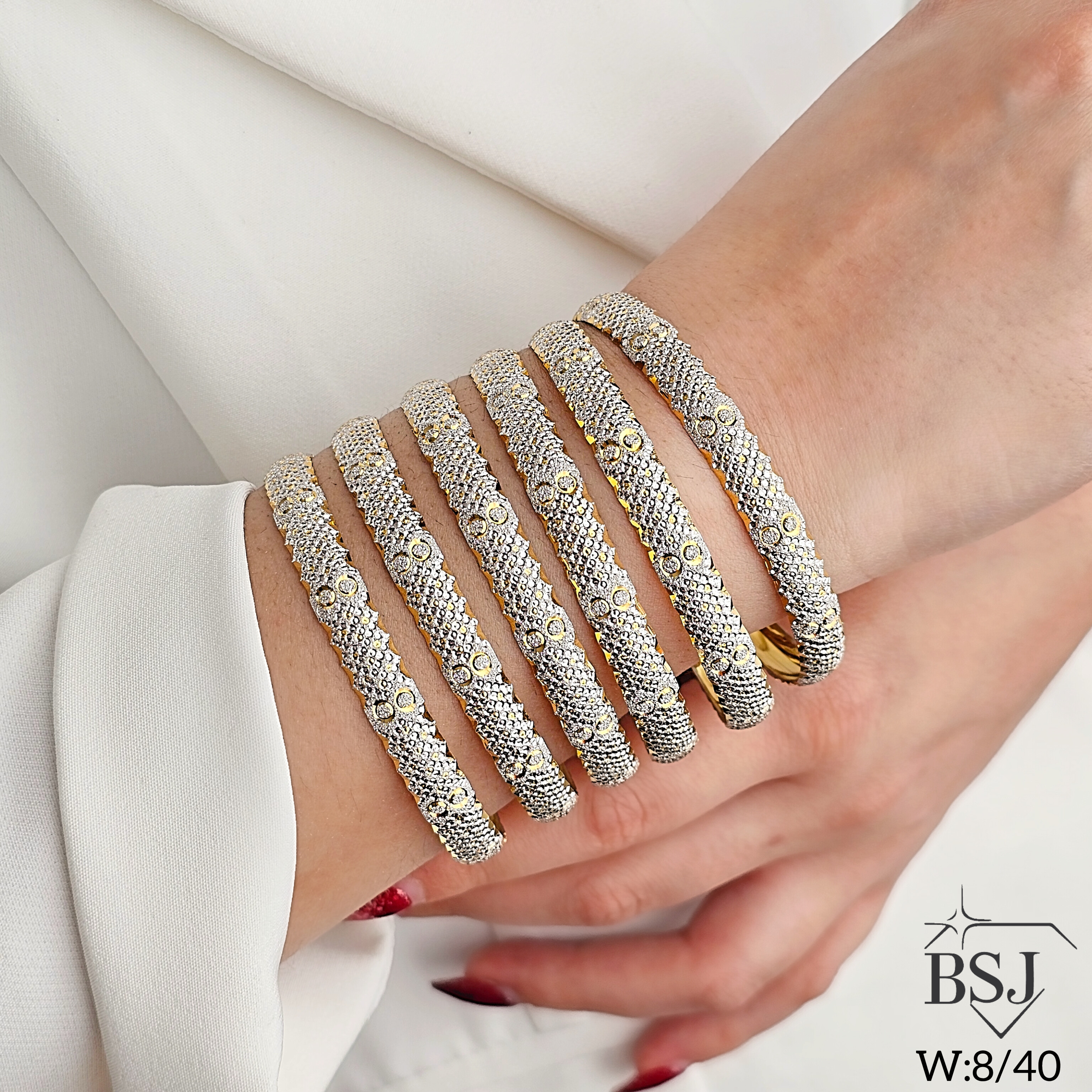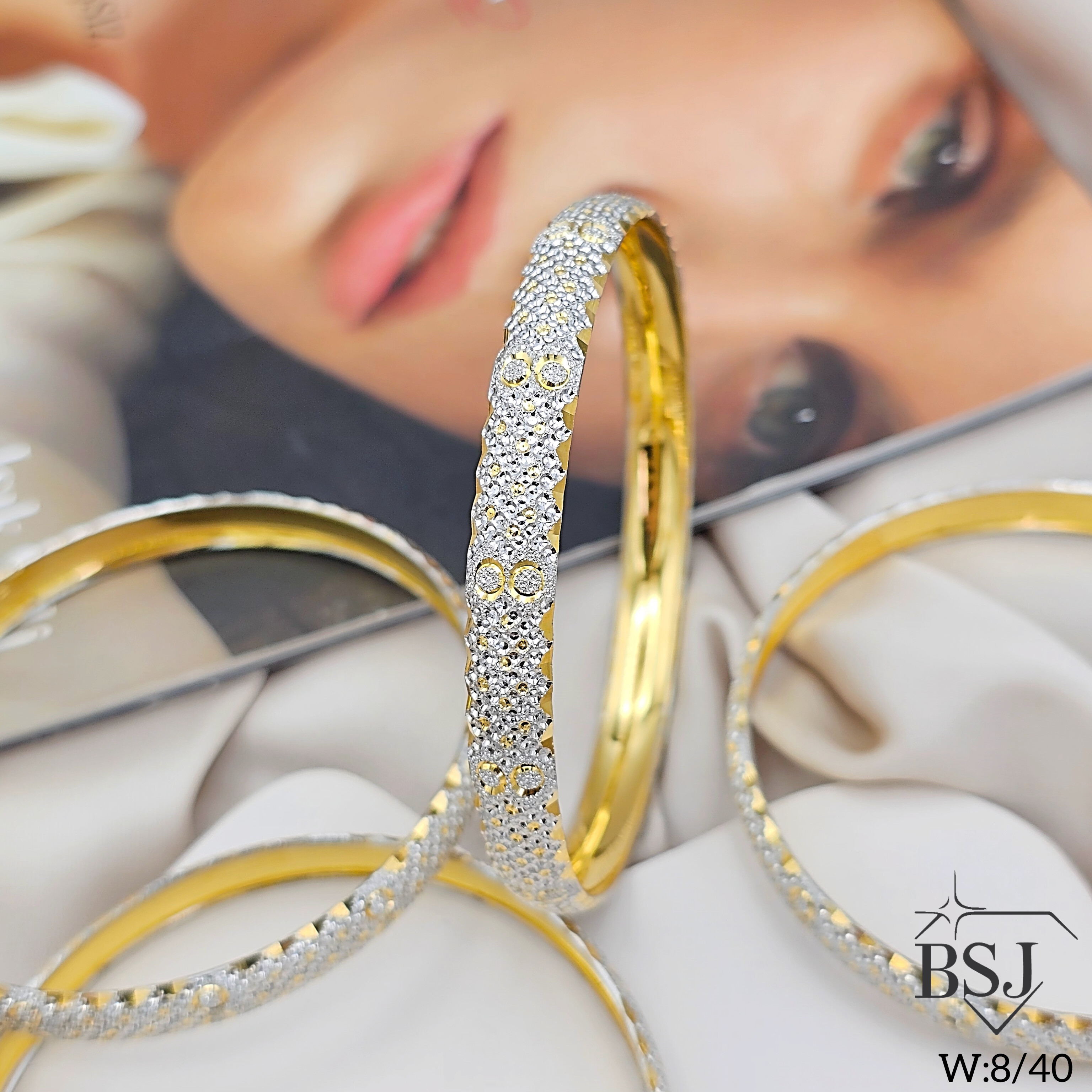 النگو نقره زنانه اسما BSJ-A579 ساخته شده از نقره با عیار 925 می باشد.این النگو تماما از جنس نقره می باشد.آبکاری دو مرحله ای ترکیبی رودیوم (طلاسفید) و طلازرد نانو، سبب کیفیت بی نظیر دوام رنگ آن شده است و به دلیل عدم استفاده از نیکل در ساختار آن، بدون حساسیت بوده و با پوست حساس سازگار است.به دلیل کیفیت فوق العاده و درخشش عالی آن، تفاوتی با نمونه طلا ندارد.وزن النگو8.4 گرم می باشد.النگوها در چهار سایز یک تا چهار زنانه قابل خرید می باشند، ضمناً سایز پنج زنانه و سایز بچگانه به صورت جداگانه قابل سفارش می باشد.