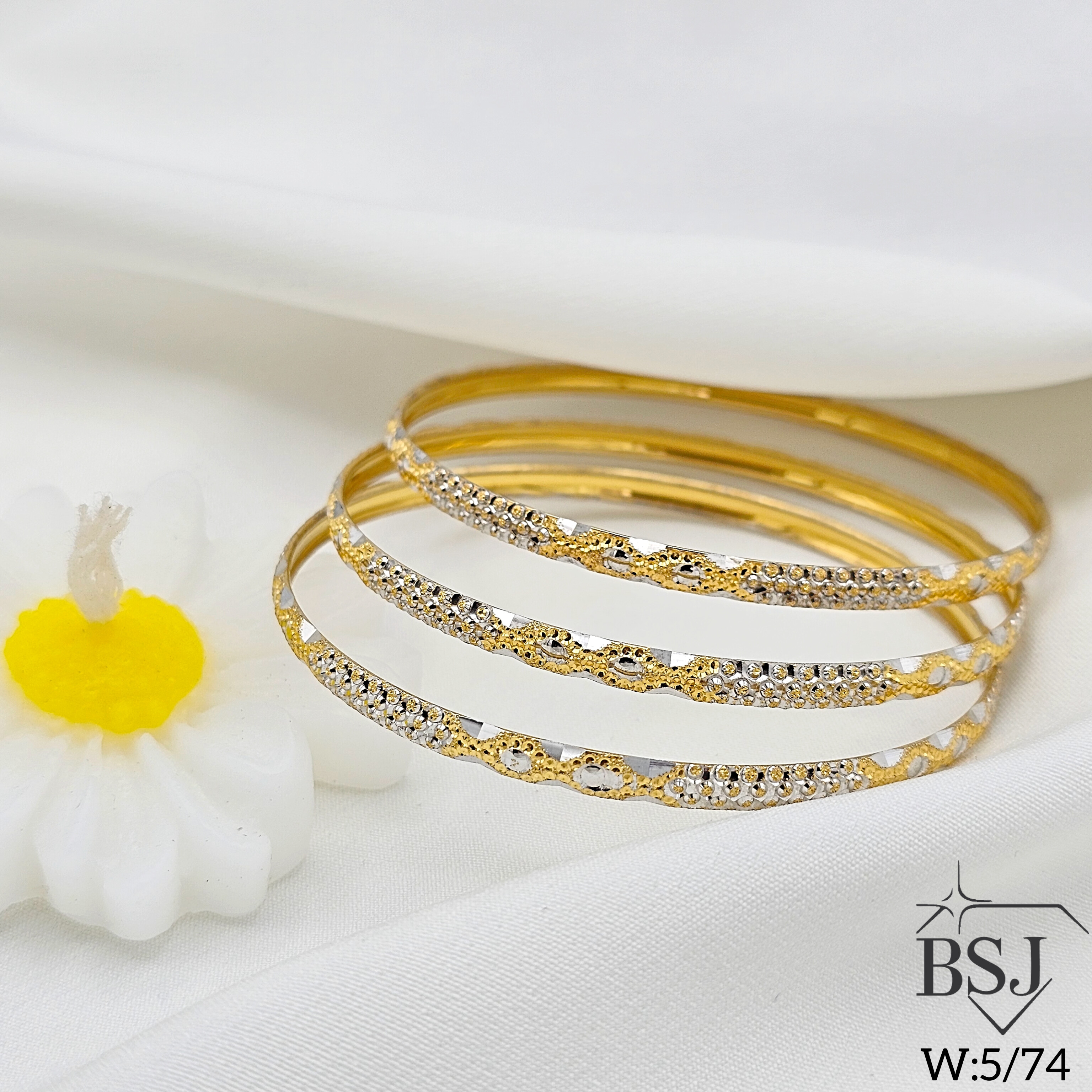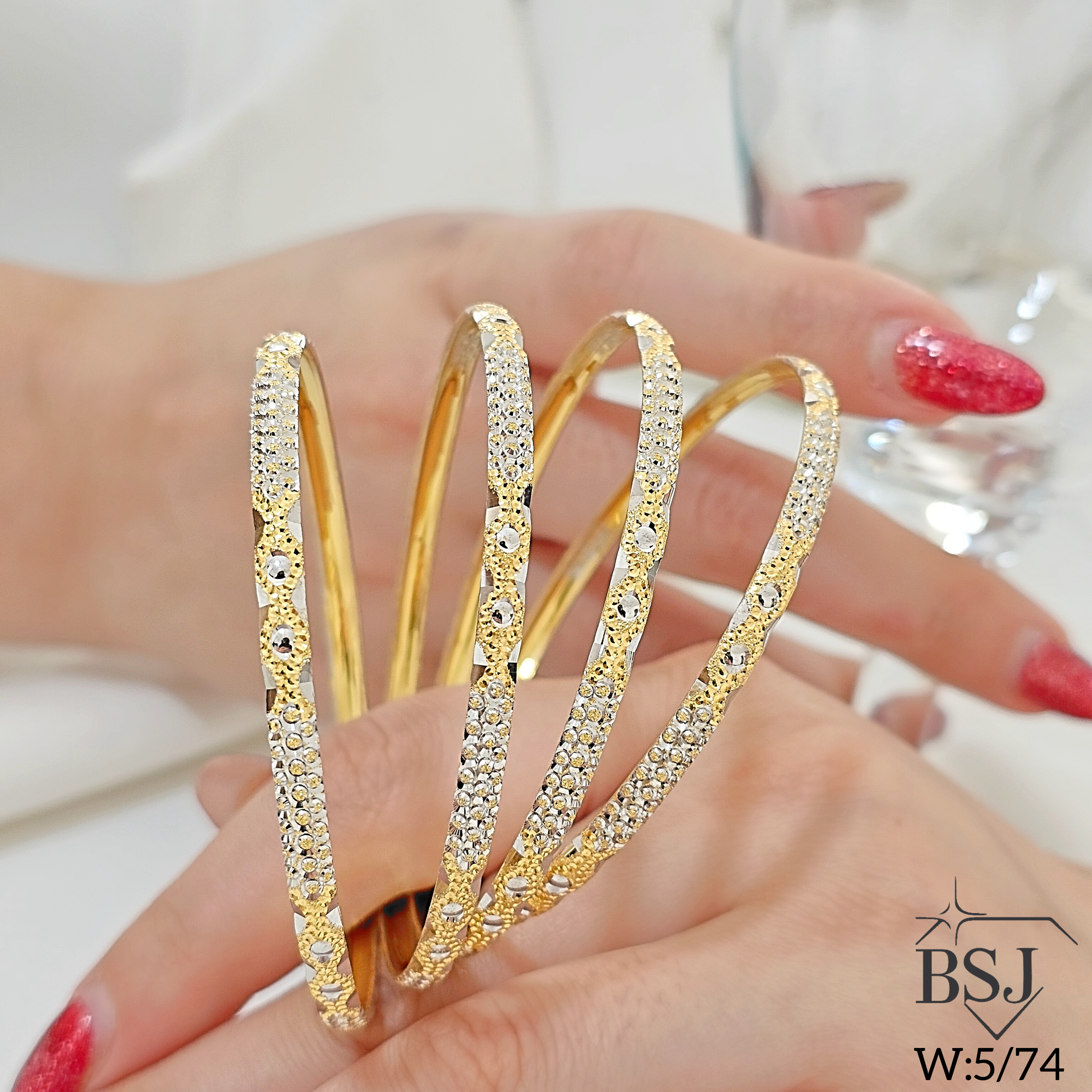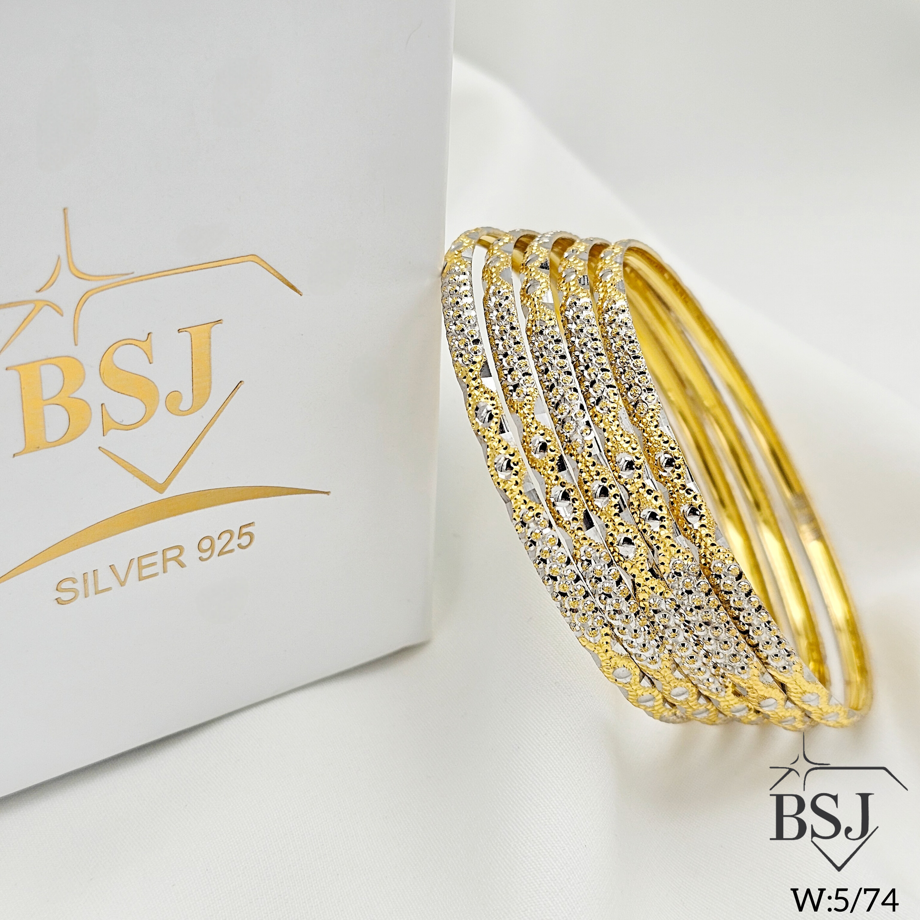 النگو نقره زنانه اسما BSJ-A585 ساخته شده از نقره با عیار 925 می باشد.این النگو تماما از جنس نقره می باشد.آبکاری دو مرحله ای ترکیبی رودیوم (طلاسفید) و طلازرد نانو، سبب کیفیت بی نظیر دوام رنگ آن شده است و به دلیل عدم استفاده از نیکل در ساختار آن، بدون حساسیت بوده و با پوست حساس سازگار است.به دلیل کیفیت فوق العاده و درخشش عالی آن، تفاوتی با نمونه طلا ندارد.وزن النگو 5.74 گرم می باشد.النگوها در چهار سایز یک تا چهار زنانه قابل خرید می باشند، ضمناً سایز پنج زنانه و سایز بچگانه به صورت جداگانه قابل سفارش می باشد.