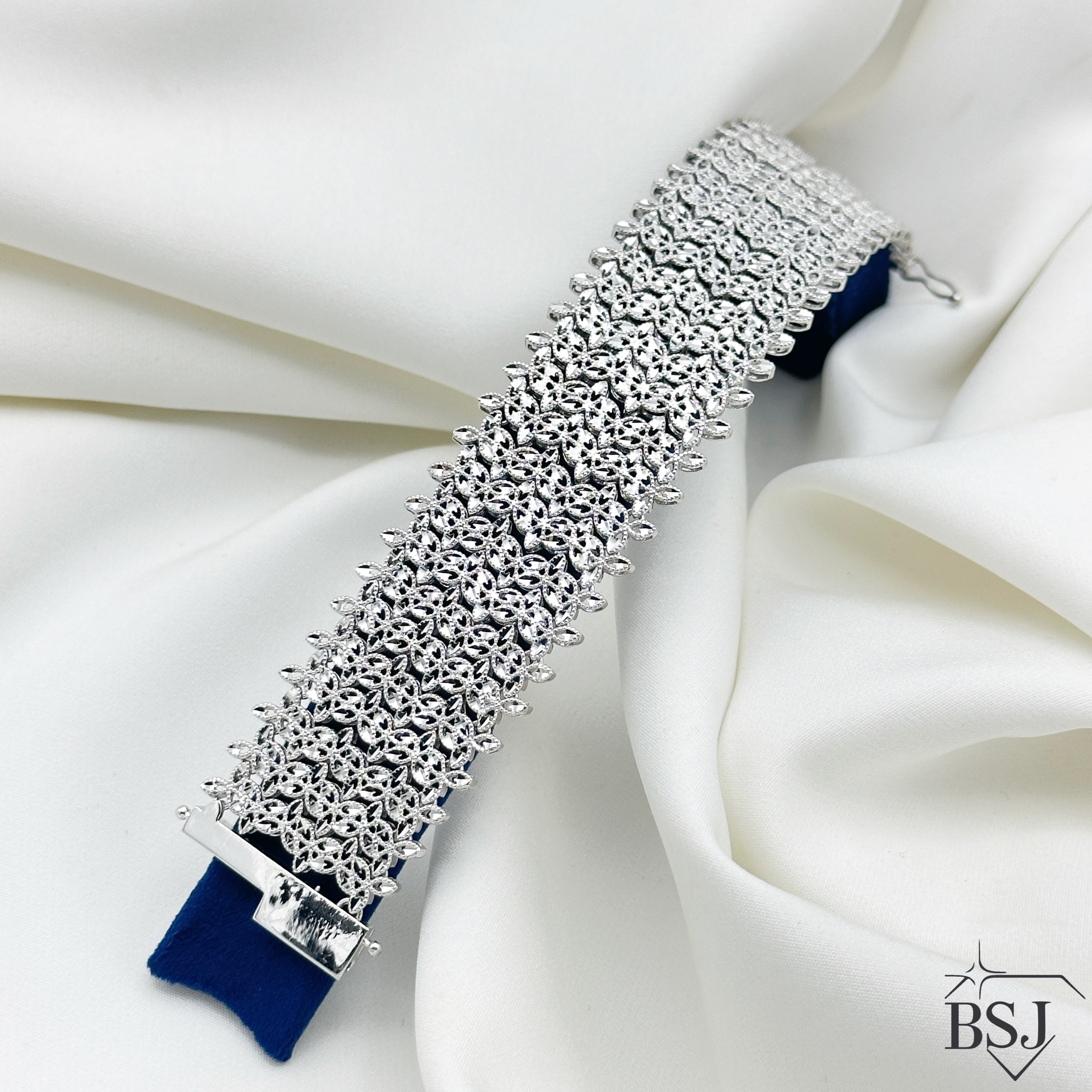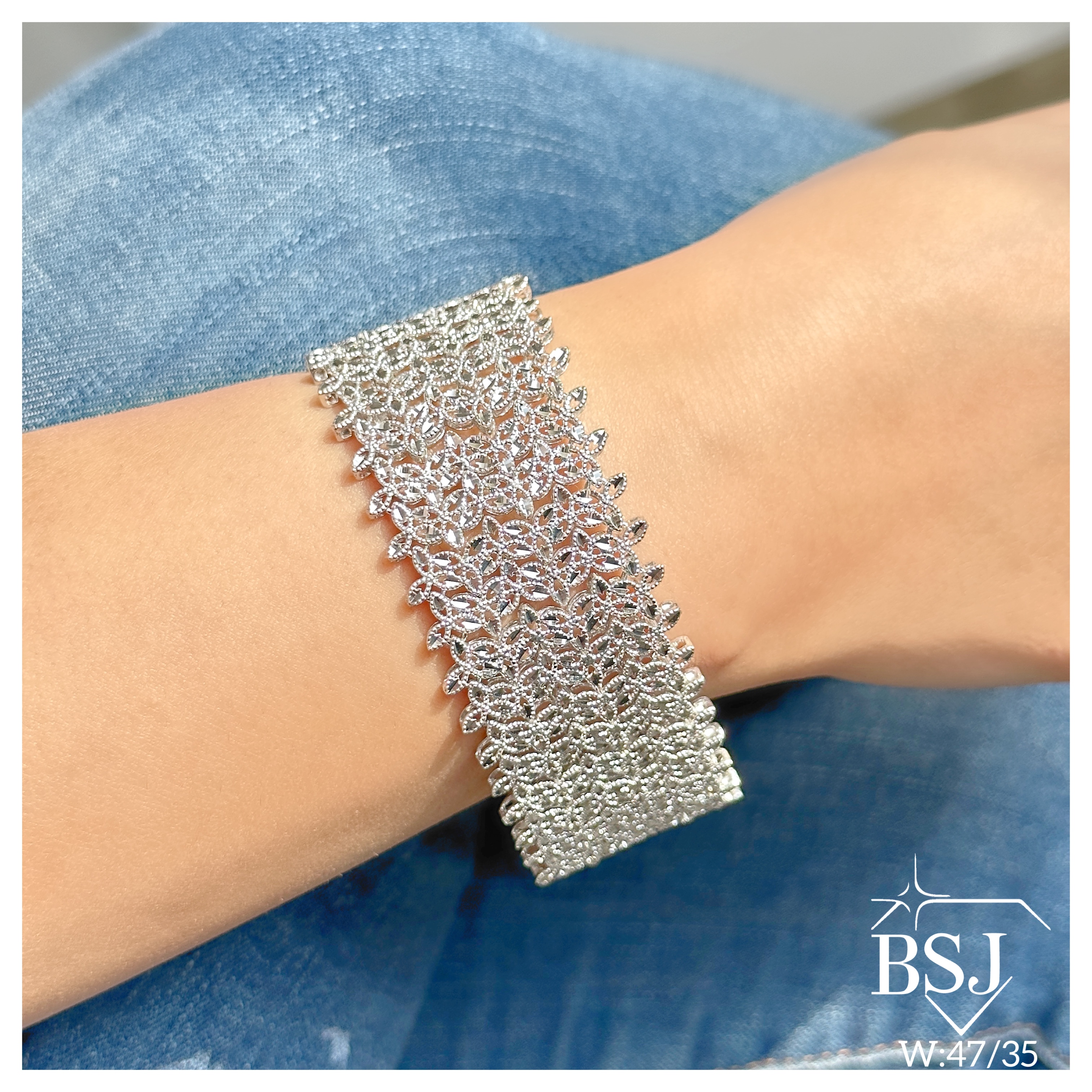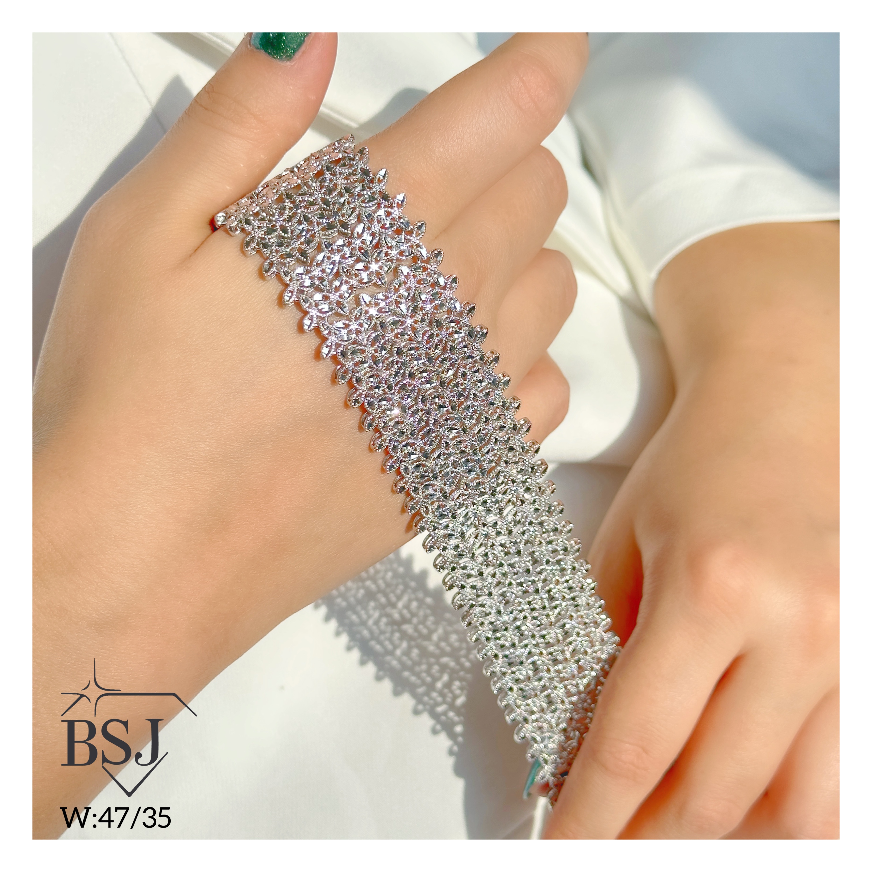 دستبند نقره تراش زنانه BSJ_D554 از دستبندهای شیک ساخته شده از نقره با عیار 925 می باشد.این دستبند بدون نگین بوده و تماما از جنس نقره می باشد.آبکاری دو مرحله ای رودیوم (طلا سفید)، سبب کیفیت بی نظیر دوام رنگ آن شده است و به دلیل عدم استفاده از نیکل در ساختار آن، بدون حساسیت بوده و با پوست حساس سازگار است.وزن دستبند 47.35 گرم می باشد.