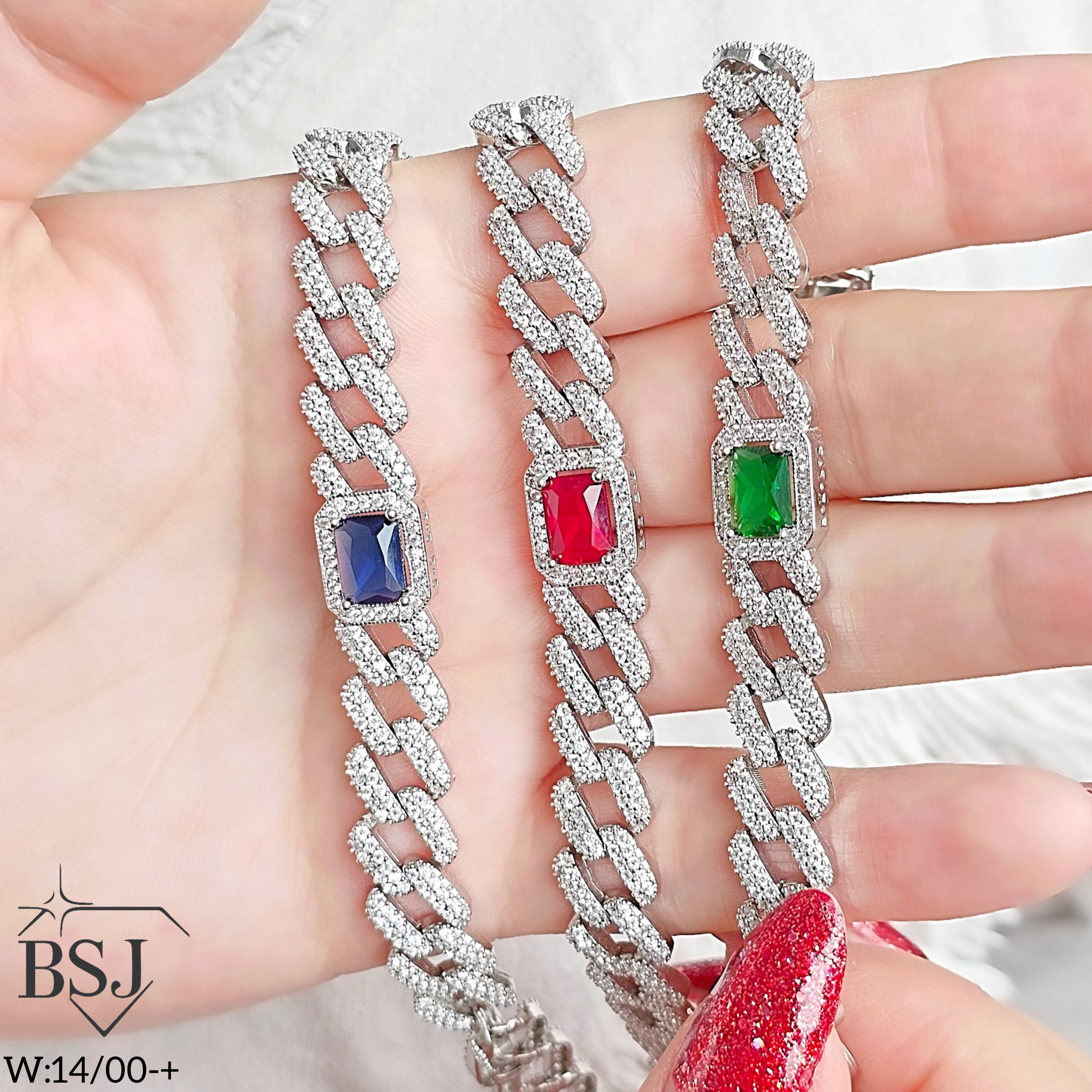 دستبند نقره جواهری زنانه BSJ_D587 یکی از دستبندهای پرفروش و با طرح کارتیه ساخته شده از نقره با عیار 925 می باشد.سنگ های به کار رفته در آن برلیان از جنس اتمی زیرکونیا و نگین های رنگی سنتتیک (آزمایشکاهی )می باشند که به صورت میکروستینگ مخراج کاری شده اند و در برابر ضربه مقاوم اند.آبکاری دو مرحله ای رودیوم (طلا سفید)، سبب کیفیت بی نظیر دوام رنگ آن شده است و به دلیل عدم استفاده از نیکل در ساختار آن، بدون حساسیت بوده و با پوست حساس سازگار است.وزن دستبند +- 14 گرم می باشد.