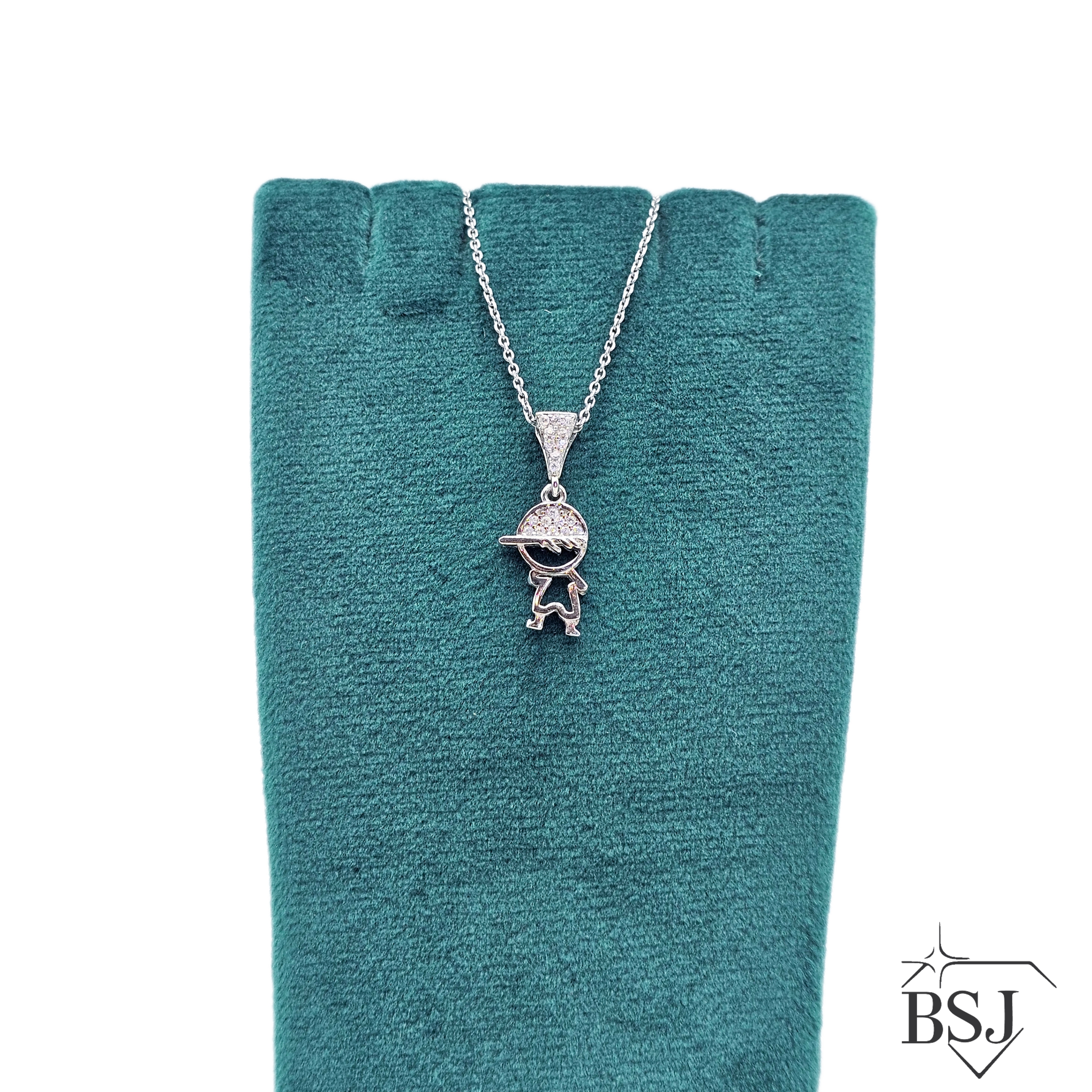آویز گردنبند نقره طرح آدمک پسر BSJ_G568 از قشنگترین گردنبندهای ساخته شده از نقره با عیار 925 می باشد.سنگ های به کار رفته در آن برلیان از جنس اتمی زیرکونیا می باشند که به صورت میکروستینگ مخراج کاری شده اند و در برابر ضربه مقاوم اند.آبکاری دو مرحله ای رودیوم (طلا سفید)، سبب کیفیت بی نظیر دوام رنگ آن شده است و به دلیل عدم استفاده از نیکل در ساختار آن، بدون حساسیت بوده و با پوست حساس سازگار است.وزن مدال +-1.5 گرم می باشد.