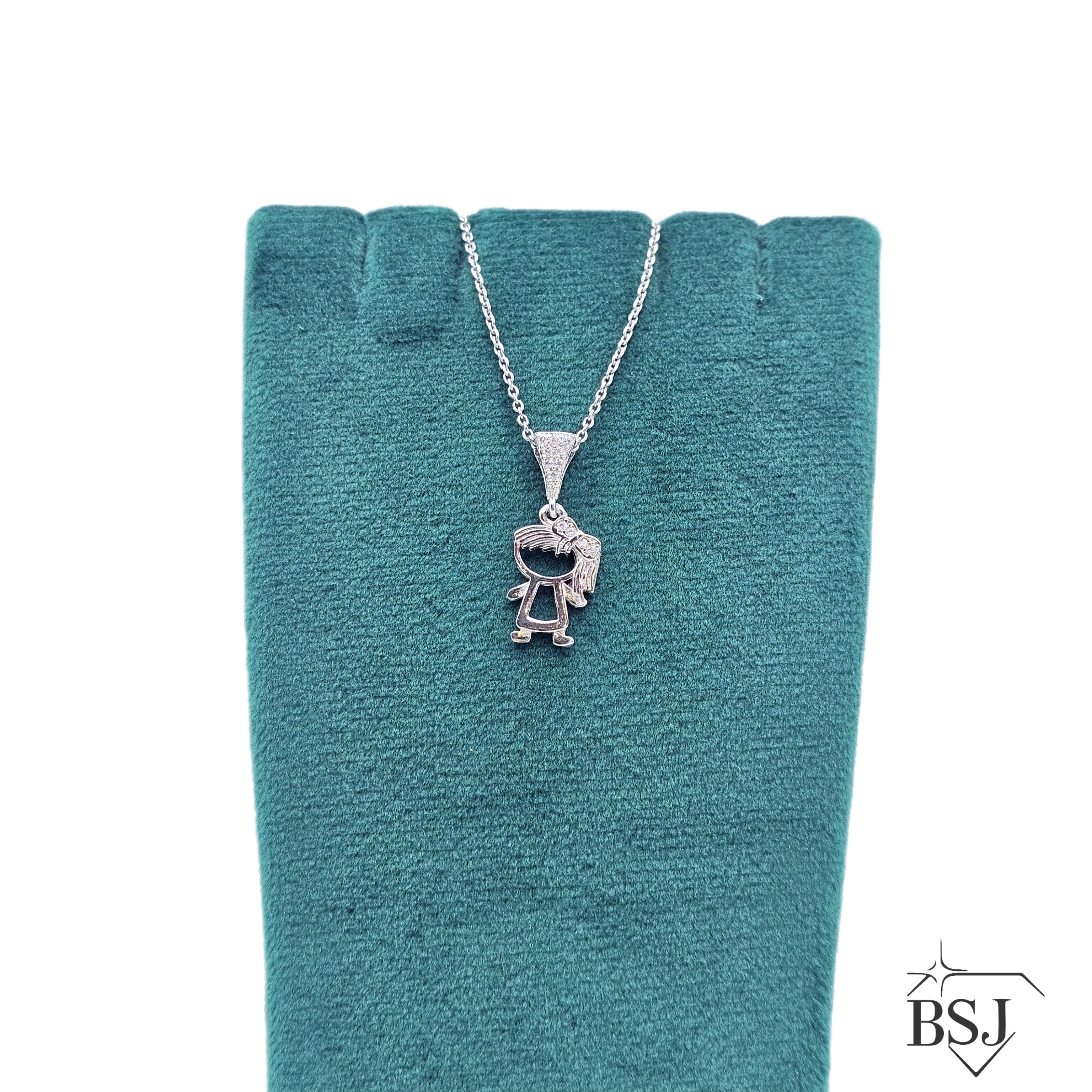 آویز گردنبند نقره طرح آدمک دختر BSJ_G569 از قشنگترین گردنبندهای ساخته شده از نقره با عیار 925 می باشد.سنگ های به کار رفته در آن برلیان از جنس اتمی زیرکونیا می باشند که به صورت میکروستینگ مخراج کاری شده اند و در برابر ضربه مقاوم اند.آبکاری دو مرحله ای رودیوم (طلا سفید)، سبب کیفیت بی نظیر دوام رنگ آن شده است و به دلیل عدم استفاده از نیکل در ساختار آن، بدون حساسیت بوده و با پوست حساس سازگار است.وزن مدال +-1.5 گرم می باشد.