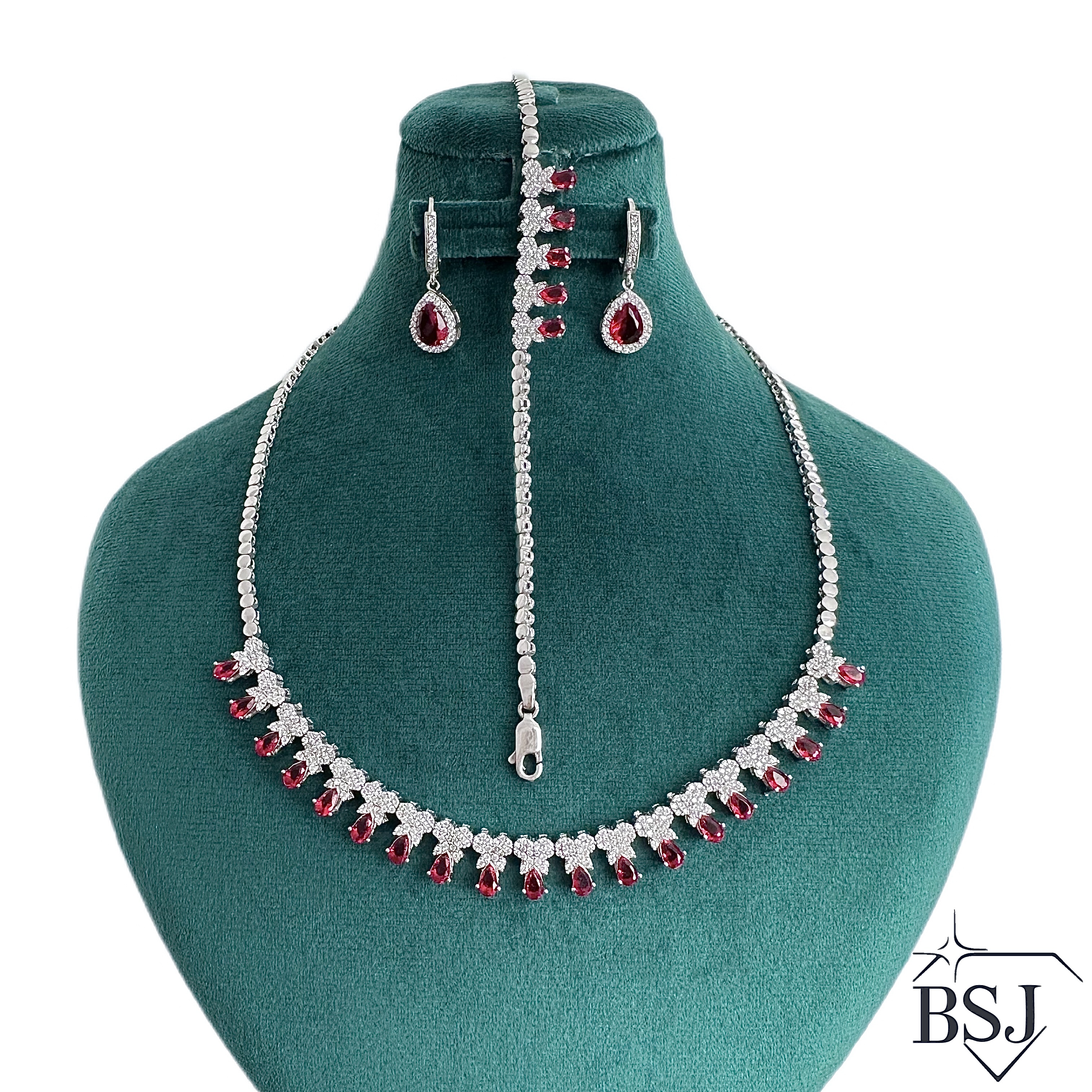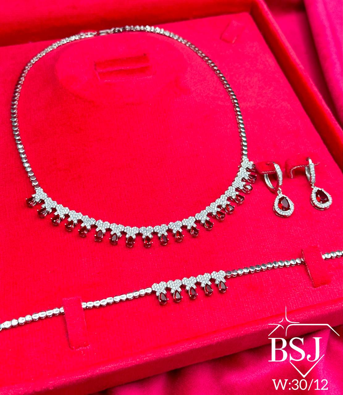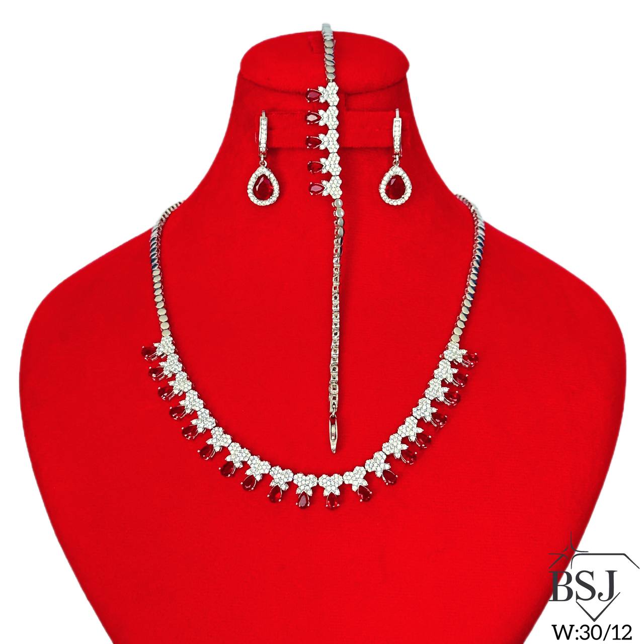 سرویس نقره جواهری زنانه BSJ_S290 از سرویس های اعیانی ساخته شده از نقره با عیار 925 می باشد.سنگ های به کار رفته در آن برلیان و از جنس اتمی زیرکونیا و نگین های سفید و قرمز سنتتیک (آزمایشگاهی) به شکل اشک می باشند که به صورت میکروستینگ مخراج کاری شده اند و در برابر ضربه مقاوم اند.آبکاری دو مرحله ای رودیوم (طلا سفید)، سبب کیفیت بی نظیر دوام رنگ آن شده است و به دلیل عدم استفاده از نیکل در ساختار آن، بدون حساسیت بوده و با پوست حساس سازگار است.به دلیل کیفیت فوق العاده و درخشش عالی سنگ ها، تفاوتی با نمونه طلا ندارد.وزن سرویس 30.16 گرم می باشد.
