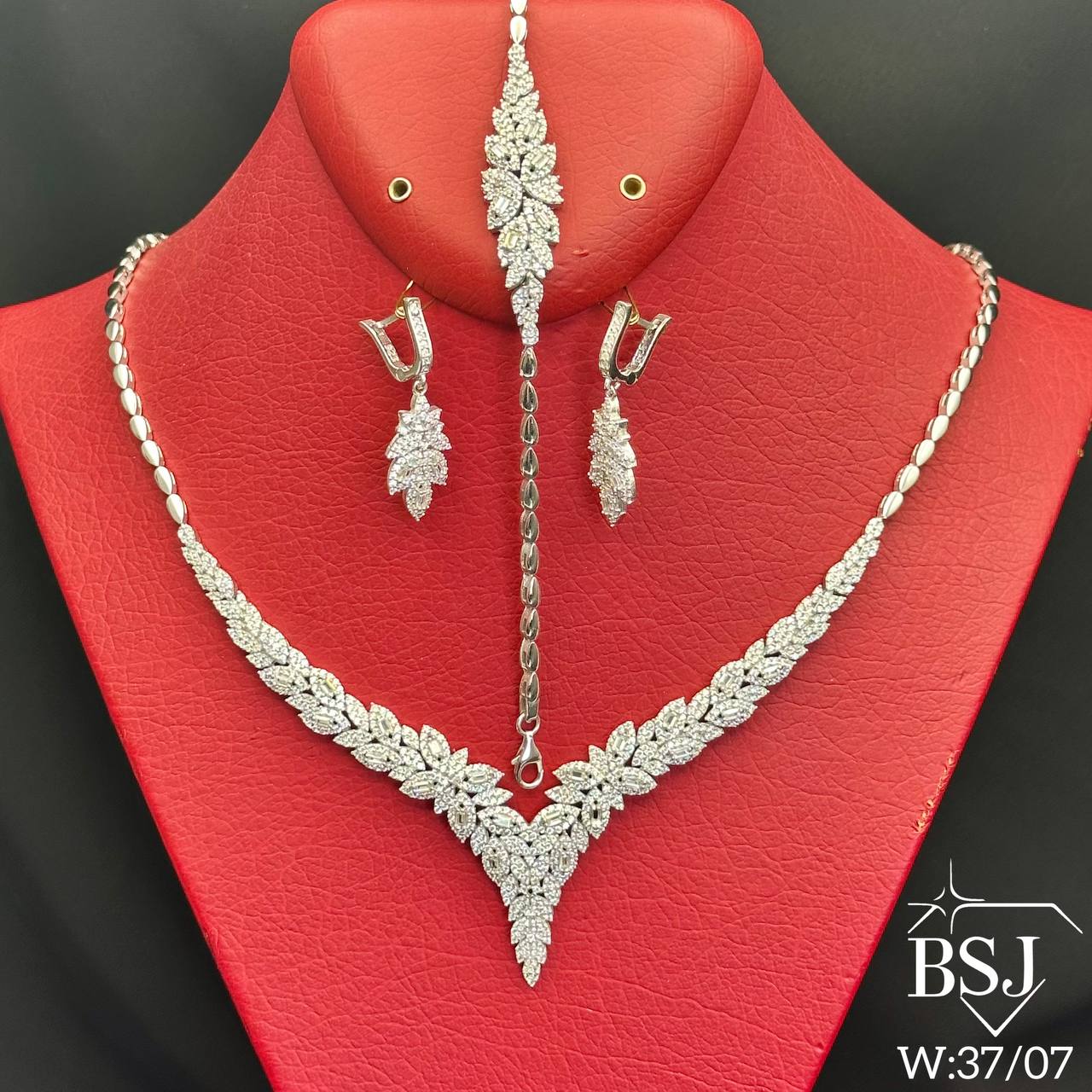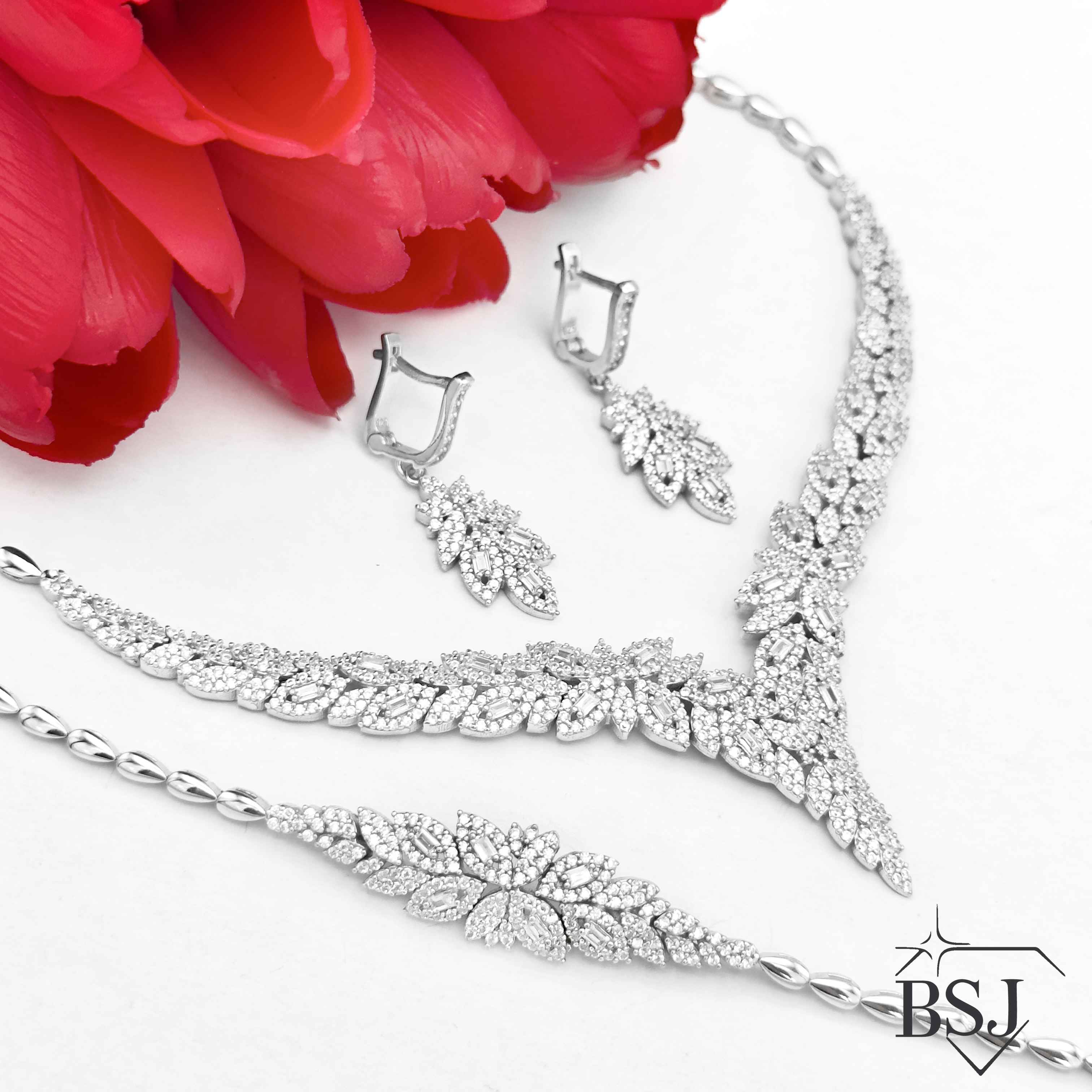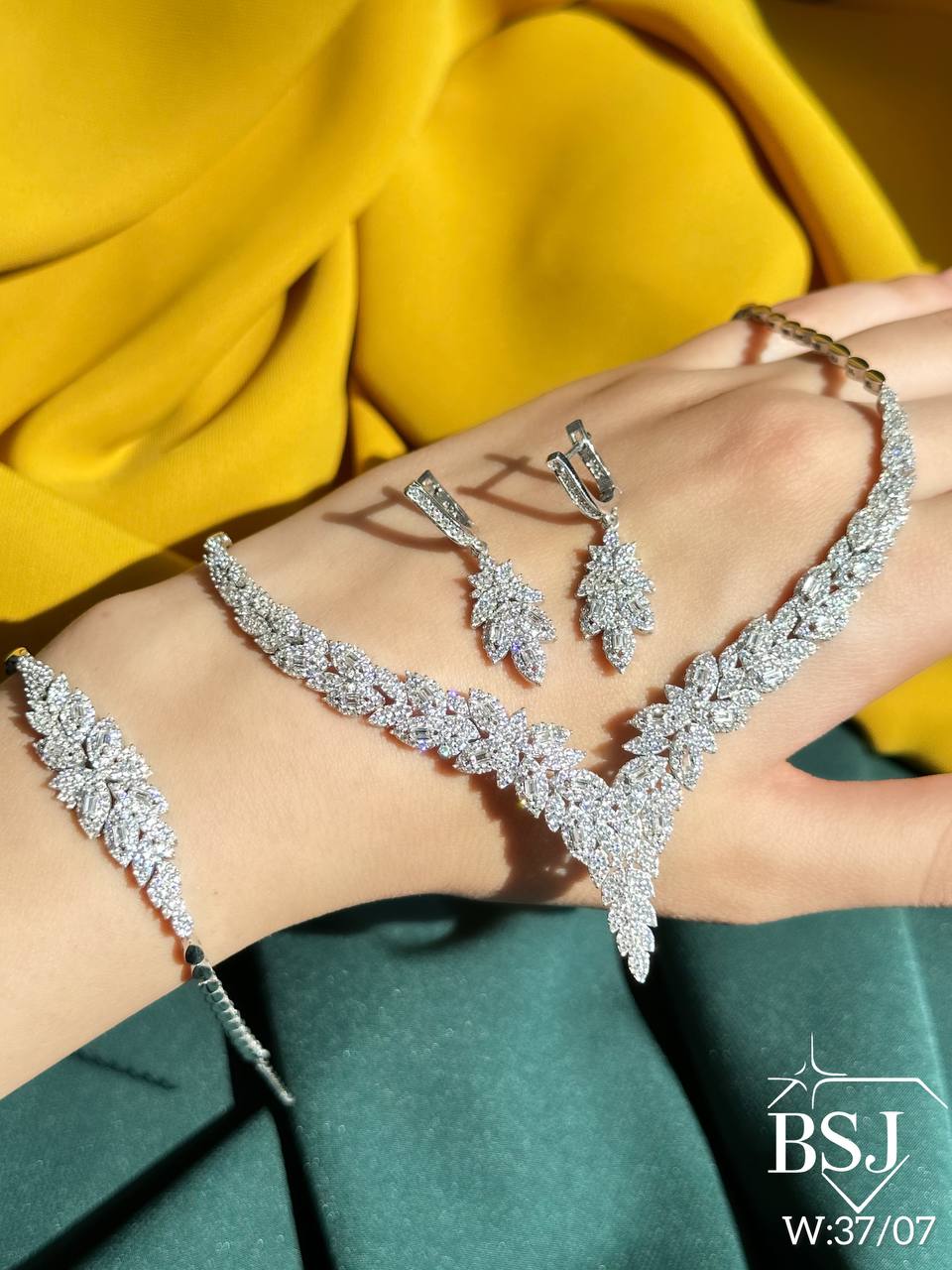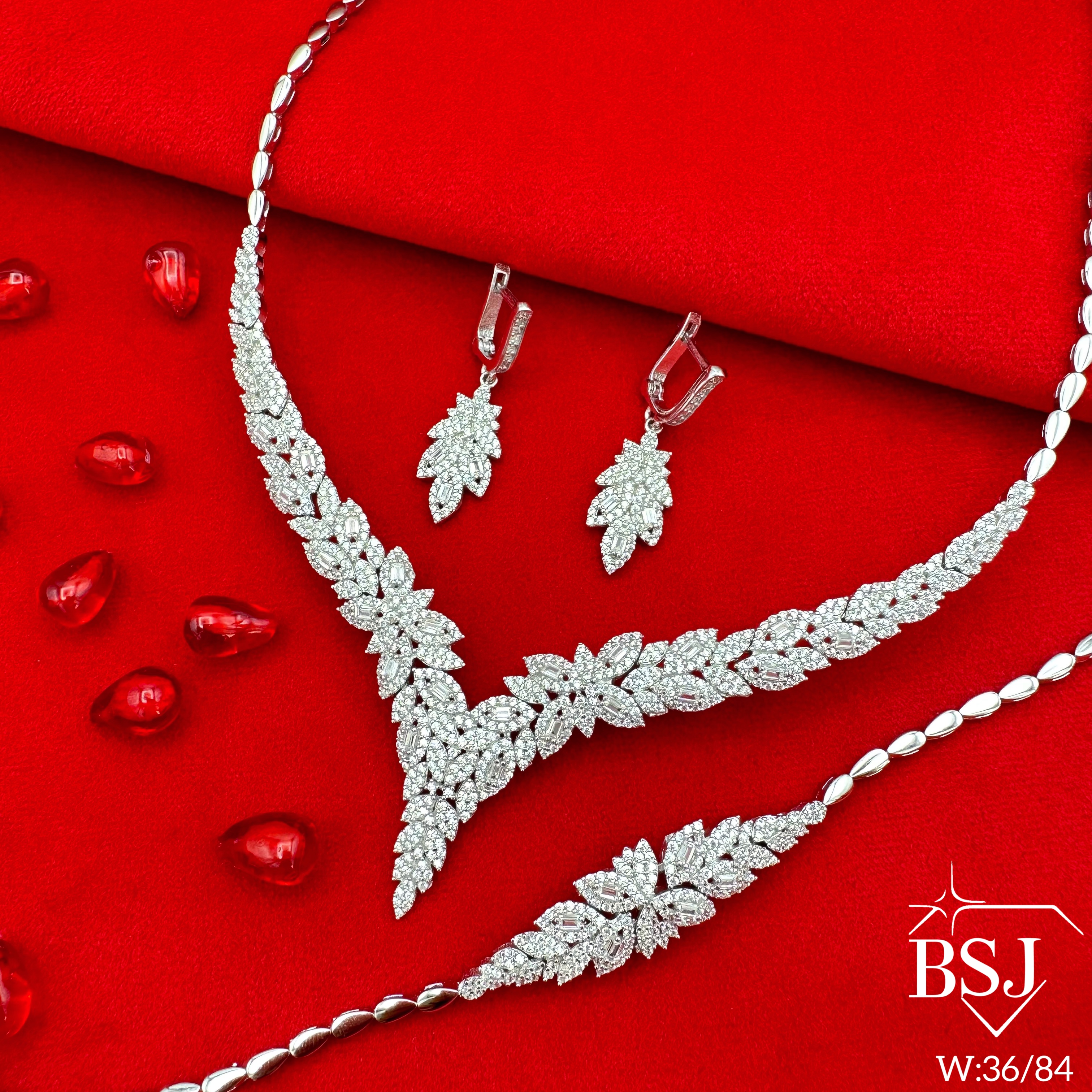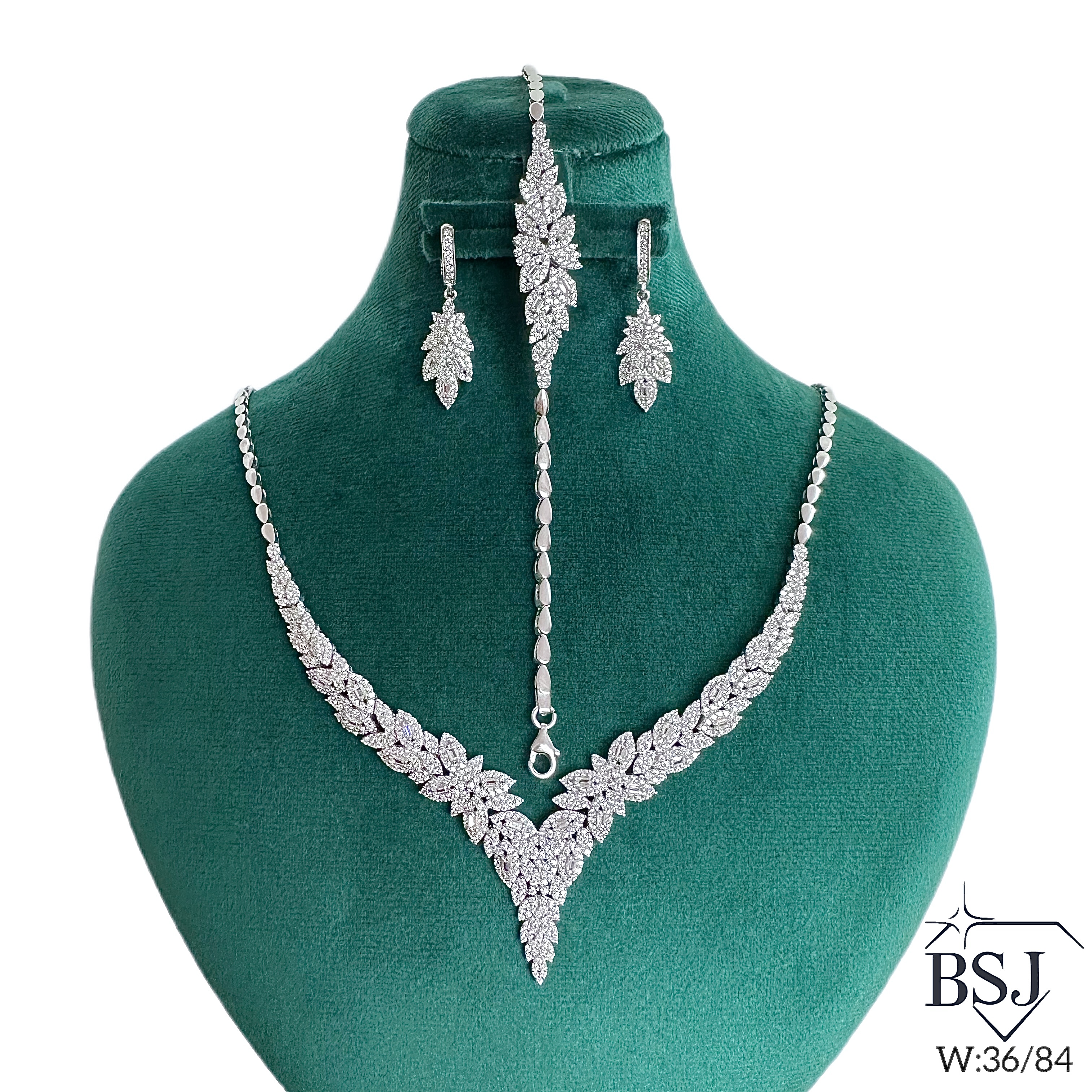 سرویس نقره جواهری زنانه BSJ_S292 از سرویس های اعیانی ساخته شده از نقره با عیار 925 می باشد.سنگ های به کار رفته در آن برلیان و امرالد از جنس اتمی زیرکونیا می باشند که به صورت میکروستینگ مخراج کاری شده اند و در برابر ضربه مقاوم اند.آبکاری دو مرحله ای رودیوم (طلا سفید)، سبب کیفیت بی نظیر دوام رنگ آن شده است و به دلیل عدم استفاده از نیکل در ساختار آن، بدون حساسیت بوده و با پوست حساس سازگار است.به دلیل کیفیت فوق العاده و درخشش عالی سنگ ها، تفاوتی با نمونه طلا ندارد.وزن سرویس 37.07 گرم می باشد.
