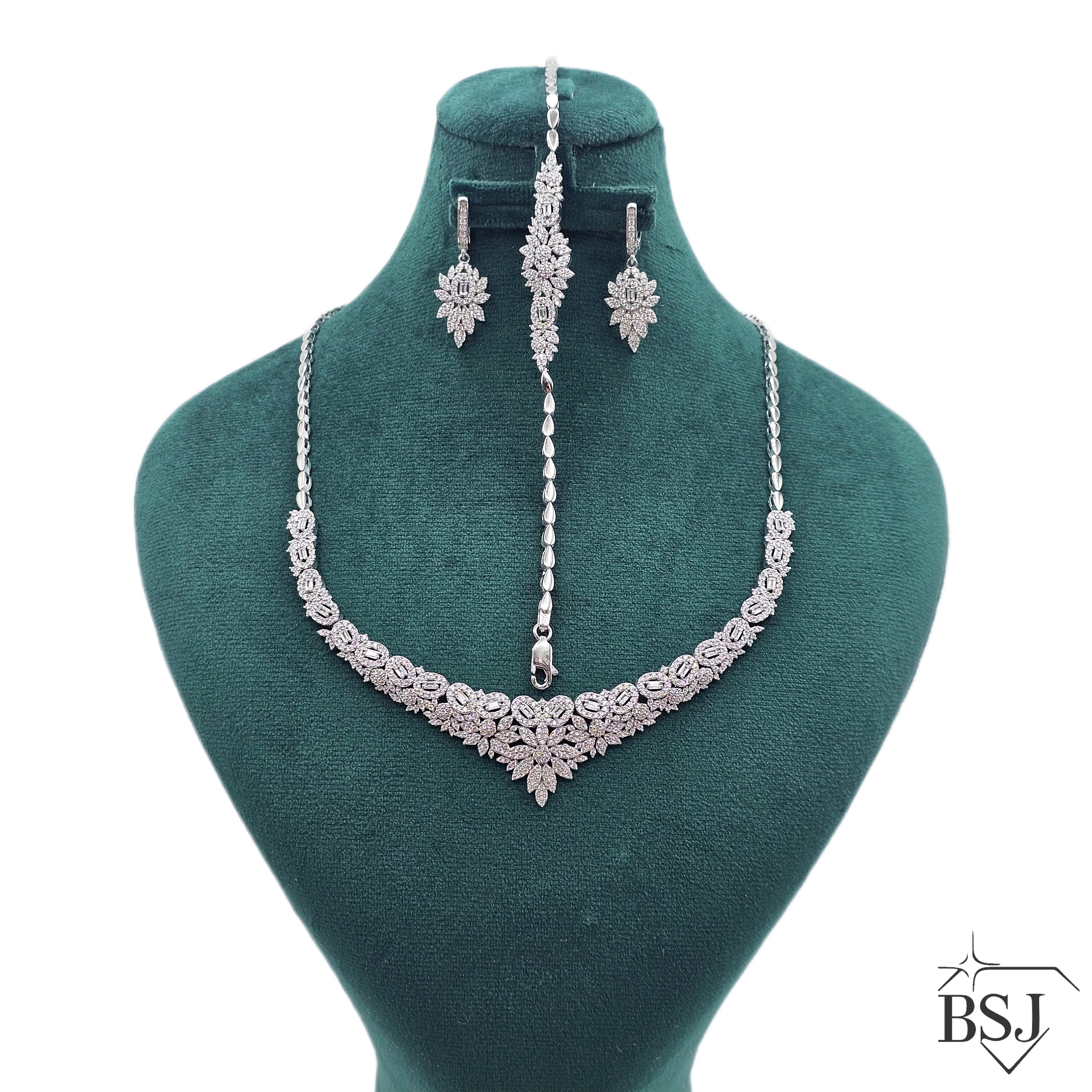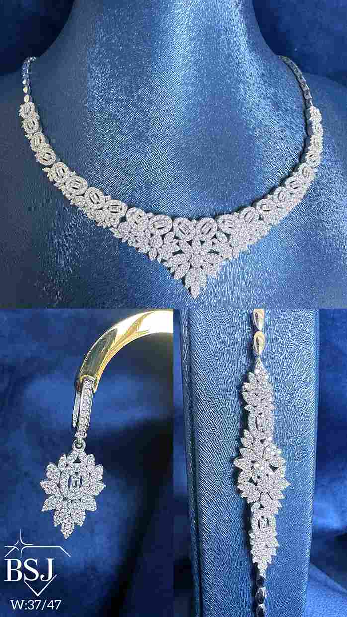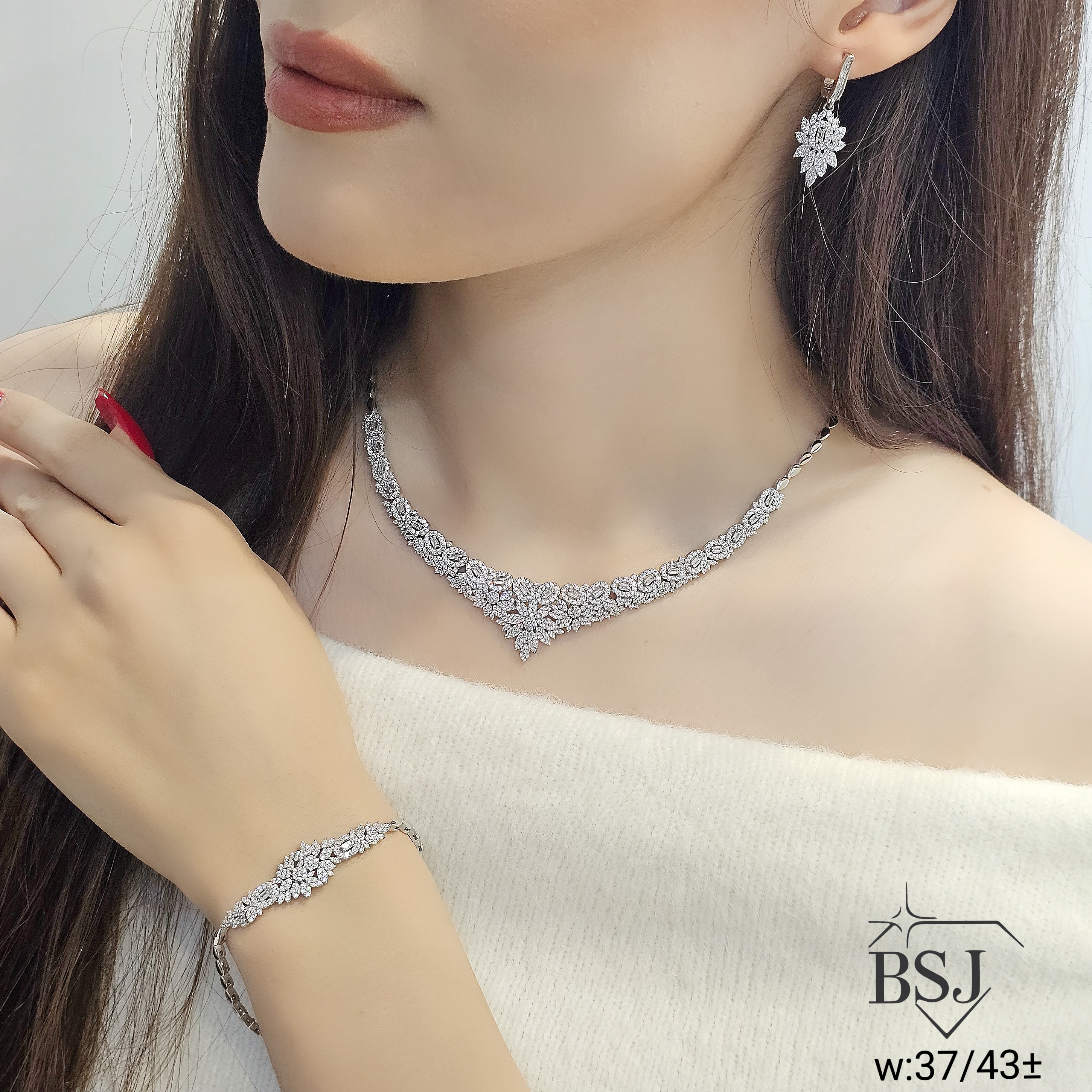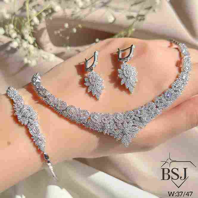 سرویس نقره جواهری زنانه BSJ_S293 از سرویس های مجلسی ساخته شده از نقره با عیار 925 می باشد.سنگ های به کار رفته در آن برلیان و امرالد از جنس اتمی زیرکونیا می باشند که به صورت میکروستینگ مخراج کاری شده اند و در برابر ضربه مقاوم اند.آبکاری دو مرحله ای رودیوم (طلا سفید)، سبب کیفیت بی نظیر دوام رنگ آن شده است و به دلیل عدم استفاده از نیکل در ساختار آن، بدون حساسیت بوده و با پوست حساس سازگار است.به دلیل کیفیت فوق العاده و درخشش عالی سنگ ها، تفاوتی با نمونه طلا ندارد.وزن سرویس +-37.96 گرم می باشد.