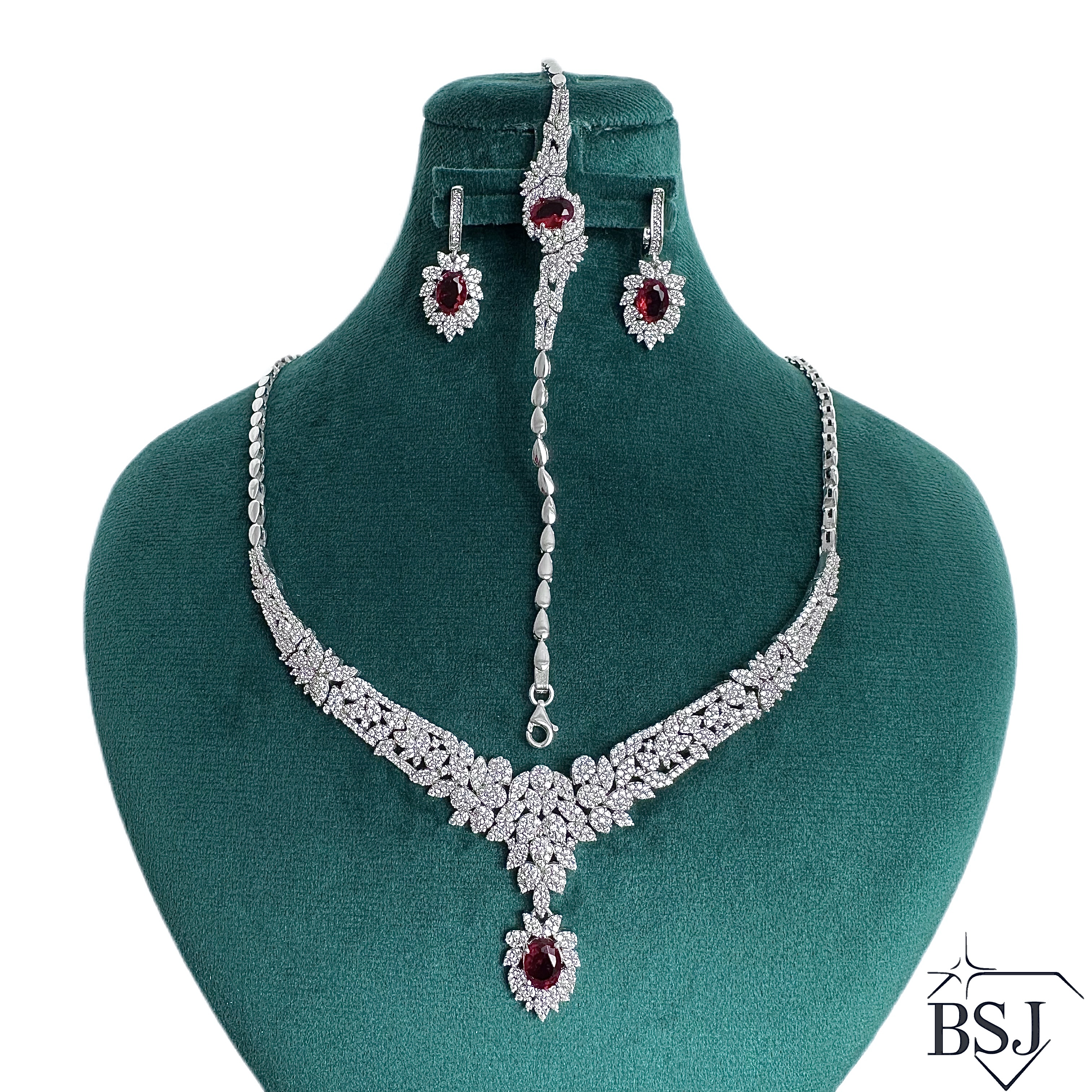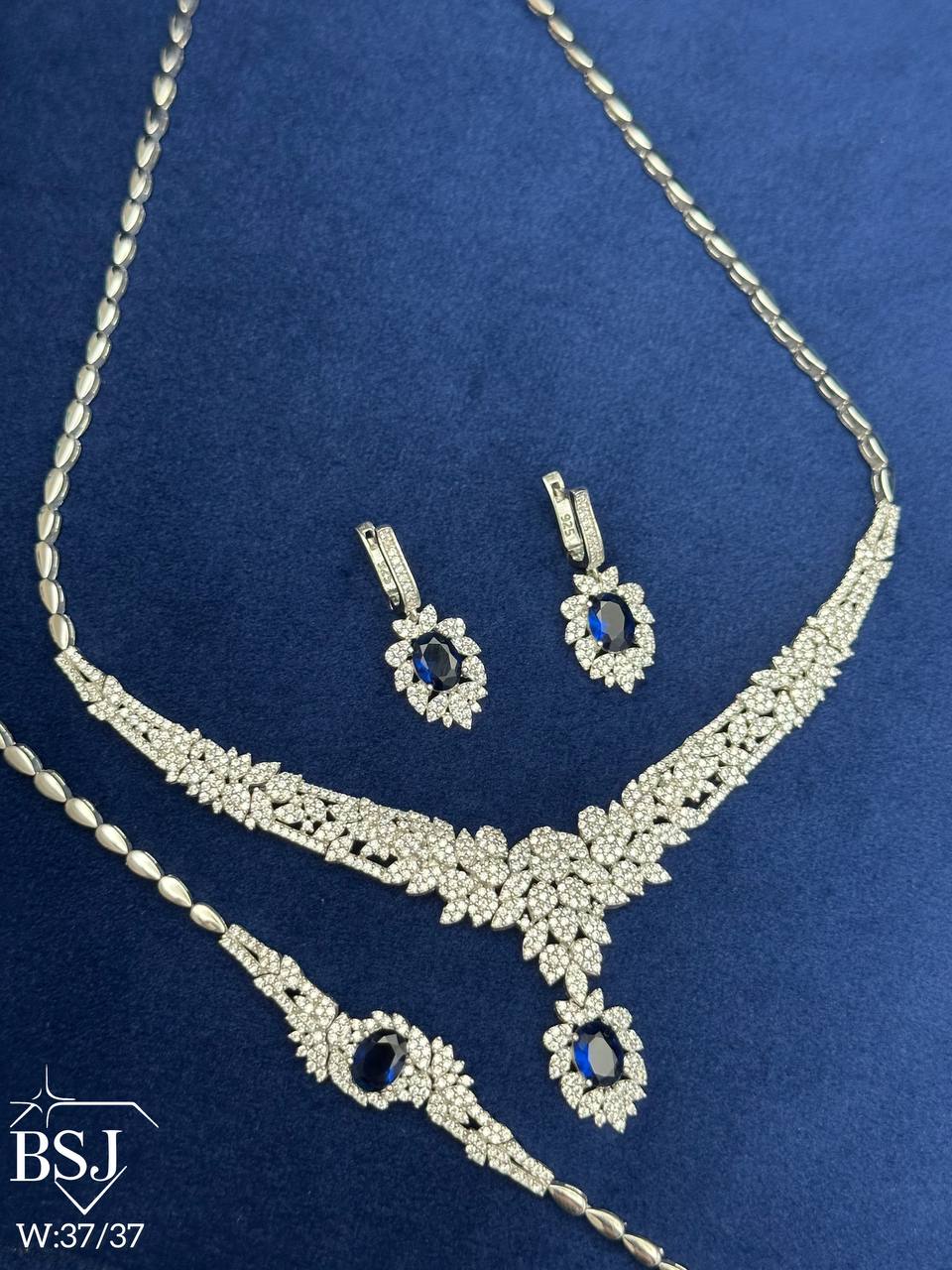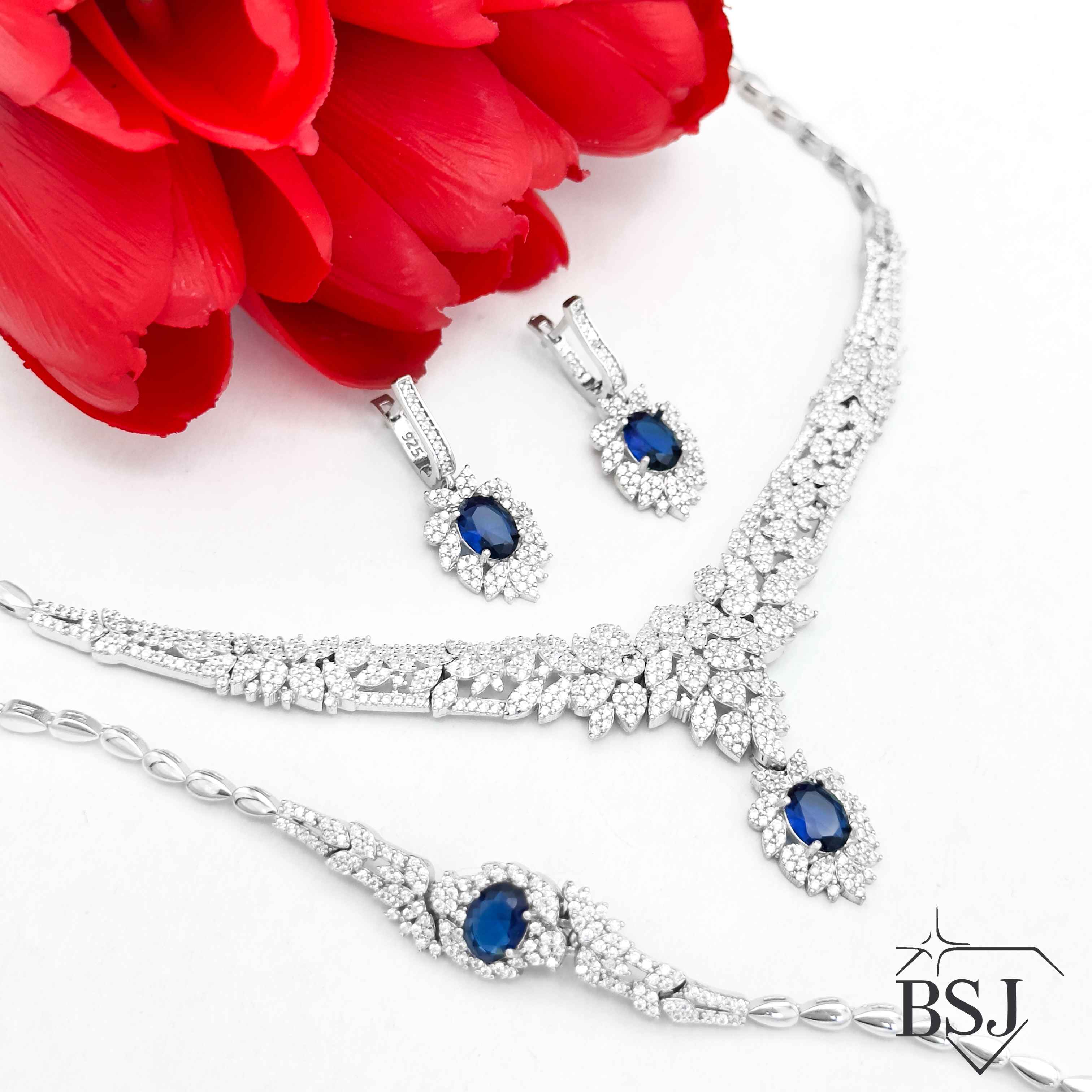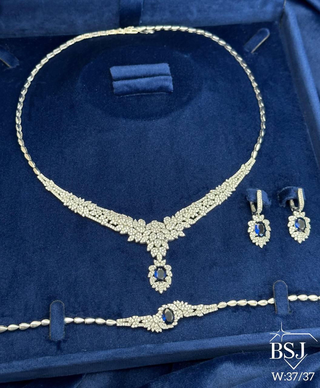 سرویس نقره جواهری زنانه BSJ_S297 از سرویس های اعیانی ساخته شده از نقره با عیار 925 می باشد.سنگ های به کار رفته در آن برلیان و از جنس اتمی زیرکونیا و سنگ های برلیان آبی سنتتیک (آزمایشگاهی) می باشند که به صورت میکروستینگ مخراج کاری شده اند و در برابر ضربه مقاوم اند.آبکاری دو مرحله ای رودیوم (طلا سفید)، سبب کیفیت بی نظیر دوام رنگ آن شده است و به دلیل عدم استفاده از نیکل در ساختار آن، بدون حساسیت بوده و با پوست حساس سازگار است.به دلیل کیفیت فوق العاده و درخشش عالی سنگ ها، تفاوتی با نمونه طلا ندارد.وزن سرویس 37.37 گرم می باشد.