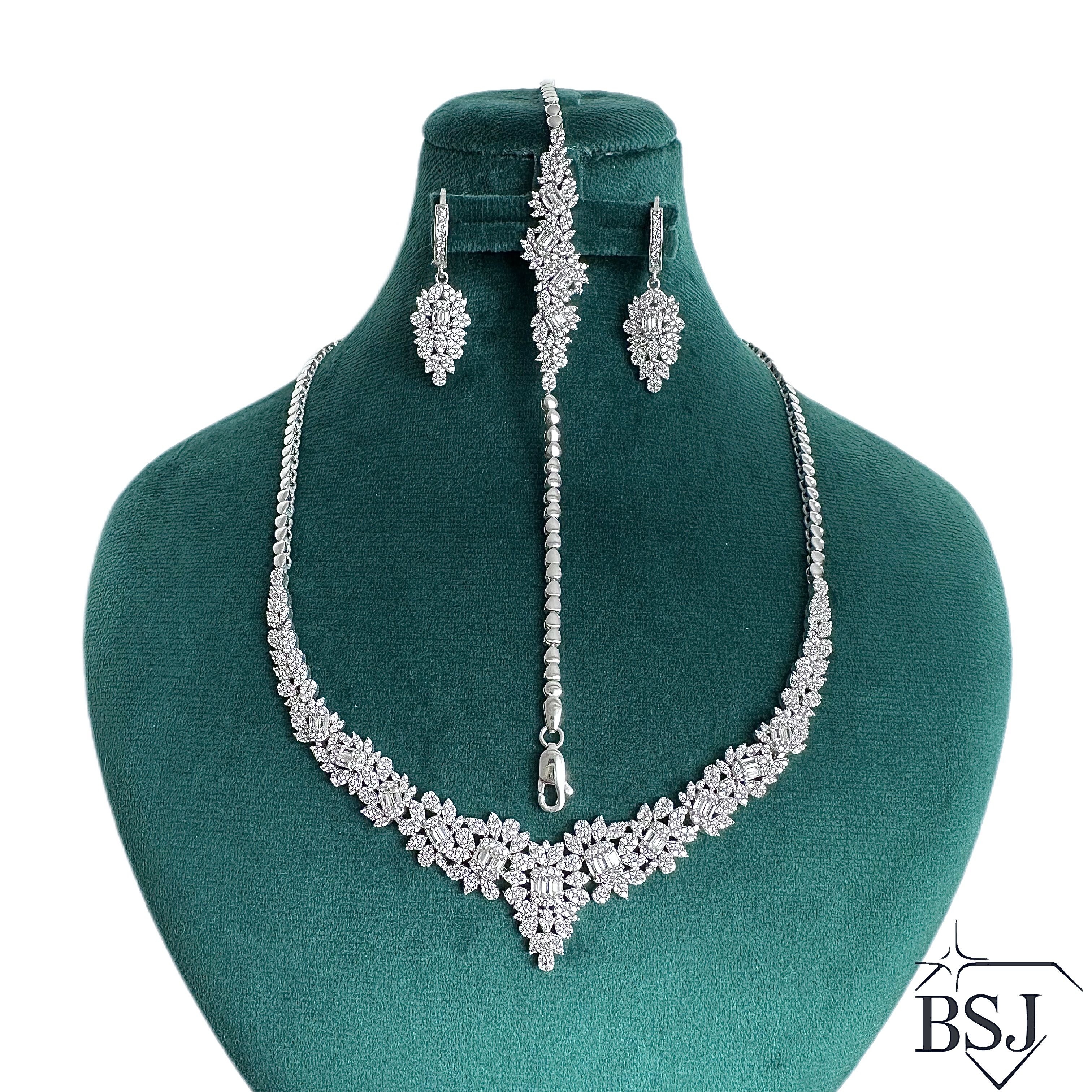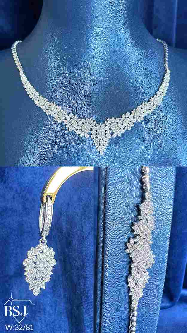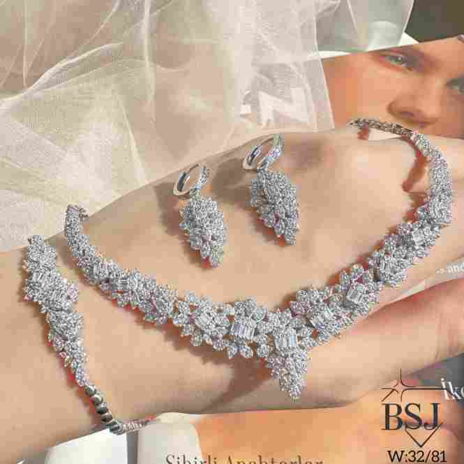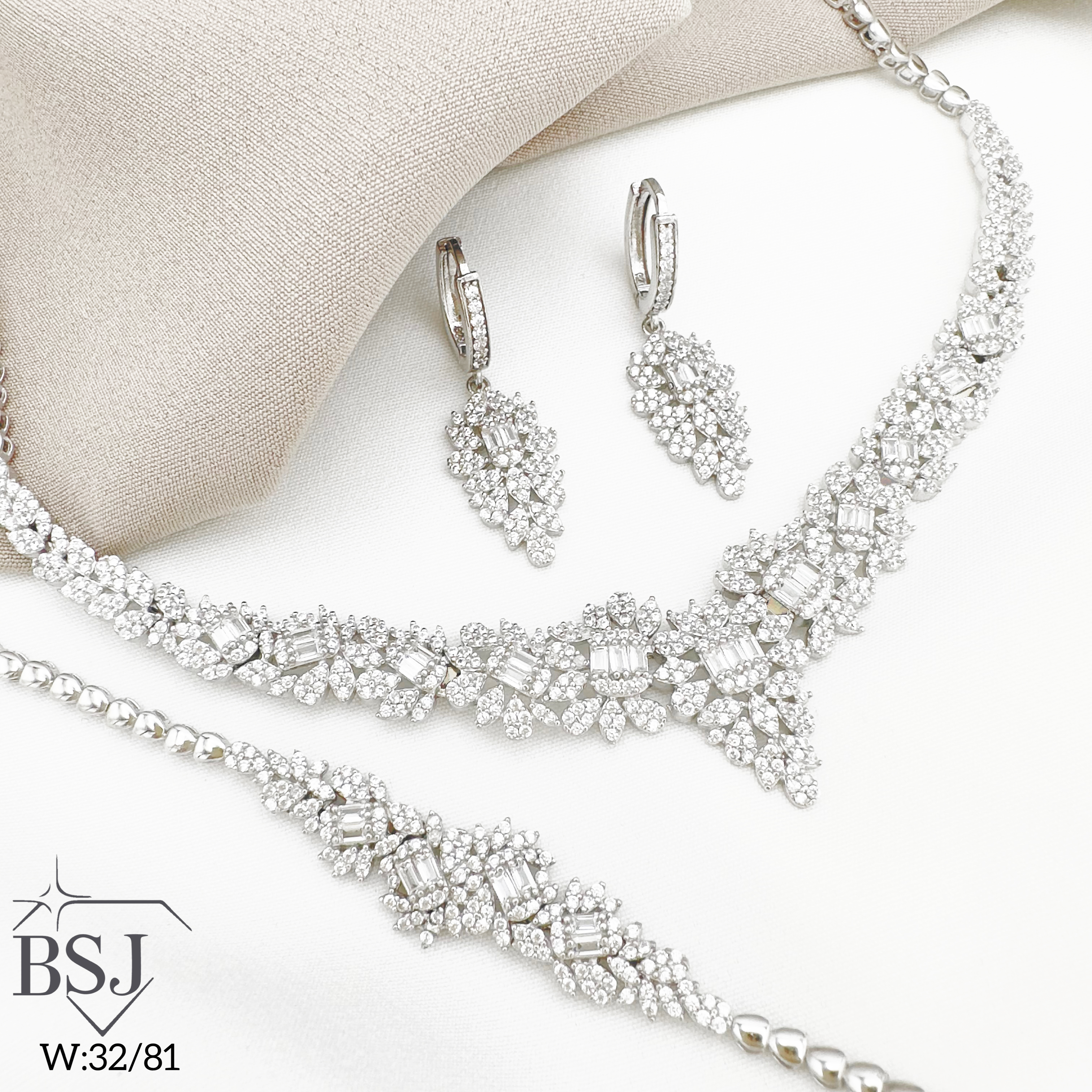 سرویس نقره جواهری زنانه BSJ_S299 از سرویس های اعیانی ساخته شده از نقره با عیار 925 می باشد.سنگ های به کار رفته در آن برلیان و امرالد از جنس اتمی زیرکونیا می باشند که به صورت میکروستینگ مخراج کاری شده اند و در برابر ضربه مقاوم اند.آبکاری دو مرحله ای رودیوم (طلا سفید)، سبب کیفیت بی نظیر دوام رنگ آن شده است و به دلیل عدم استفاده از نیکل در ساختار آن، بدون حساسیت بوده و با پوست حساس سازگار است.به دلیل کیفیت فوق العاده و درخشش عالی سنگ ها، تفاوتی با نمونه طلا ندارد.وزن سرویس 32.52+- گرم می باشد.