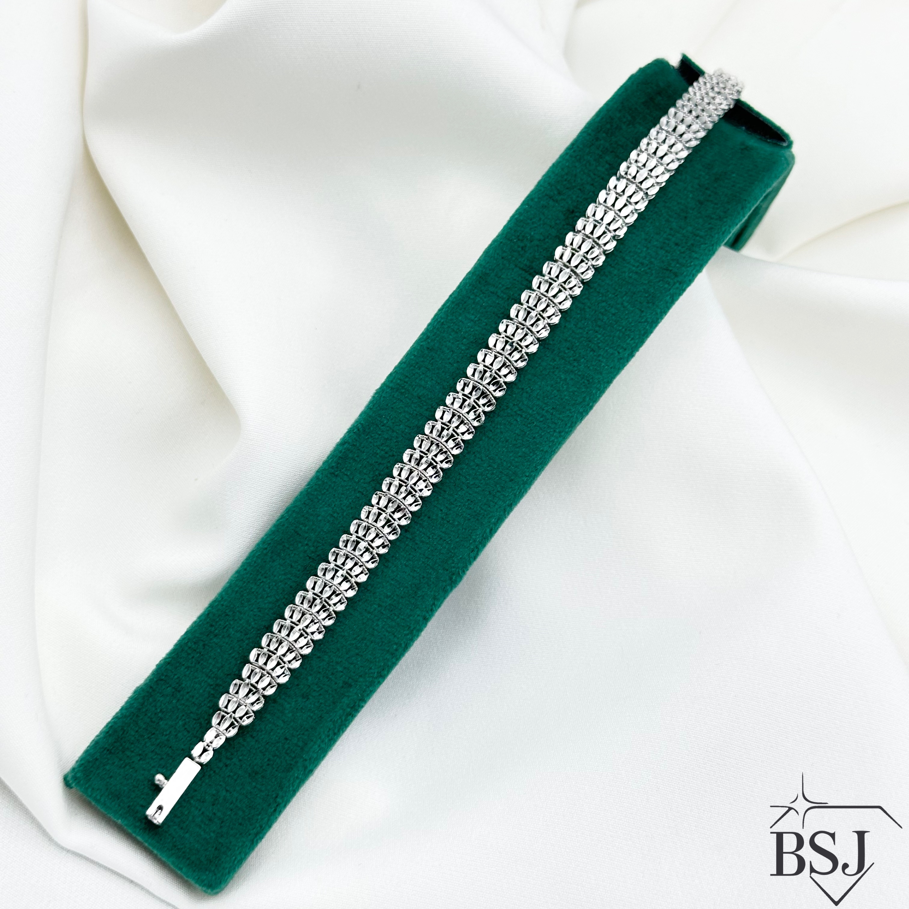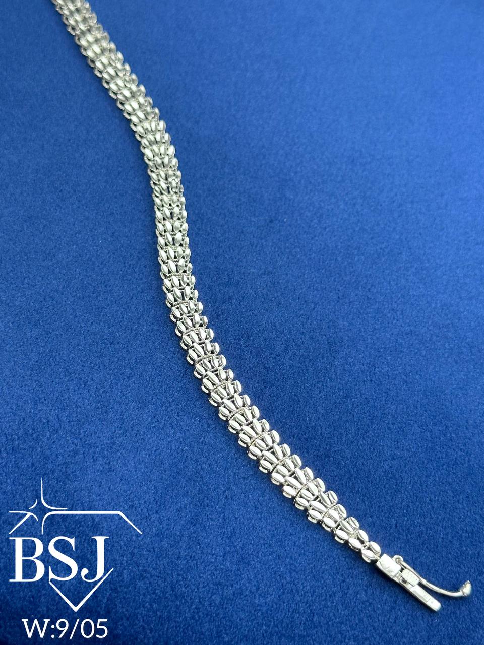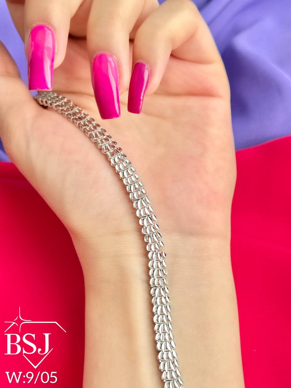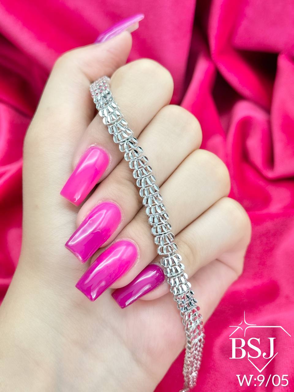 دستبند تراش خور نقره زنانه BSJ-D332 ساخته شده از نقره با عیار 925 می باشد.این دستبند بدون نگین بوده و تماما از جنس نقره می باشد.آبکاری دو مرحله ای رودیوم(طلا سفید)، سبب کیفیت بی نظیر دوام رنگ آن شده است و به دلیل عدم استفاده از نیکل در ساختار آن، بدون حساسیت بوده و با پوست حساس سازگار است.به دلیل کیفیت فوق العاده و درخشش عالی آن، تفاوتی با نمونه طلا ندارد.وزن دستبند 9.05 گرم می باشد.