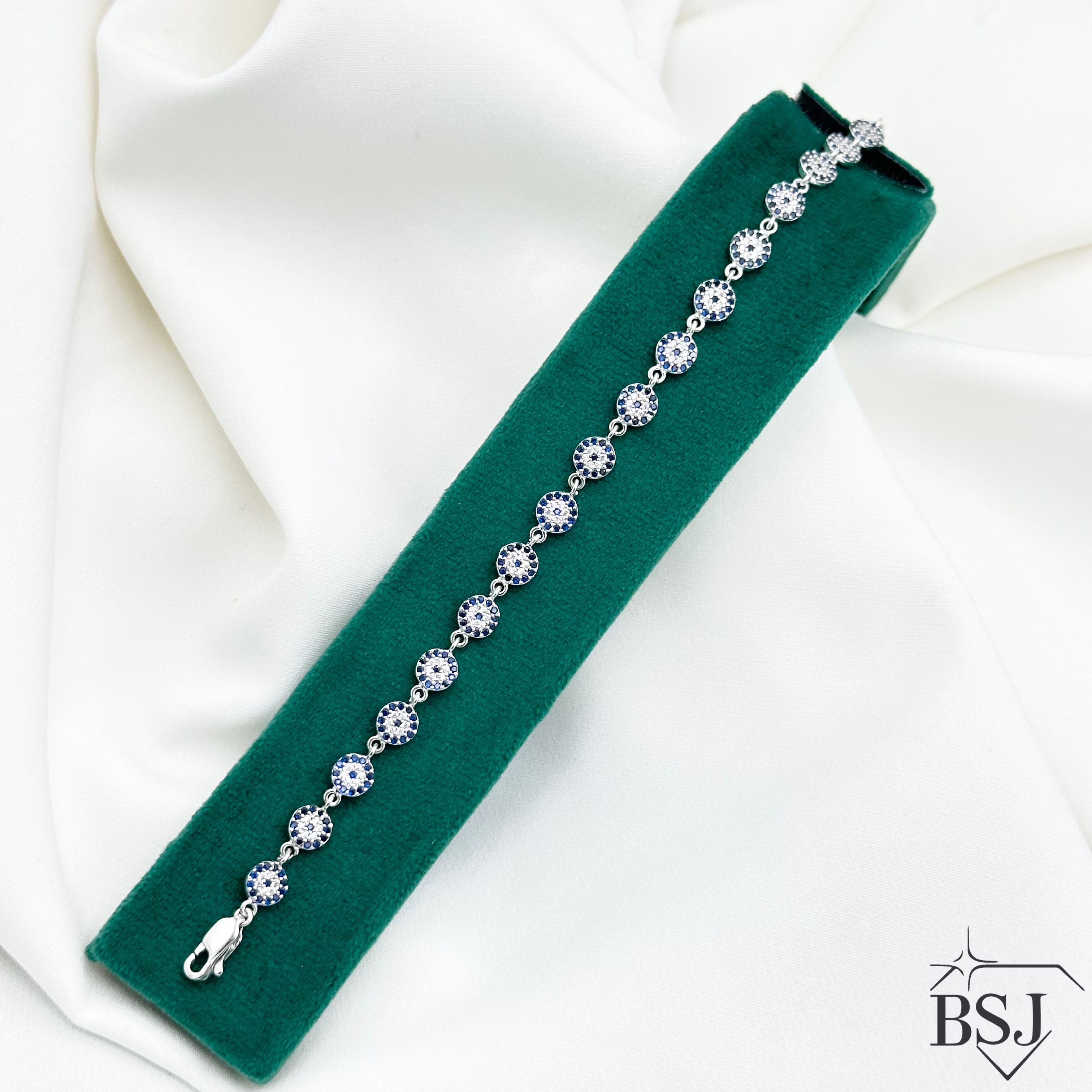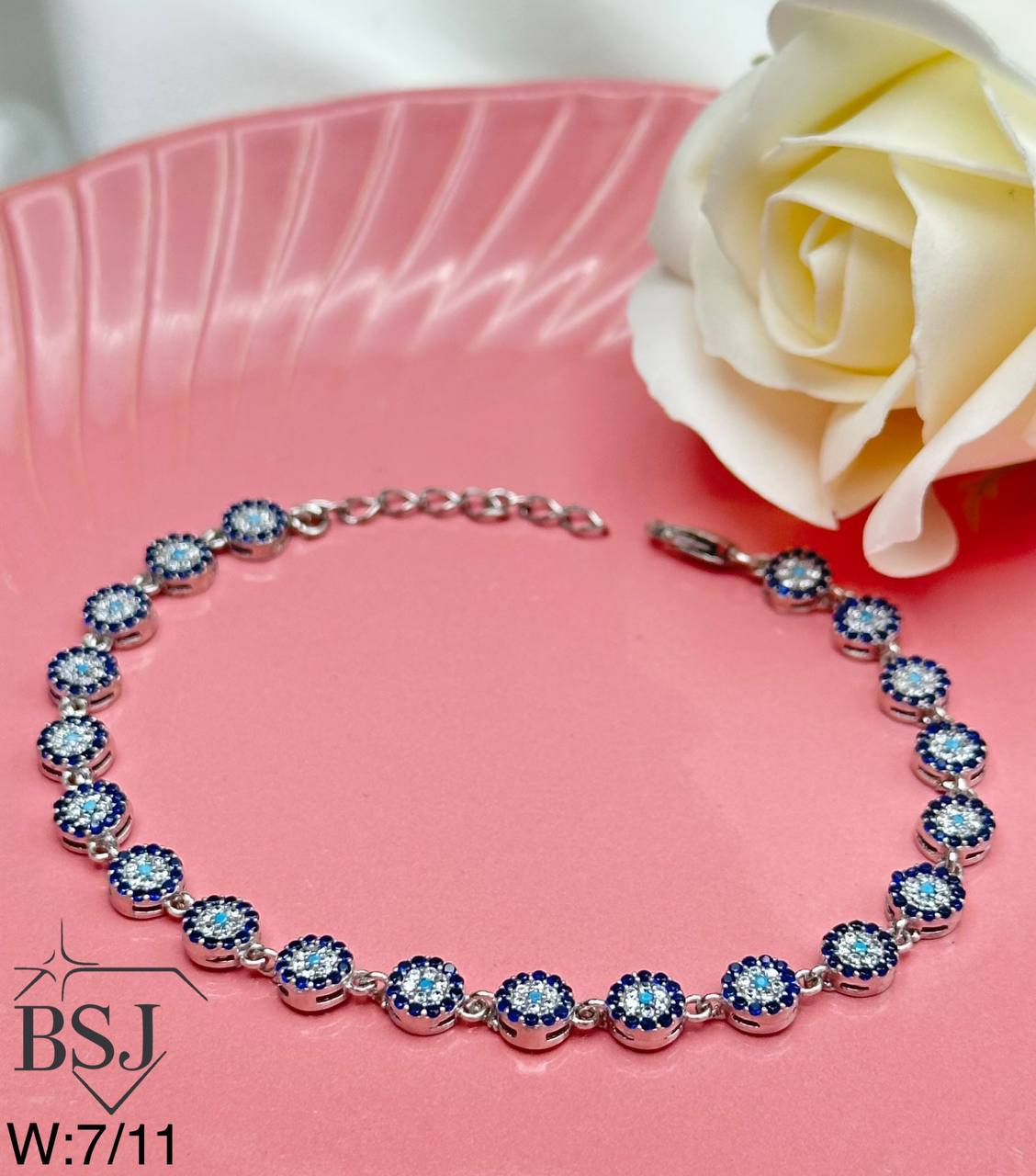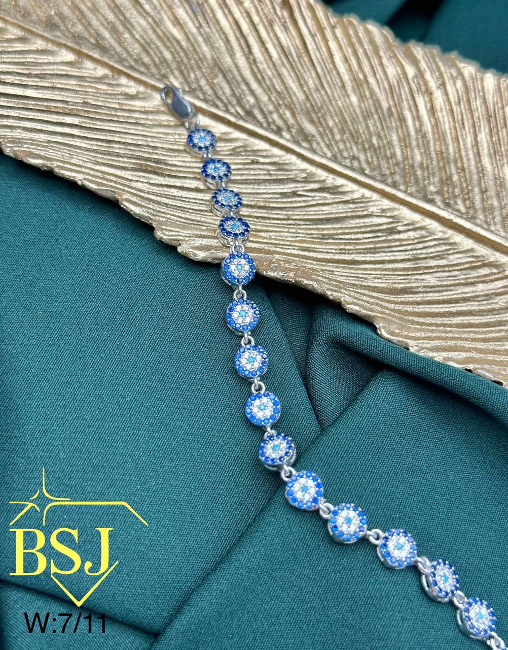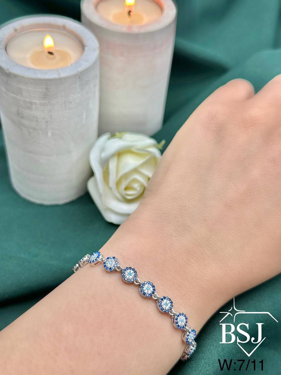 دستبند نقره چشم نظر زنانه BSJ_D334 از دستبندهای ظریف و زیبای ساخته شده از نقره با عیار 925 می باشد.سنگ های به کار رفته، برلیان از جنس اتمی زیرکونیا می باشند که به صورت میکروستینگ مخراج کاری شده اند و در برابر ضربه مقاوم اند.آبکاری دو مرحله ای رودیوم (طلاسفید)، سبب کیفیت بی نظیر دوام رنگ آن شده است و به دلیل عدم استفاده از نیکل در ساختار آن، بدون حساسیت بوده و با پوست حساس سازگار است.وزن دستبند 7.11 گرم می باشد.