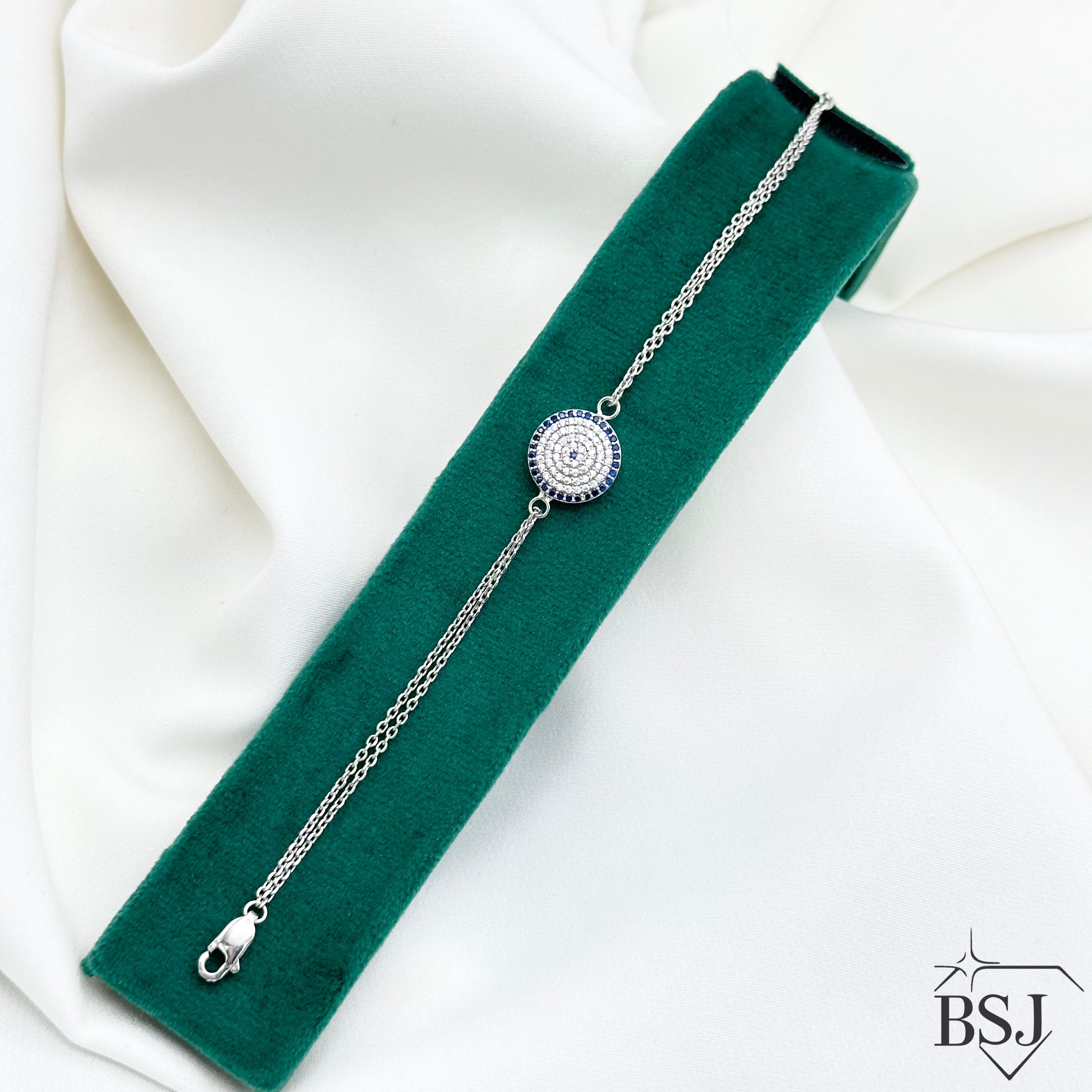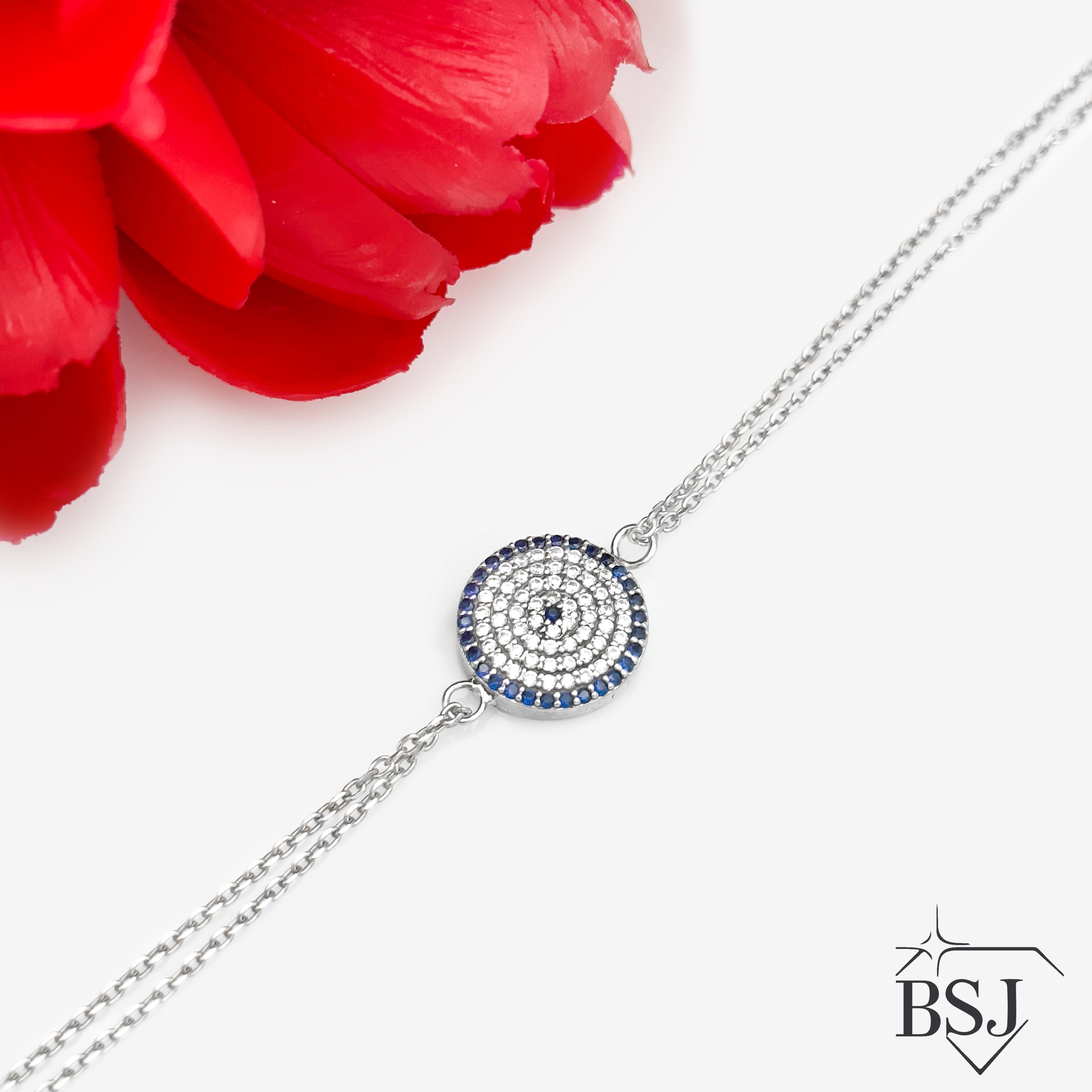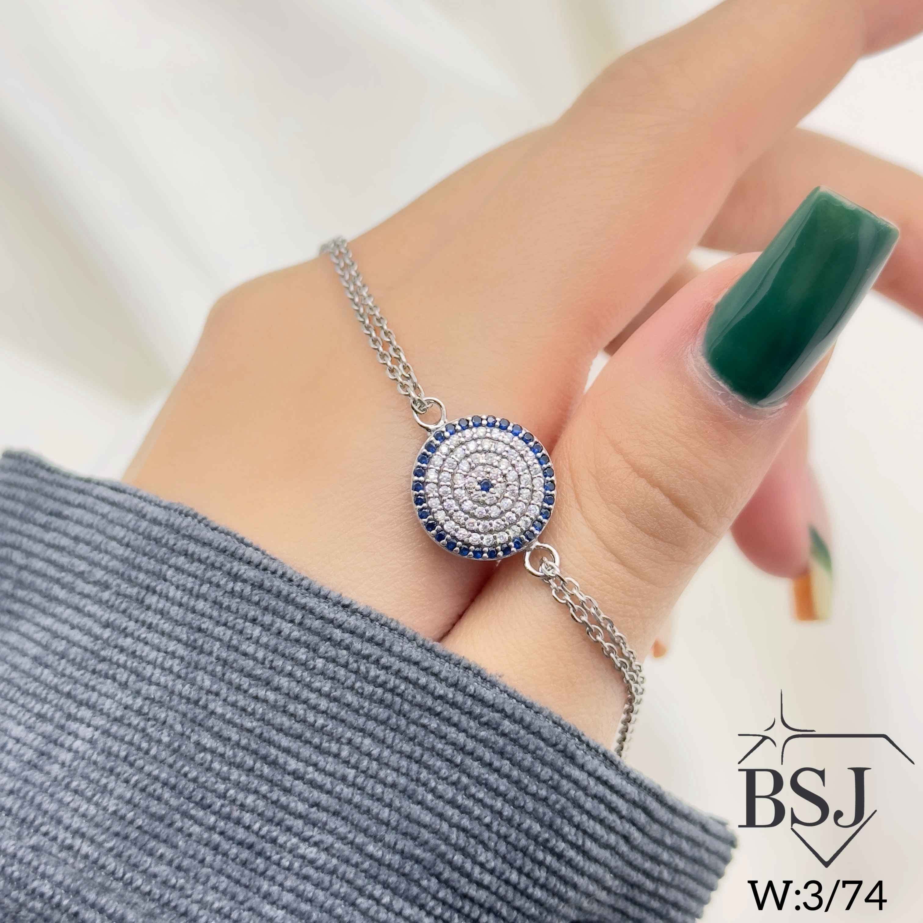 دستبند نقره چشم نظر زنانه BSJ_D560 از دستبندهای ظریف و زیبای ساخته شده از نقره با عیار 925 می باشد.سنگ های به کار رفته، برلیان از جنس اتمی زیرکونیا می باشند که به صورت میکروستینگ مخراج کاری شده اند و در برابر ضربه مقاوم اند.آبکاری دو مرحله ای رودیوم (طلاسفید)، سبب کیفیت بی نظیر دوام رنگ آن شده است و به دلیل عدم استفاده از نیکل در ساختار آن، بدون حساسیت بوده و با پوست حساس سازگار است.وزن دستبند 3.74 گرم می باشد.