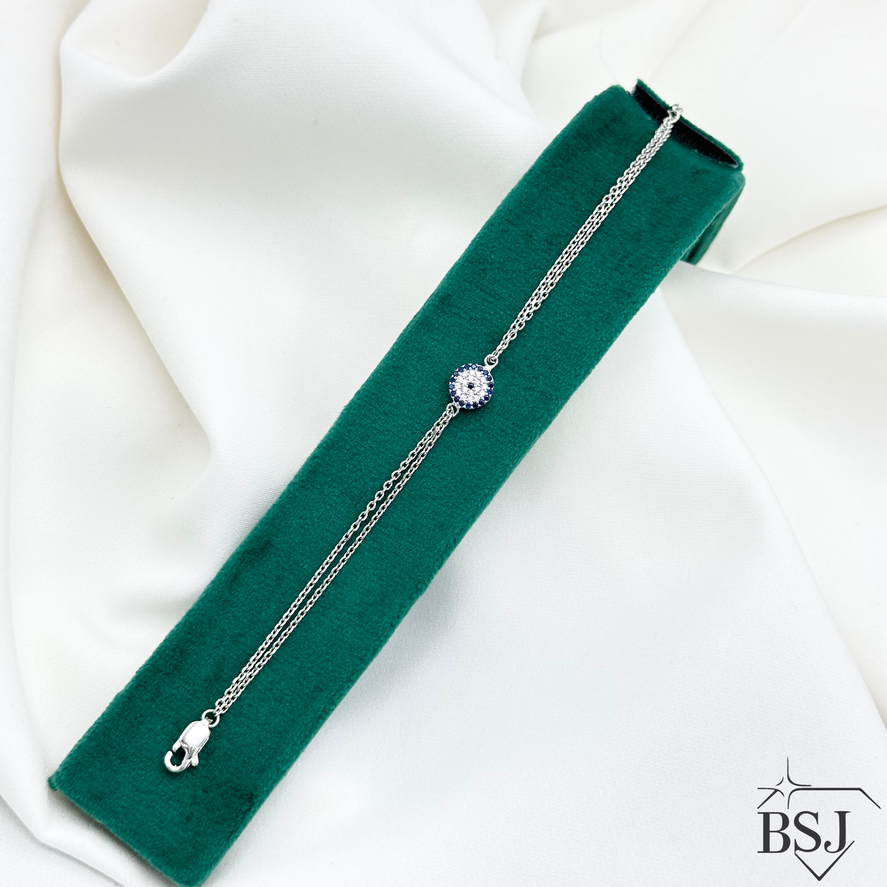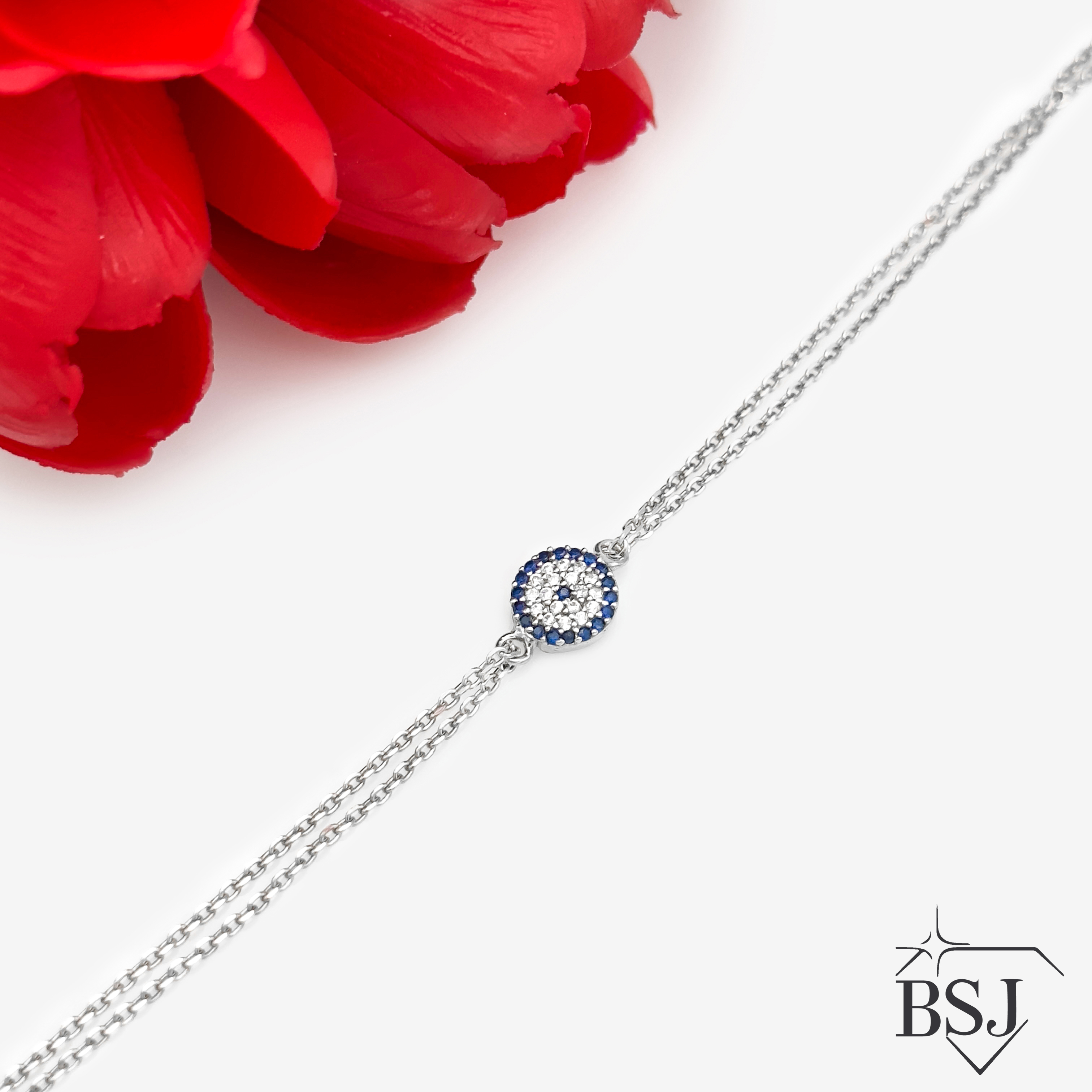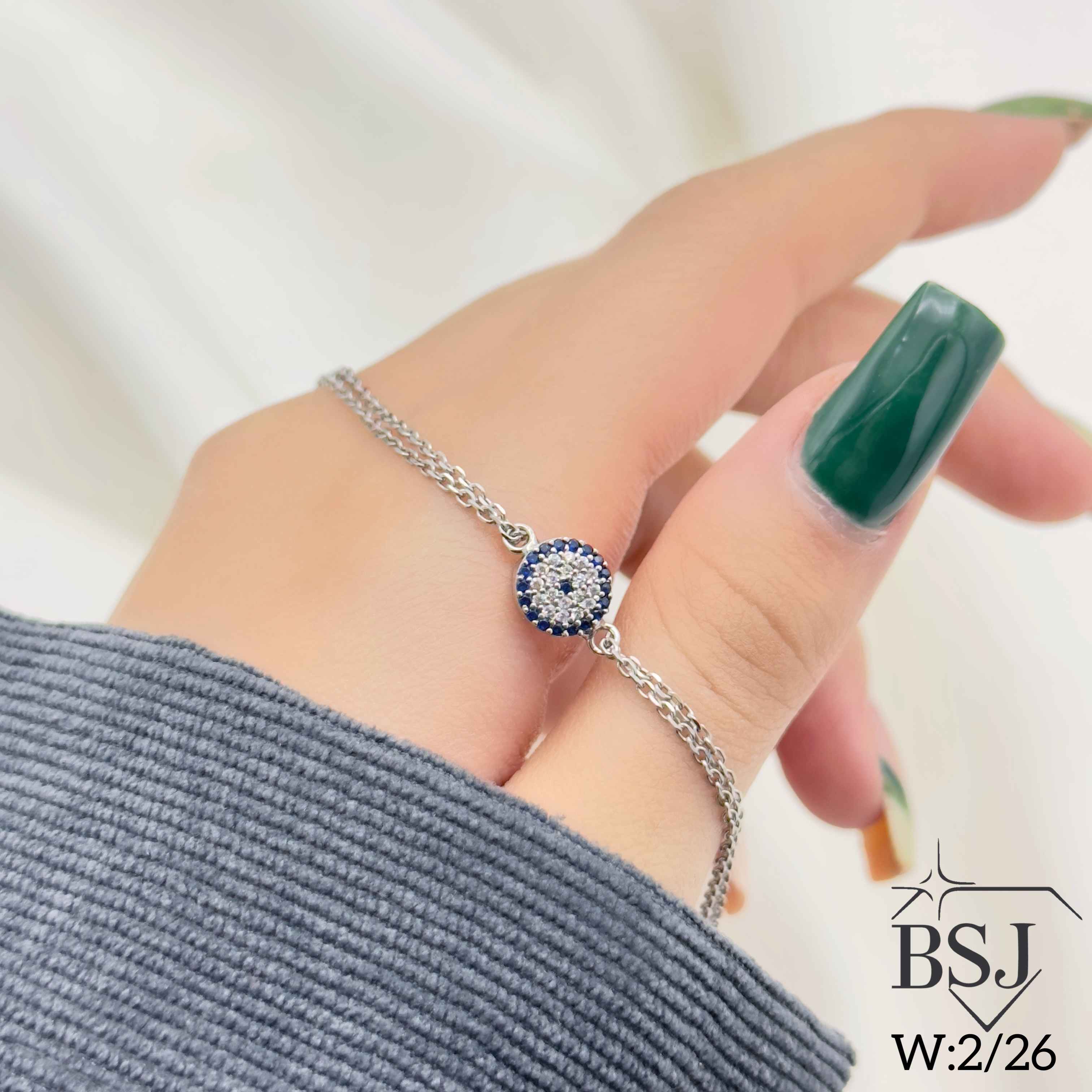 دستبند نقره چشم نظر زنانه BSJ_D561 از دستبندهای ظریف و زیبای ساخته شده از نقره با عیار 925 می باشد.سنگ های به کار رفته، برلیان از جنس اتمی زیرکونیا می باشند که به صورت میکروستینگ مخراج کاری شده اند و در برابر ضربه مقاوم اند.آبکاری دو مرحله ای رودیوم (طلاسفید)، سبب کیفیت بی نظیر دوام رنگ آن شده است و به دلیل عدم استفاده از نیکل در ساختار آن، بدون حساسیت بوده و با پوست حساس سازگار است.وزن دستبند 2.26 گرم می باشد.
