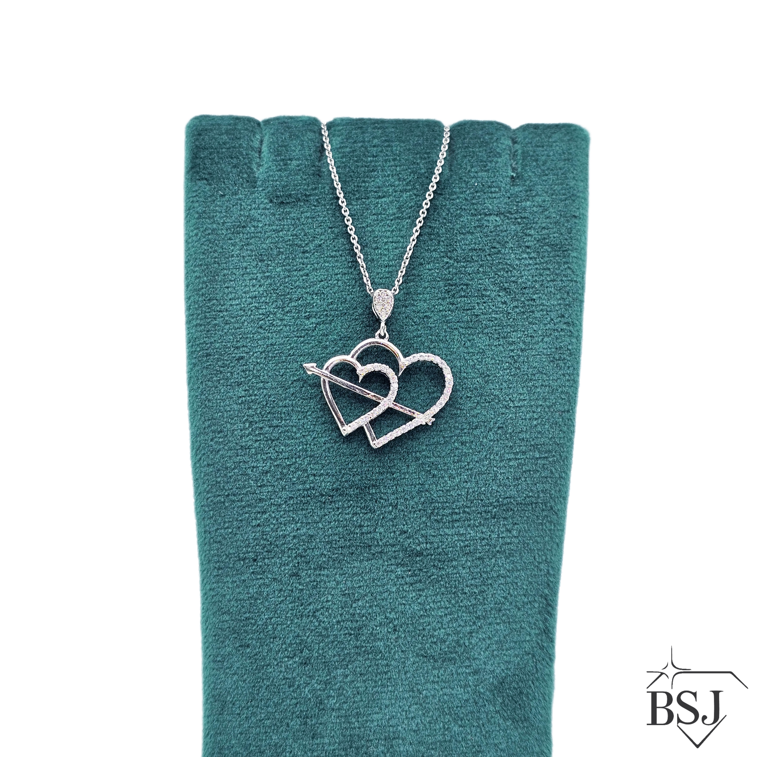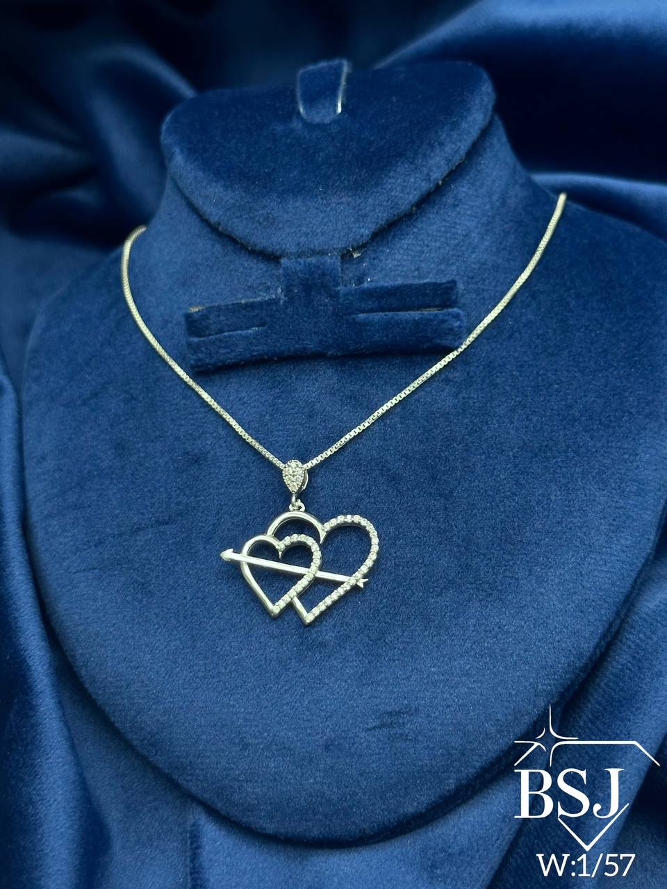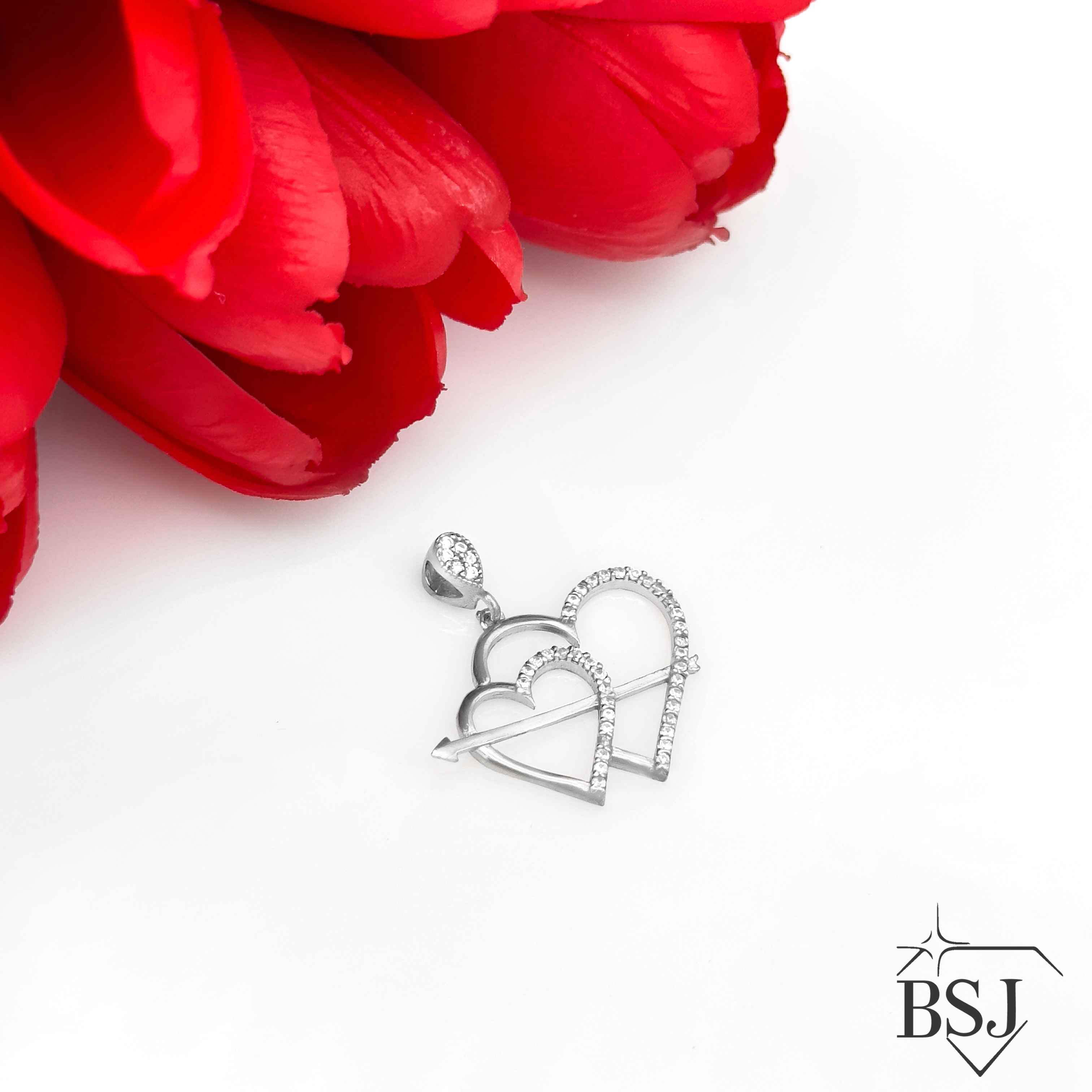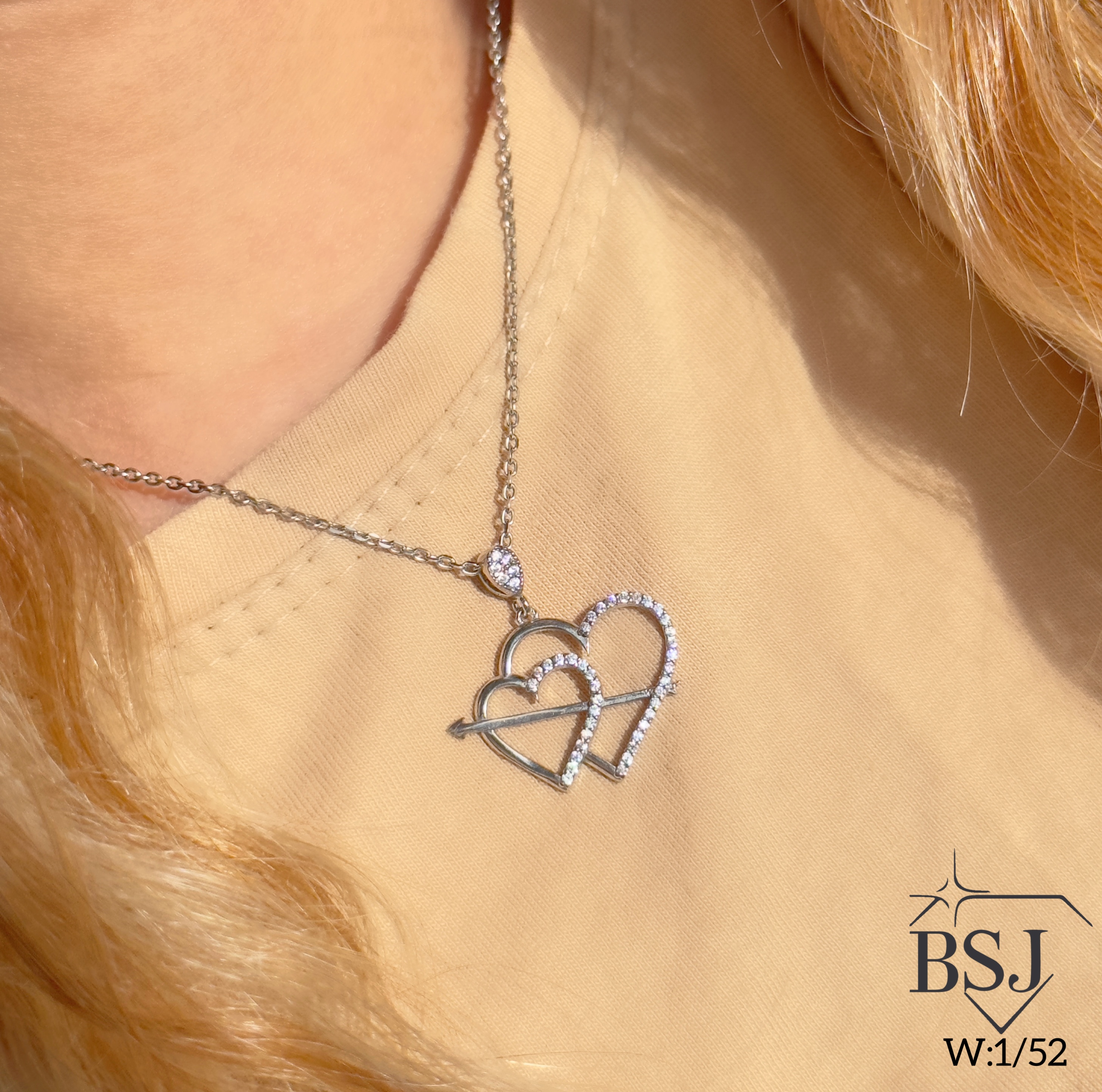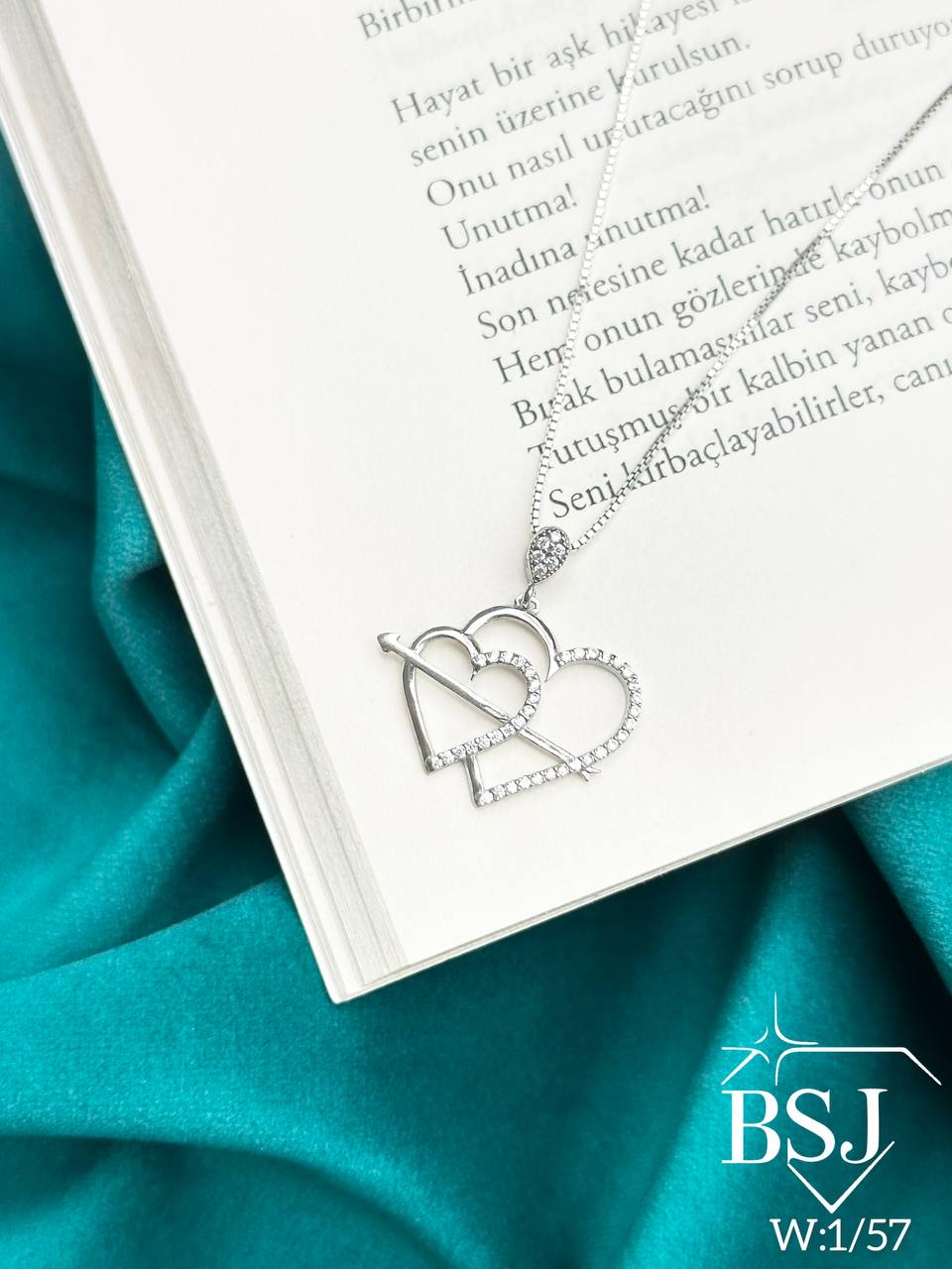 آویز گردنبند نقره مدل دو قلب با تیرBSJ_G101 یکی از منحصر به فرد ترین گردنبندهای ساخته شده از نقره با عیار 925 می باشد.سنگ های به کار رفته در آن برلیان اتمی از جنس زیرکونیا می باشند که به صورت میکروستینگ مخراج کاری شده اند و در برابر ضربه مقاوم اند.آبکاری دو مرحله ای رودیوم (طلا سفید)، سبب کیفیت بی نظیر دوام رنگ آن شده است و به دلیل عدم استفاده از نیکل در ساختار آن، بدون حساسیت بوده و با پوست های حساس سازگار است.وزن مدال 3.4+- گرم می باشد.