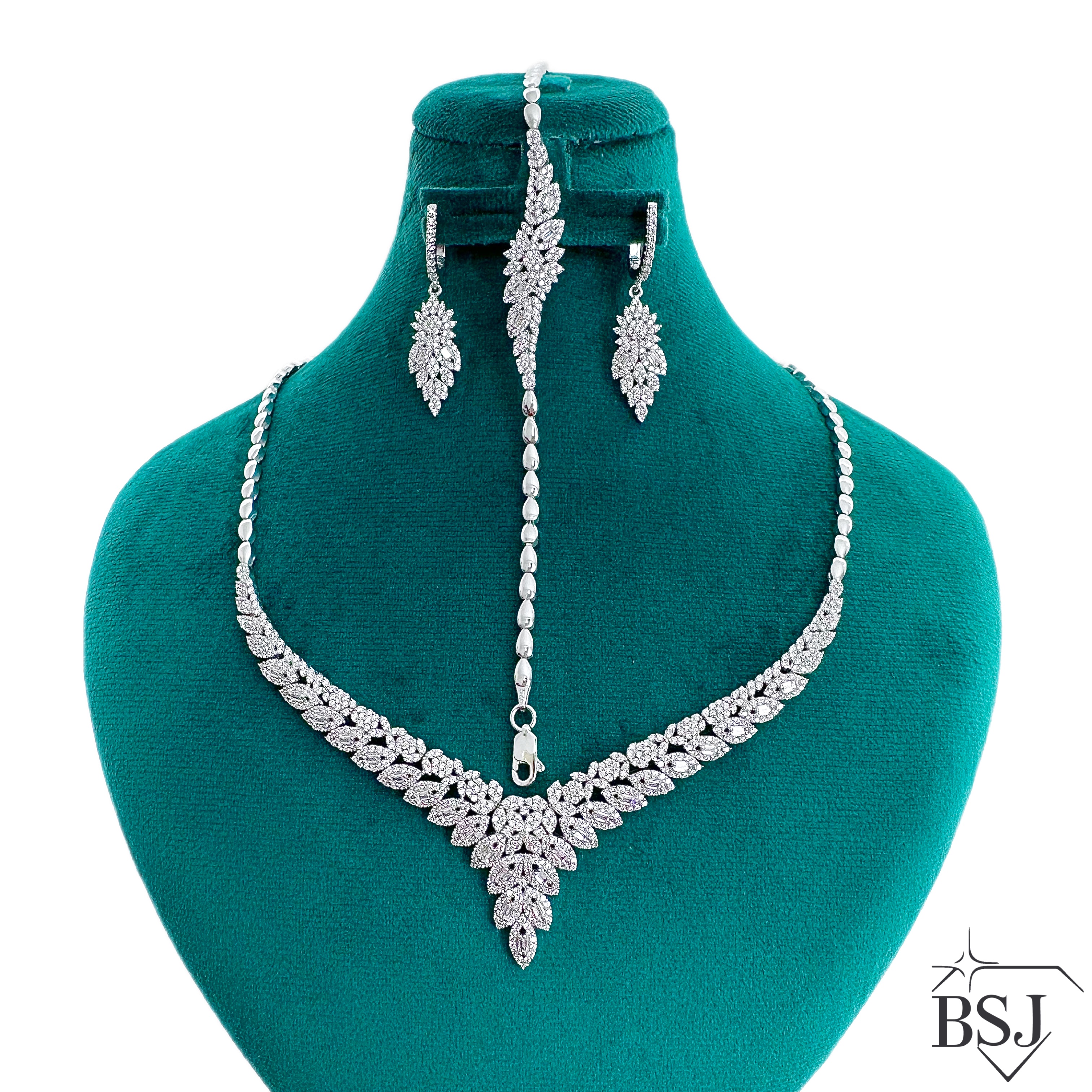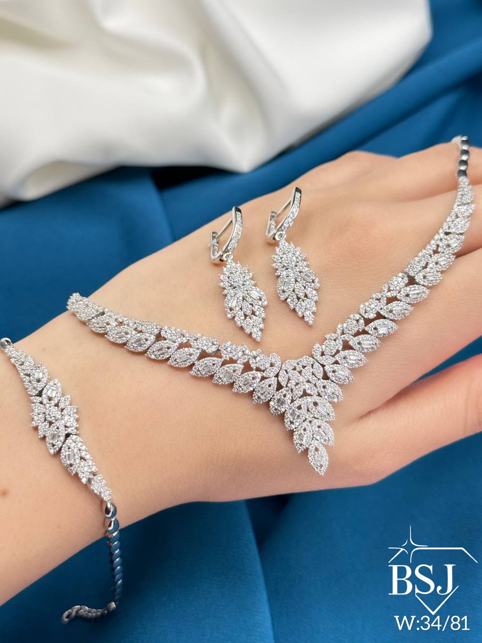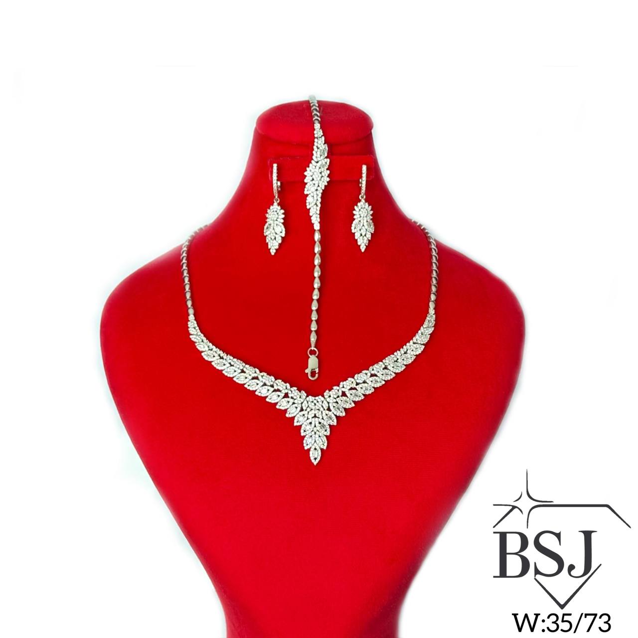 سرویس نقره جواهری زنانه BSJ_S385 از سرویس های اعیانی ساخته شده از نقره با عیار 925 می باشد.سنگ های به کار رفته در آن برلیان و امرالد از جنس اتمی زیرکونیا می باشند که به صورت میکروستینگ مخراج کاری شده اند و در برابر ضربه مقاوم اند.آبکاری دو مرحله ای رودیوم (طلا سفید)، سبب کیفیت بی نظیر دوام رنگ آن شده است و به دلیل عدم استفاده از نیکل در ساختار آن، بدون حساسیت بوده و با پوست حساس سازگار است.به دلیل کیفیت فوق العاده و درخشش عالی سنگ ها، تفاوتی با نمونه طلا ندارد.وزن سرویس 35.73 گرم می باشد.