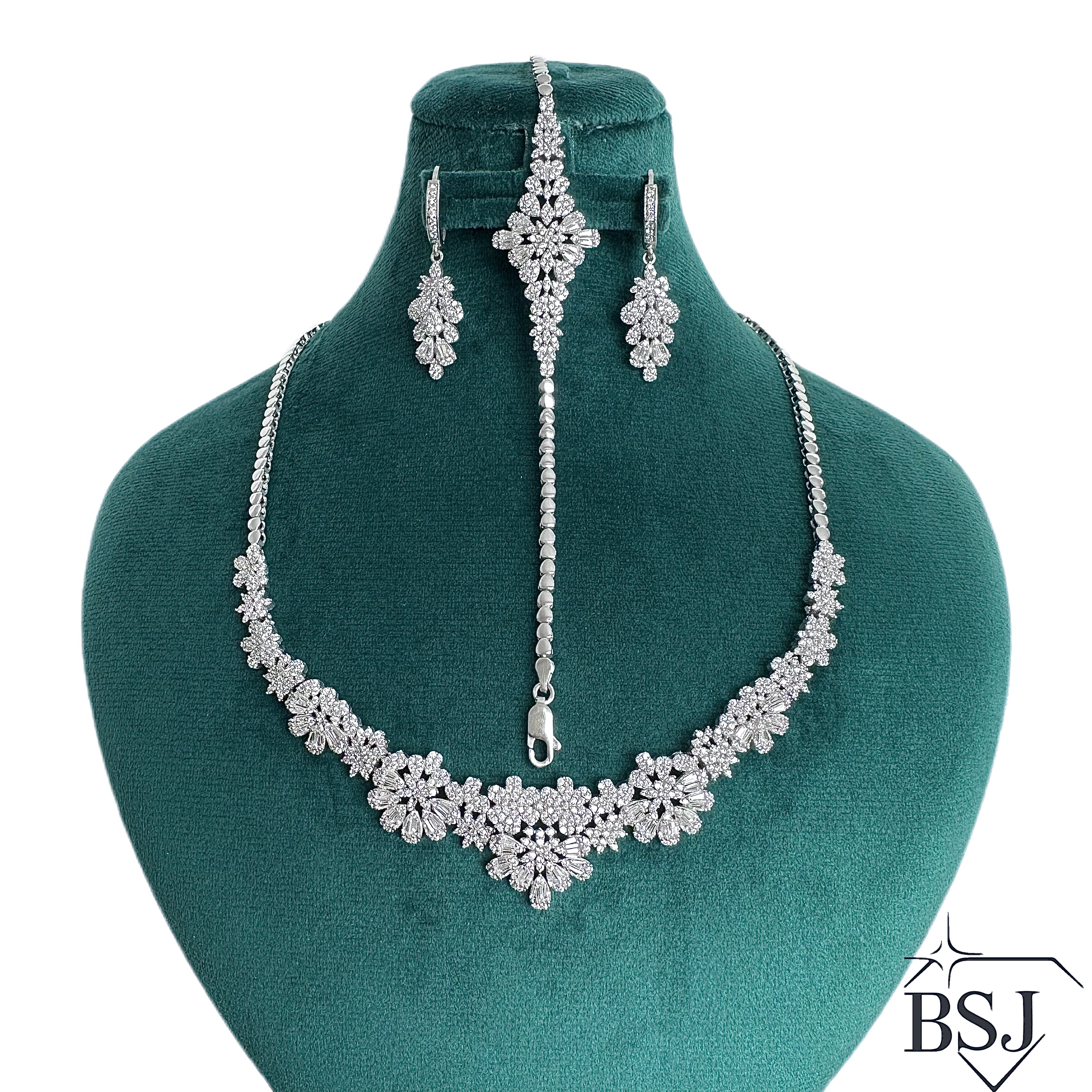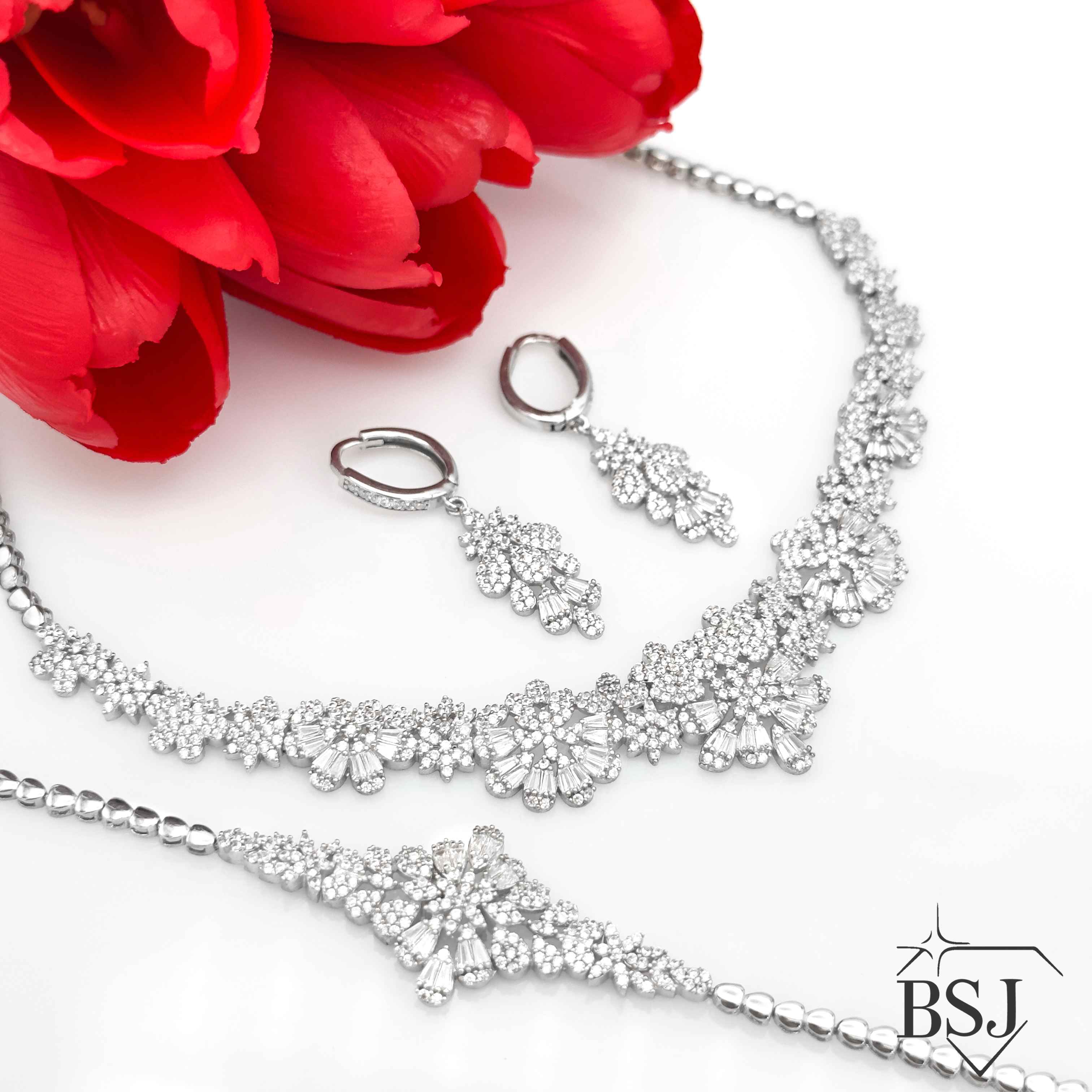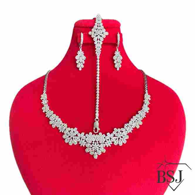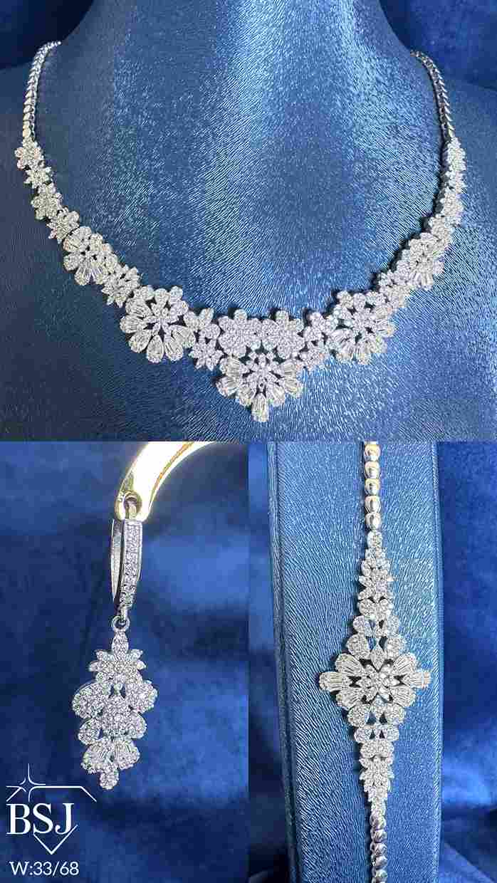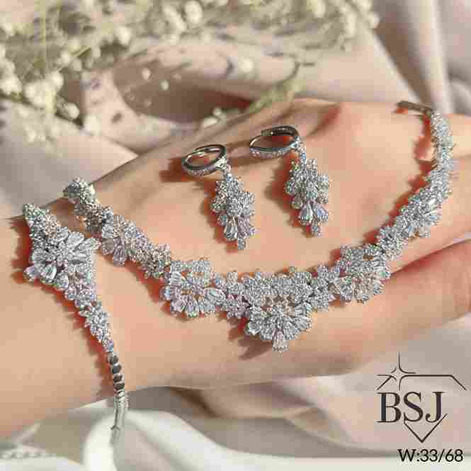 سرویس نقره جواهری زنانه BSJ_S397 از سرویس های شیک و لوکس ساخته شده از نقره با عیار 925 می باشد.سنگ های به کار رفته در آن برلیان و امرالد از جنس اتمی زیرکونیا می باشند که به صورت میکروستینگ مخراج کاری شده اند و در برابر ضربه مقاوم اند.آبکاری دو مرحله ای رودیوم (طلا سفید)، سبب کیفیت بی نظیر دوام رنگ آن شده است و به دلیل عدم استفاده از نیکل در ساختار آن،بدون حساسیت بوده و با پوست حساس سازگار است.به دلیل کیفیت فوق العاده و درخشش عالی سنگ ها، تفاوتی با نمونه طلا ندارد.وزن سرویس +-33.90گرم می باشد.