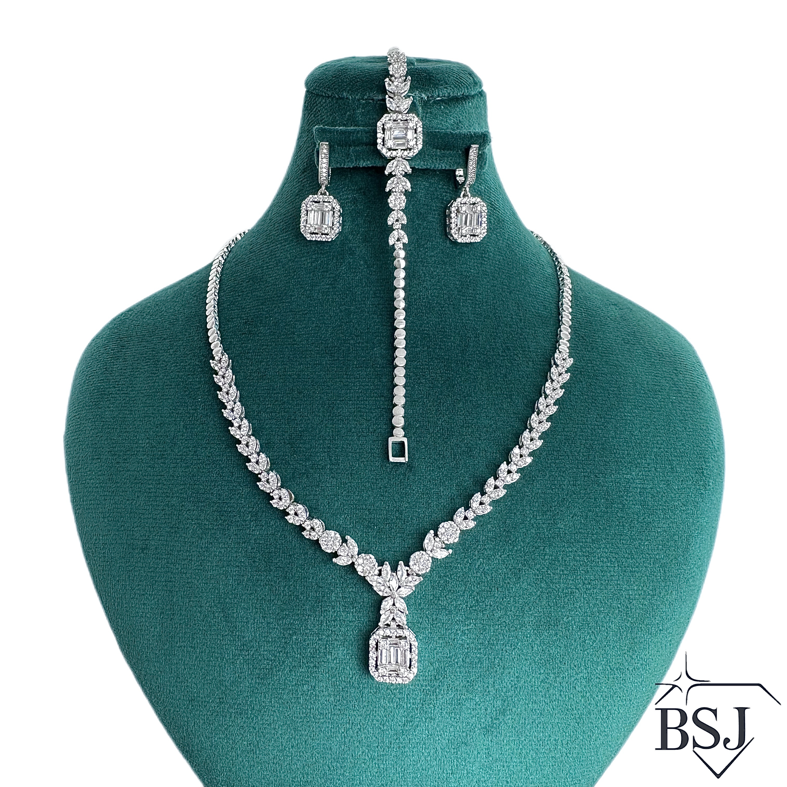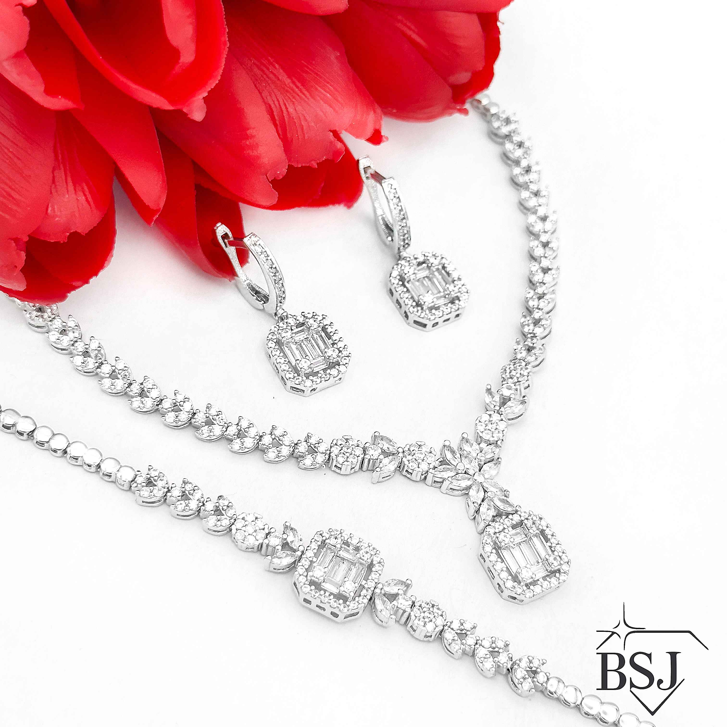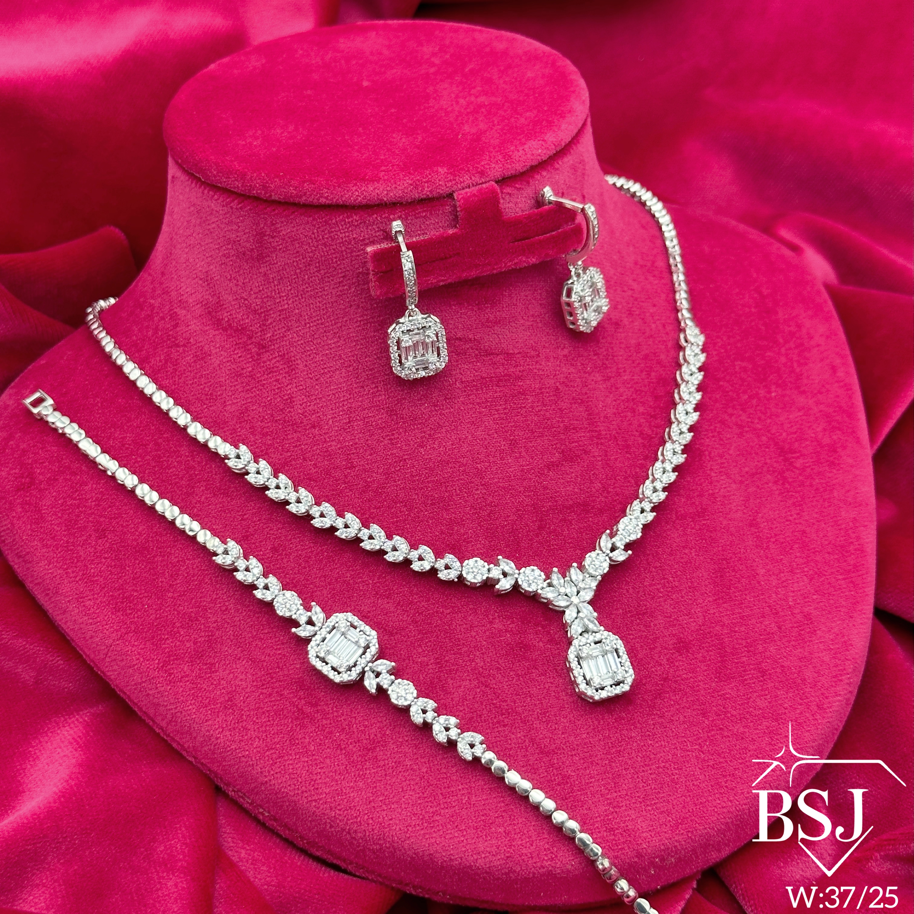 سرویس نقره جواهری زنانه BSJ_S557 از سرویس های شیک و لوکس ساخته شده از نقره با عیار 925 می باشد.سنگ های به کار رفته در آن برلیان و امرالد از جنس اتمی زیرکونیا می باشند که به صورت میکروستینگ مخراج کاری شده اند و در برابر ضربه مقاوم اند.آبکاری دو مرحله ای رودیوم (طلا سفید)، سبب کیفیت بی نظیر دوام رنگ آن شده است و به دلیل عدم استفاده از نیکل در ساختار آن،بدون حساسیت بوده و با پوست حساس سازگار است.به دلیل کیفیت فوق العاده و درخشش عالی سنگ ها، تفاوتی با نمونه طلا ندارد.وزن سرویس 37.25 گرم می باشد.