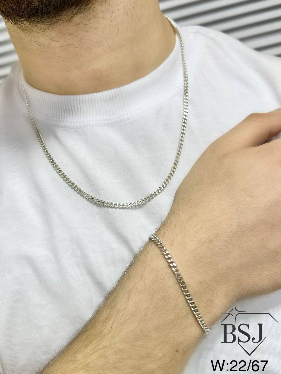 ست دستبند و زنجیر نقره مردانه طرح کارتیه BSJ-Z442 از ست های پرفروش ساخته شده از نقره با عیار 925 می باشد و برای هدیه، گزینه ای مناسب می تواند باشد .آبکاری دو مرحله ای رودیوم (طلا سفید)، سبب کیفیت بی نظیر دوام رنگ آن شده است و به دلیل عدم استفاده از نیکل در ساختار آن، بدون حساسیت بوده و با پوست حساس سازگار است.وزن ست 22.67 گرم می باشد.