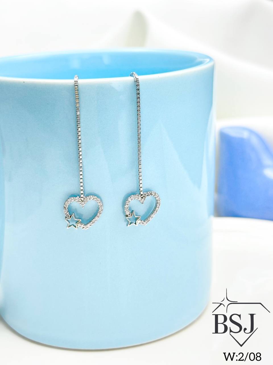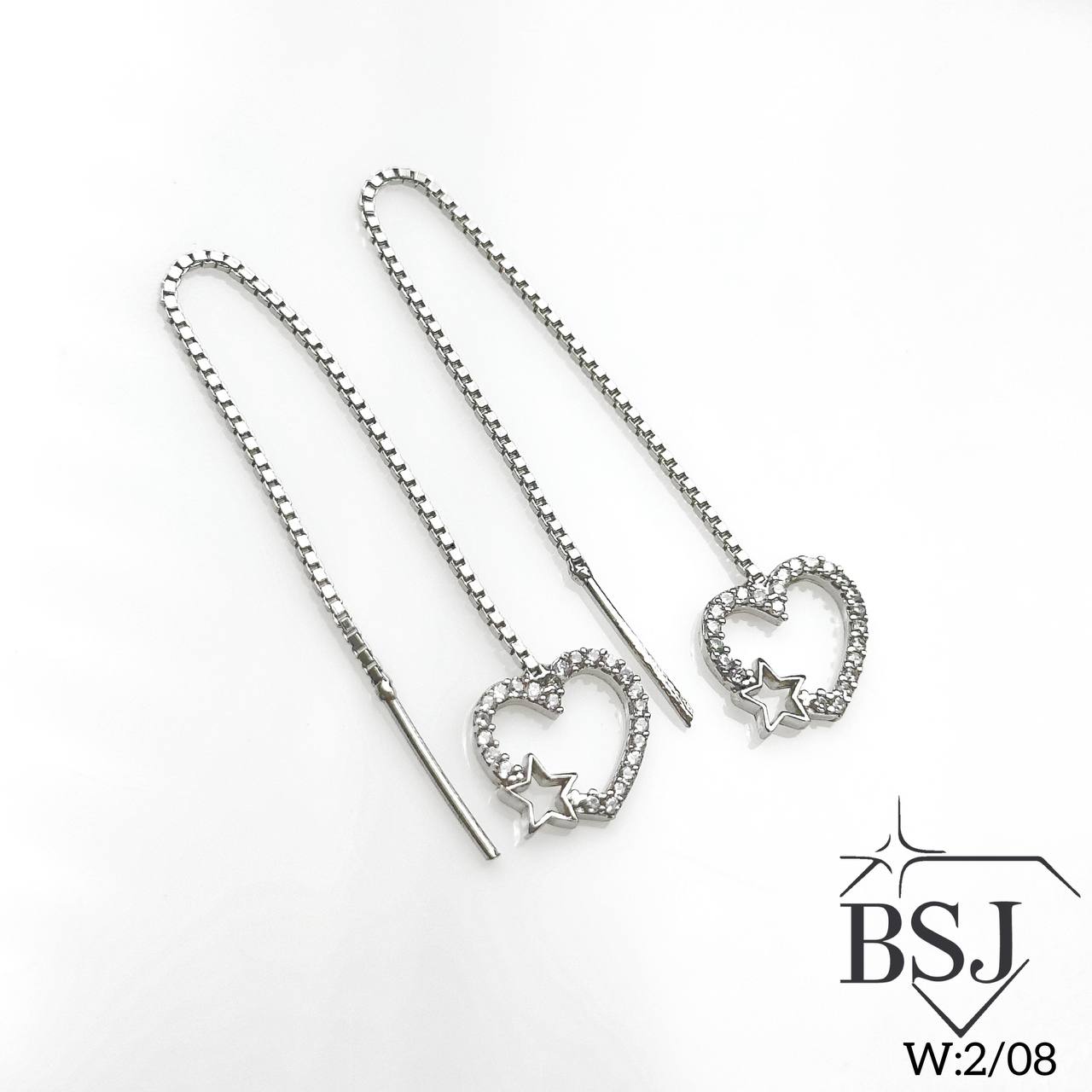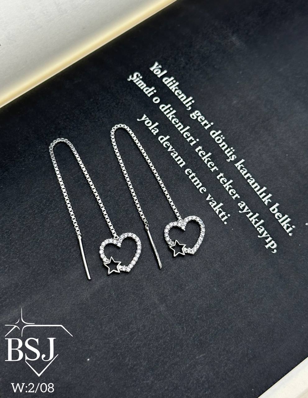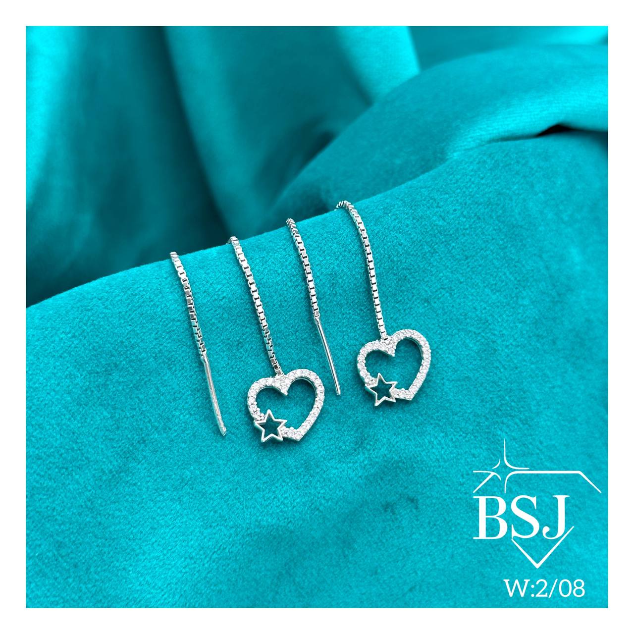 گوشواره آویز نقره طرح بخیه قلب و ستاره BSJ-G490 ساخته شده از نقره با عیار 925 می باشد.نگین های بکار رفته در این گوشواره از جنس برلیان اتمی زیرکونیا می باشد.آبکاری دو مرحله ای رودیوم(طلا سفید)، سبب کیفیت بی نظیر دوام رنگ آن شده است و به دلیل عدم استفاده از نیکل در ساختار آن، بدون حساسیت بوده و با پوست حساس سازگار است.به دلیل کیفیت فوق العاده و درخشش عالی آن، تفاوتی با نمونه طلا ندارد.وزن گوشواره 2.08گرم می باشد.