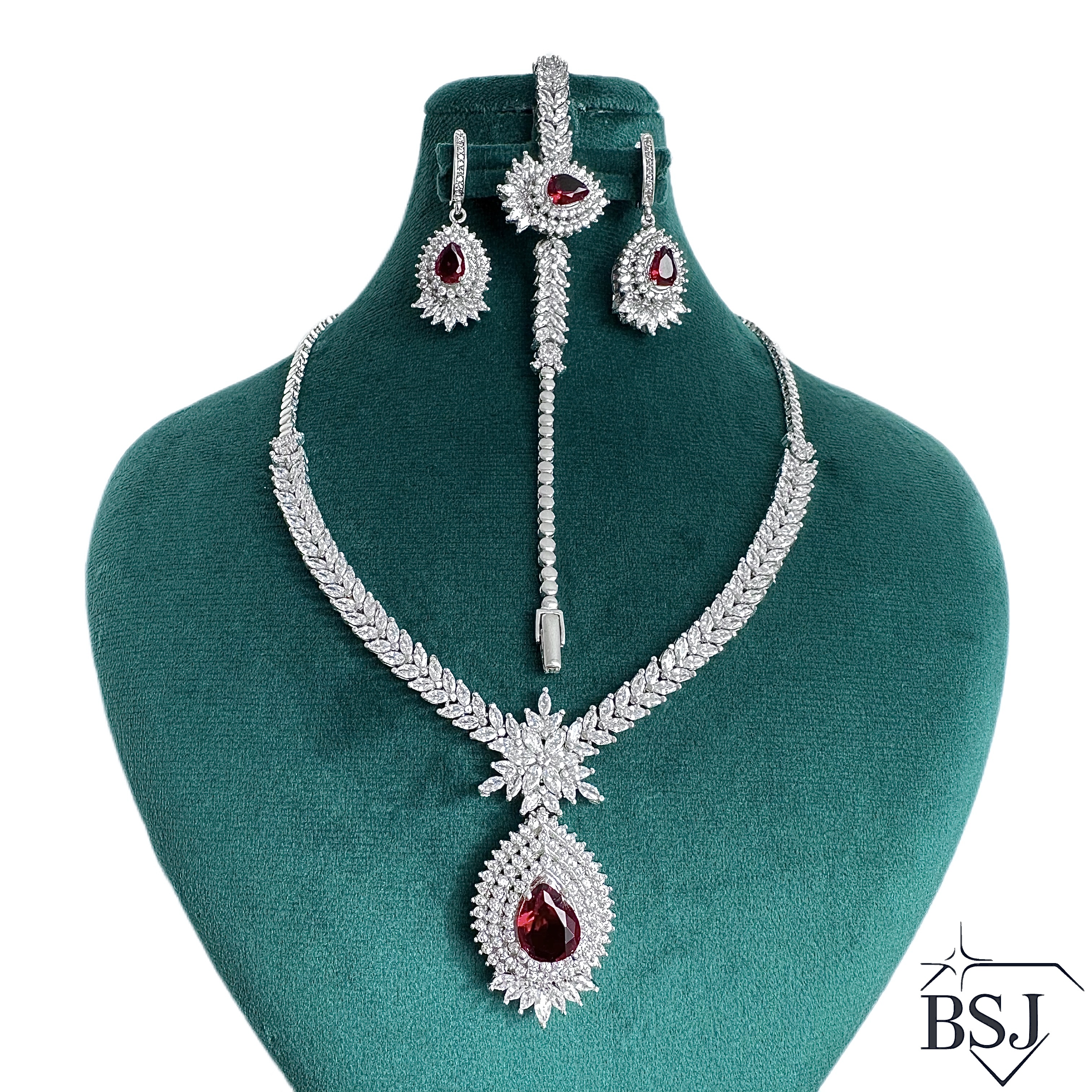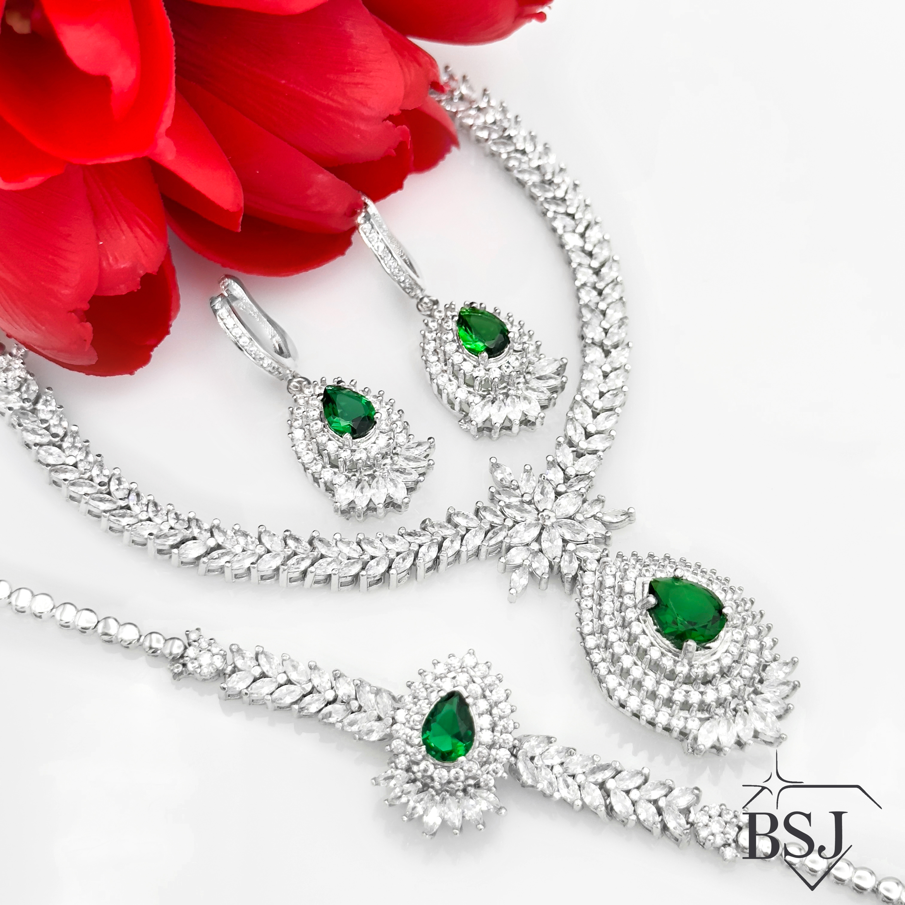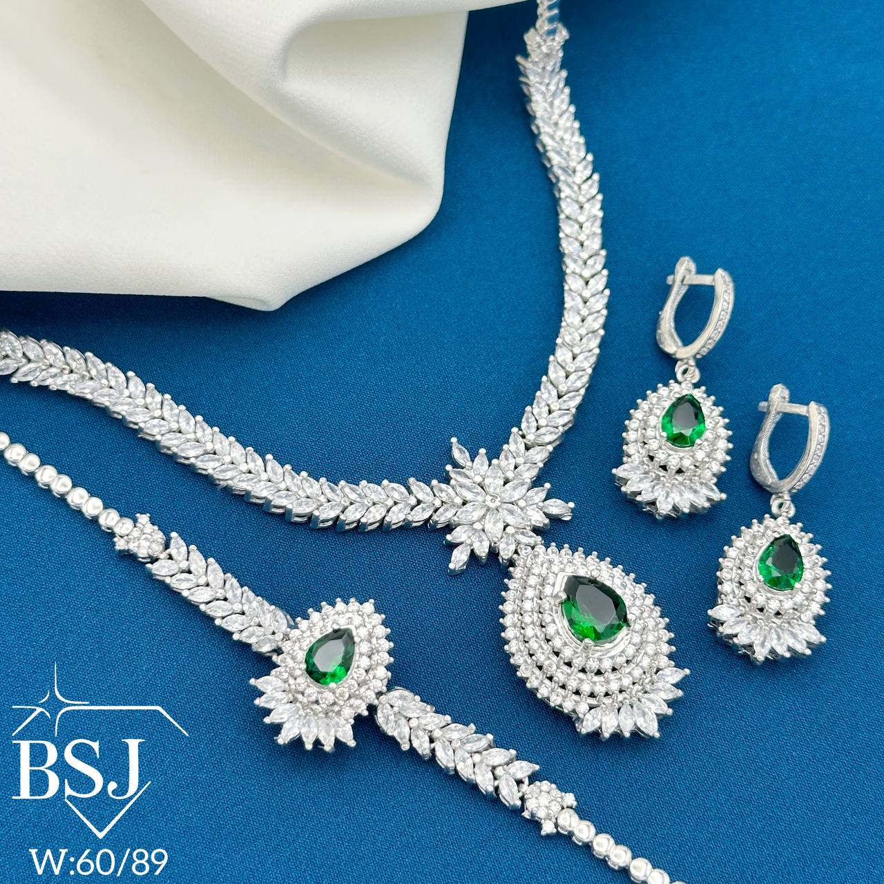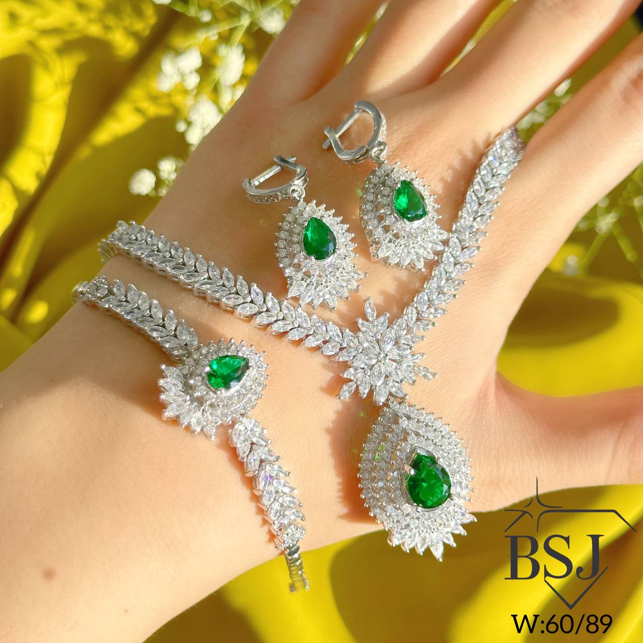 سرویس نقره جواهری زنانه BSJ_S551 از سرویس های شیک و لوکس ساخته شده از نقره با عیار 925 می باشد.سنگ های به کار رفته در آن برلیان و مارکیز از جنس اتمی زیرکونیا و سنگ های سنتتیک (آزمایشگاهی) می باشند که به صورت میکروستینگ مخراج کاری شده اند و در برابر ضربه مقاوم اند.آبکاری دو مرحله ای رودیوم (طلا سفید)، سبب کیفیت بی نظیر دوام رنگ آن شده است و به دلیل عدم استفاده از نیکل در ساختار آن،بدون حساسیت بوده و با پوست حساس سازگار است.به دلیل کیفیت فوق العاده و درخشش عالی سنگ ها، تفاوتی با نمونه طلا ندارد.وزن سرویس60.89 گرم می باشد.