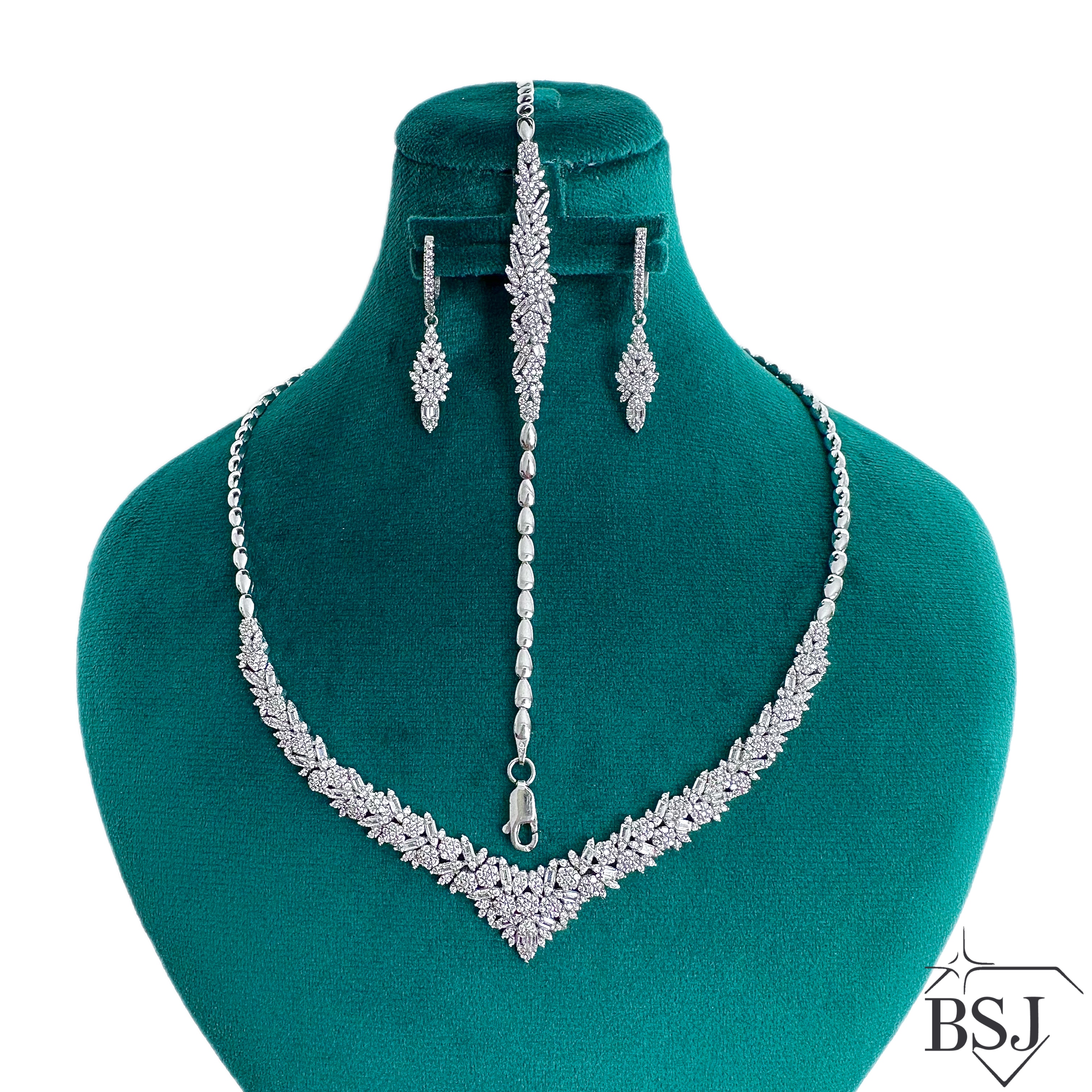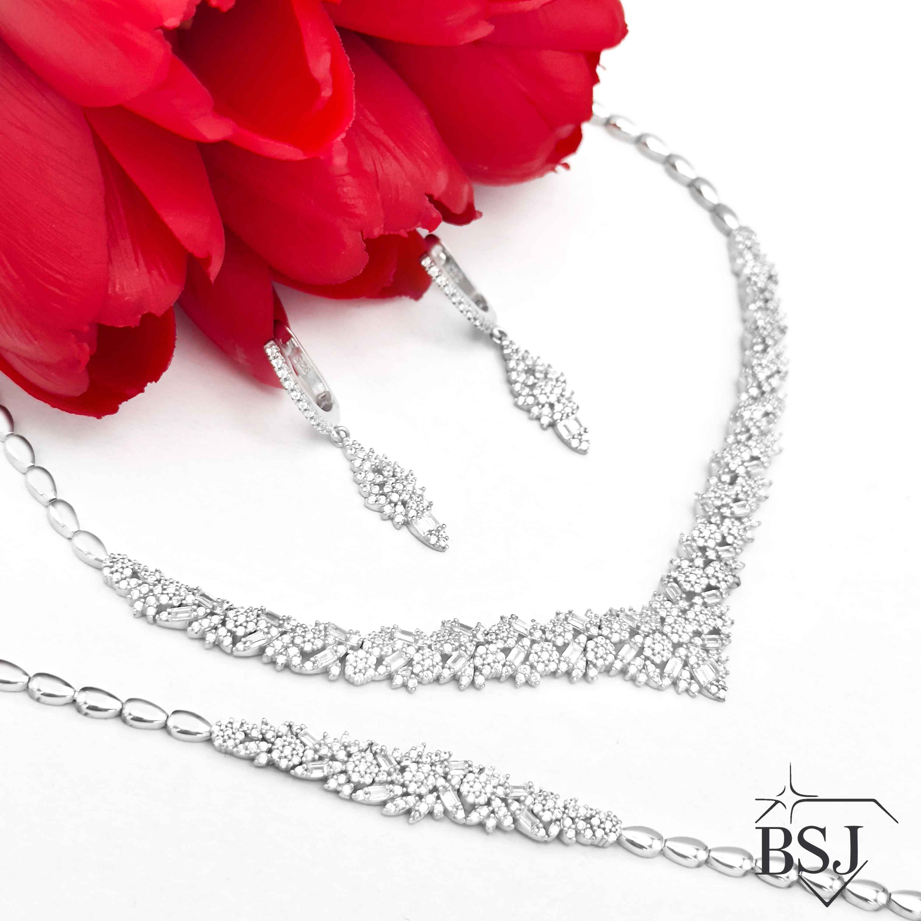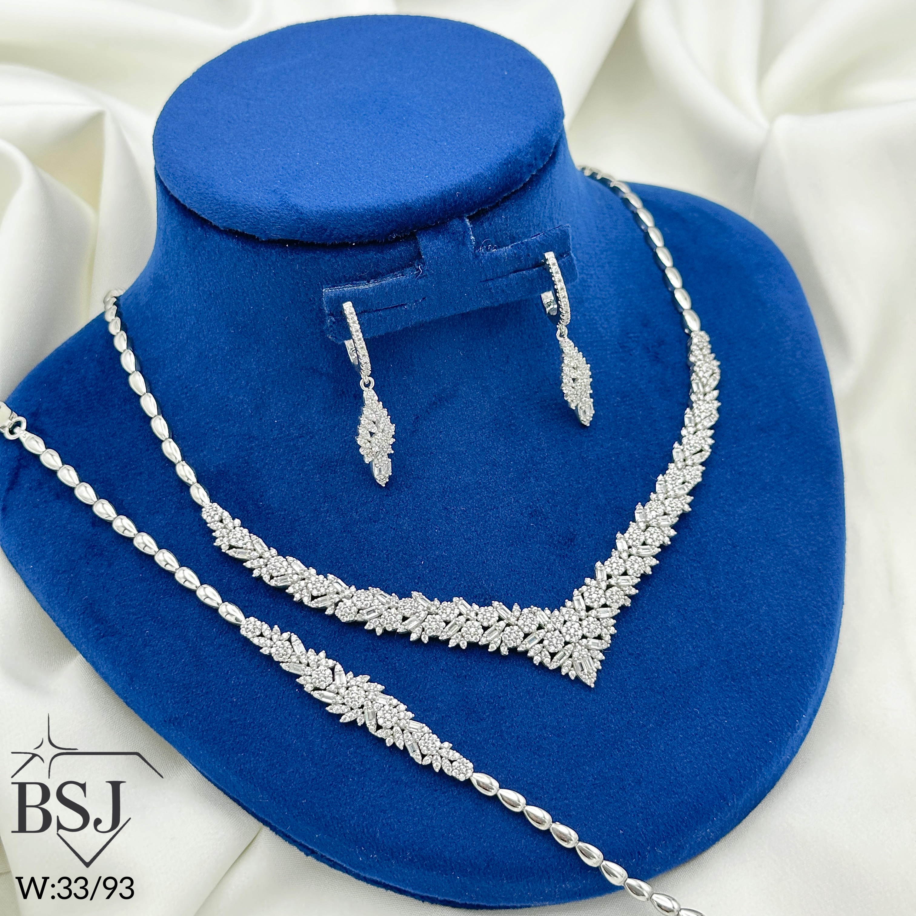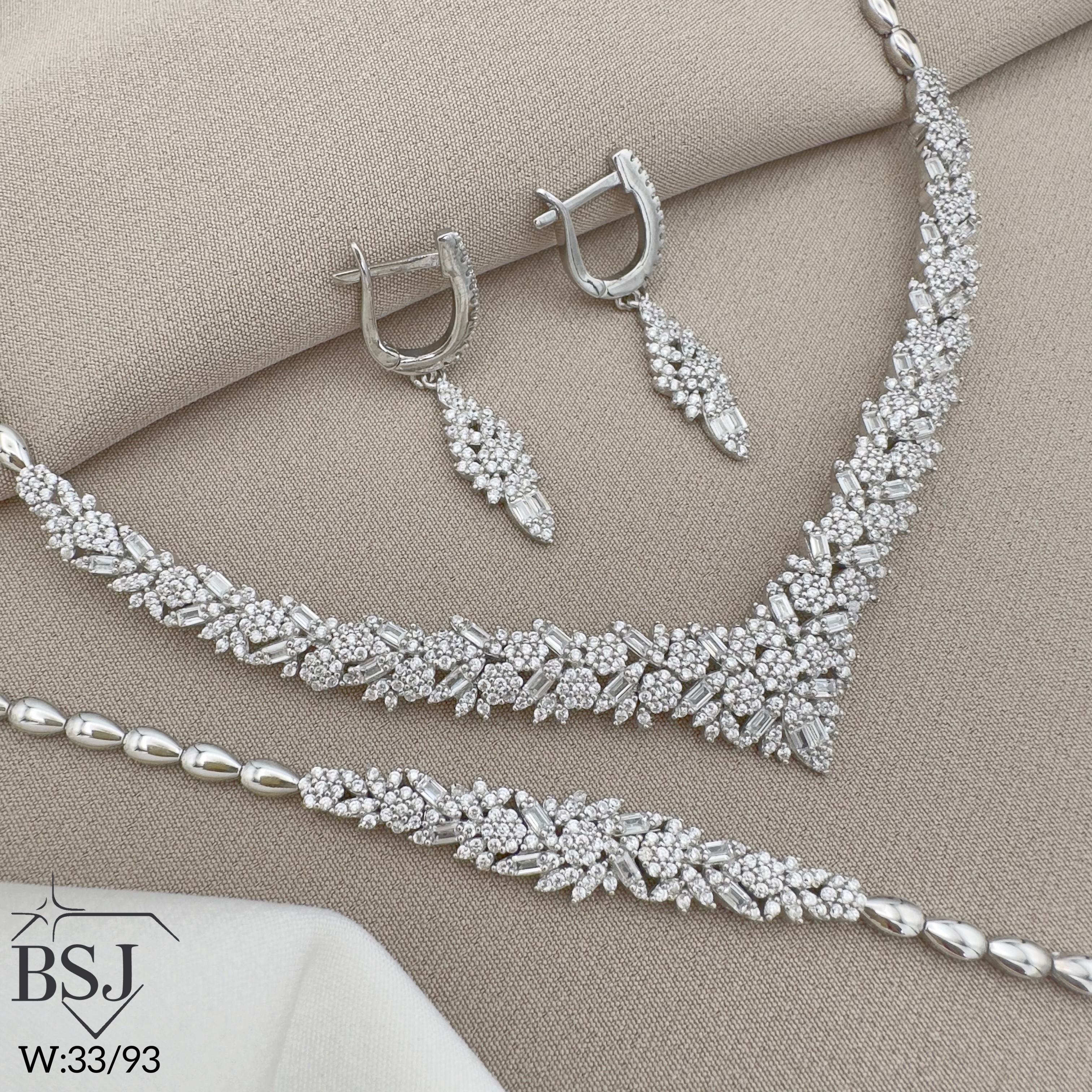 سرویس نقره جواهری زنانه BSJ_S555 از سرویس های اعیانی ساخته شده از نقره با عیار 925 می باشد.سنگ های به کار رفته در آن برلیان و امرالد از جنس اتمی زیرکونیا می باشند که به صورت میکروستینگ مخراج کاری شده اند و در برابر ضربه مقاوم اند.آبکاری دو مرحله ای رودیوم (طلا سفید)، سبب کیفیت بی نظیر دوام رنگ آن شده است و به دلیل عدم استفاده از نیکل در ساختار آن، بدون حساسیت بوده و با پوست حساس سازگار است.به دلیل کیفیت فوق العاده و درخشش عالی سنگ ها، تفاوتی با نمونه طلا ندارد.وزن سرویس 33.93 گرم می باشد.