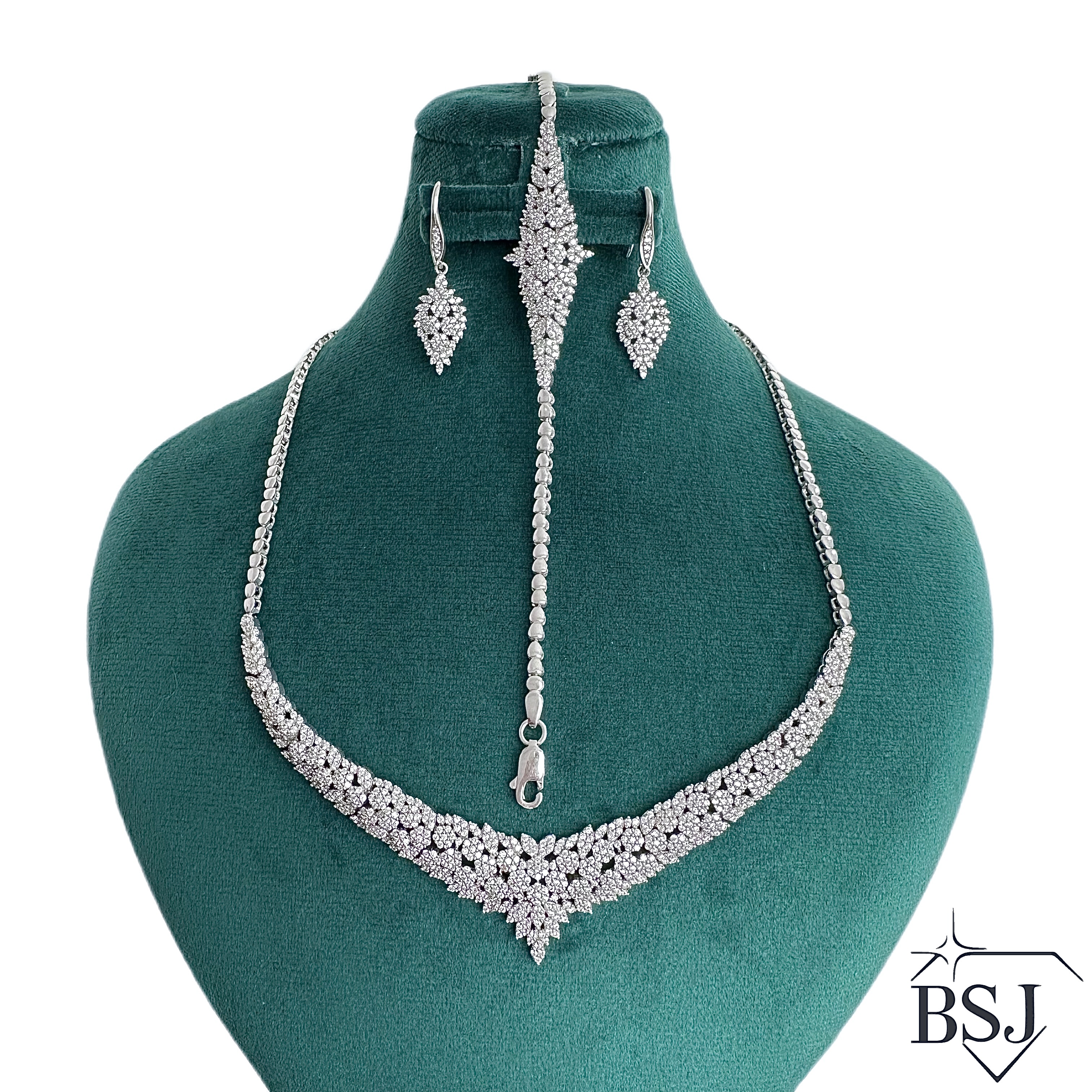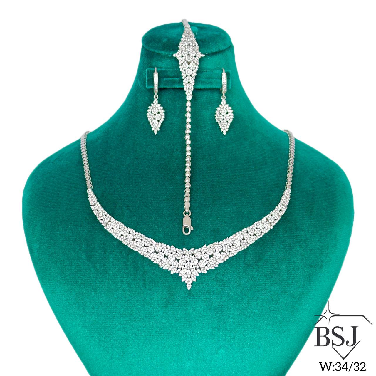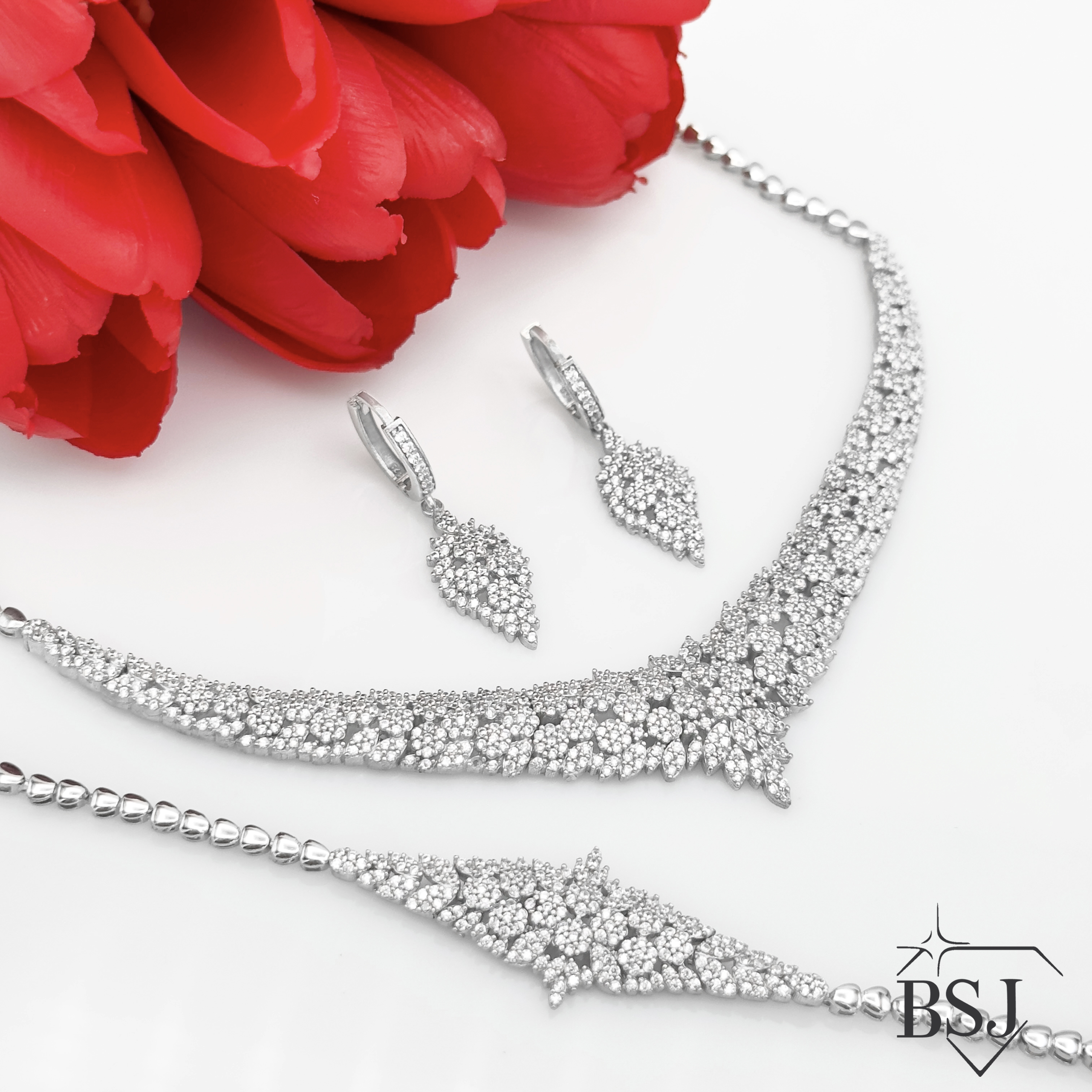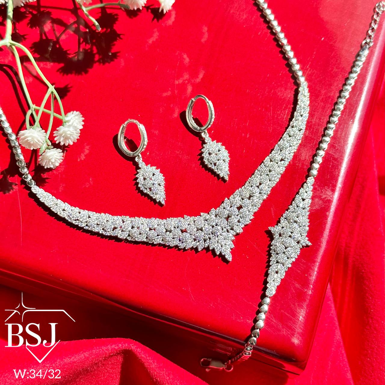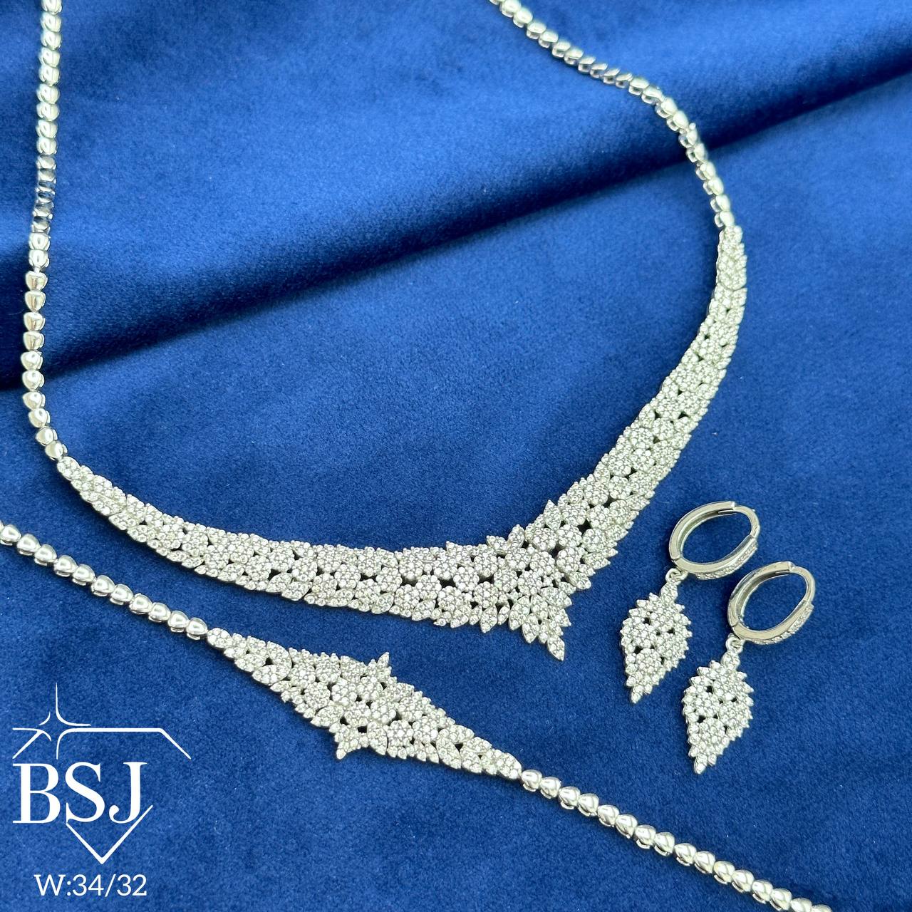 سرویس نقره جواهری زنانه BSJ_S533 از سرویس های لوکس ساخته شده از نقره با عیار 925 می باشد.سنگ های به کار رفته در آن برلیان از جنس اتمی زیرکونیا می باشند که به صورت میکروستینگ مخراج کاری شده اند و در برابر ضربه مقاوم اند.آبکاری دو مرحله ای رودیوم (طلا سفید)، سبب کیفیت بی نظیر دوام رنگ آن شده است و به دلیل عدم استفاده از نیکل در ساختار آن، بدون حساسیت بوده و با پوست حساس سازگار است.به دلیل کیفیت فوق العاده و درخشش عالی سنگ ها، تفاوتی با نمونه طلا ندارد.وزن سرویس 34.32 گرم می باشد.