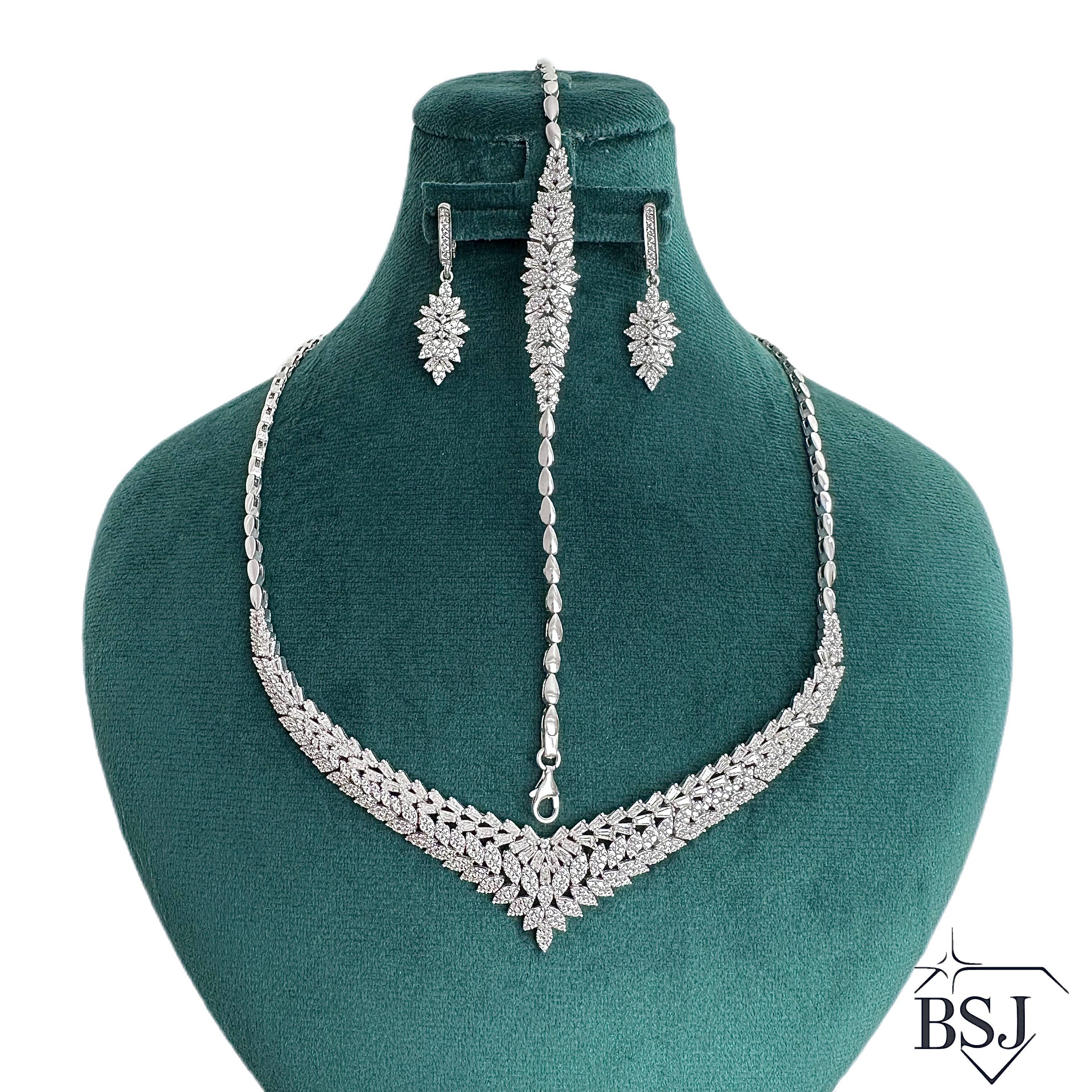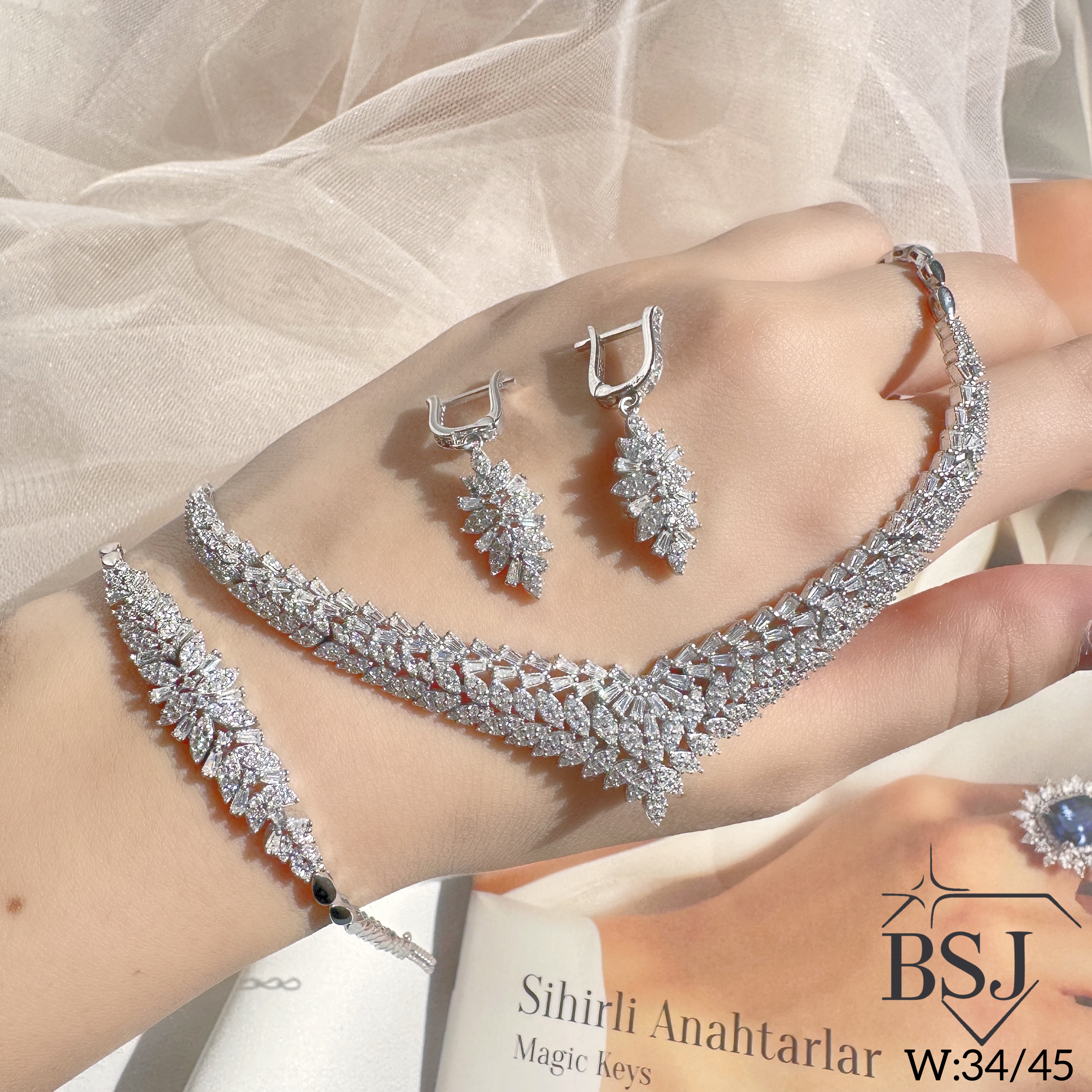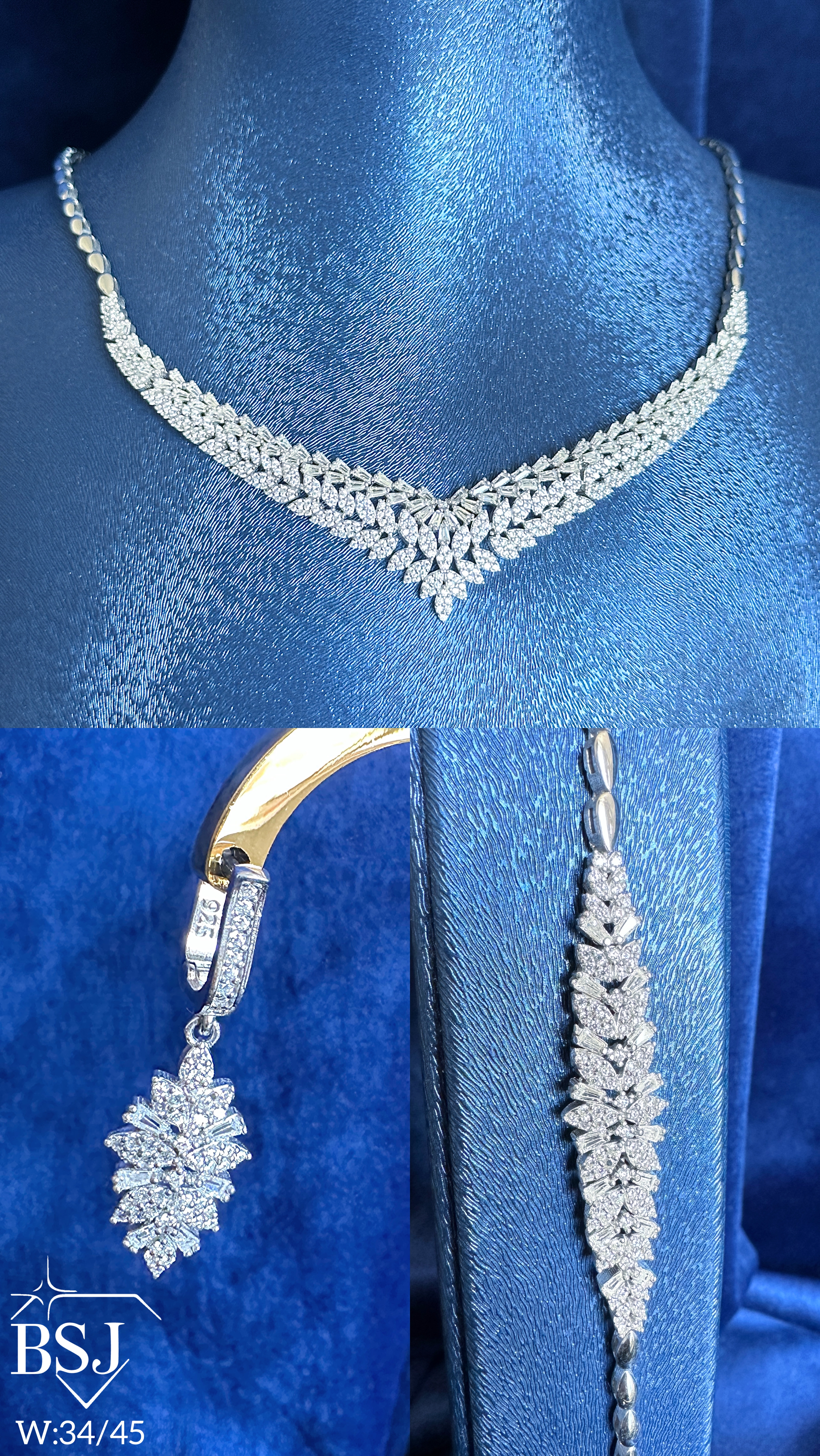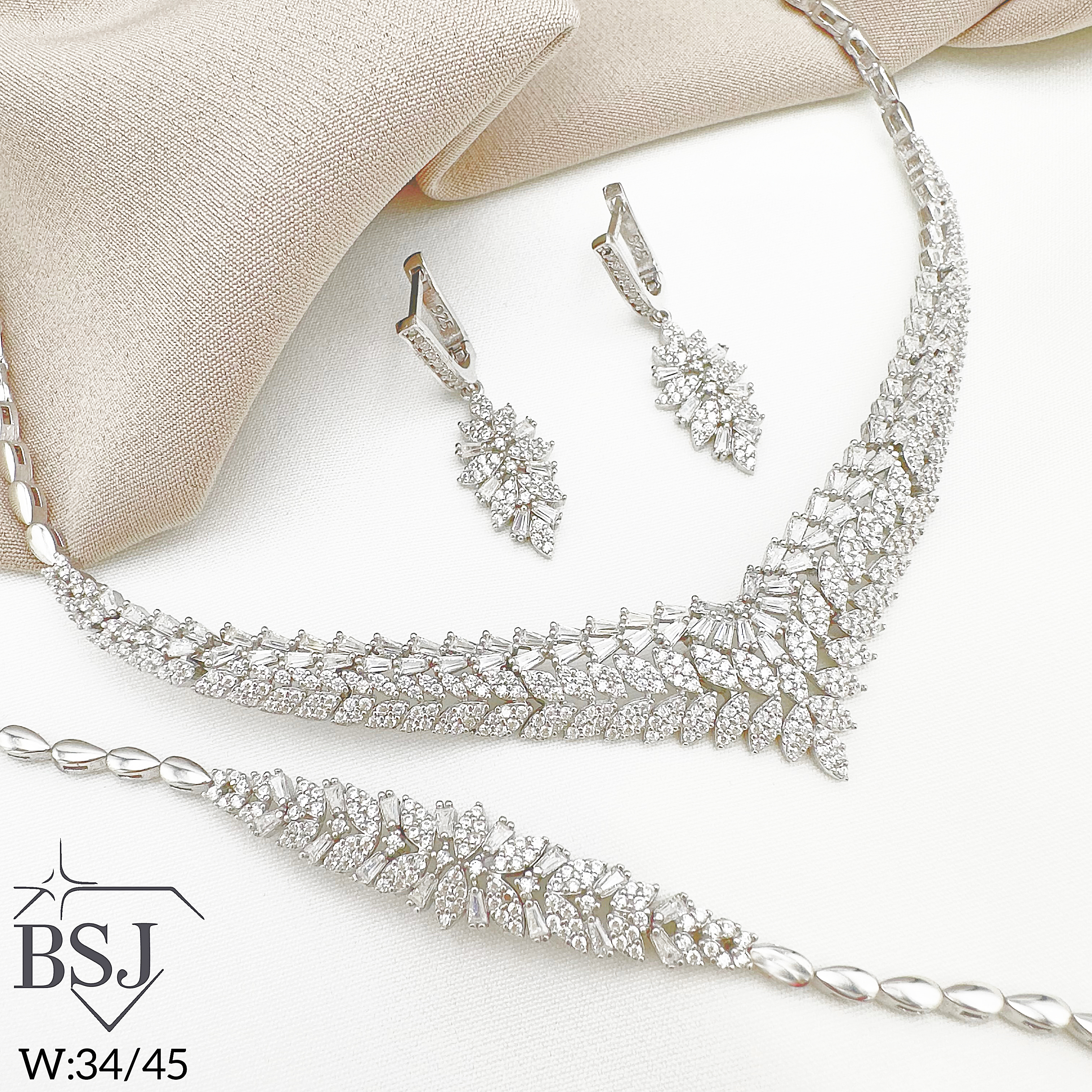 سرویس نقره جواهری زنانه BSJ_S535 از سرویس های لوکس ساخته شده از نقره با عیار 925 می باشد.سنگ های به کار رفته در آن برلیان و امرالد از جنس اتمی زیرکونیا می باشند که به صورت میکروستینگ مخراج کاری شده اند و در برابر ضربه مقاوم اند.آبکاری دو مرحله ای رودیوم (طلاسفید)، سبب کیفیت بی نظیر دوام رنگ آن شده است و به دلیل عدم استفاده از نیکل در ساختار آن، بدون حساسیت بوده و با پوست حساس سازگار است.به دلیل کیفیت فوق العاده و درخشش عالی سنگ ها، تفاوتی با نمونه طلا ندارد.وزن سرویس 34.01 گرم می باشد.