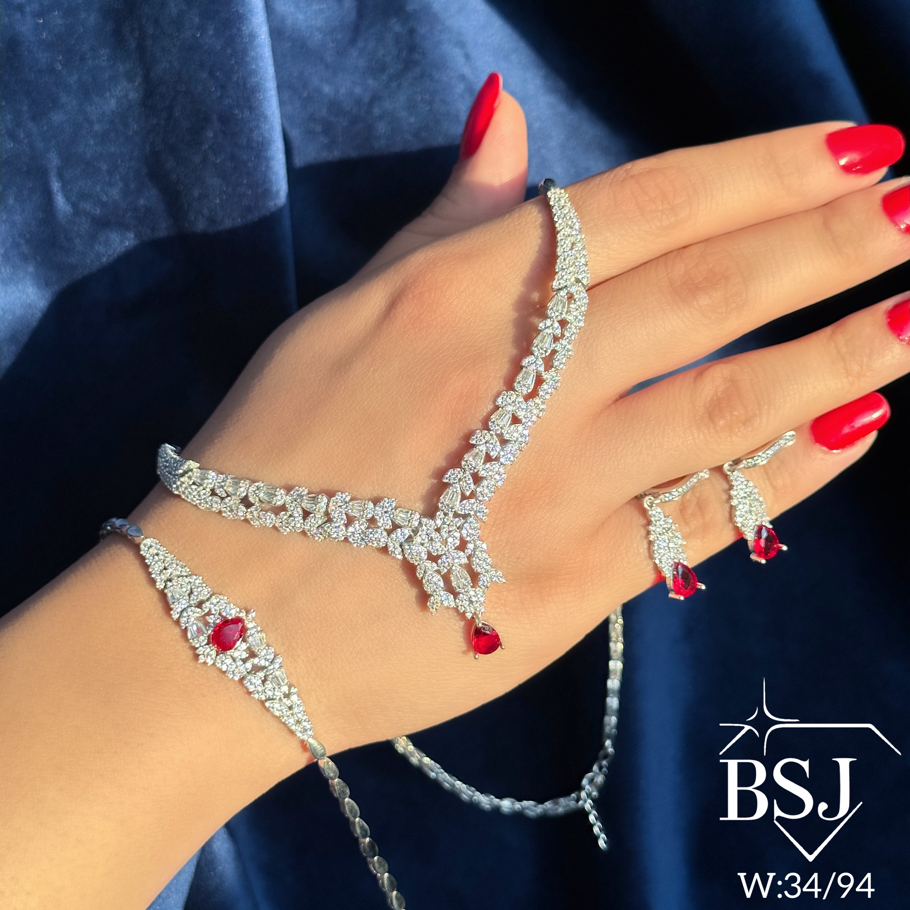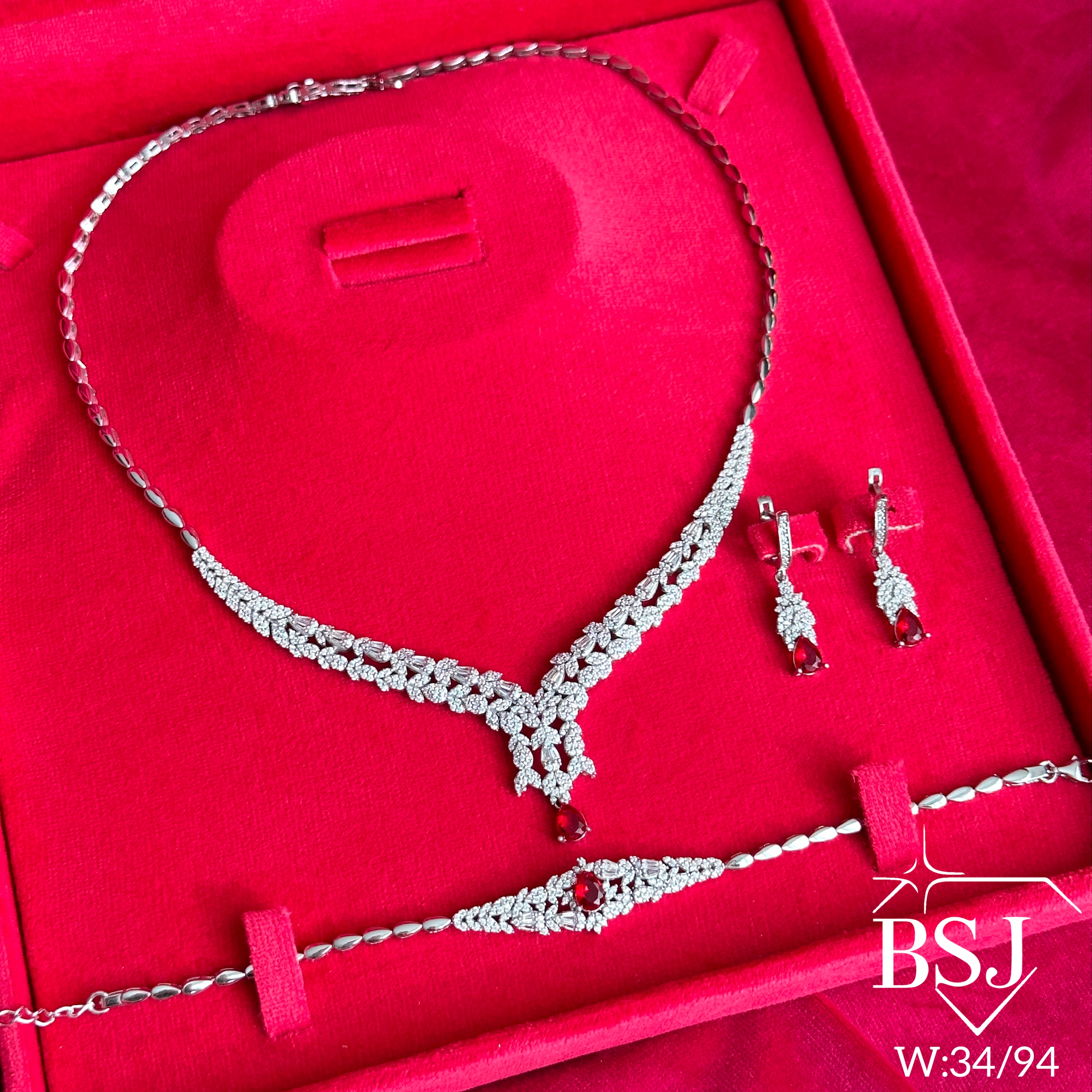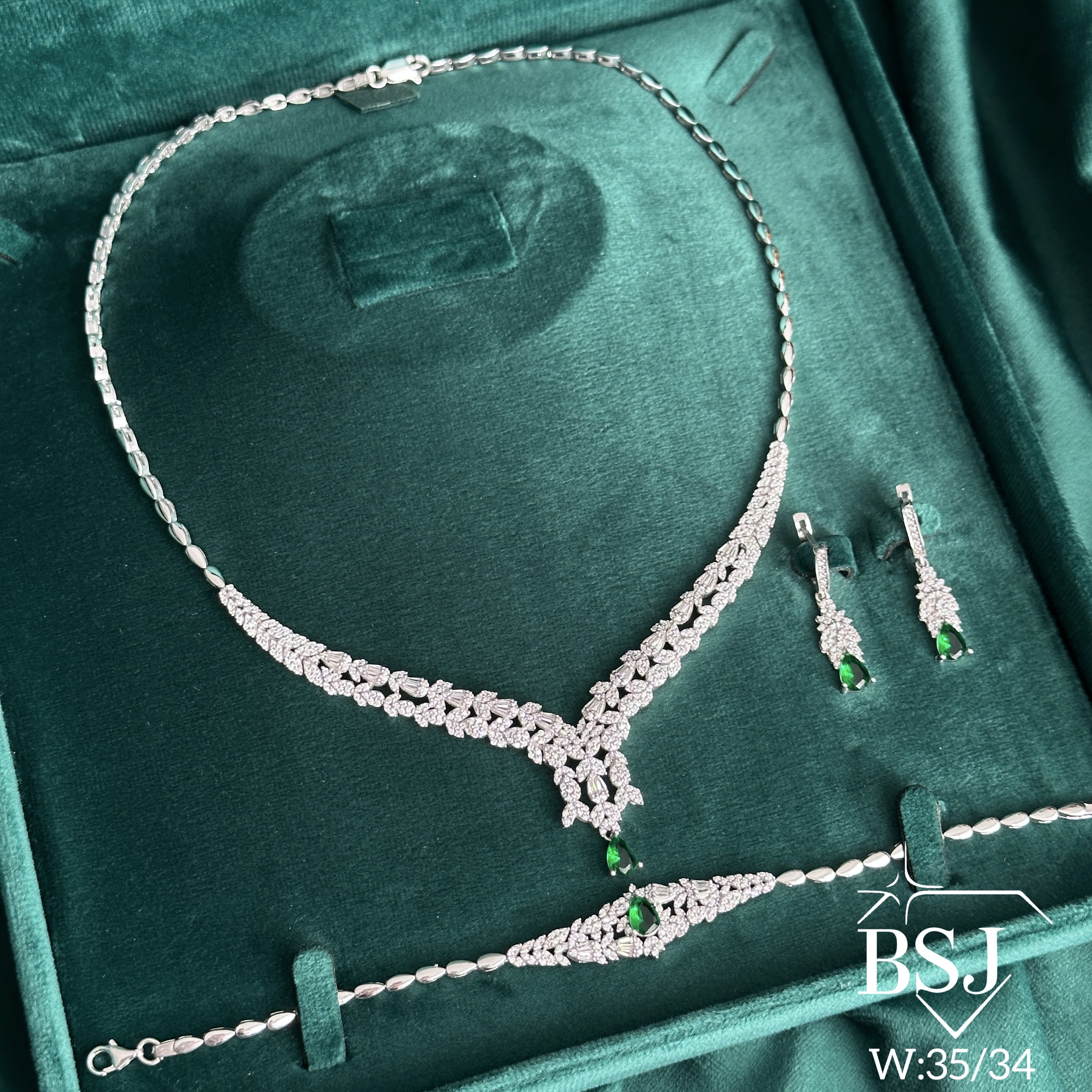 سرویس نقره جواهری کبود زنانه BSJ_S544 از سرویس های اعیانی ساخته شده از نقره با عیار 925 می باشد.سنگ های به کار رفته در آن برلیان و از جنس اتمی زیرکونیا و سنگ های برلیان سنتتیک (آزمایشگاهی) می باشند که به صورت میکروستینگ مخراج کاری شده اند و در برابر ضربه مقاوم اند.آبکاری دو مرحله ای رودیوم (طلاسفید)، سبب کیفیت بی نظیر دوام رنگ آن شده است و به دلیل عدم استفاده از نیکل در ساختار آن، بدون حساسیت بوده و با پوست حساس سازگار است.به دلیل کیفیت فوق العاده و درخشش عالی سنگ ها، تفاوتی با نمونه طلا ندارد.وزن سرویس35+ گرم می باشد.