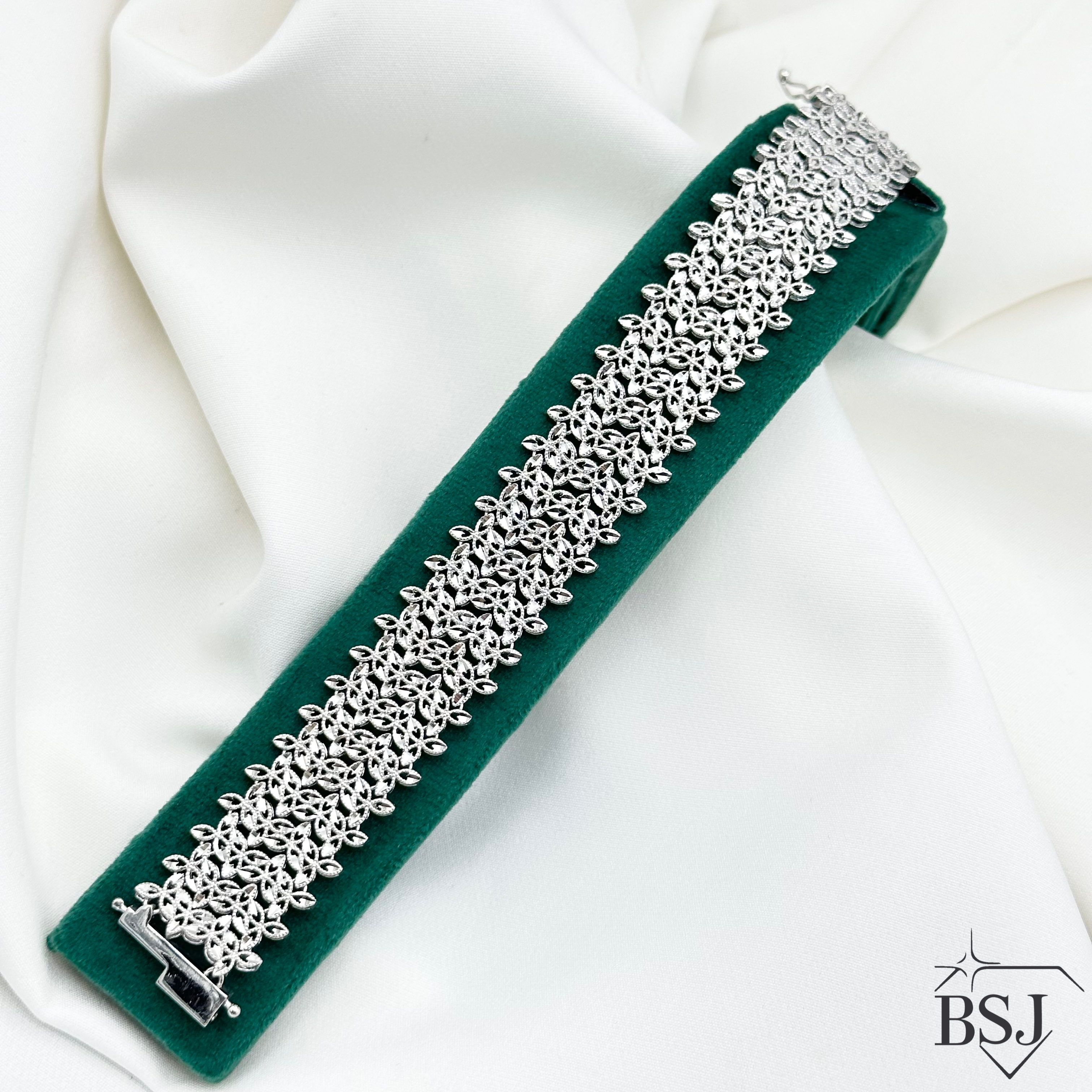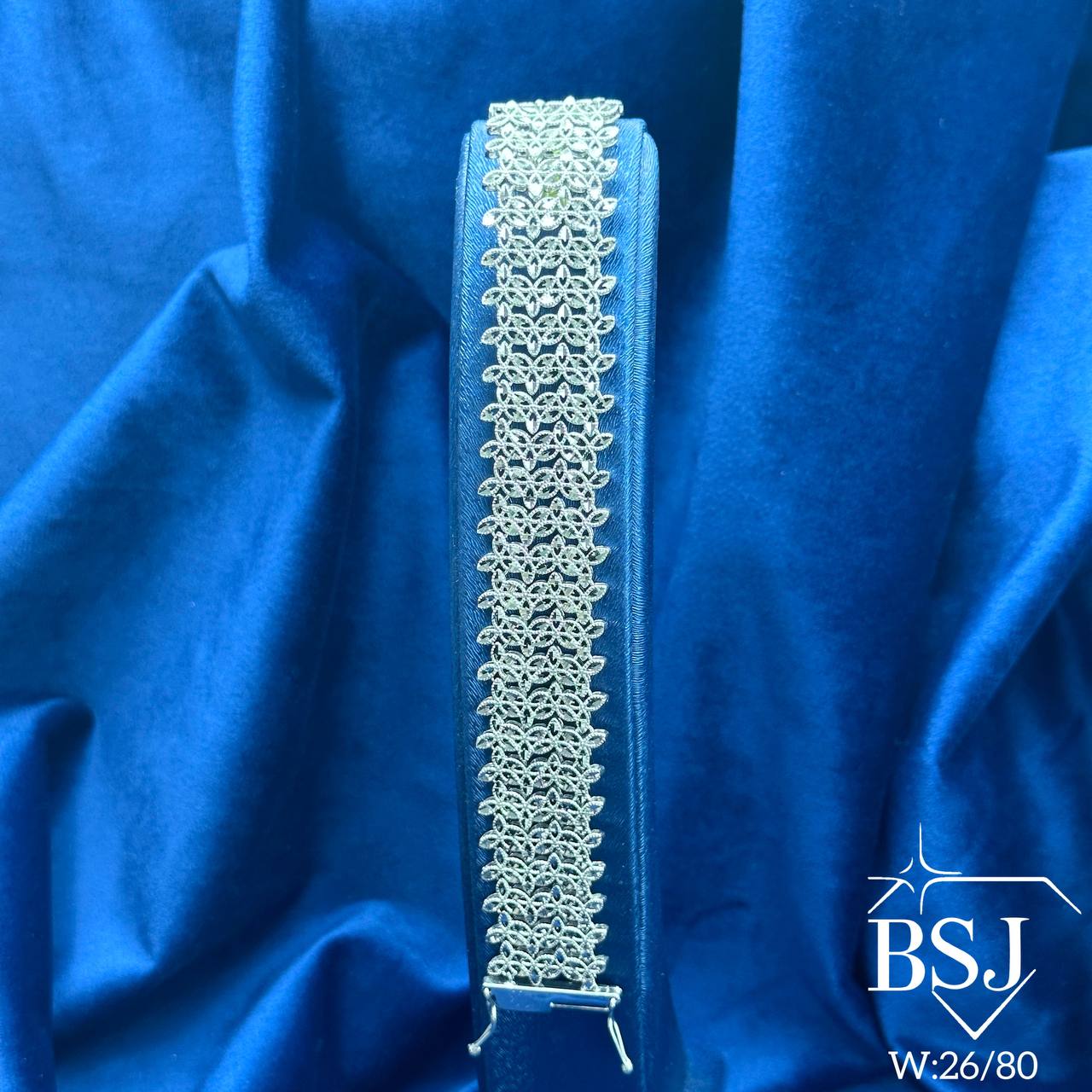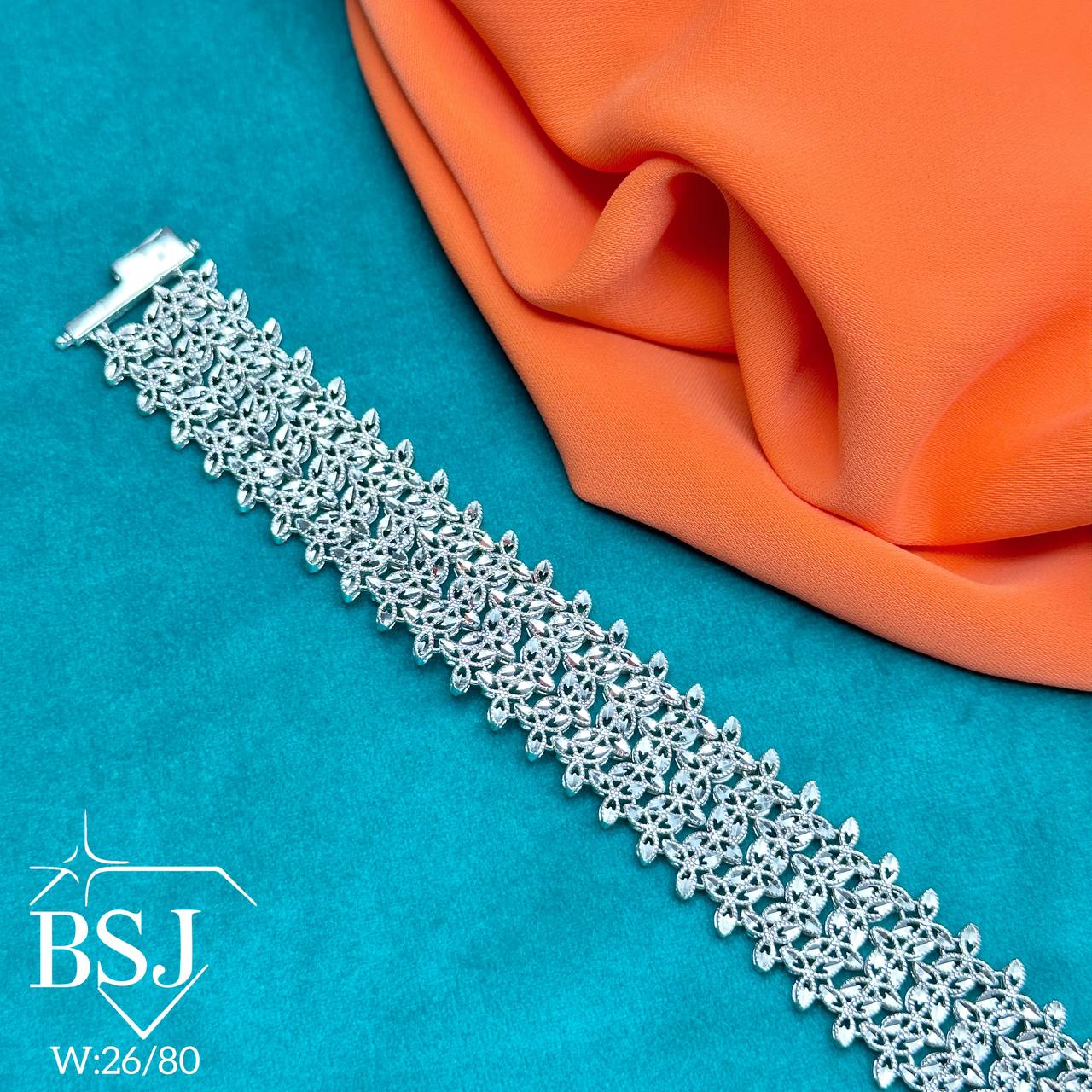 دستبند نقره تراش زنانه BSJ_D554 از دستبندهای شیک ساخته شده از نقره با عیار 925 می باشد.این دستبند بدون نگین بوده و تماما از جنس نقره می باشد.آبکاری دو مرحله ای رودیوم (طلا سفید)، سبب کیفیت بی نظیر دوام رنگ آن شده است و به دلیل عدم استفاده از نیکل در ساختار آن، بدون حساسیت بوده و با پوست حساس سازگار است.وزن دستبند 26.80 گرم می باشد.