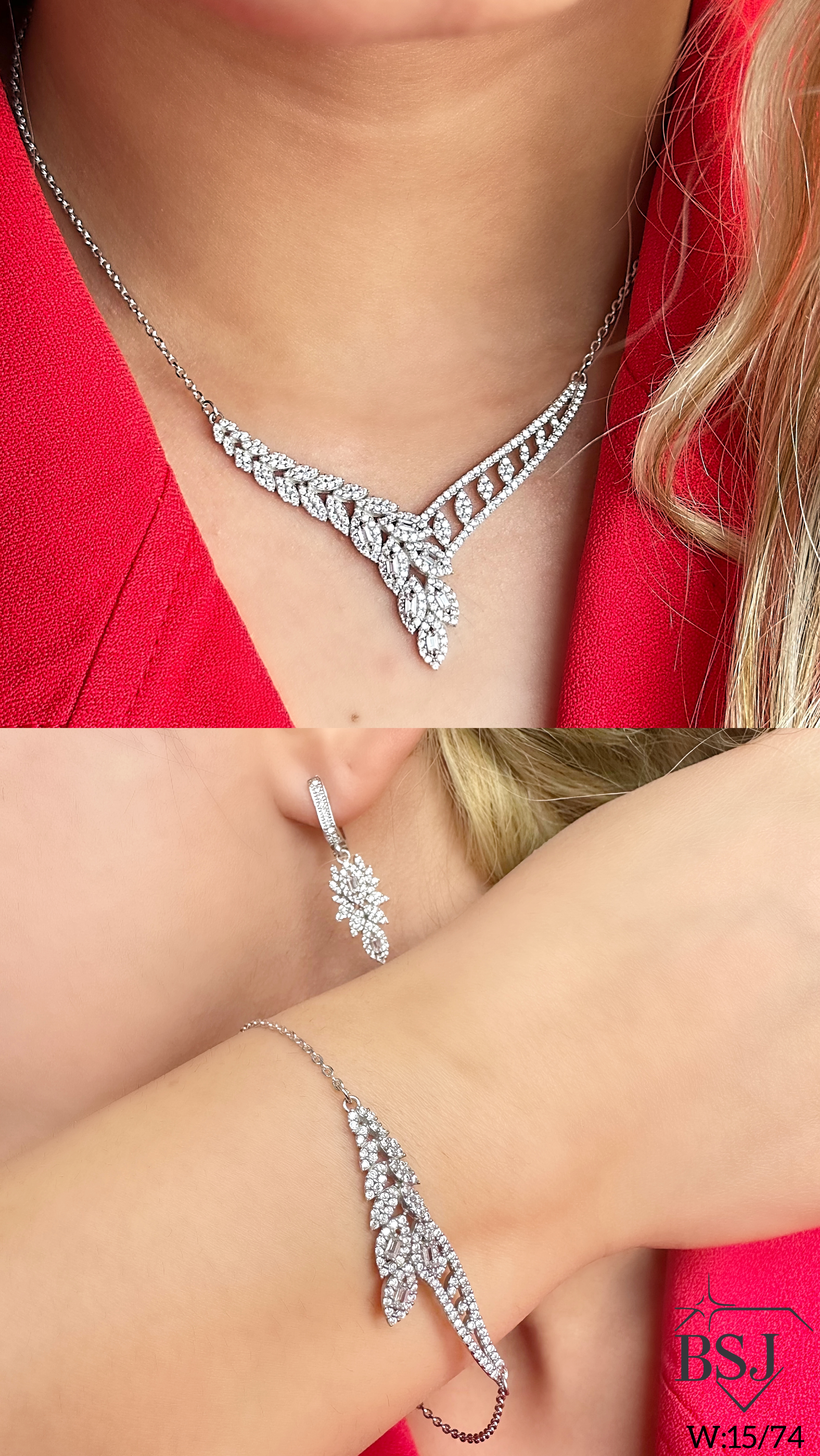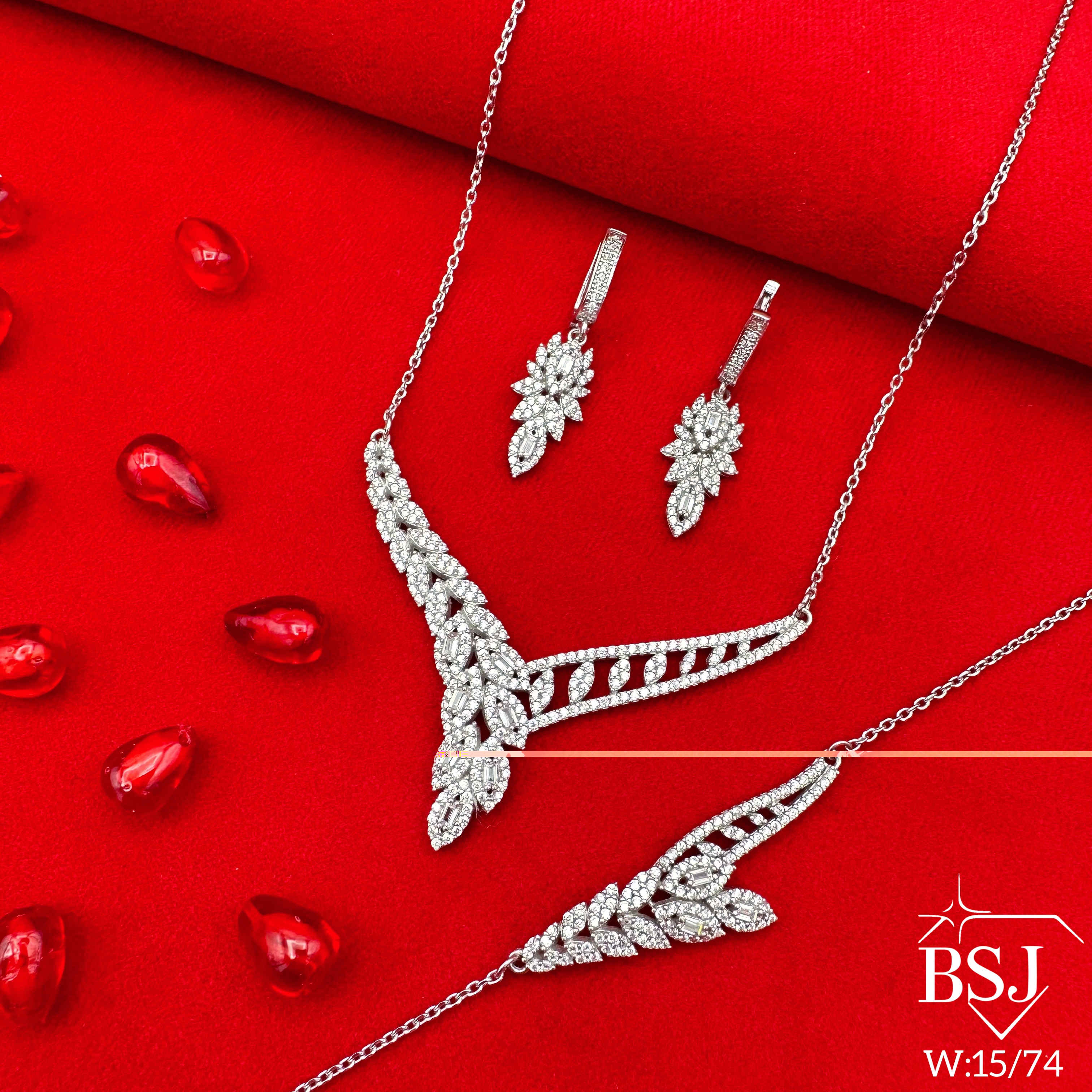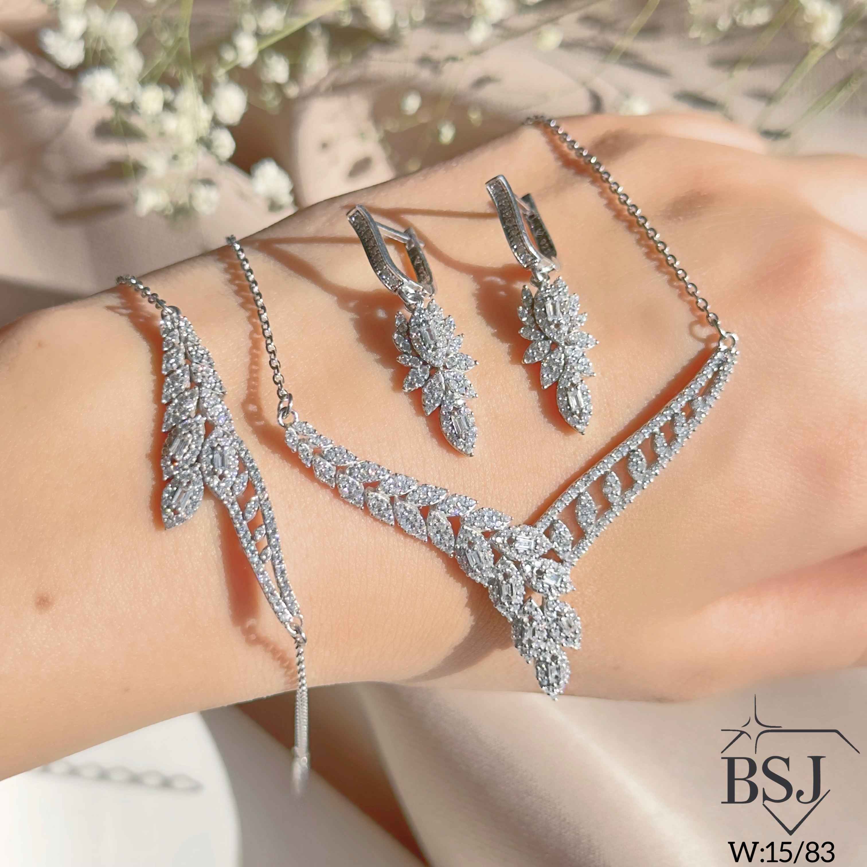 سرویس نقره جواهری زنانه BSJ_S562 از سرویس های اعیانی ساخته شده از نقره با عیار 925 می باشد.سنگ های به کار رفته در آن برلیان و امرالد از جنس اتمی زیرکونیا می باشند که به صورت میکروستینگ مخراج کاری شده اند و در برابر ضربه مقاوم اند.آبکاری دو مرحله ای رودیوم (طلا سفید)، سبب کیفیت بی نظیر دوام رنگ آن شده است و به دلیل عدم استفاده از نیکل در ساختار آن، بدون حساسیت بوده و با پوست حساس سازگار است.به دلیل کیفیت فوق العاده و درخشش عالی سنگ ها، تفاوتی با نمونه طلا ندارد.وزن سرویس +-15.83 گرم می باشد.