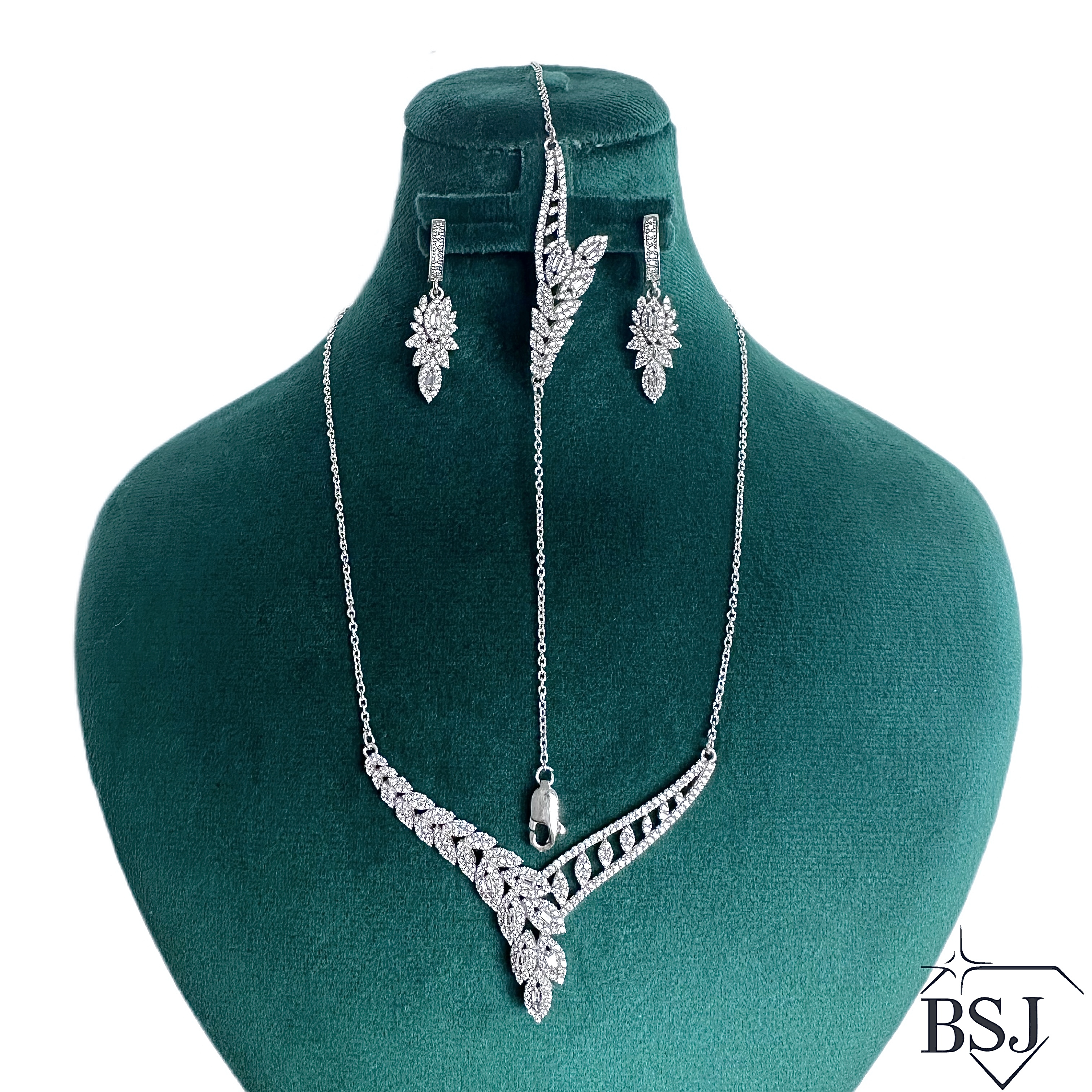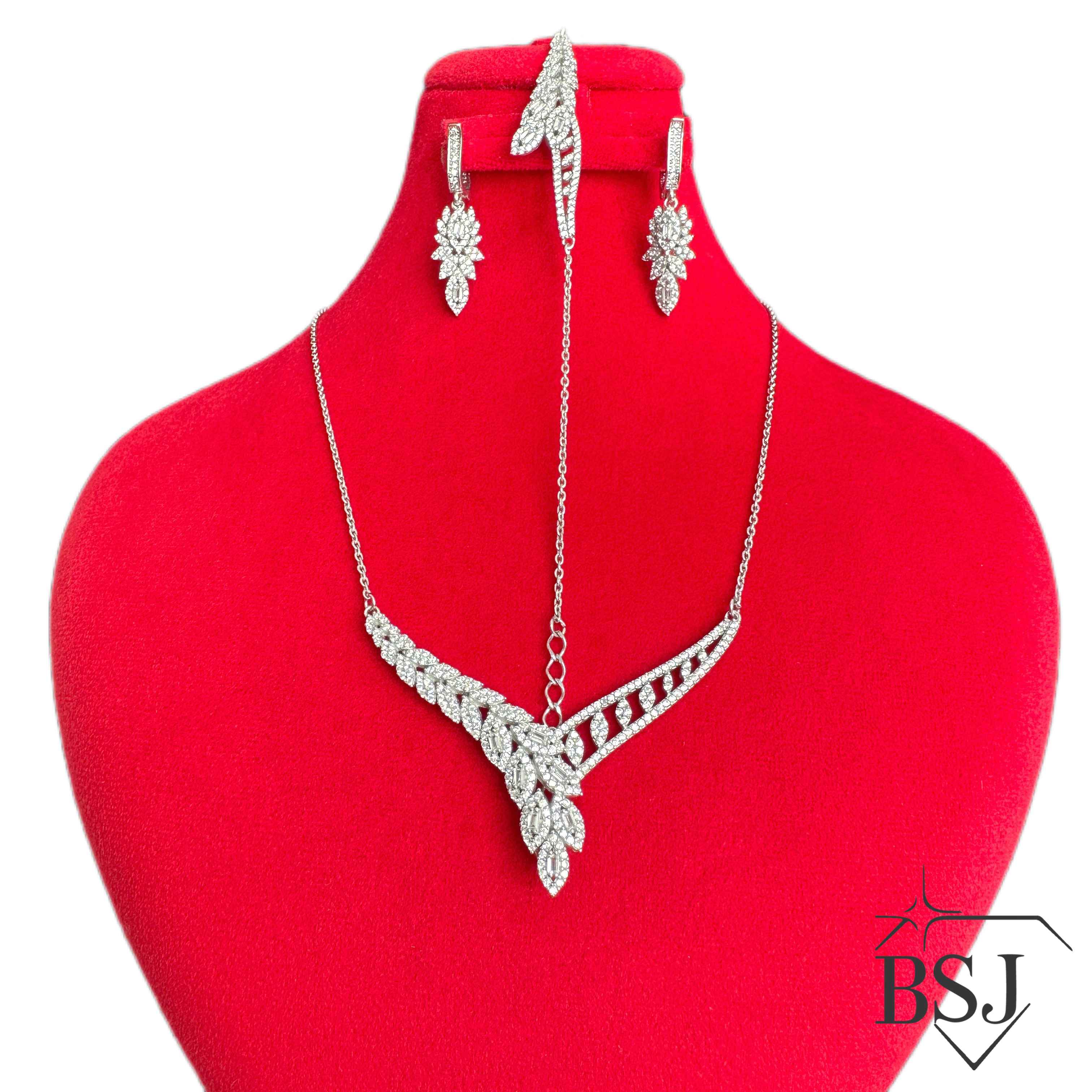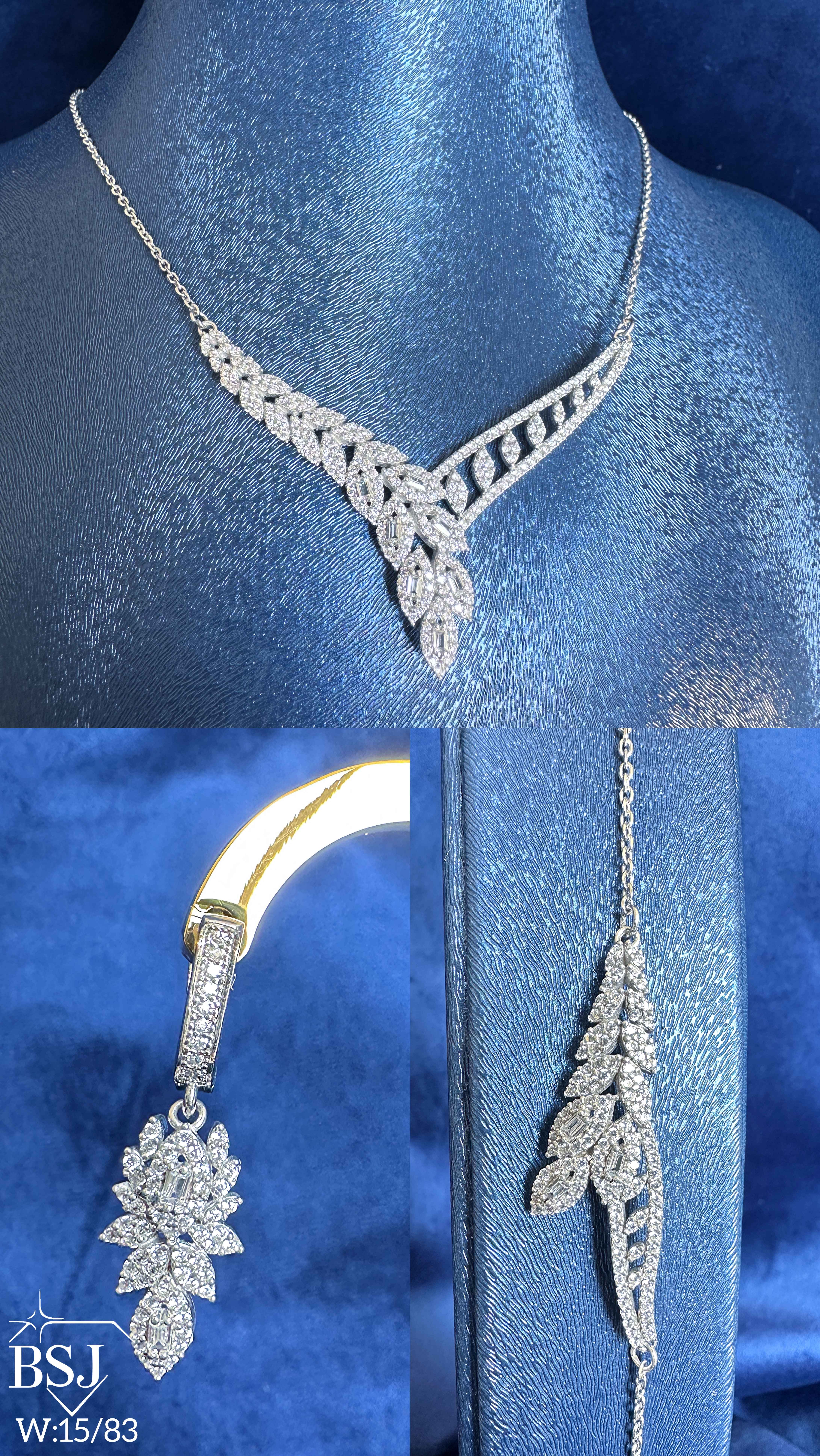 سرویس نقره جواهری زنانه BSJ_S562 از سرویس های اعیانی ساخته شده از نقره با عیار 925 می باشد.سنگ های به کار رفته در آن برلیان و امرالد از جنس اتمی زیرکونیا می باشند که به صورت میکروستینگ مخراج کاری شده اند و در برابر ضربه مقاوم اند.آبکاری دو مرحله ای رودیوم (طلا سفید)، سبب کیفیت بی نظیر دوام رنگ آن شده است و به دلیل عدم استفاده از نیکل در ساختار آن، بدون حساسیت بوده و با پوست حساس سازگار است.به دلیل کیفیت فوق العاده و درخشش عالی سنگ ها، تفاوتی با نمونه طلا ندارد.وزن سرویس +-15.83 گرم می باشد.