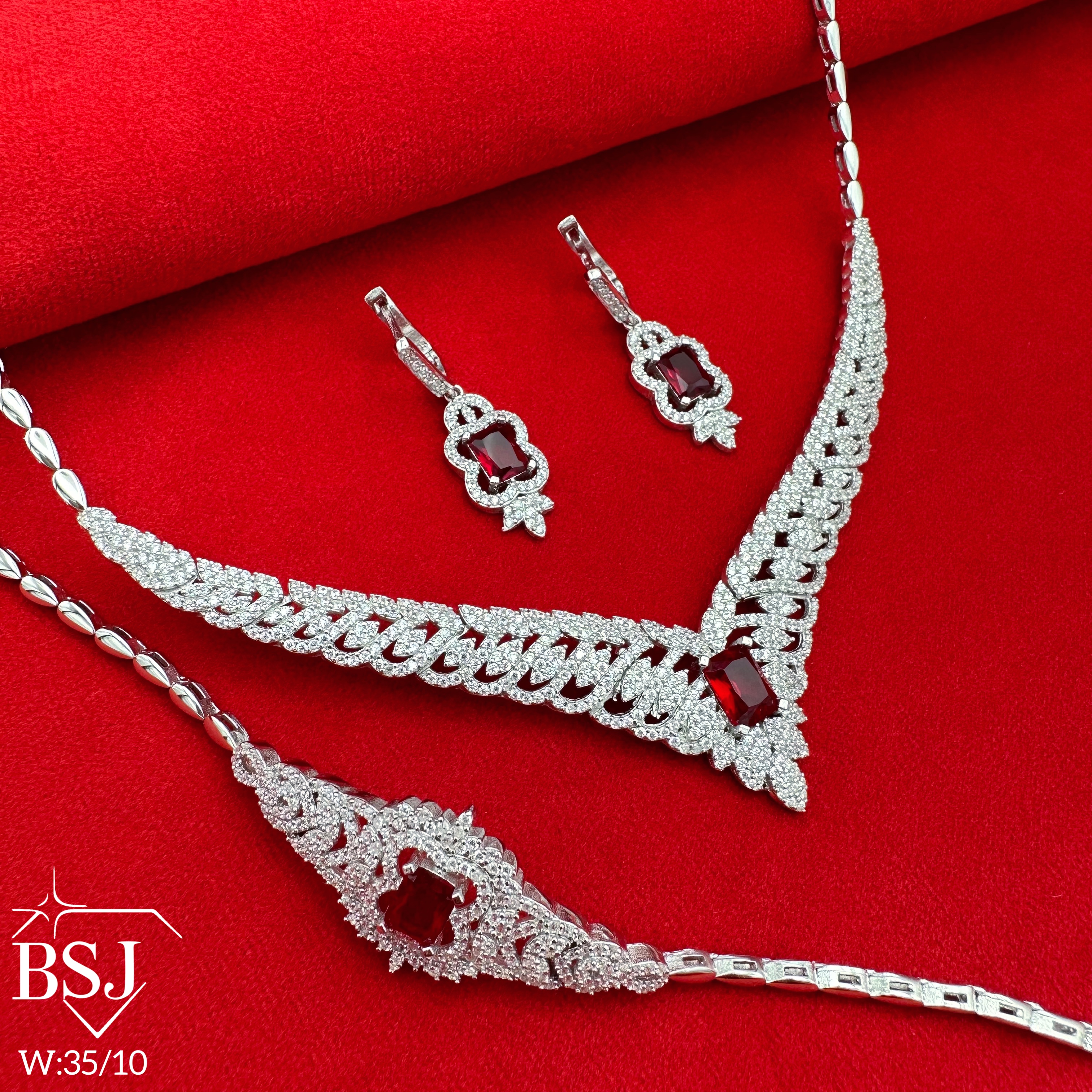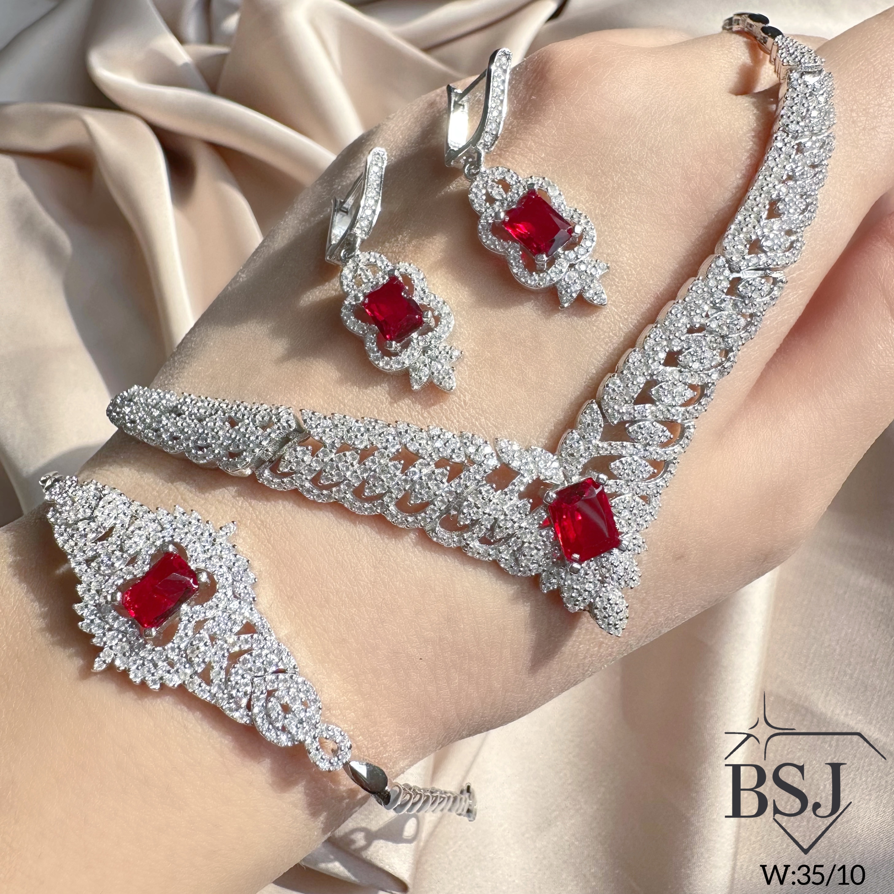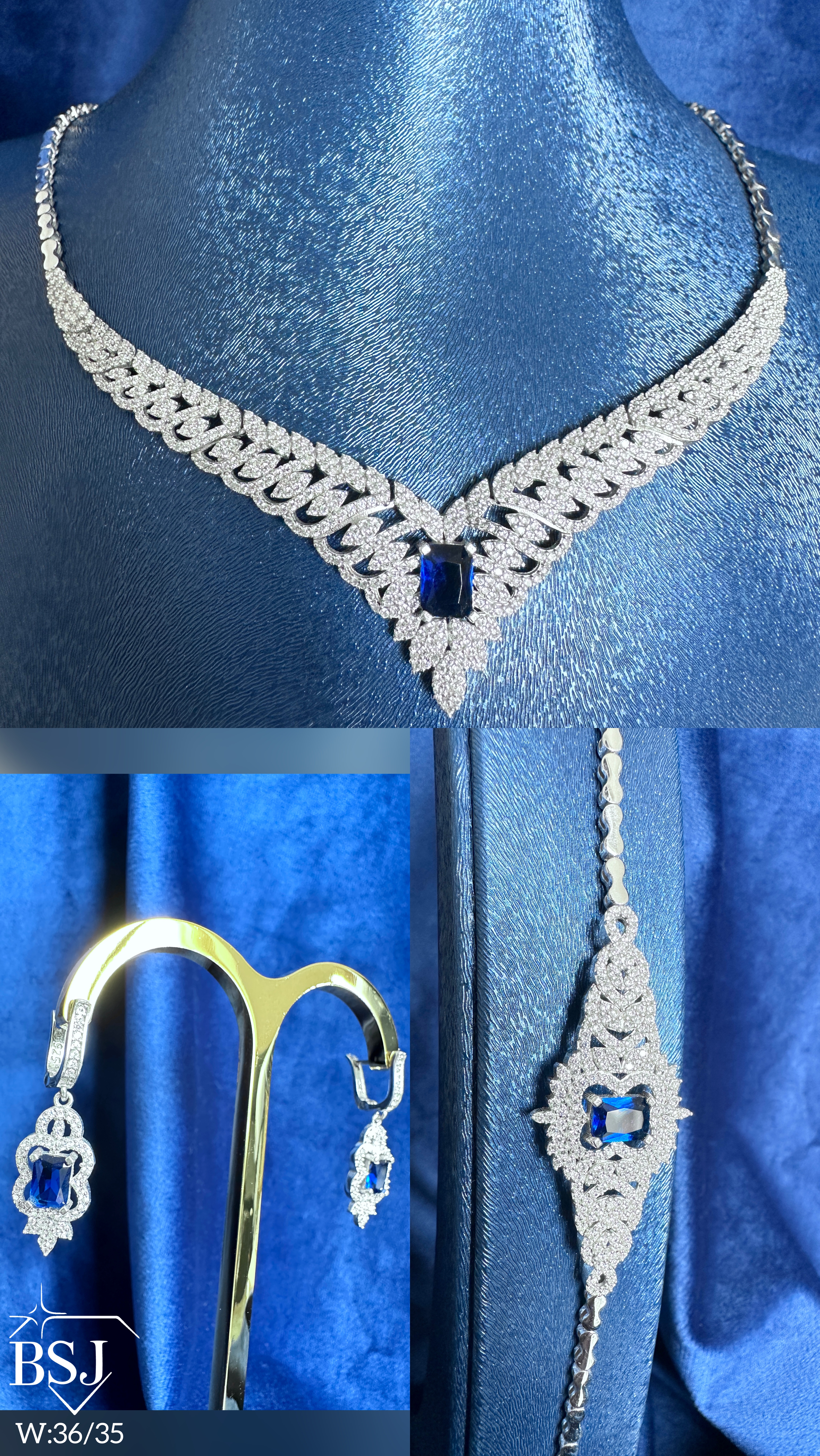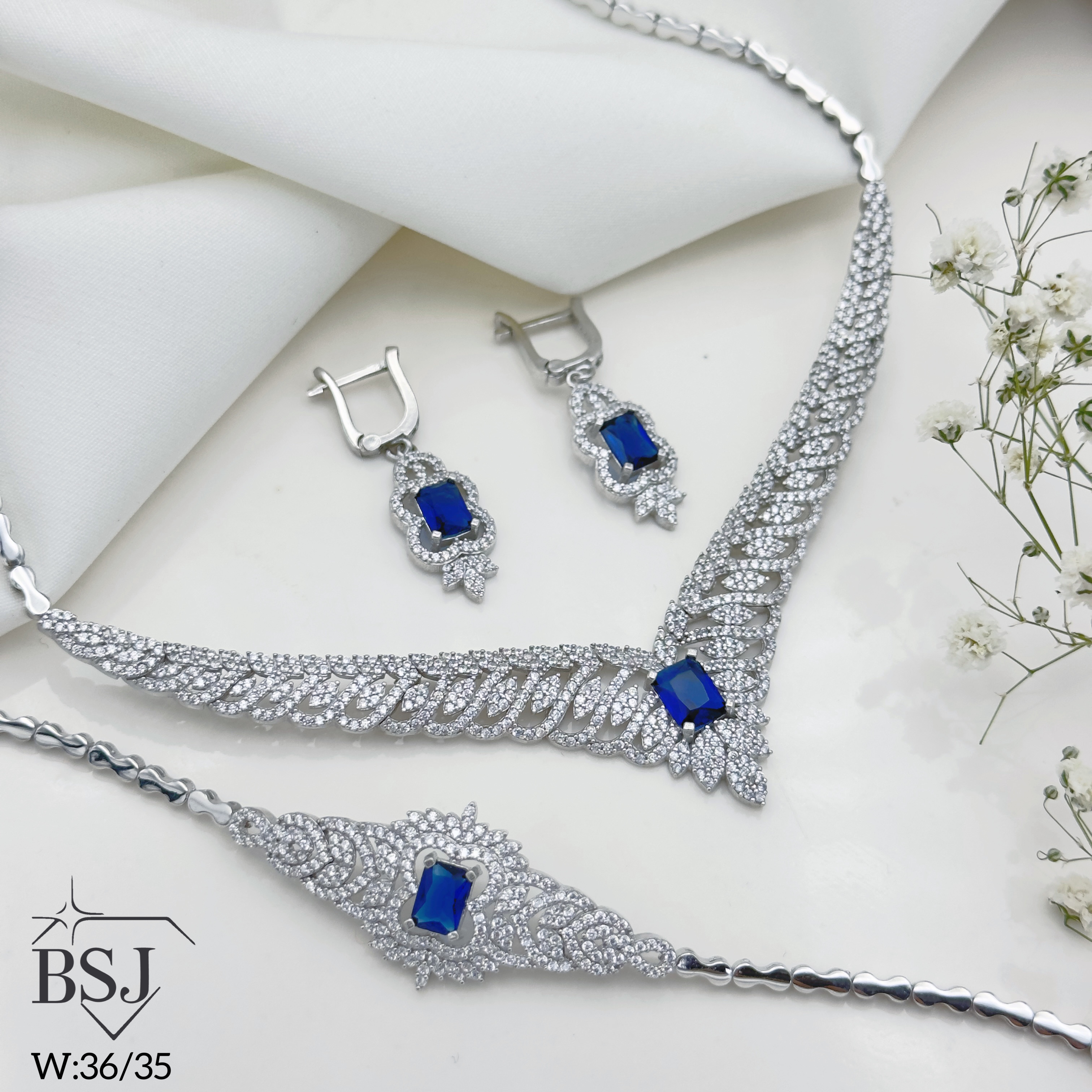 سرویس نقره جواهری کبود زنانه BSJ_S536 از سرویس های اعیانی ساخته شده از نقره با عیار 925 می باشد.سنگ های به کار رفته در آن برلیان و از جنس اتمی زیرکونیا و سنگ های برلیان کبود سنتتیک (آزمایشگاهی) می باشند که به صورت میکروستینگ مخراج کاری شده اند و در برابر ضربه مقاوم اند.آبکاری دو مرحله ای رودیوم (طلاسفید)، سبب کیفیت بی نظیر دوام رنگ آن شده است و به دلیل عدم استفاده از نیکل در ساختار آن، بدون حساسیت بوده و با پوست حساس سازگار است.به دلیل کیفیت فوق العاده و درخشش عالی سنگ ها، تفاوتی با نمونه طلا ندارد.وزن سرویس 36.35 گرم می باشد.