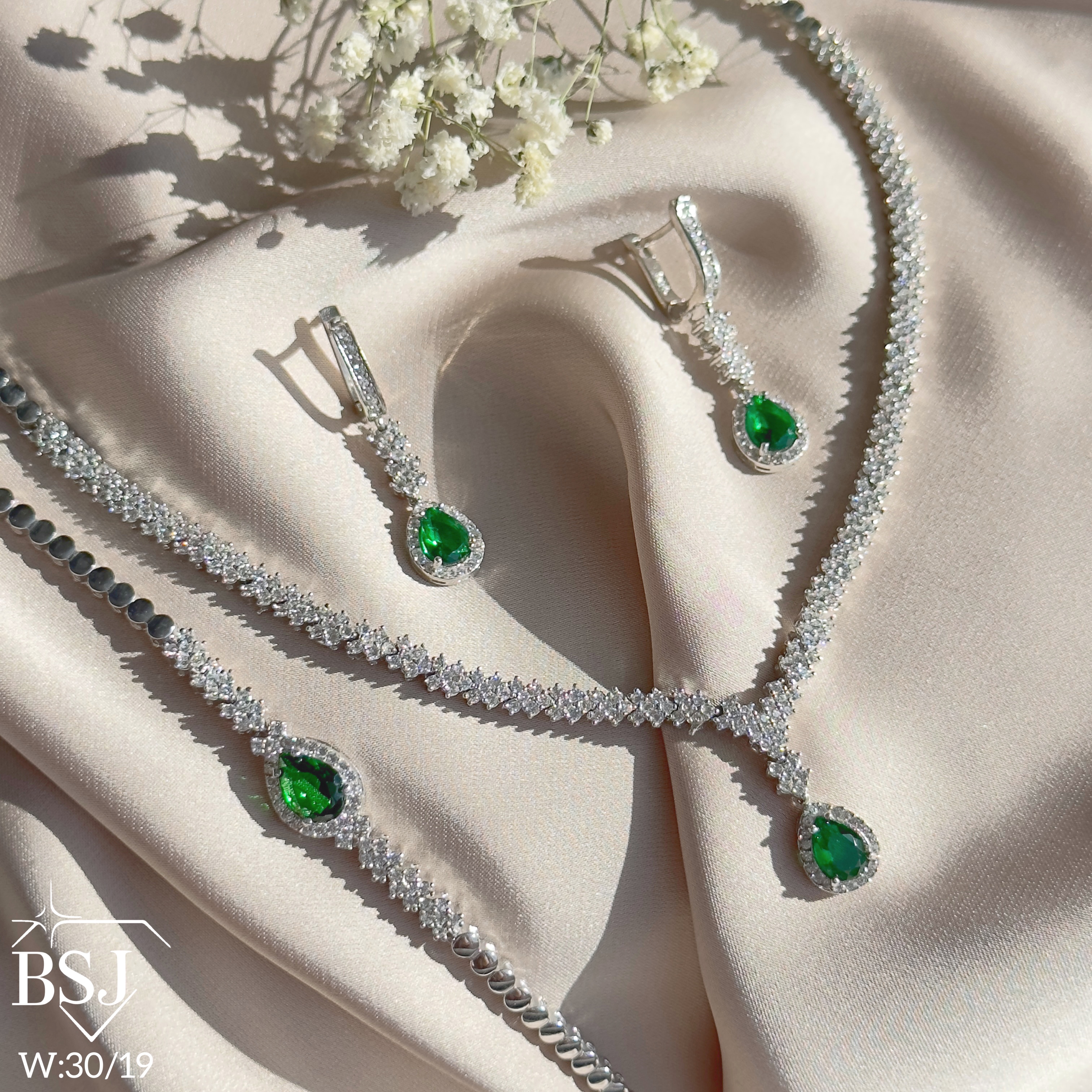 سرویس نقره جواهری زنانه BSJ_S570 یکی از سرویس های مجلسی و لوکس ساخته شده از نقره با عیار 925 می باشد.سنگ های به کار رفته در آن برلیان از جنس اتمی زیرکونیا و چند عدد نگین رنگی سبز زمردی سنتتیک(آزمایشگاهی) می باشند که به صورت میکروستینگ مخراج کاری شده اند و در برابر ضربه مقاوم اند.آبکاری دو مرحله ای رودیوم (طلا سفید)، سبب کیفیت بی نظیر دوام رنگ آن شده است و به دلیل عدم استفاده از نیکل در ساختار آن، بدون حساسیت بوده و با پوست حساس سازگار است.به دلیل کیفیت فوق العاده و درخشش عالی آن، تفاوتی با نمونه طلا ندارد.وزن سرویس 30.19 گرم می باشد