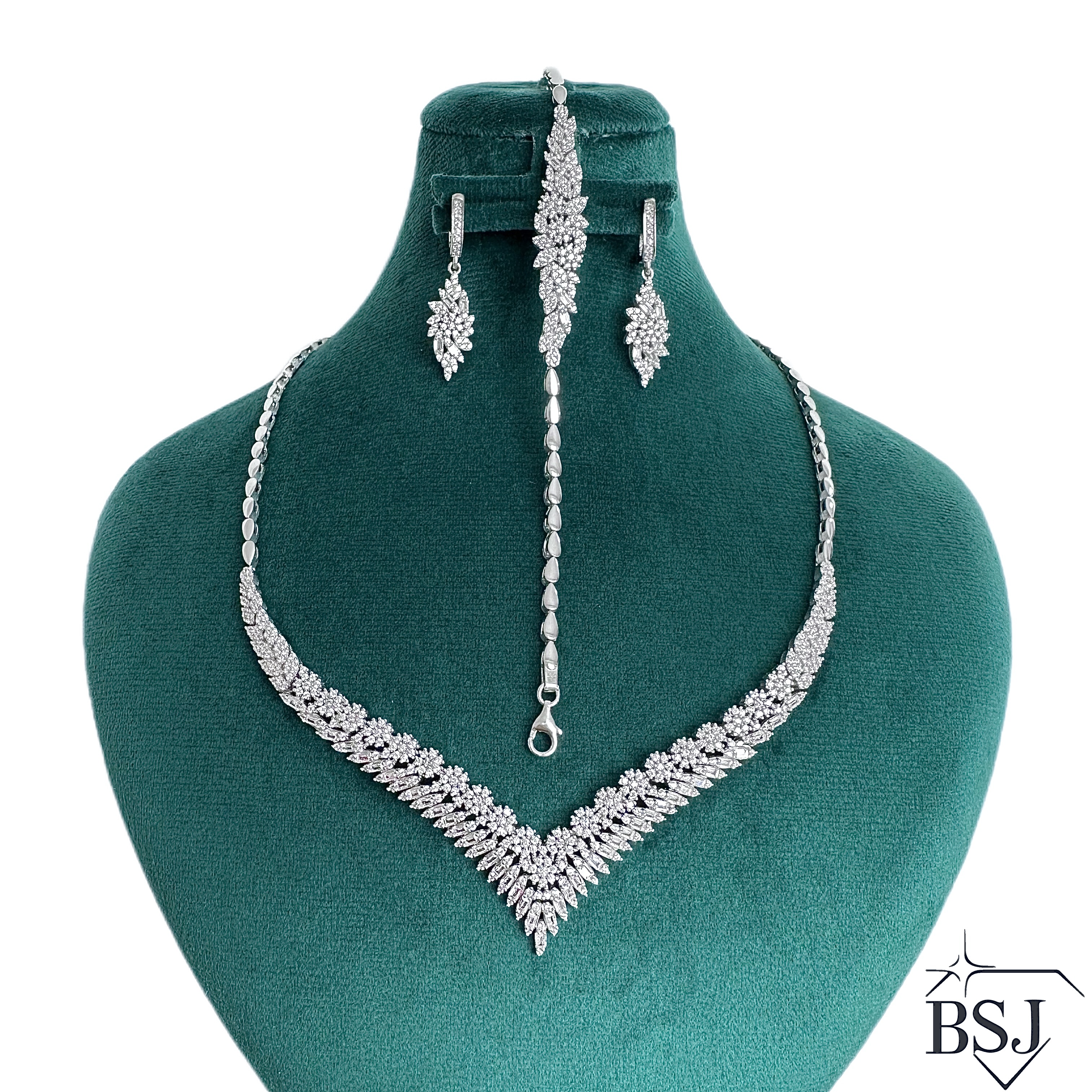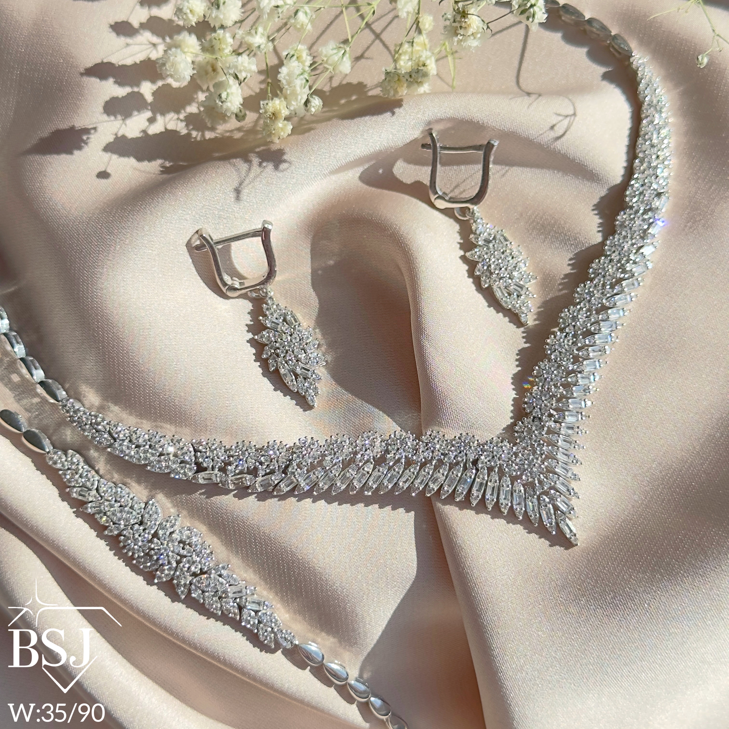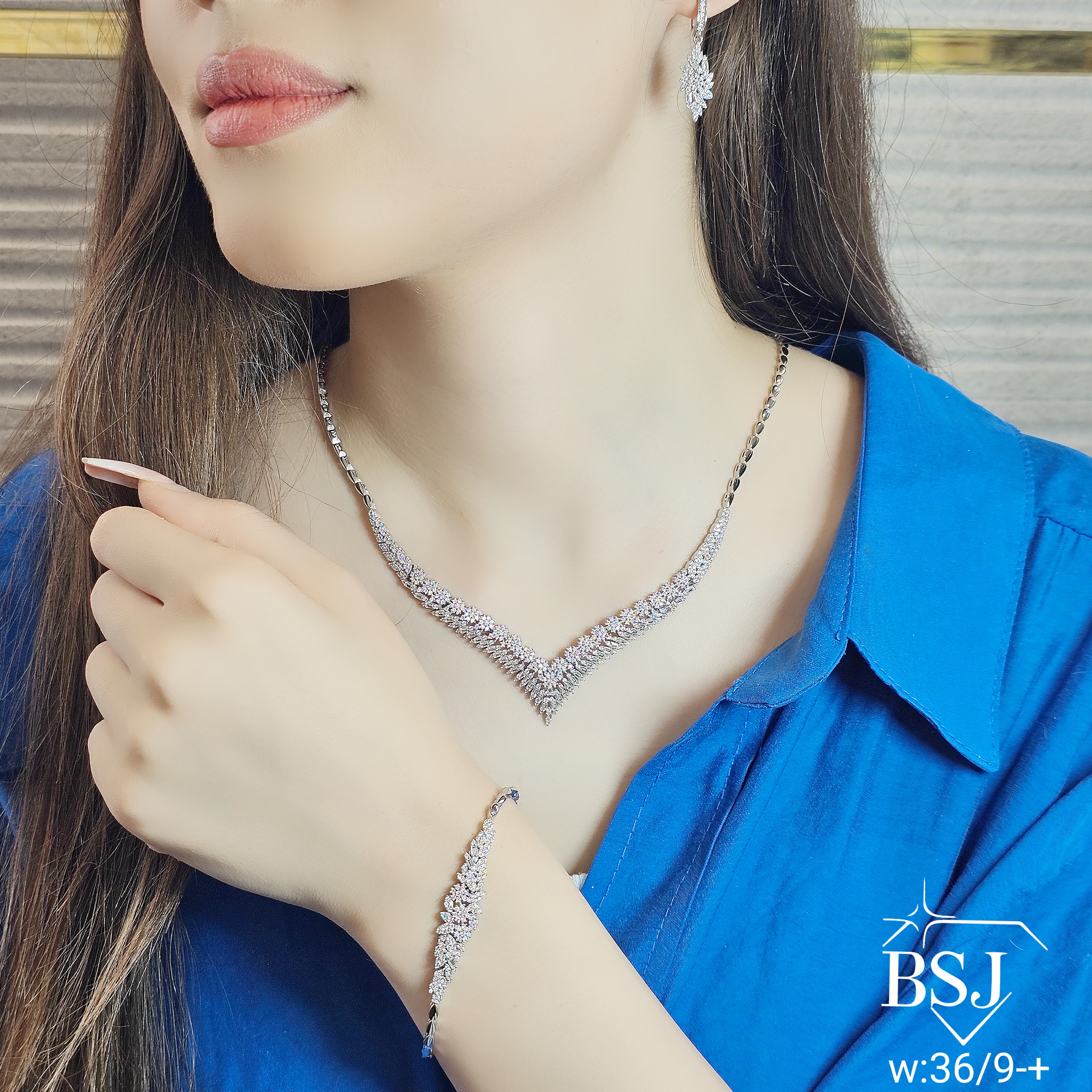 سرویس نقره جواهری زنانه BSJ_S285 از سرویس های لوکس ساخته شده از نقره با عیار 925 می باشد.سنگ های به کار رفته در آن برلیان و باگت از جنس اتمی زیرکونیا می باشند که به صورت میکروستینگ مخراج کاری شده اند و در برابر ضربه مقاوم اند.آبکاری دو مرحله ای رودیوم (طلا سفید)، سبب کیفیت بی نظیر دوام رنگ آن شده است و به دلیل عدم استفاده از نیکل در ساختار آن، بدون حساسیت بوده و با پوست حساس سازگار است.به دلیل کیفیت فوق العاده و درخشش عالی سنگ ها، تفاوتی با نمونه طلا ندارد.وزن سرویس 35.90 گرم می باشد.