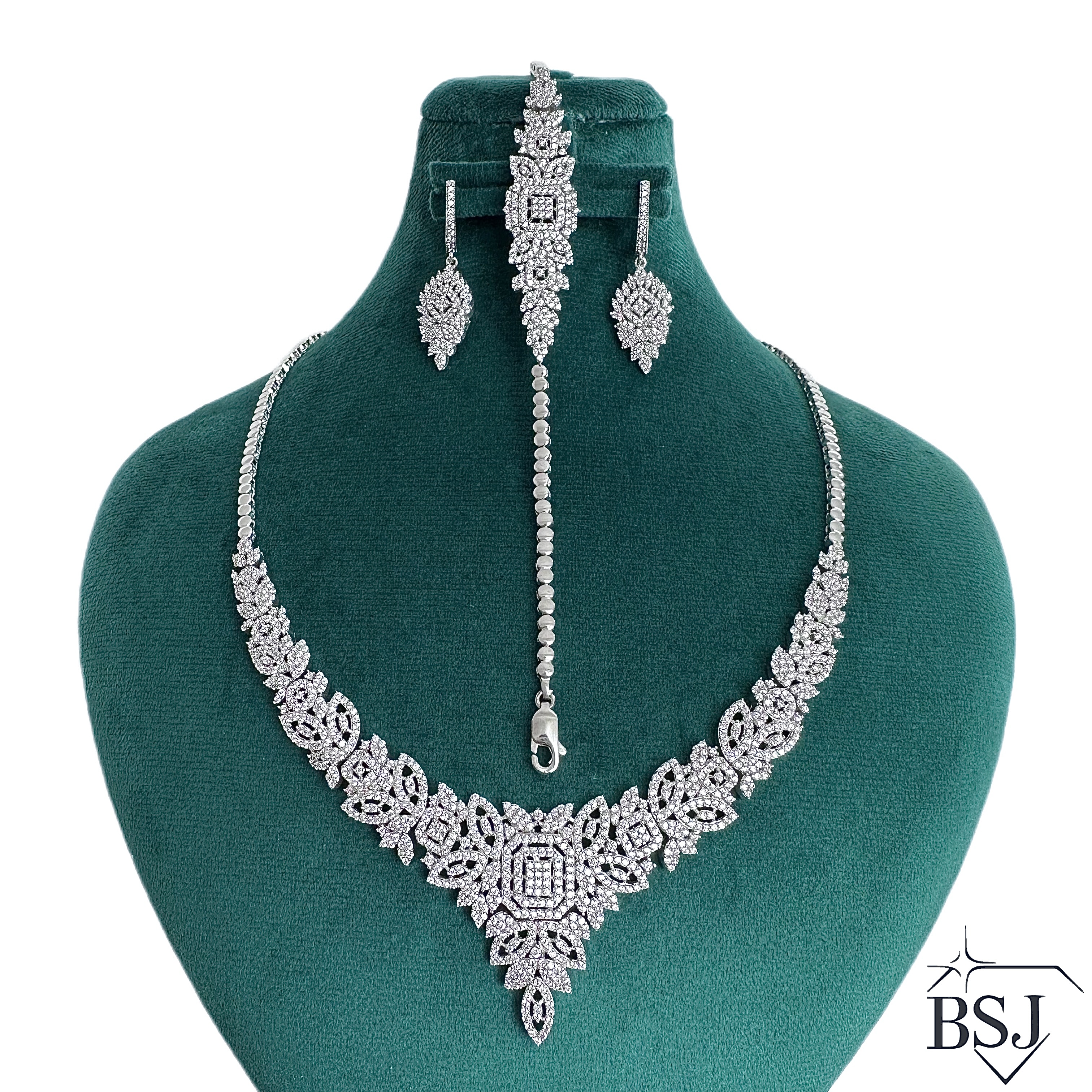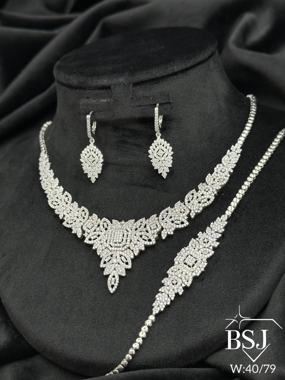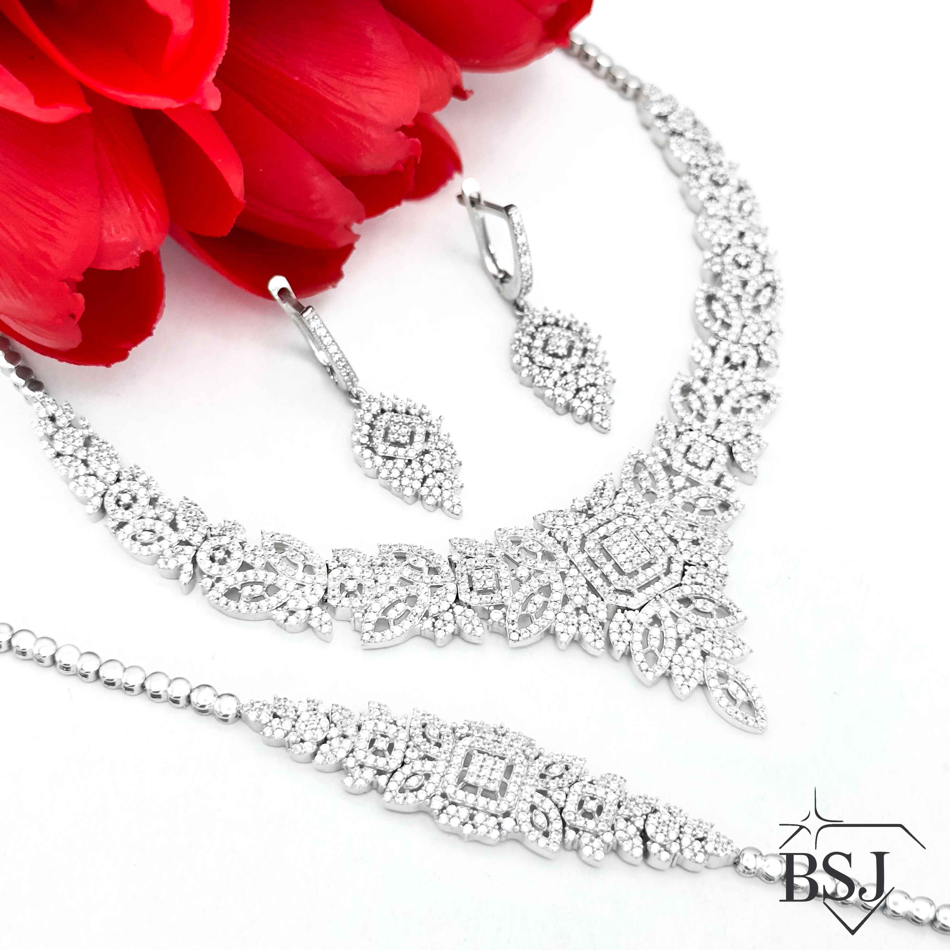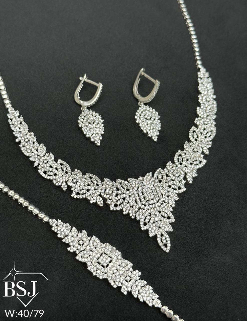 سرویس نقره جواهری زنانه BSJ_S155 یکی از سرویس های مجلسی ساخته شده از نقره با عیار 925 می باشد.سنگ های به کار رفته در آن برلیان از جنس اتمی زیرکونیا می باشند که به صورت میکروستینگ مخراج کاری شده اند و در برابر ضربه مقاوم اند.آبکاری دو مرحله ای رودیوم (طلا سفید)، سبب کیفیت بی نظیر دوام رنگ آن شده است و به دلیل عدم استفاده از نیکل در ساختار آن، بدون حساسیت بوده و با پوست حساس سازگار است.به دلیل کیفیت فوق العاده و درخشش عالی آن، تفاوتی با نمونه طلا ندارد.وزن سرویس 40.79 گرم می باشد.