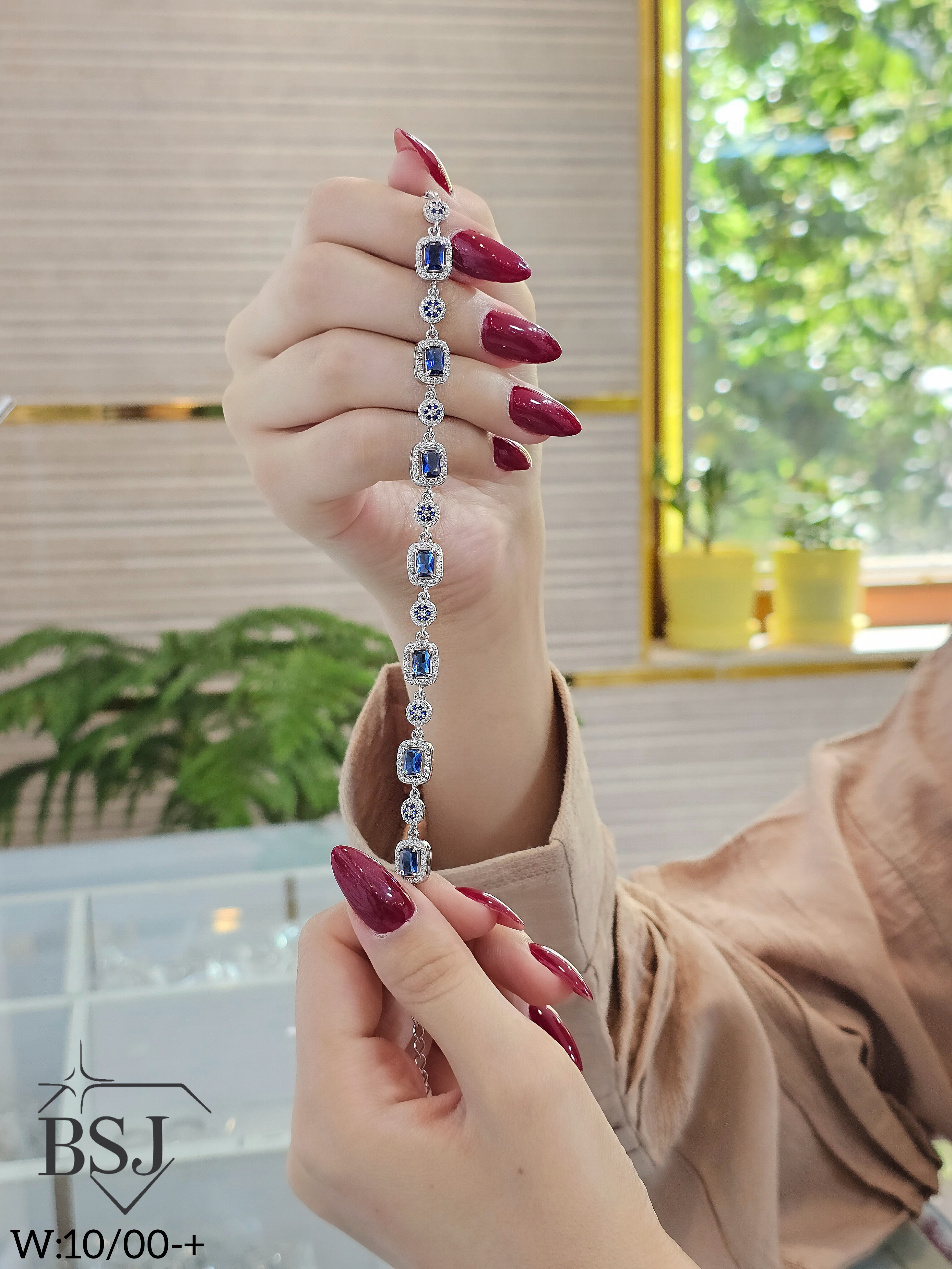 دستبند نقره جواهری زنانه BSJ_D605 یکی از دستبندهای پرفروش و زیبای ساخته شده از نقره با عیار 925 می باشد.سنگ های به کار رفته در آن برلیان از جنس اتمی زیرکونیا و نگین های رنگی سنتتیک (آزمایشکاهی )می باشند که به صورت میکروستینگ مخراج کاری شده اند و در برابر ضربه مقاوم اند.آبکاری دو مرحله ای رودیوم (طلا سفید)، سبب کیفیت بی نظیر دوام رنگ آن شده است و به دلیل عدم استفاده از نیکل در ساختار آن، بدون حساسیت بوده و با پوست حساس سازگار است.وزن دستبند +- 10.00 گرم می باشد.