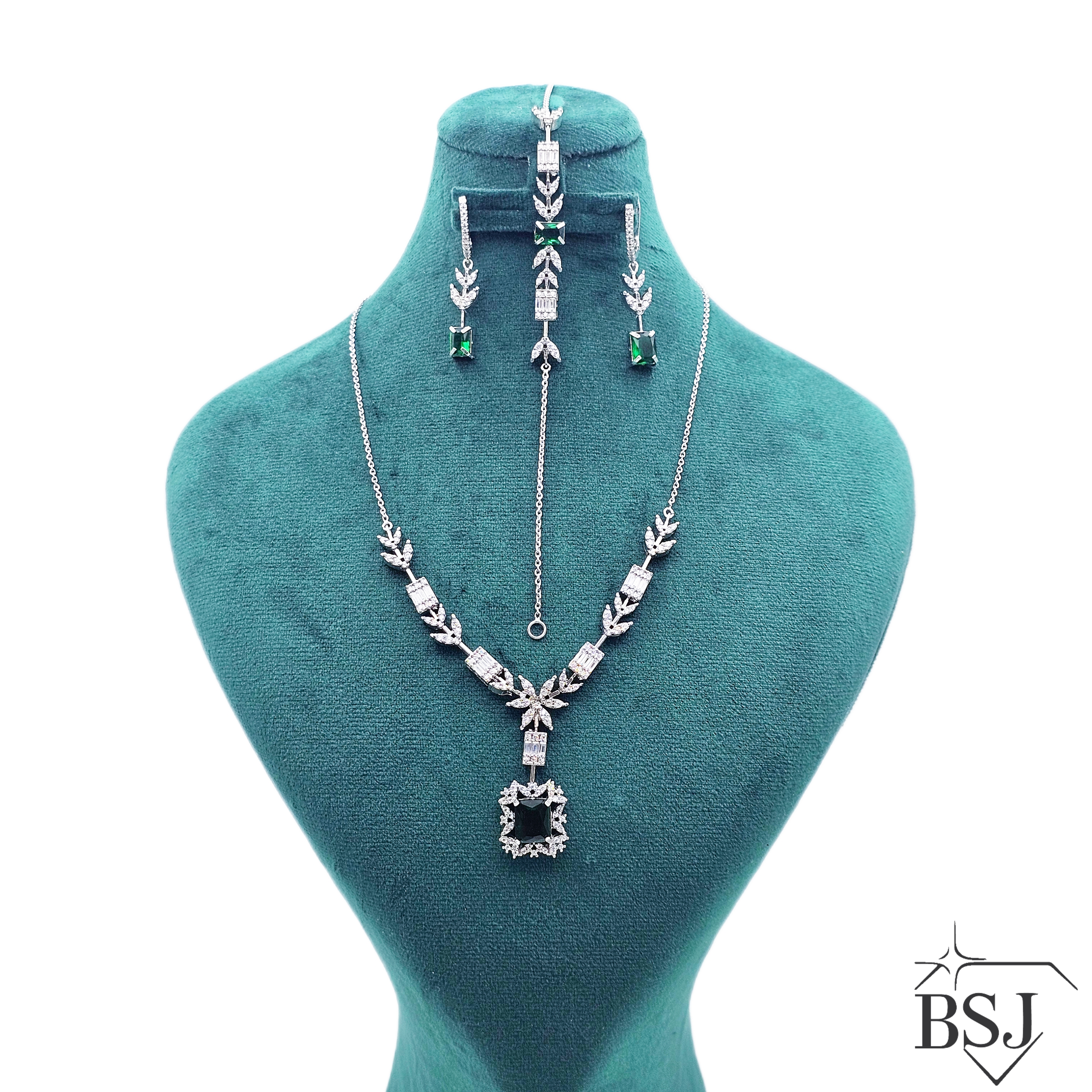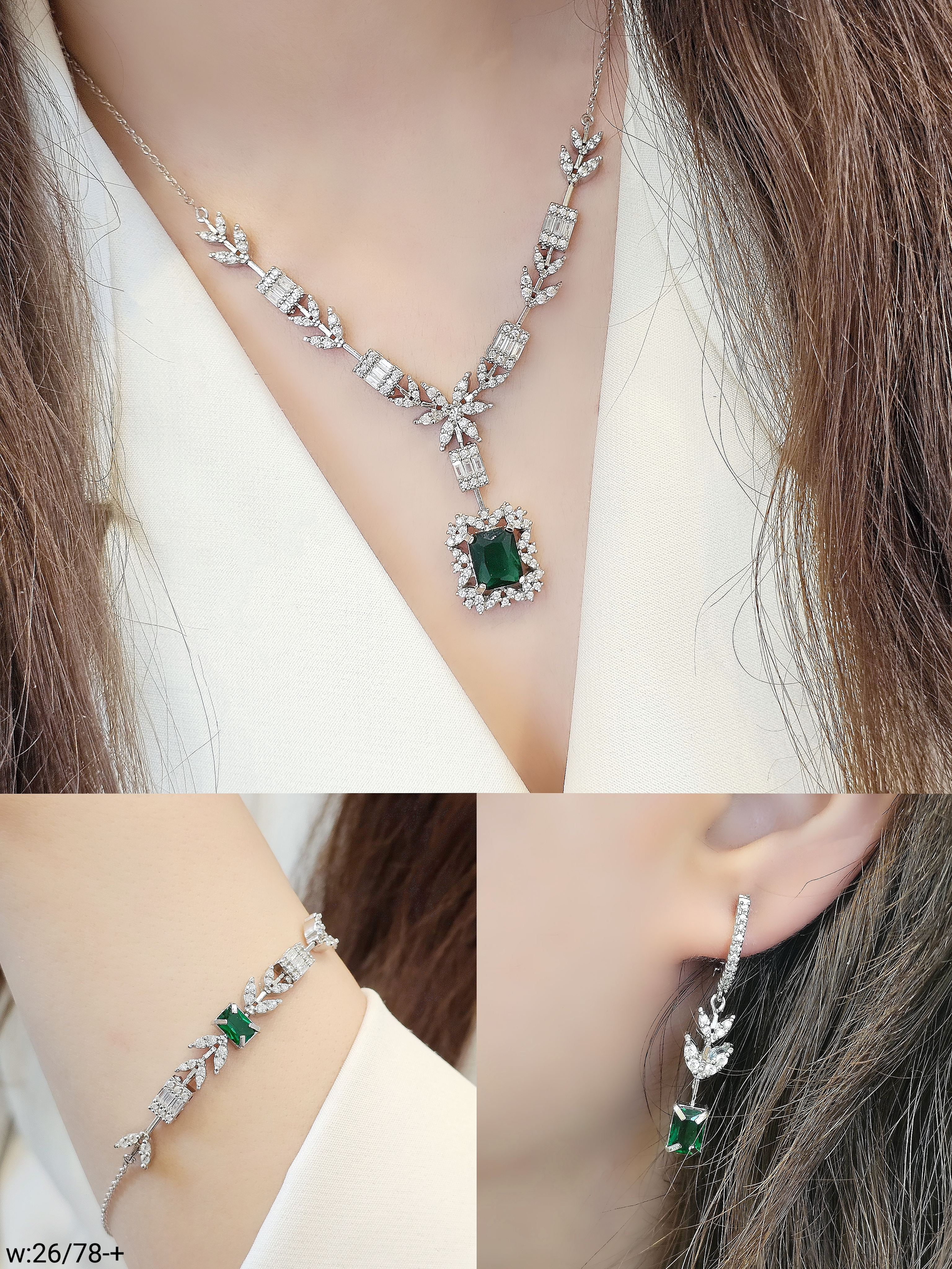 سرویس نقره جواهری زنانه BSJ_S642 طرح امرالدکات از سرویس های شیک و لوکس ساخته شده از نقره با عیار 925 می باشد.سنگ های به کار رفته در آن برلیان و مارکیز از جنس اتمی زیرکونیا و سنگ های رنگی سنتتیک (آزمایشگاهی) می باشند که به صورت میکروستینگ مخراج کاری شده اند و در برابر ضربه مقاوم اند.آبکاری دو مرحله ای رودیوم (طلا سفید)، سبب کیفیت بی نظیر دوام رنگ آن شده است و به دلیل عدم استفاده از نیکل در ساختار آن،بدون حساسیت بوده و با پوست حساس سازگار است.به دلیل کیفیت فوق العاده و درخشش عالی سنگ ها، تفاوتی با نمونه طلا ندارد.وزن سرویس 26.78+- گرم می باشد.