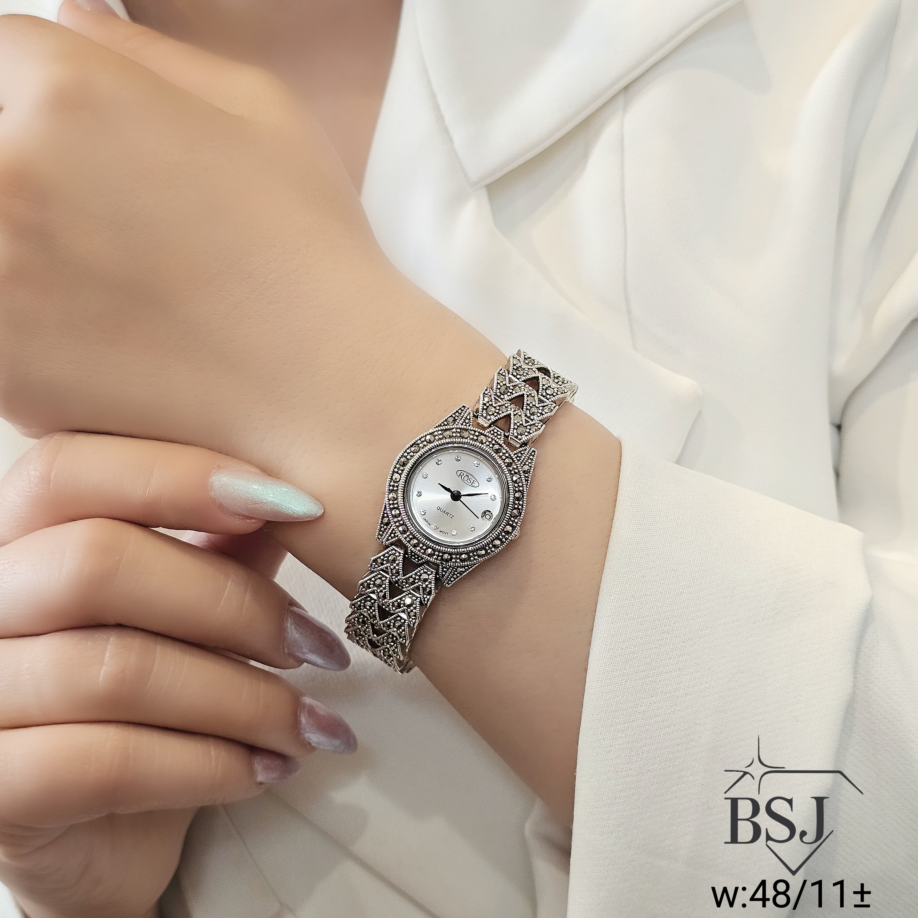 ساعت نقره مارگازیت زنانه BSJ_W533 از ساعت های شیک و جذاب ساخته شده از نقره با عیار 925 می باشد.جنس بدنه از نقره به عیار 925 بوده و تنها قسمتی از محصول که نقره نیست موتور آن می باشد.آبکاری دو مرحله ای رودیوم(طلا سفید)، سبب کیفیت بی نظیر دوام رنگ آن شده است و به دلیل عدم استفاده از نیکل در ساختار آن،بدون حساسیت بوده و با پوست حساس سازگار است.وزن تقریبی ساعت +- 48.11 گرم می باشد.
