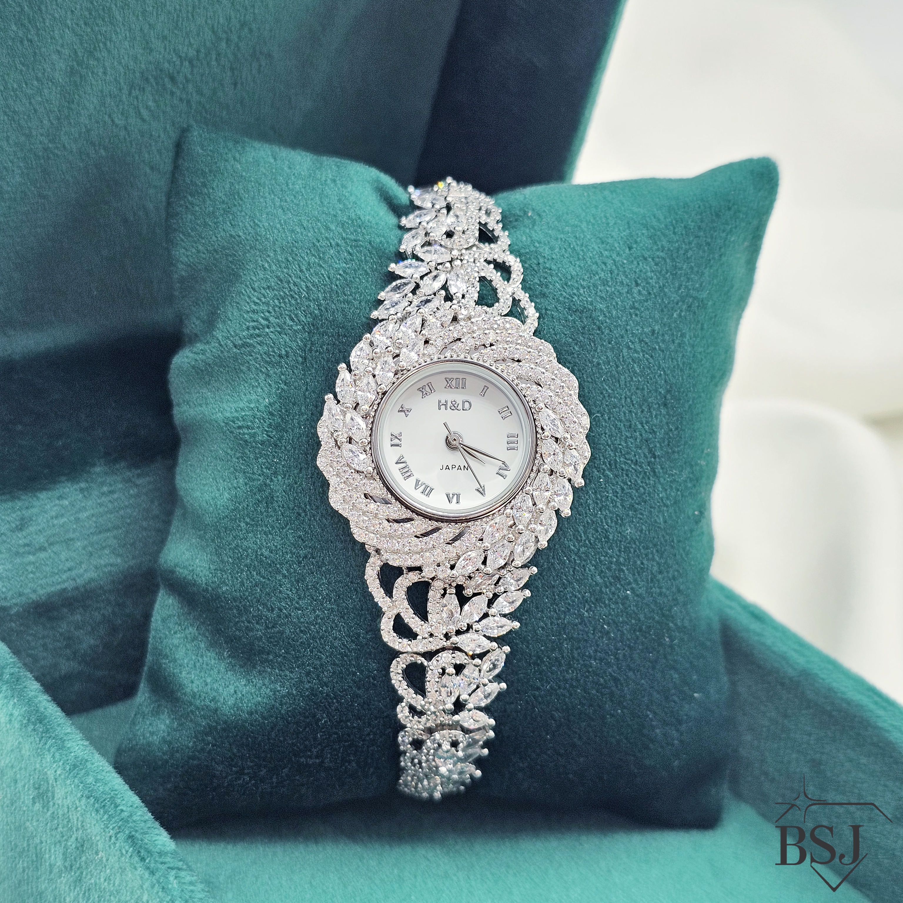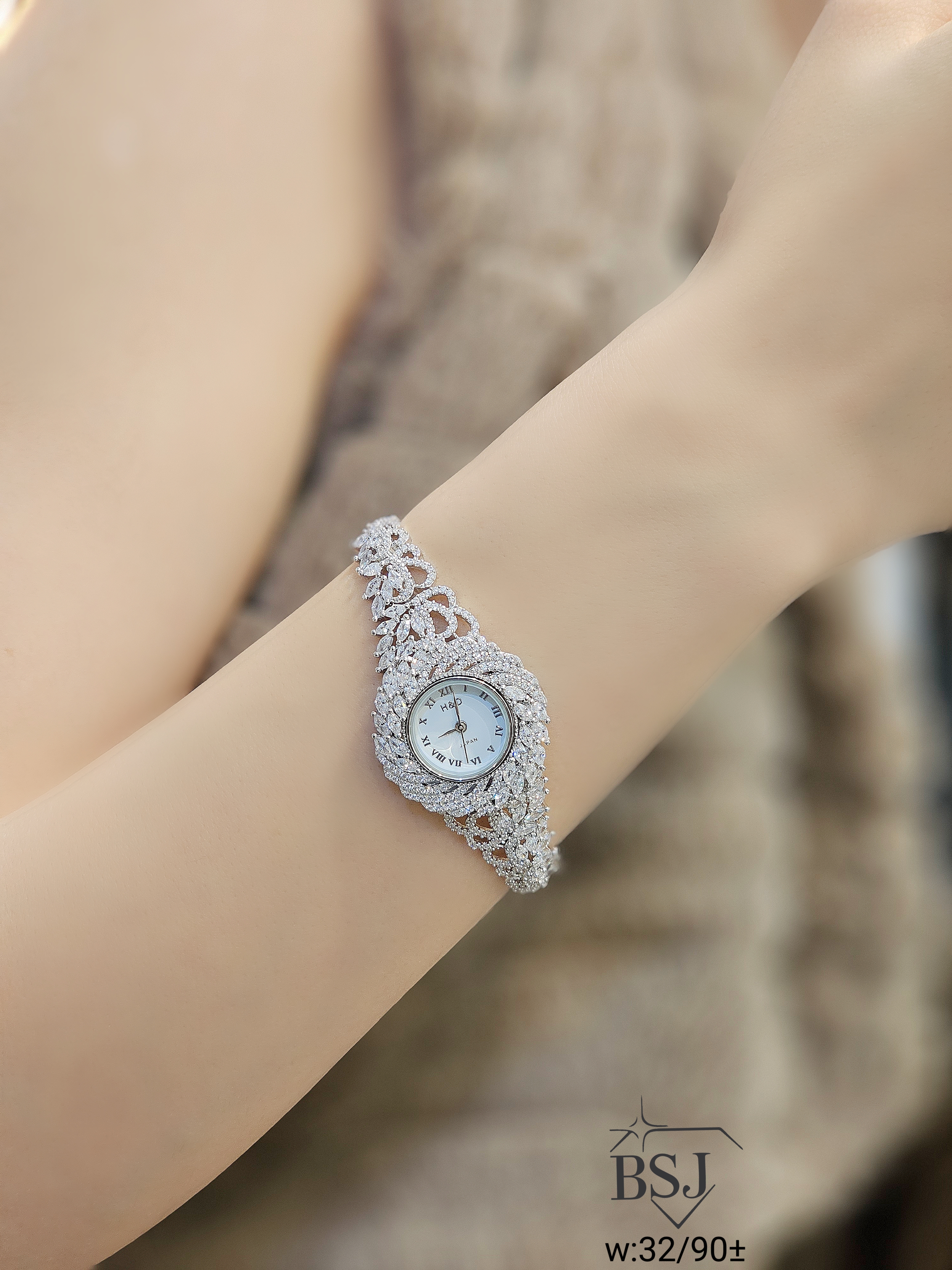 ساعت نقره جواهری زنانه BSJ_W540 از ساعت های شیک و جذاب ساخته شده از نقره با عیار 925 می باشد.سنگ های به کار رفته در آن امرالد و برلیان از جنس اتمی زیرکونیا می باشند که به صورت میکروستینگ مخراج کاری شده اند و در برابر ضربه مقاوم اند.جنس بدنه از نقره به عیار 925 بوده و تنها قسمتی از محصول که نقره نیست موتور آن می باشد.آبکاری دو مرحله ای رودیوم(طلا سفید)، سبب کیفیت بی نظیر دوام رنگ آن شده است و به دلیل عدم استفاده از نیکل در ساختار آن،بدون حساسیت بوده و با پوست حساس سازگار است.وزن تقریبی ساعت +- 32.90 گرم می باشد.