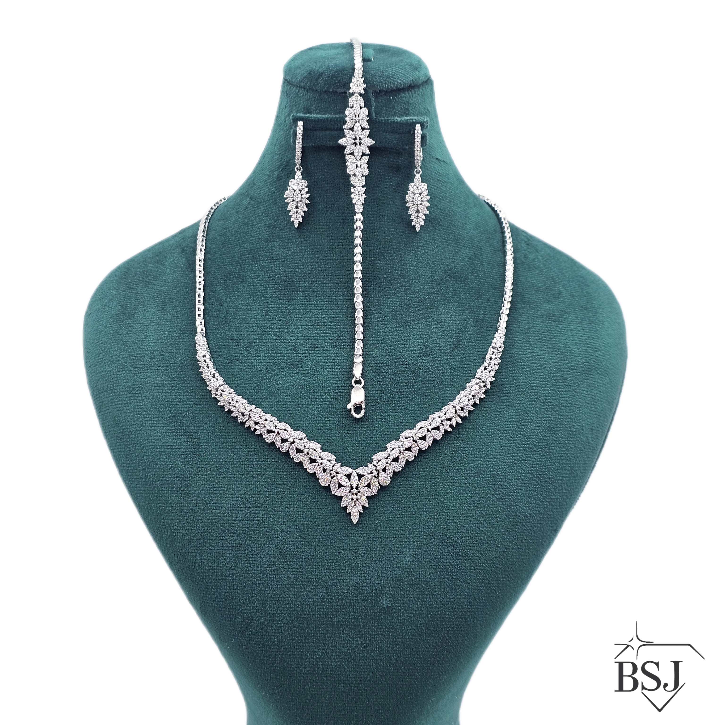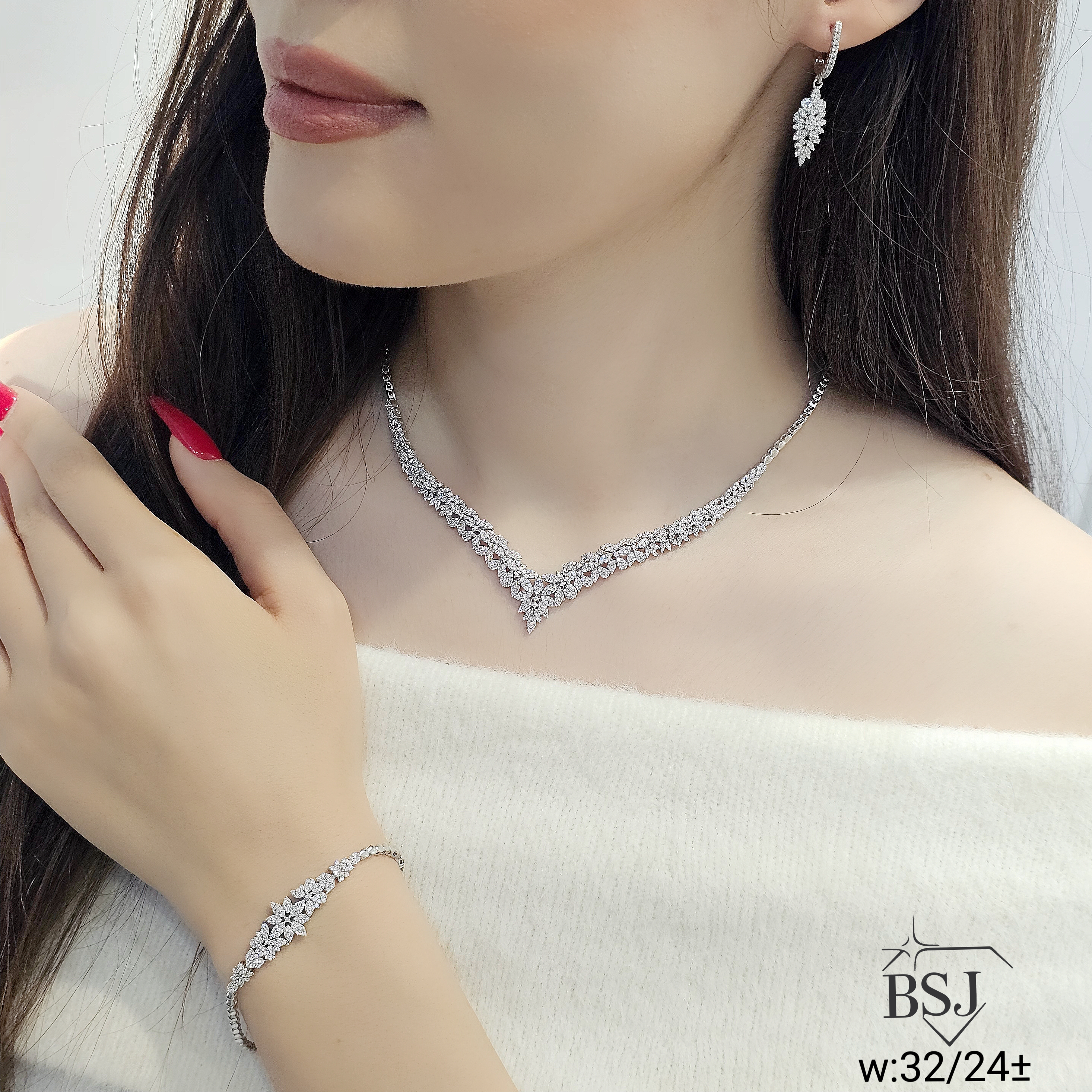 سرویس نقره جواهری زنانه BSJ_S650 از سرویس های اعیانی ساخته شده از نقره با عیار 925 می باشد.سنگ های به کار رفته در آن برلیان از جنس اتمی زیرکونیا می باشند که به صورت میکروستینگ مخراج کاری شده اند و در برابر ضربه مقاوم اند.آبکاری دو مرحله ای رودیوم (طلا سفید)، سبب کیفیت بی نظیر دوام رنگ آن شده است و به دلیل عدم استفاده از نیکل در ساختار آن، بدون حساسیت بوده و با پوست حساس سازگار است.به دلیل کیفیت فوق العاده و درخشش عالی سنگ ها، تفاوتی با نمونه طلا ندارد.وزن سرویس +- 32.24 گرم می باشد.