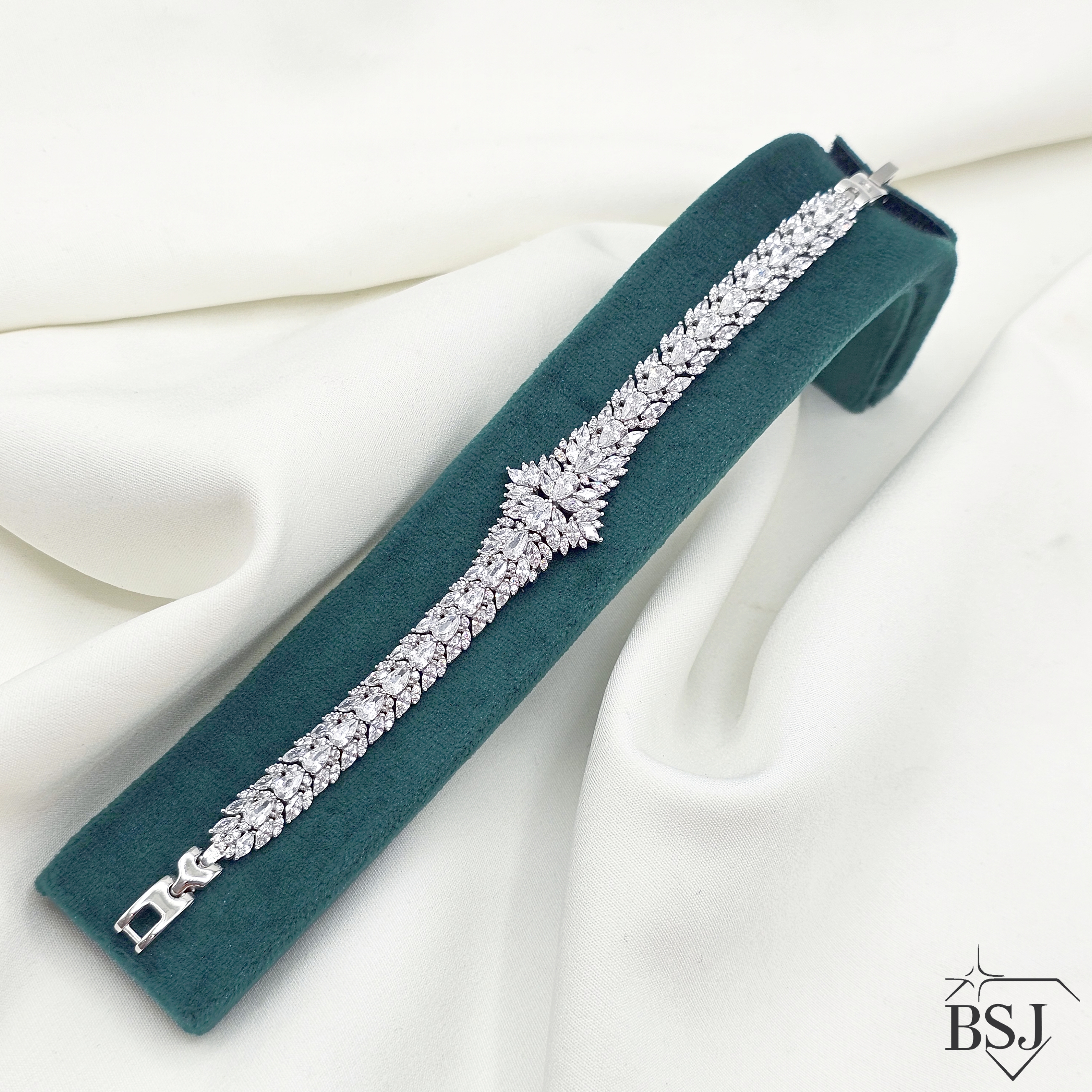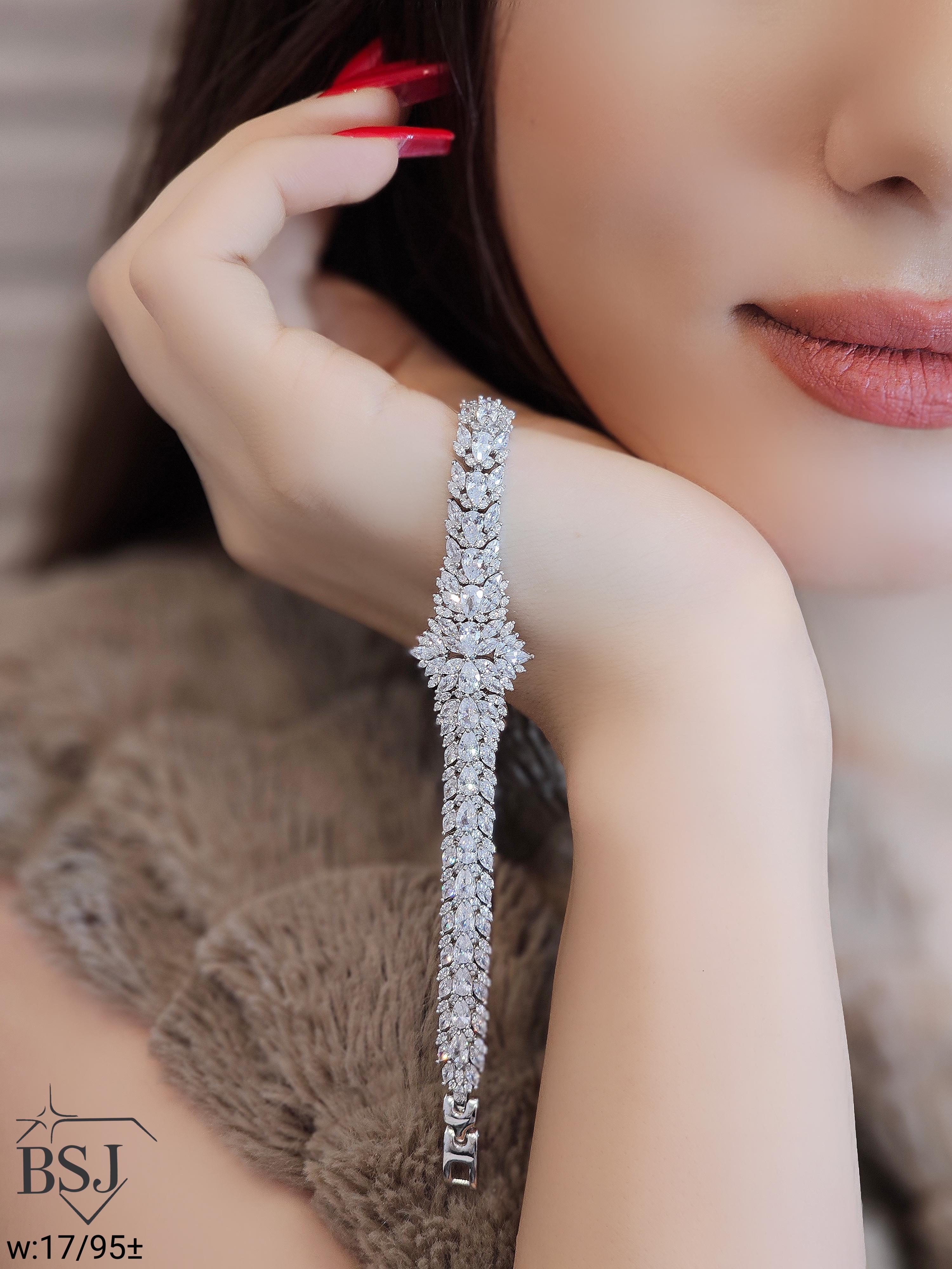 دستبند جواهری نقره BSJ_D616 یکی از دستبندهای مجلسی و ظریف ساخته شده از نقره با عیار 925 می باشد.سنگ های به کار رفته در آن برلیان از جنس اتمی زیرکونیا می باشند که به صورت میکروستینگ مخراج کاری شده اند و در برابر ضربه مقاوم اند.آبکاری دو مرحله ای رودیوم (طلا سفید)، سبب کیفیت بی نظیر دوام رنگ آن شده است و به دلیل عدم استفاده از نیکل در ساختار آن، بدون حساسیت بوده و با پوست حساس سازگار است.وزن دستبند 17.95+- گرم می باشد.