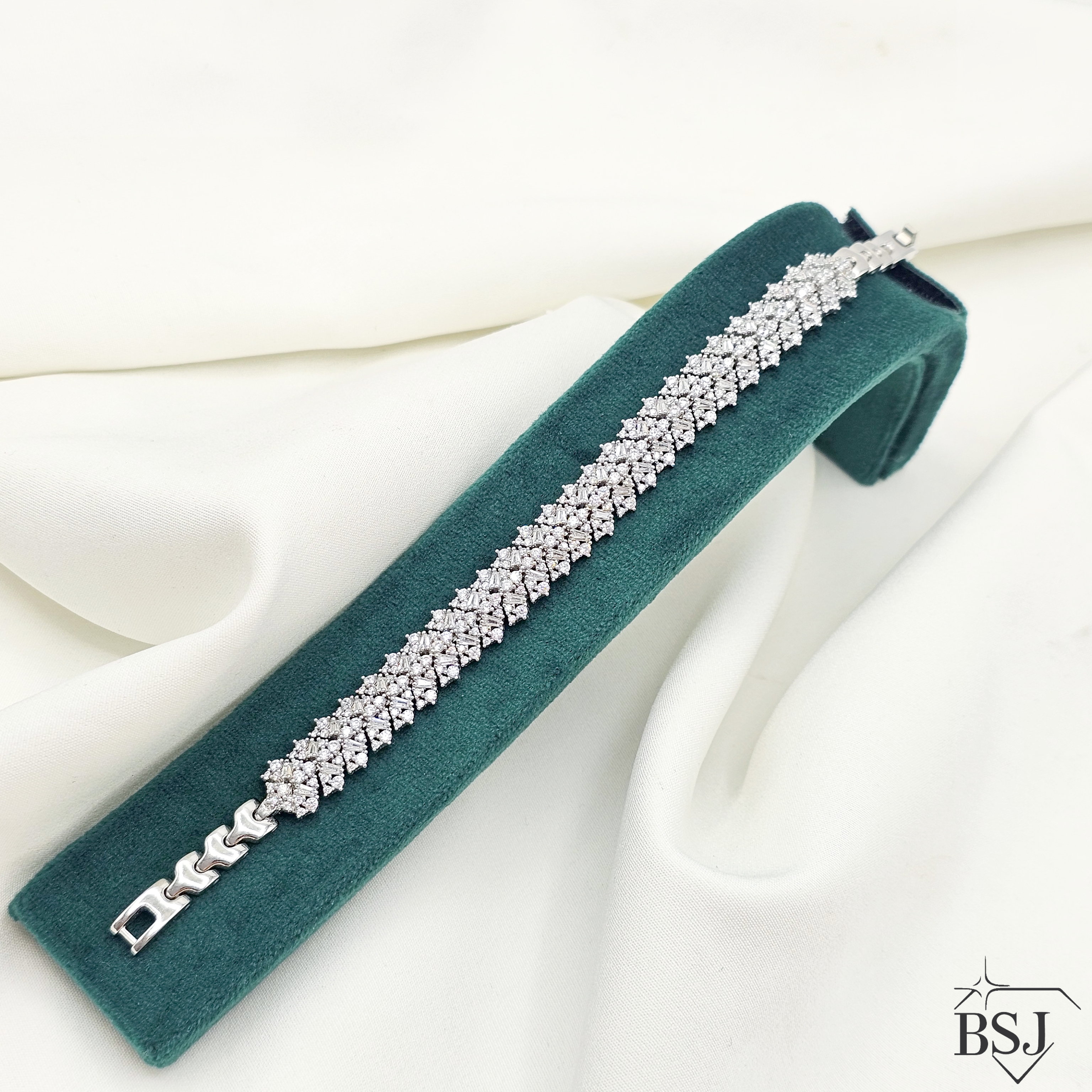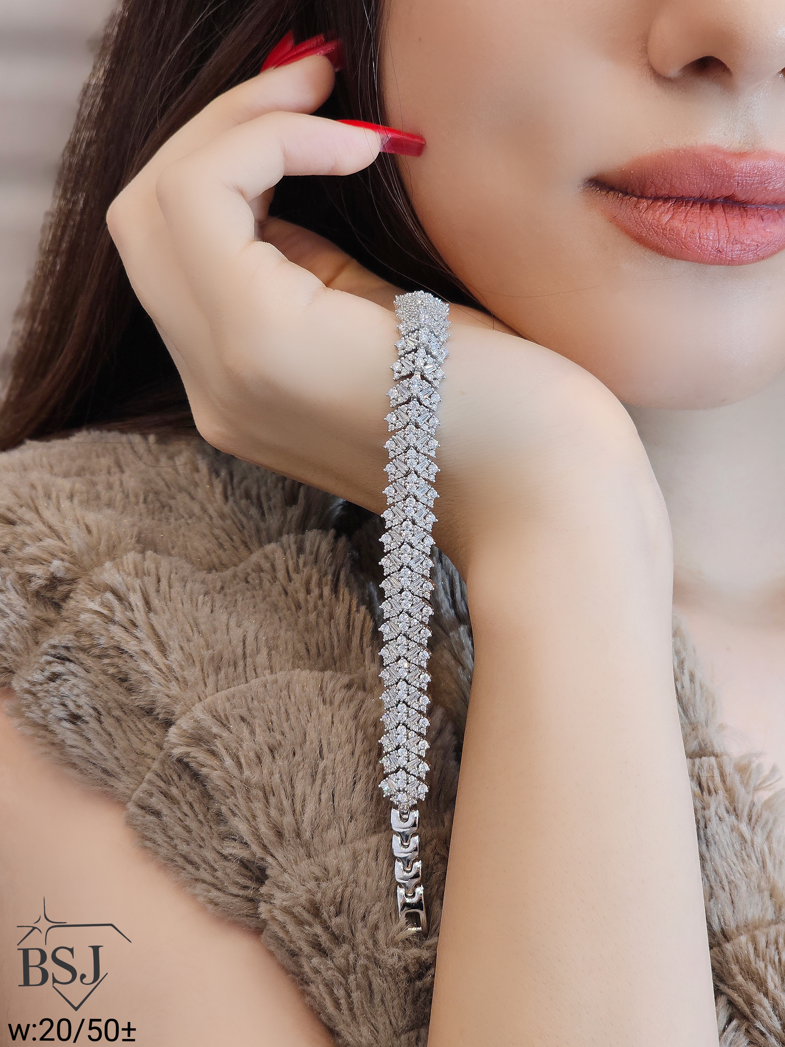 دستبند جواهری نقره BSJ_D618 یکی از دستبندهای مجلسی و ظریف ساخته شده از نقره با عیار 925 می باشد.سنگ های به کار رفته در آن برلیان از جنس اتمی زیرکونیا می باشند که به صورت میکروستینگ مخراج کاری شده اند و در برابر ضربه مقاوم اند.آبکاری دو مرحله ای رودیوم (طلا سفید)، سبب کیفیت بی نظیر دوام رنگ آن شده است و به دلیل عدم استفاده از نیکل در ساختار آن، بدون حساسیت بوده و با پوست حساس سازگار است.وزن دستبند 20.50+- گرم می باشد.