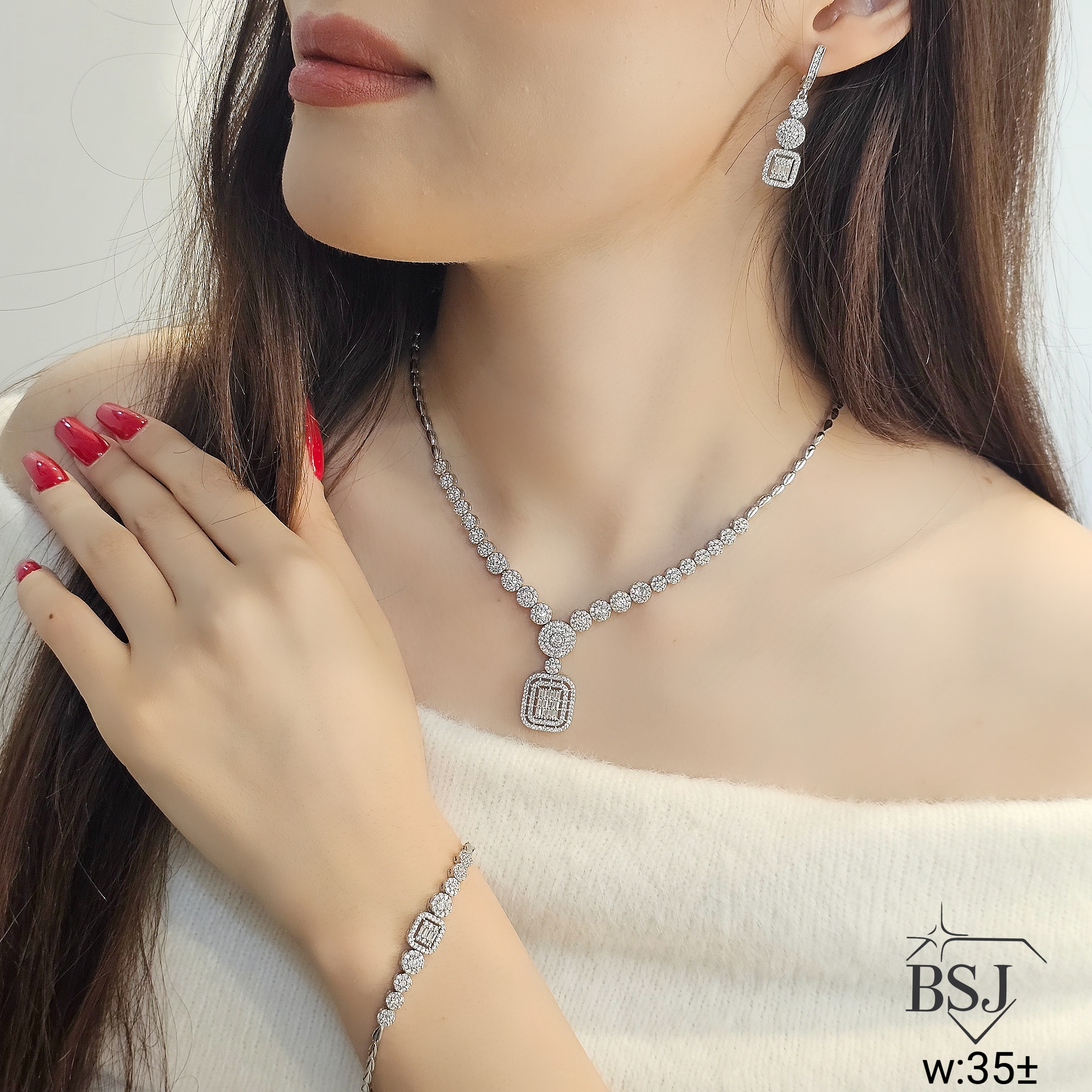 سرویس نقره جواهری زنانه BSJ_S653 از سرویس های اعیانی ساخته شده از نقره با عیار 925 می باشد.سنگ های به کار رفته در آن برلیان از جنس اتمی زیرکونیا می باشند که به صورت میکروستینگ مخراج کاری شده اند و در برابر ضربه مقاوم اند.آبکاری دو مرحله ای رودیوم (طلا سفید)، سبب کیفیت بی نظیر دوام رنگ آن شده است و به دلیل عدم استفاده از نیکل در ساختار آن، بدون حساسیت بوده و با پوست حساس سازگار است.به دلیل کیفیت فوق العاده و درخشش عالی سنگ ها، تفاوتی با نمونه طلا ندارد.وزن سرویس +- 35 گرم می باشد.