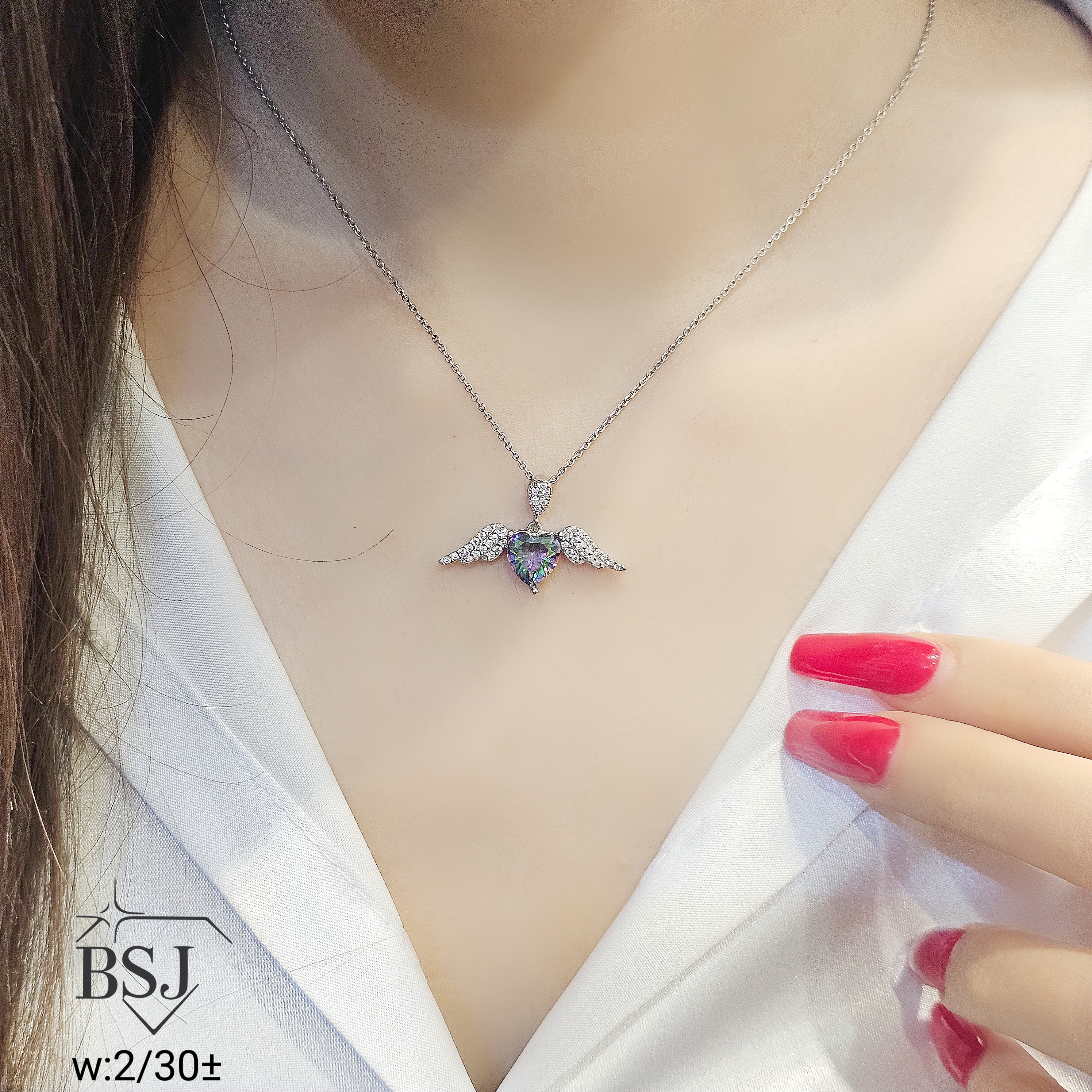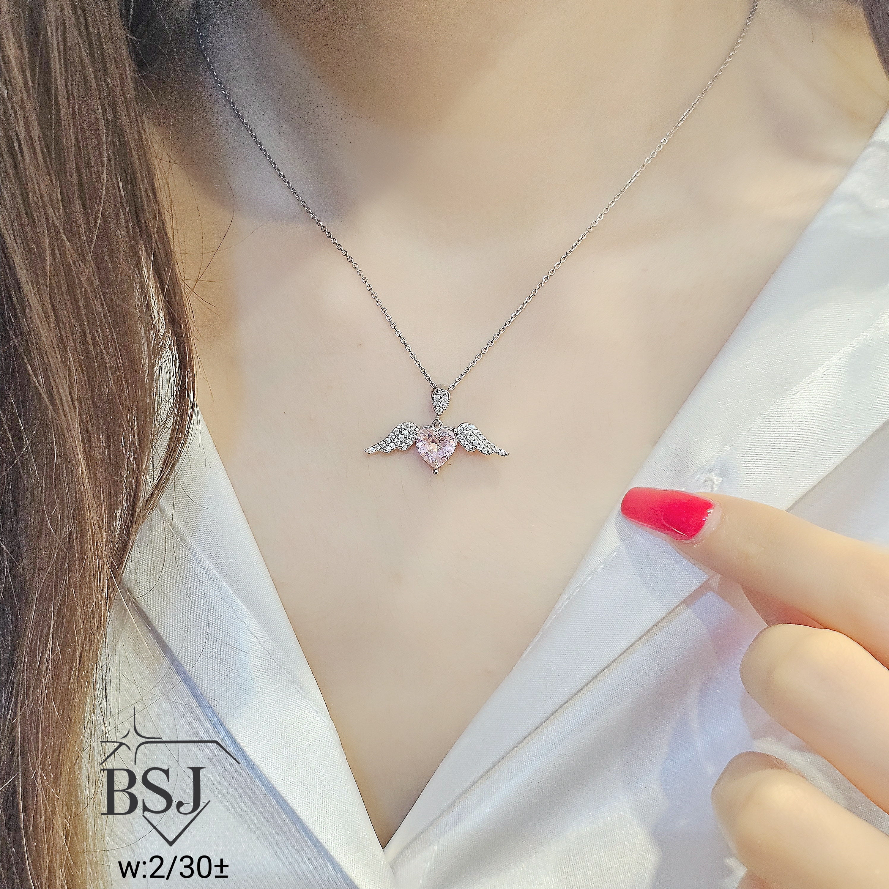 گردنبند قلب و بال فرشته نقره زنانه BSJ_G573 از گردنبندهای ظریف ساخته شده از نقره با عیار 925 می باشد.سنگ های به کار رفته در آن برلیان از جنس اتمی زیرکونیا می باشند که به صورت میکروستینگ مخراج کاری شده اند و در برابر ضربه مقاوم اند.آبکاری دو مرحله ای رودیوم (طلا سفید)، سبب کیفیت بی نظیر دوام رنگ آن شده است و به دلیل عدم استفاده از نیکل در ساختار آن، بدون حساسیت بوده و با پوست حساس سازگار است.وزن این محصول +- 2.3 گرم می باشد.
