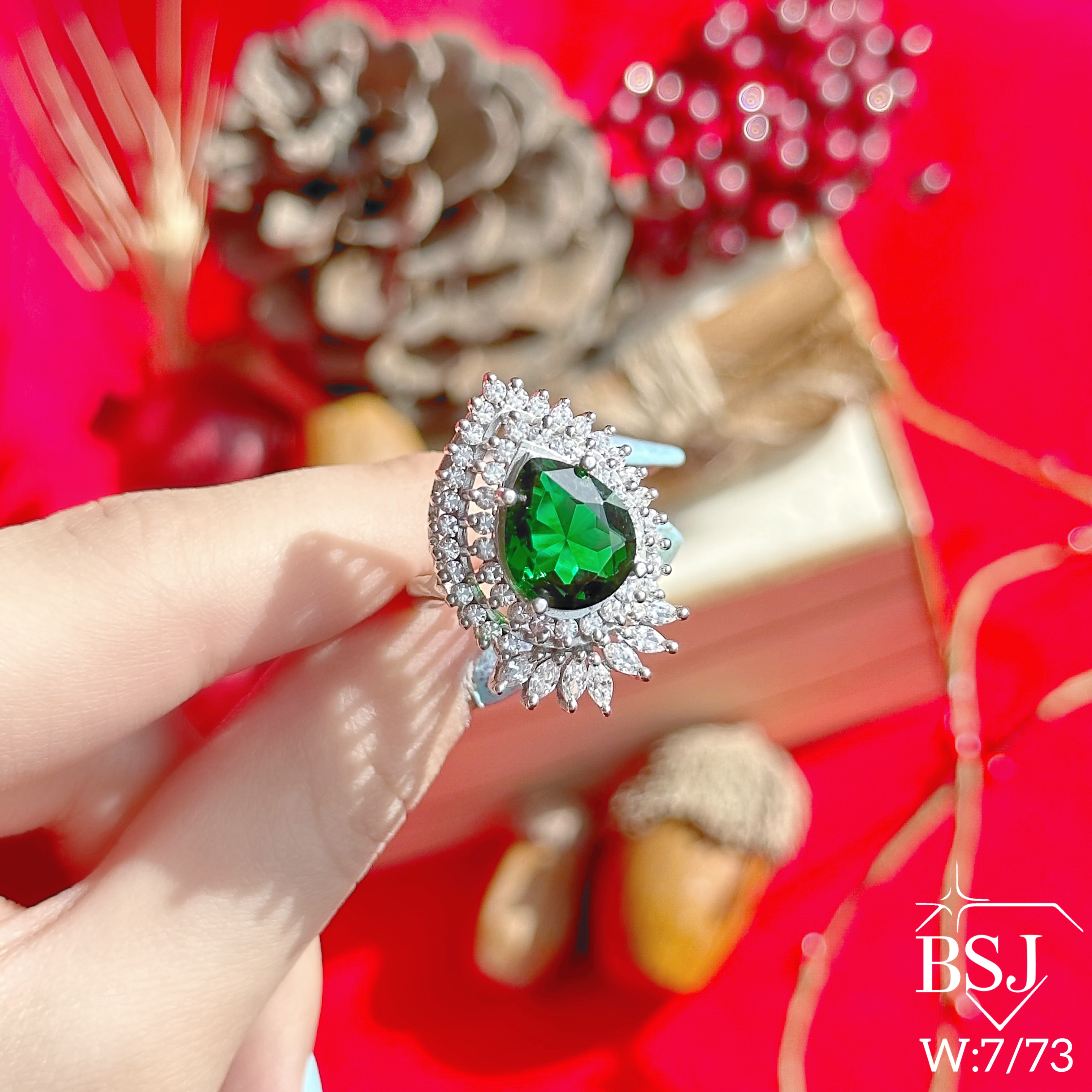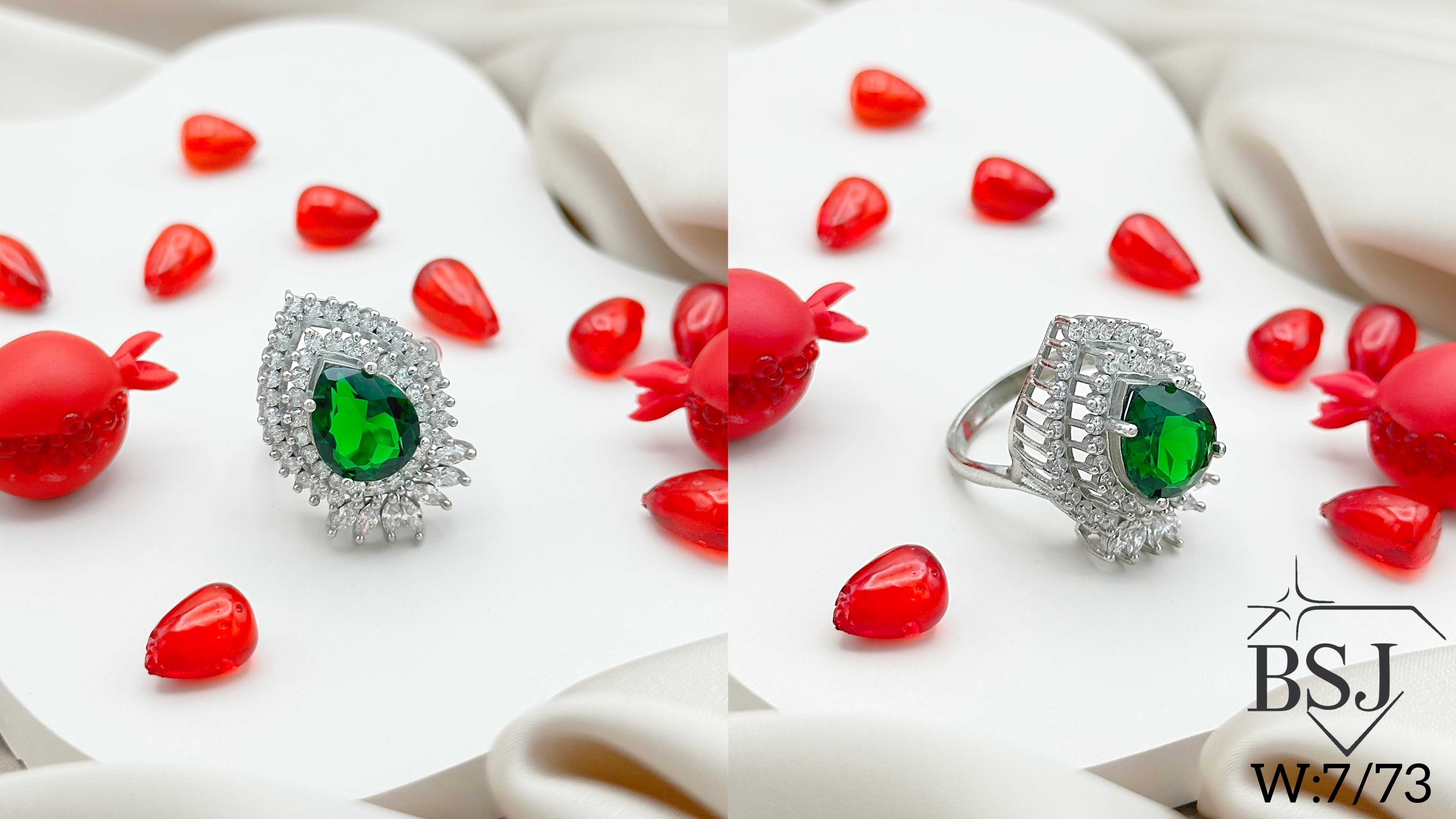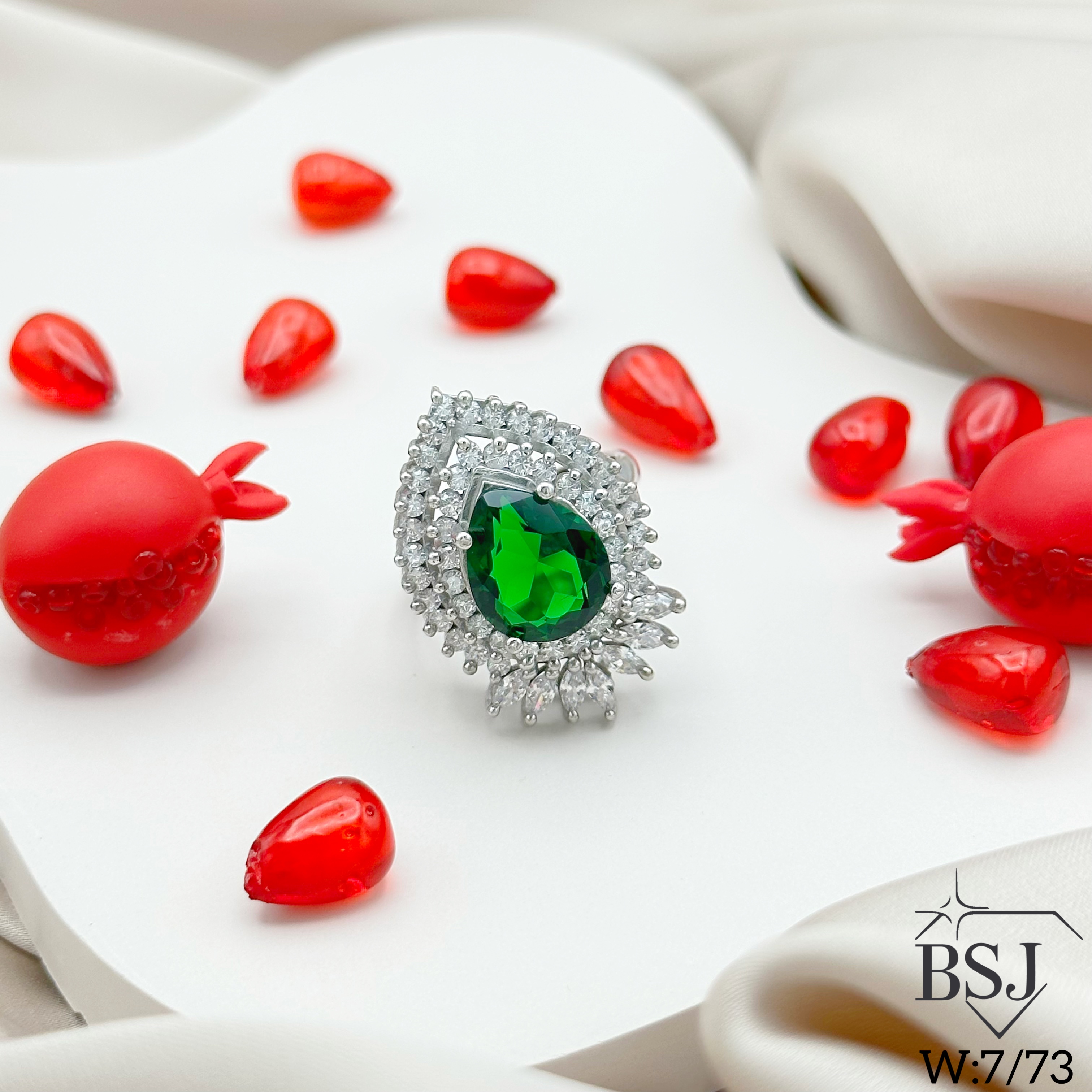انگشتر نقره زنانه BSJ_R638 یکی از انگشترهای چشم نواز ساخته شده از نقره با عیار 925 می باشد.سنگ های به کار رفته در آن برلیان از جنس اتمی زیرکونیا و مارکیز و نگین های رنگی سنتتیک(آزمایشگاهی) که در دو رنگ جذاب سبز زمردی و قرمز یاقوتی تولید شده است می باشند.سنگ ها به صورت میکروستینگ مخراج کاری شده اند و در برابر ضربه مقاوم اند.آبکاری دو مرحله ای رودیوم(طلا سفید)، سبب کیفیت بی نظیر دوام رنگ آن شده است و به دلیل عدم استفاده از نیکل در ساختار آن، بدون حساسیت بوده و با پوست حساس سازگار است.به دلیل کیفیت فوق العاده و درخشش عالی، تفاوتی با نمونه طلا ندارد.وزن انگشتر 9.29 گرم می باشد.