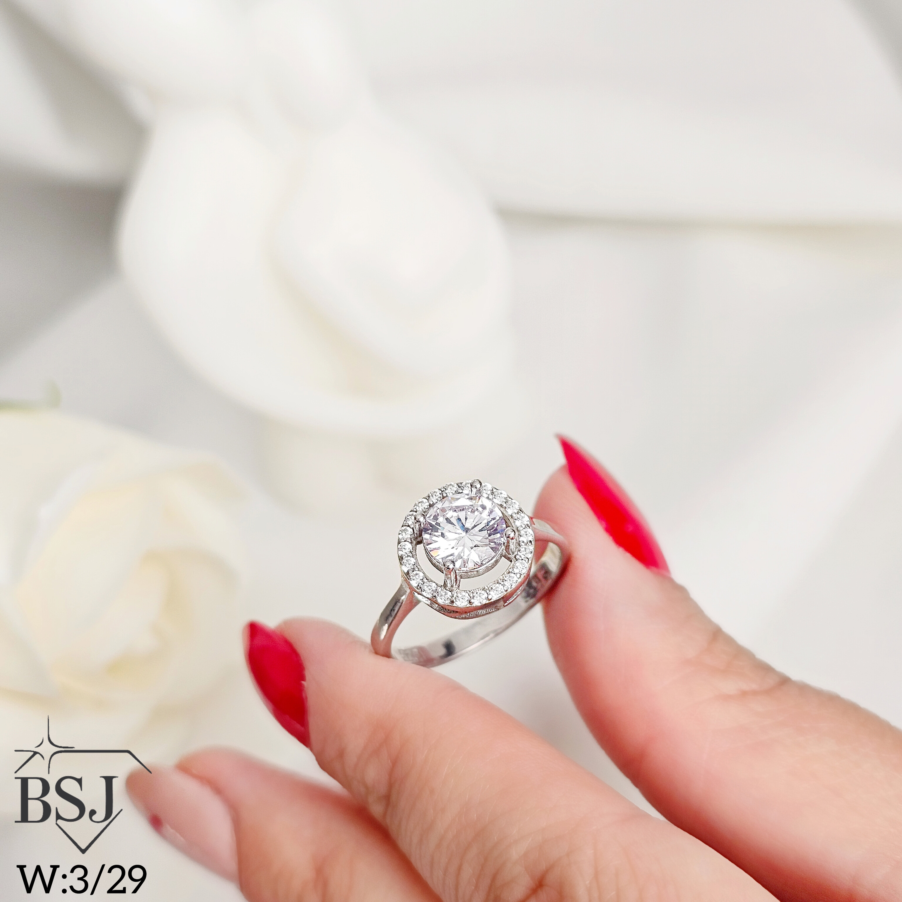 انگشتر نقره زنانه BSJ_R669 از انگشترهای خاص و مجلسی ساخته شده از نقره با عیار 925 می باشد.سنگ های برلیان از جنس اتمی زیرکونیا در ساختار آن به کار رفته است که به صورت میکروستینگ مخراج کاری شده و در برابر ضربه مقاوم است.آبکاری دو مرحله ای رودیوم(طلا سفید)، سبب کیفیت بی نظیر دوام رنگ آن شده است و به دلیل عدم استفاده از نیکل در ساختار آن، بدون حساسیت بوده و با پوست حساس سازگار است.به دلیل کیفیت فوق العاده و درخشش عالی، تفاوتی با نمونه طلا ندارد.وزن انگشتر 3.29 گرم می باشد.