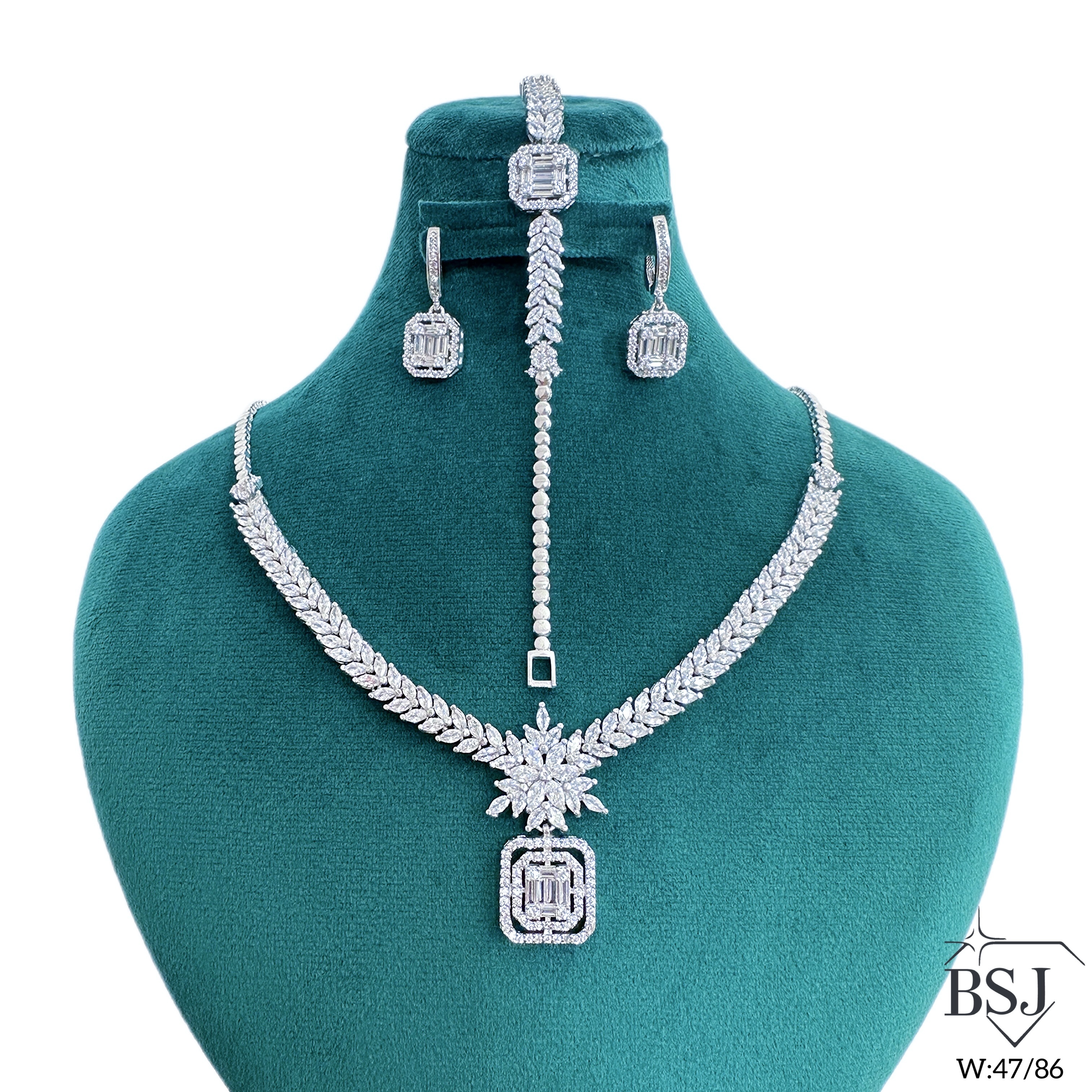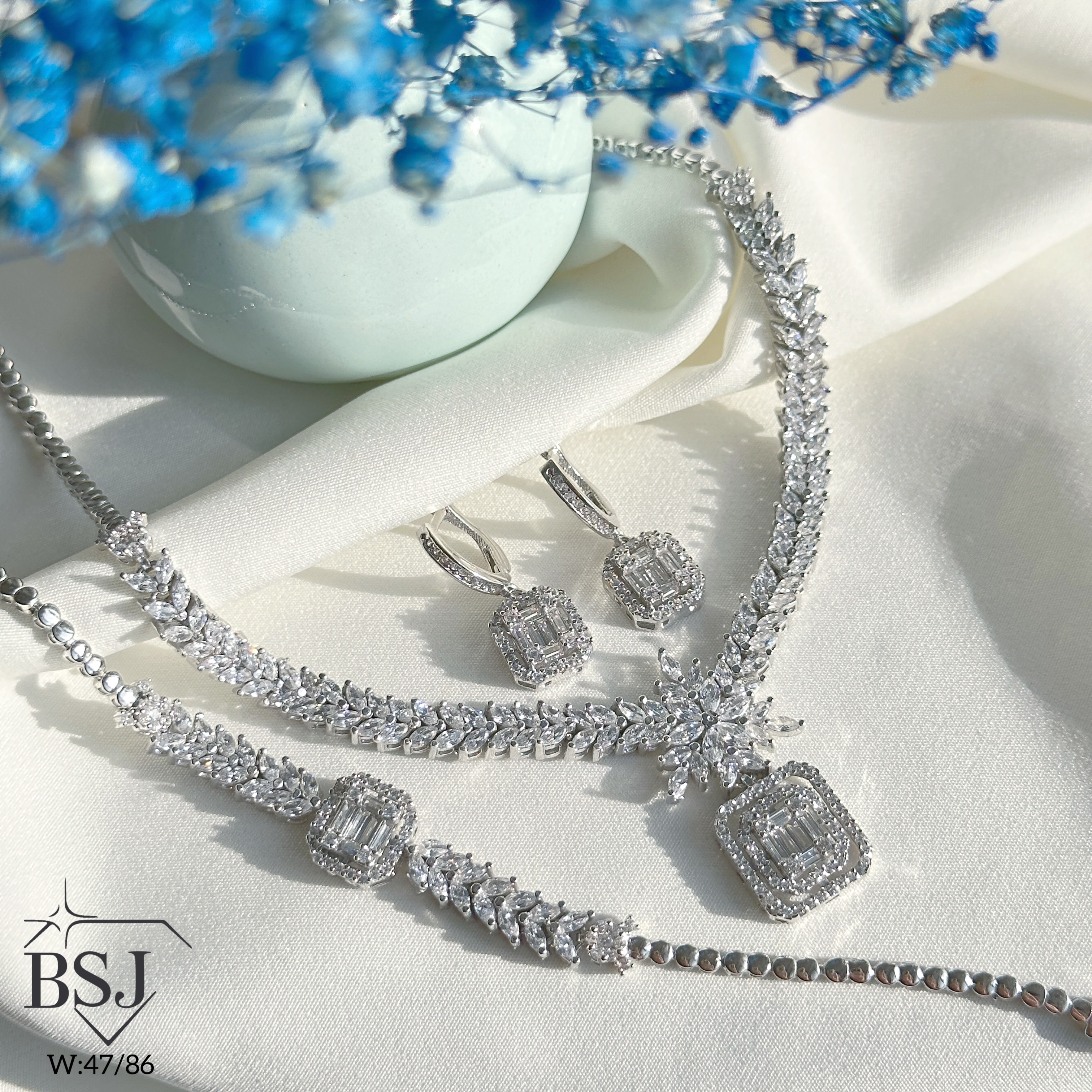 سرویس نقره جواهری زنانه BSJ_S578 از سرویس های مجلسی ساخته شده از نقره با عیار 925 می باشد.سنگ های به کار رفته در آن برلیان و از جنس اتمی زیرکونیا و نگین های امرالد می باشند که به صورت میکروستینگ مخراج کاری شده اند و در برابر ضربه مقاوم اند.آبکاری دو مرحله ای رودیوم (طلا سفید)، سبب کیفیت بی نظیر دوام رنگ آن شده است و به دلیل عدم استفاده از نیکل در ساختار آن، بدون حساسیت بوده و با پوست حساس سازگار است.به دلیل کیفیت فوق العاده و درخشش عالی سنگ ها، تفاوتی با نمونه طلا ندارد.وزن سرویس 47.86 گرم می باشد.