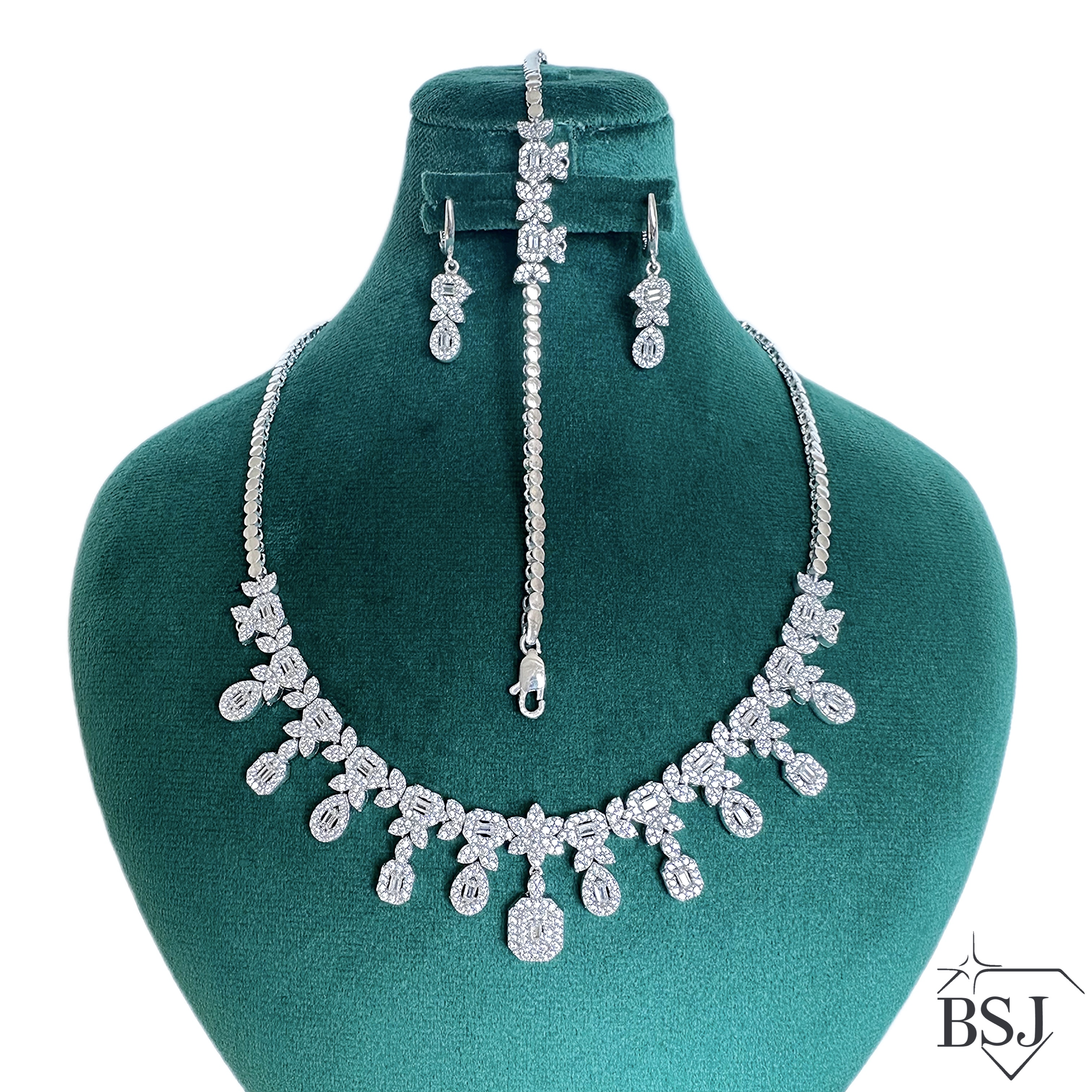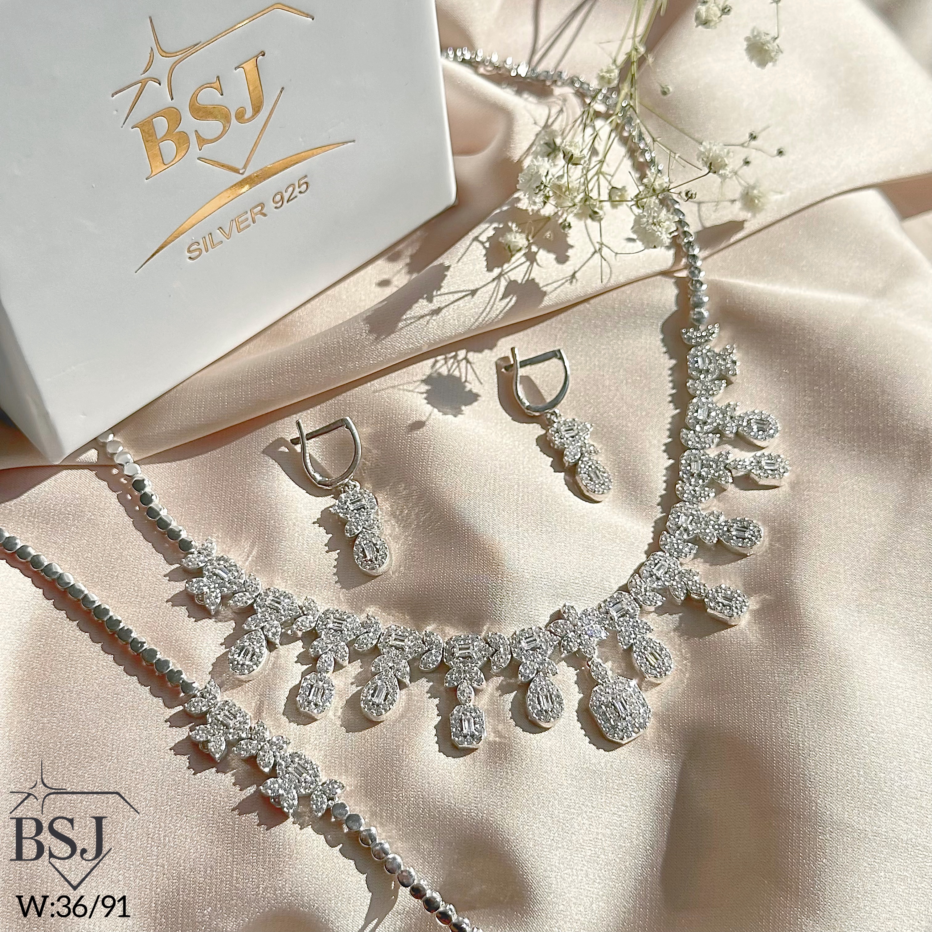 سرویس نقره جواهری زنانه BSJ_S584 از سرویس های مجلسی ساخته شده از نقره با عیار 925 می باشد.سنگ های به کار رفته در آن برلیان و از جنس اتمی زیرکونیا و امرالد می باشند که به صورت میکروستینگ مخراج کاری شده اند و در برابر ضربه مقاوم اند.آبکاری دو مرحله ای رودیوم (طلا سفید)، سبب کیفیت بی نظیر دوام رنگ آن شده است و به دلیل عدم استفاده از نیکل در ساختار آن، بدون حساسیت بوده و با پوست حساس سازگار است.به دلیل کیفیت فوق العاده و درخشش عالی سنگ ها، تفاوتی با نمونه طلا ندارد.وزن سرویس 36.91 گرم می باشد.