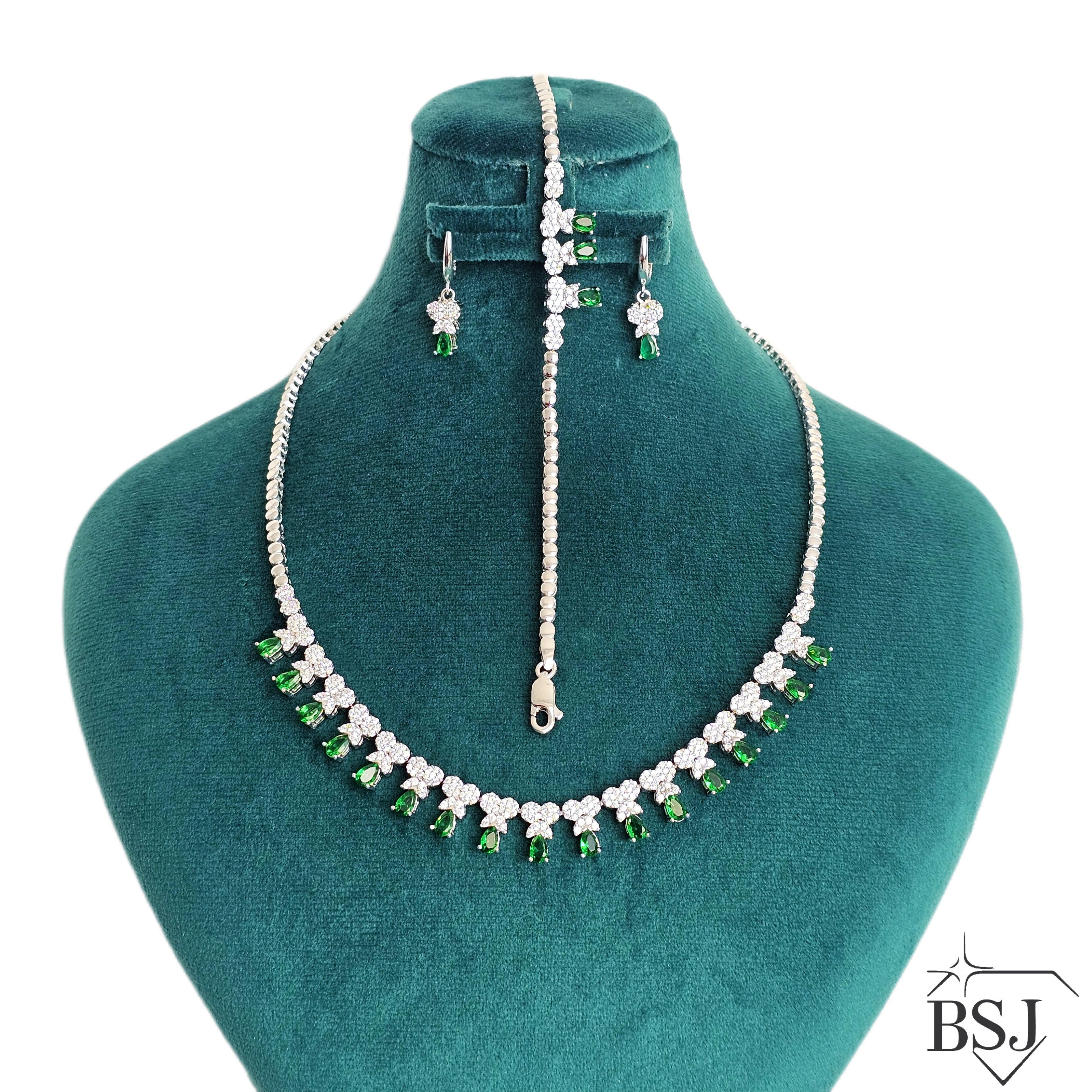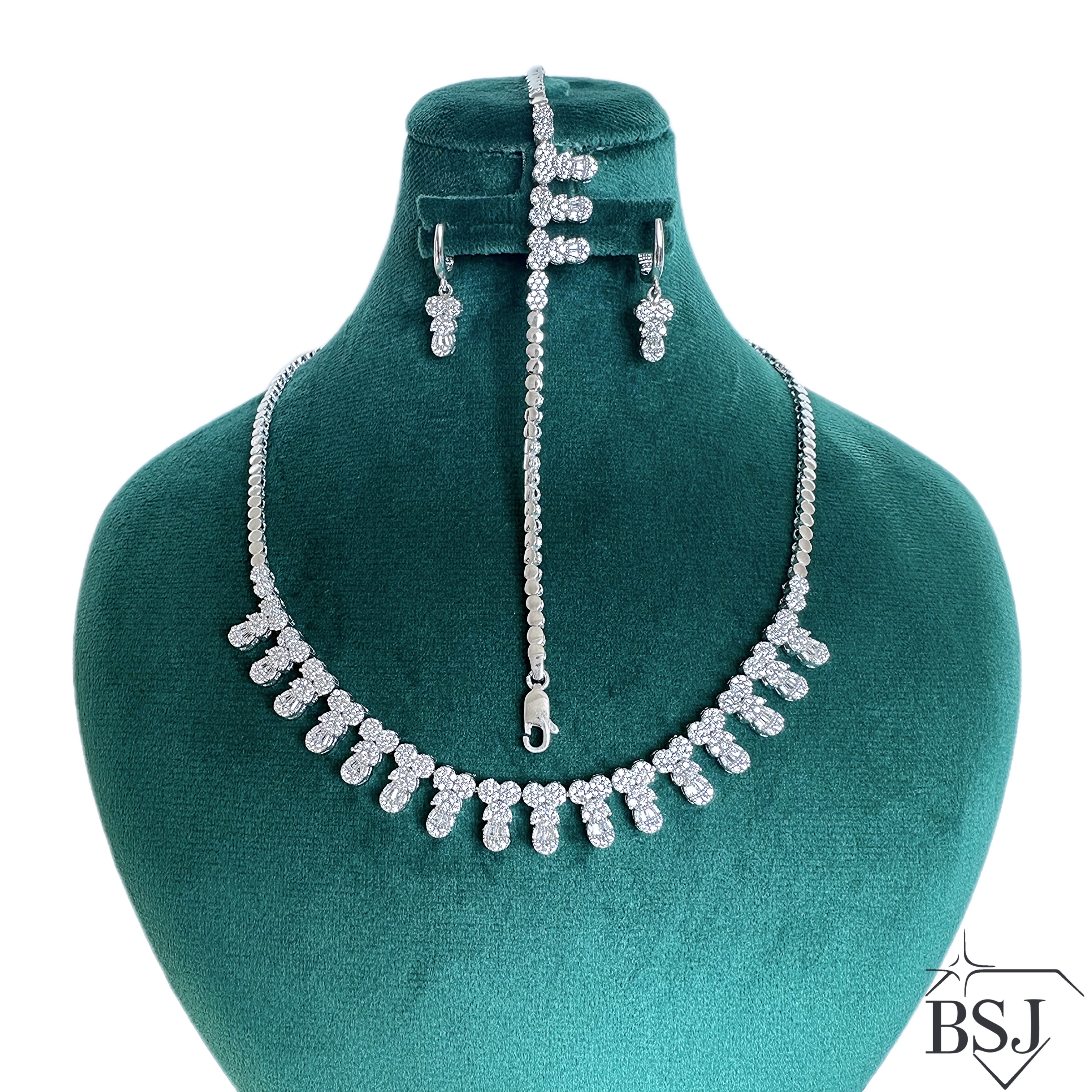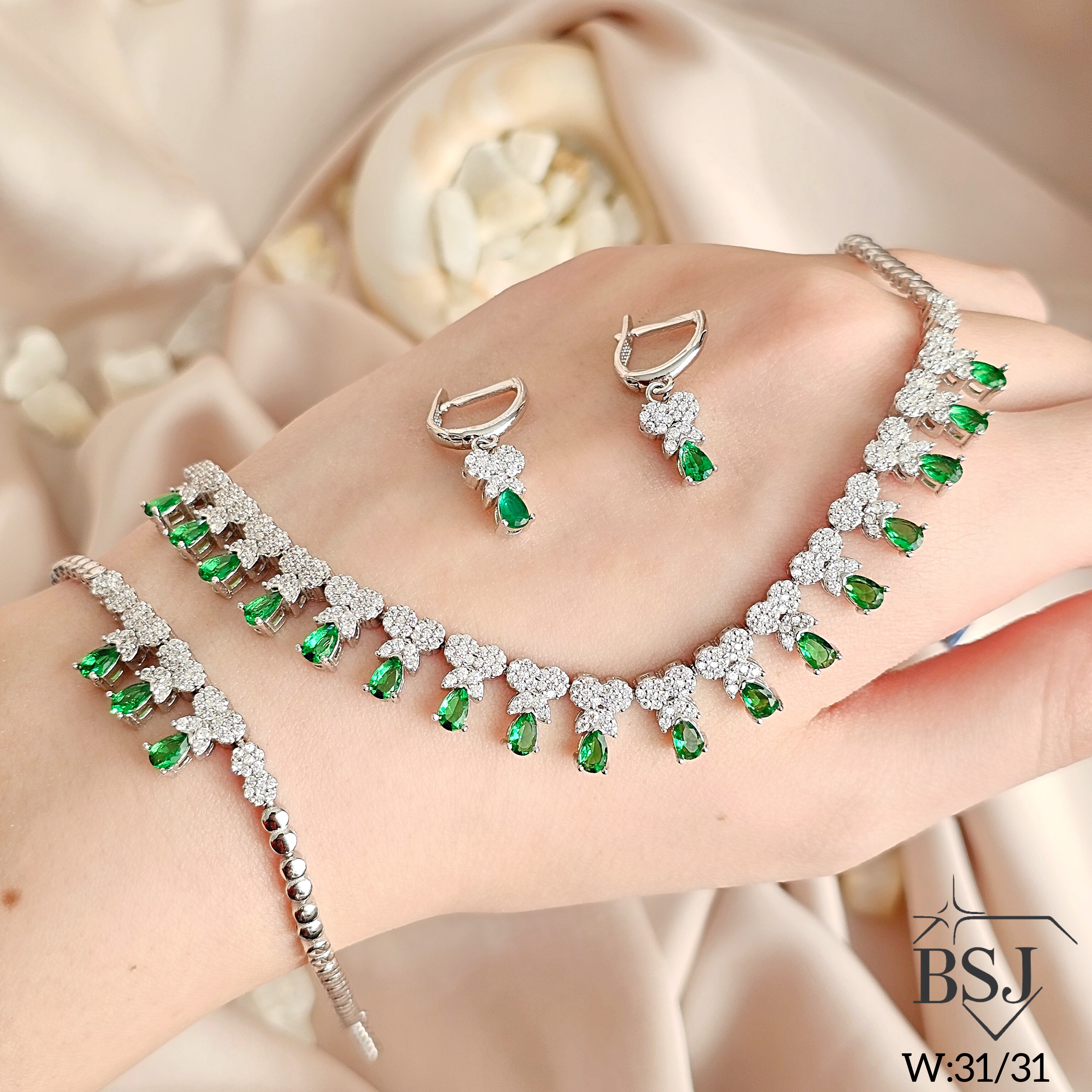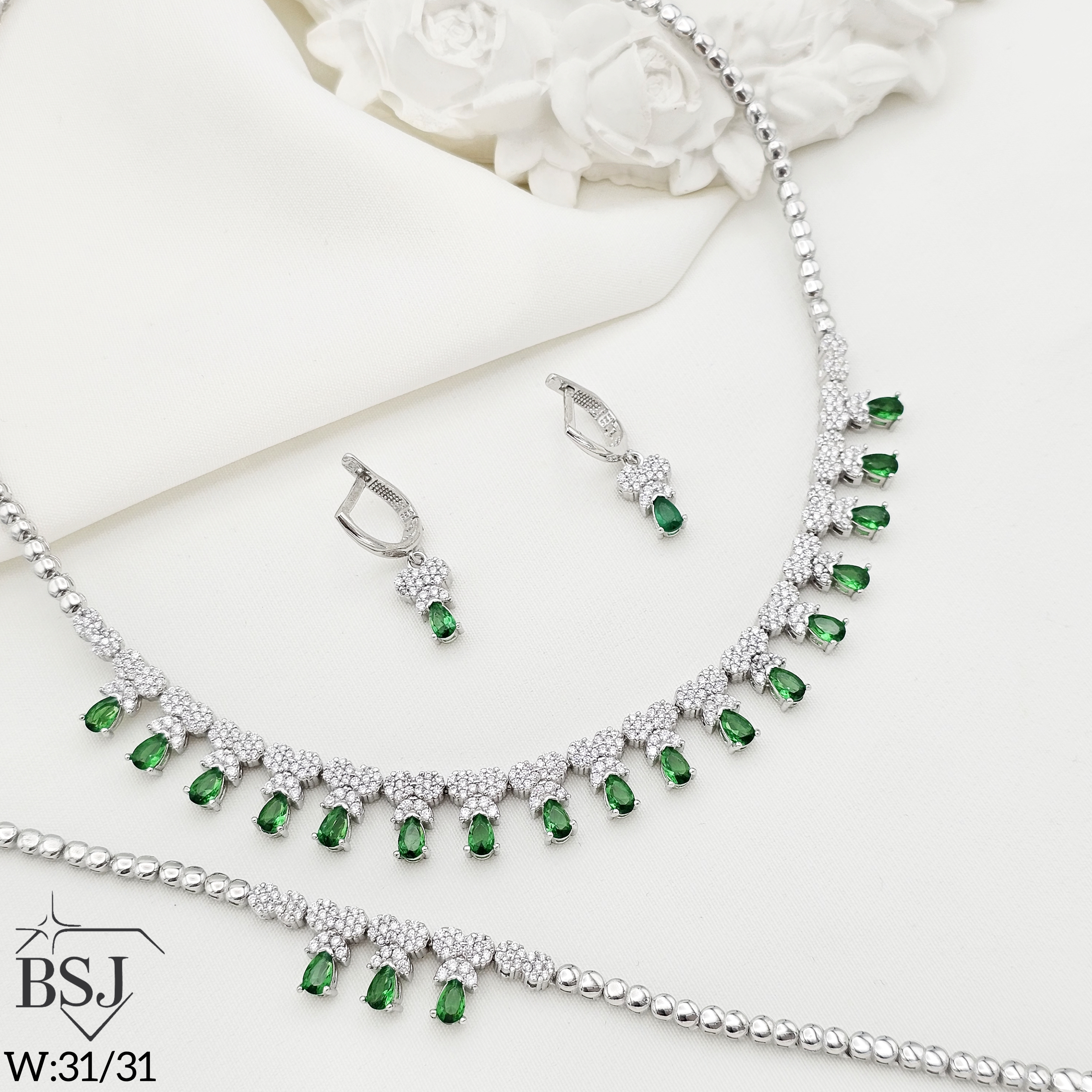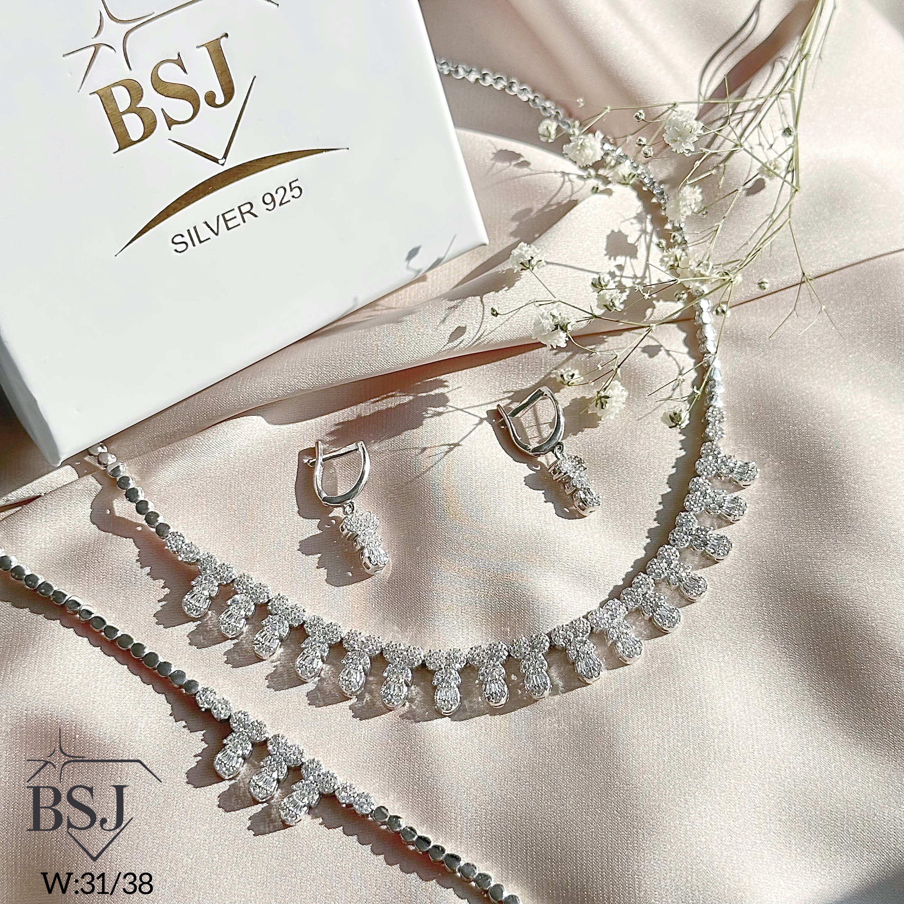 سرویس نقره جواهری زنانه BSJ_S588 از سرویس های مجلسی ساخته شده از نقره با عیار 925 می باشد.سنگ های به کار رفته در آن برلیان و از جنس اتمی زیرکونیا می باشند که به صورت میکروستینگ مخراج کاری شده اند و در برابر ضربه مقاوم اند.آبکاری دو مرحله ای رودیوم (طلا سفید)، سبب کیفیت بی نظیر دوام رنگ آن شده است و به دلیل عدم استفاده از نیکل در ساختار آن، بدون حساسیت بوده و با پوست حساس سازگار است.به دلیل کیفیت فوق العاده و درخشش عالی سنگ ها، تفاوتی با نمونه طلا ندارد.وزن سرویس31.38 گرم می باشد.