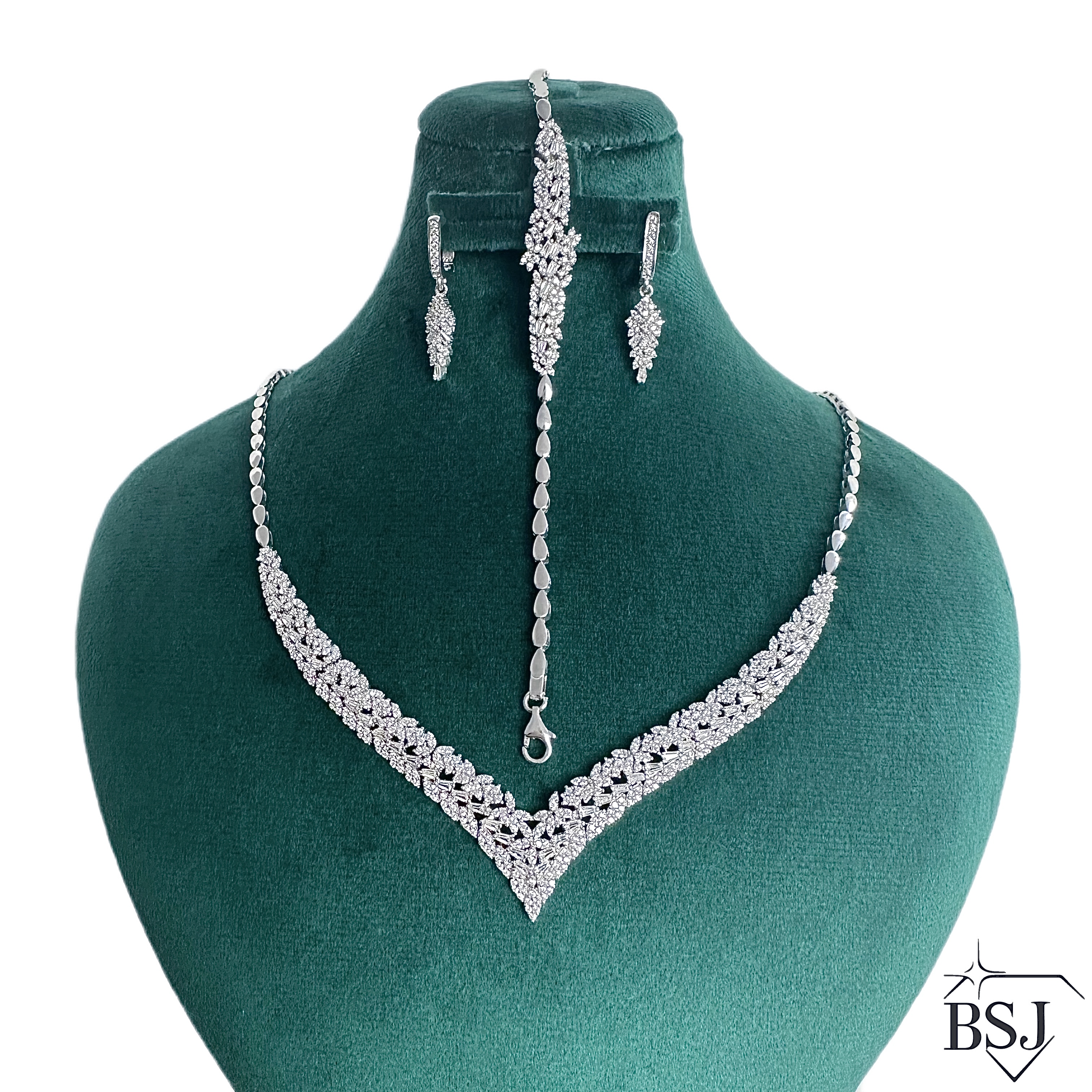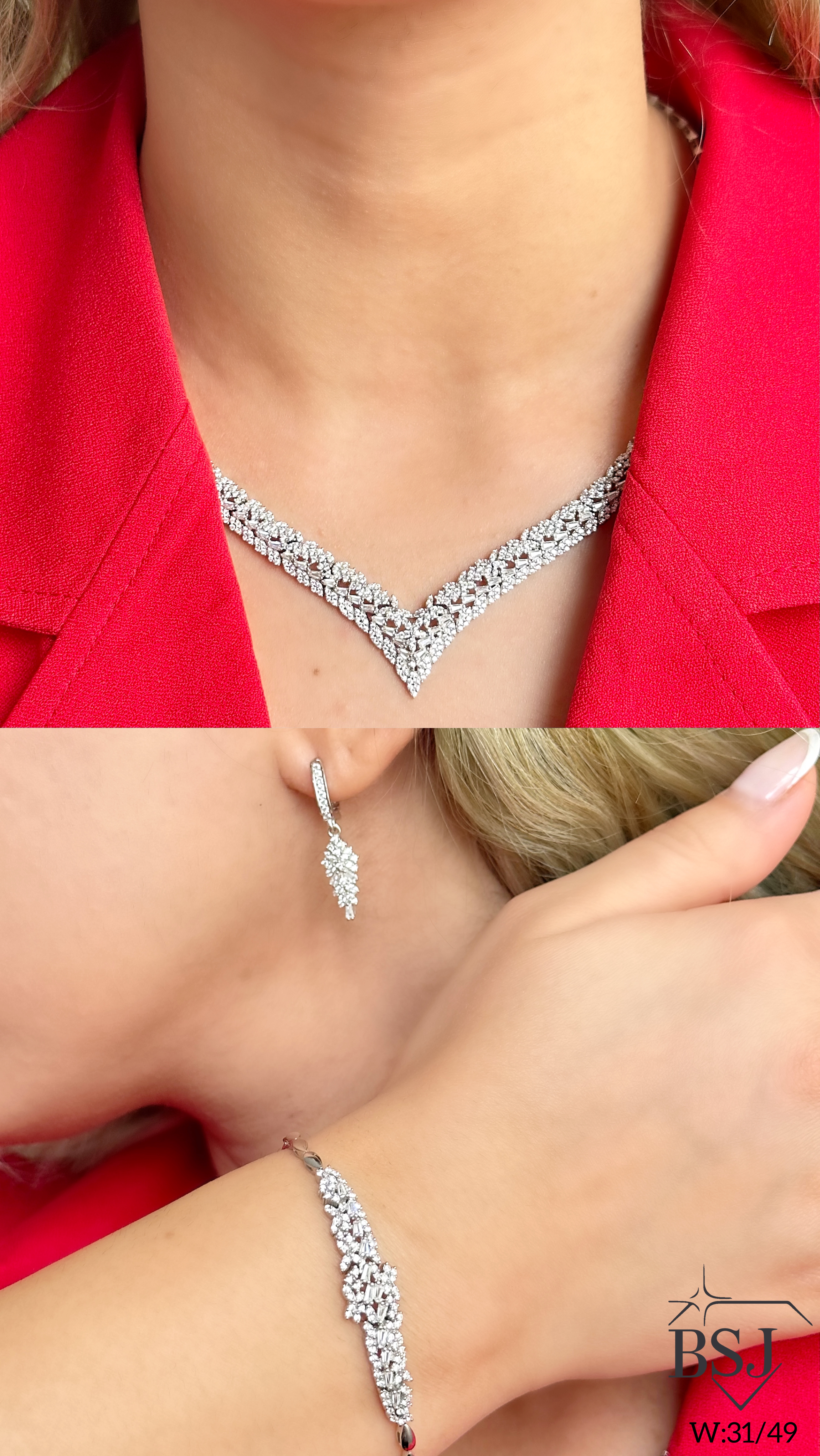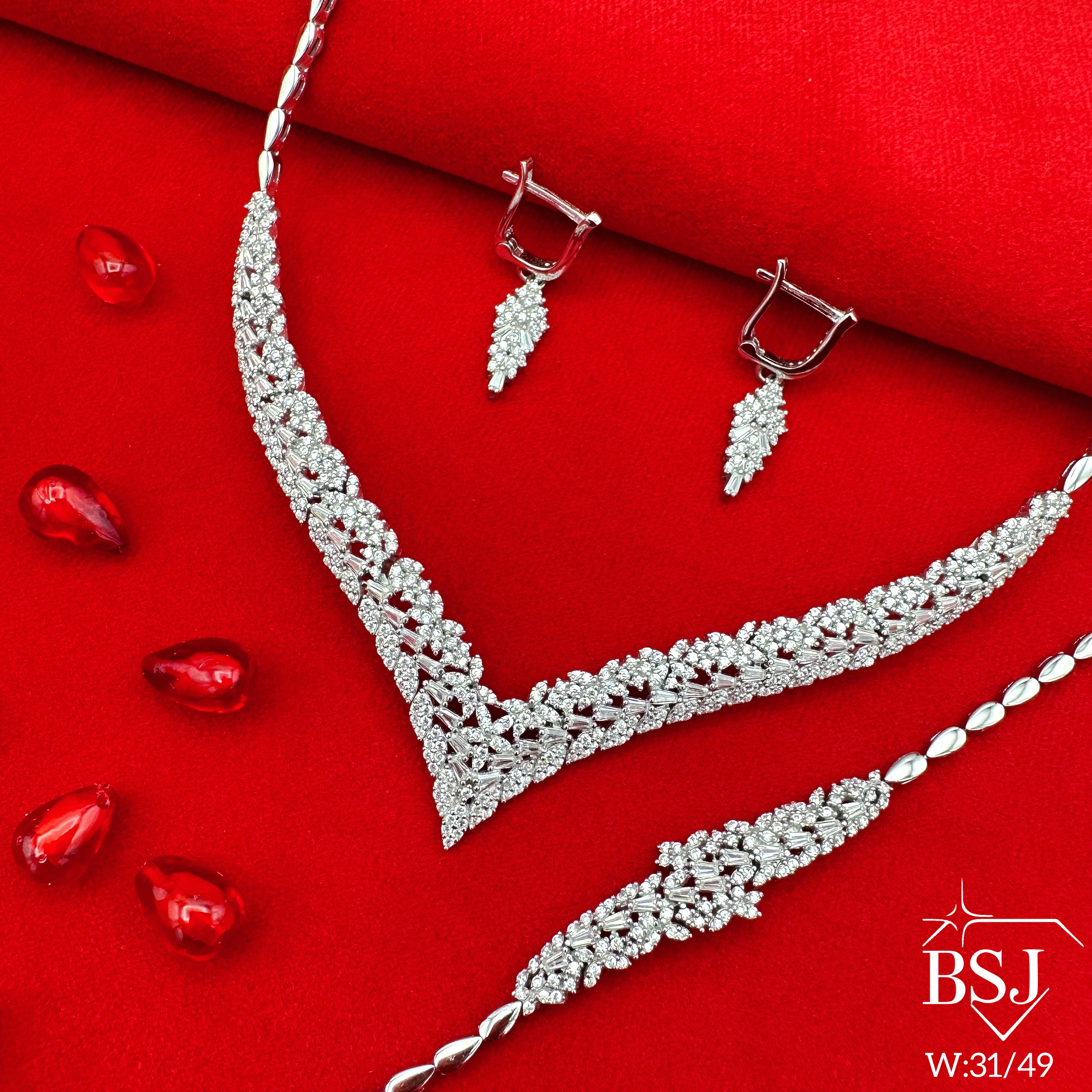 سرویس نقره جواهری زنانه BSJ_S594 از سرویس های اعیانی ساخته شده از نقره با عیار 925 می باشد.سنگ های به کار رفته در آن برلیان و امرالد از جنس اتمی زیرکونیا می باشند که به صورت میکروستینگ مخراج کاری شده اند و در برابر ضربه مقاوم اند.آبکاری دو مرحله ای رودیوم (طلا سفید)، سبب کیفیت بی نظیر دوام رنگ آن شده است و به دلیل عدم استفاده از نیکل در ساختار آن، بدون حساسیت بوده و با پوست حساس سازگار است.به دلیل کیفیت فوق العاده و درخشش عالی سنگ ها، تفاوتی با نمونه طلا ندارد.وزن سرویس +-31.49 گرم می باشد.