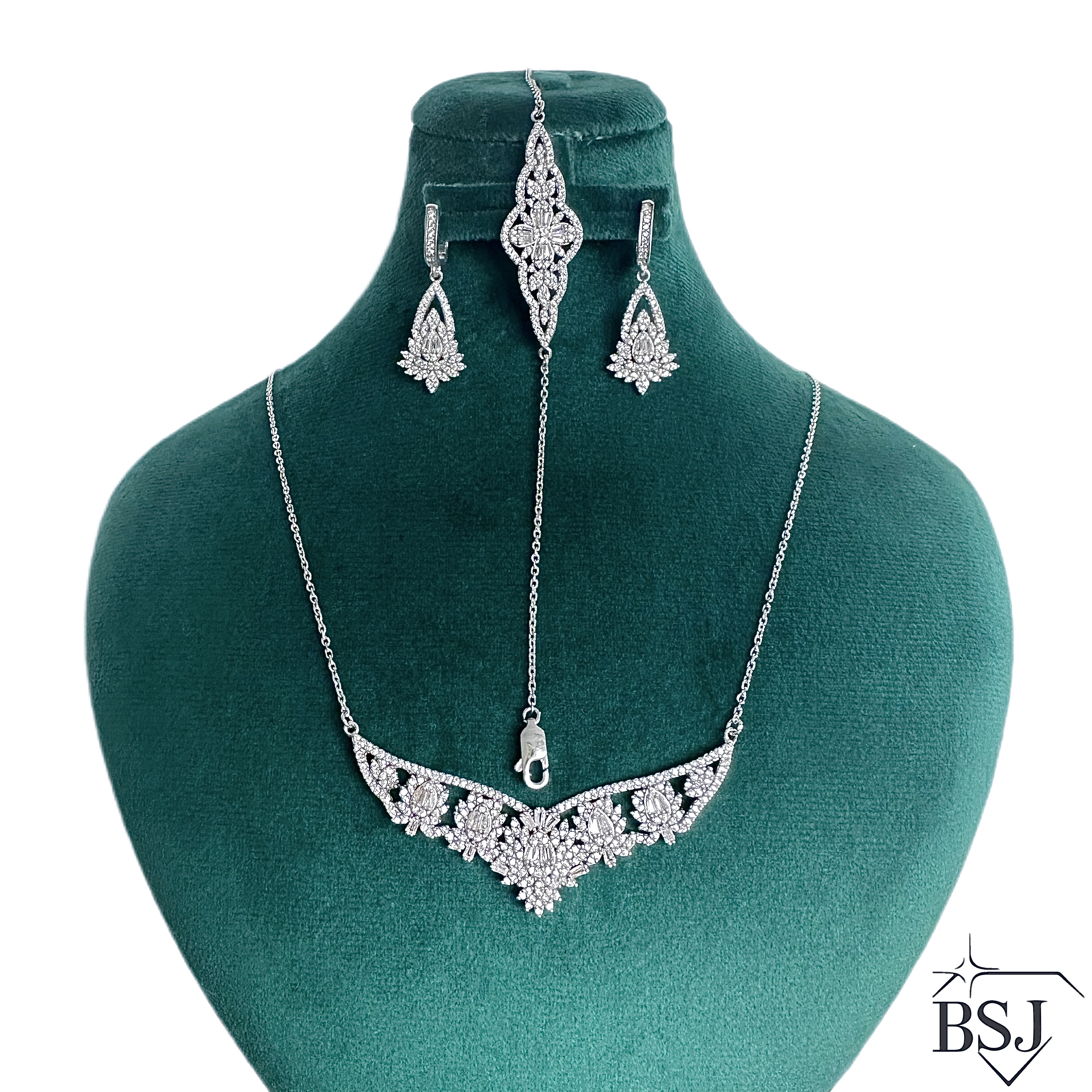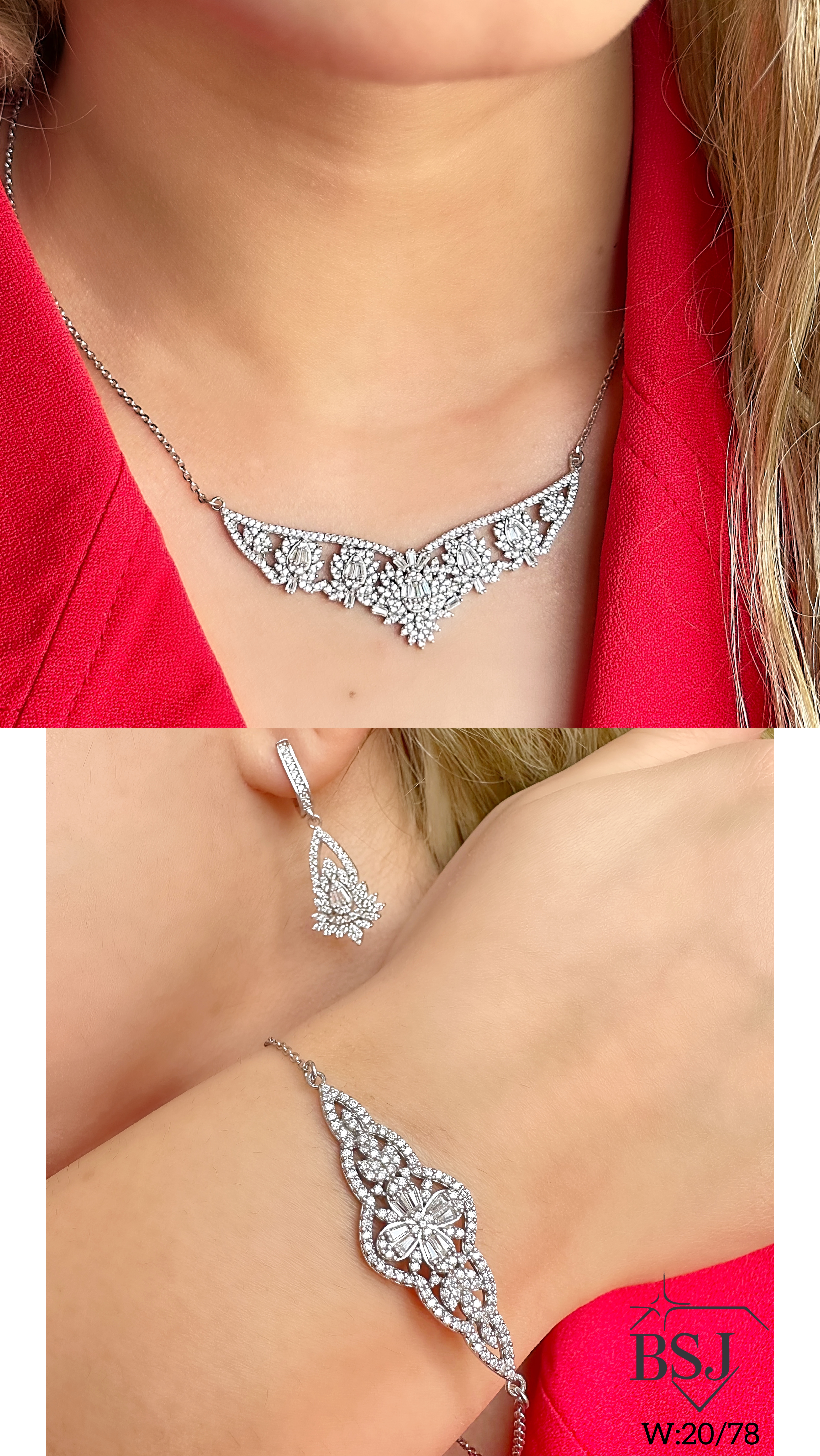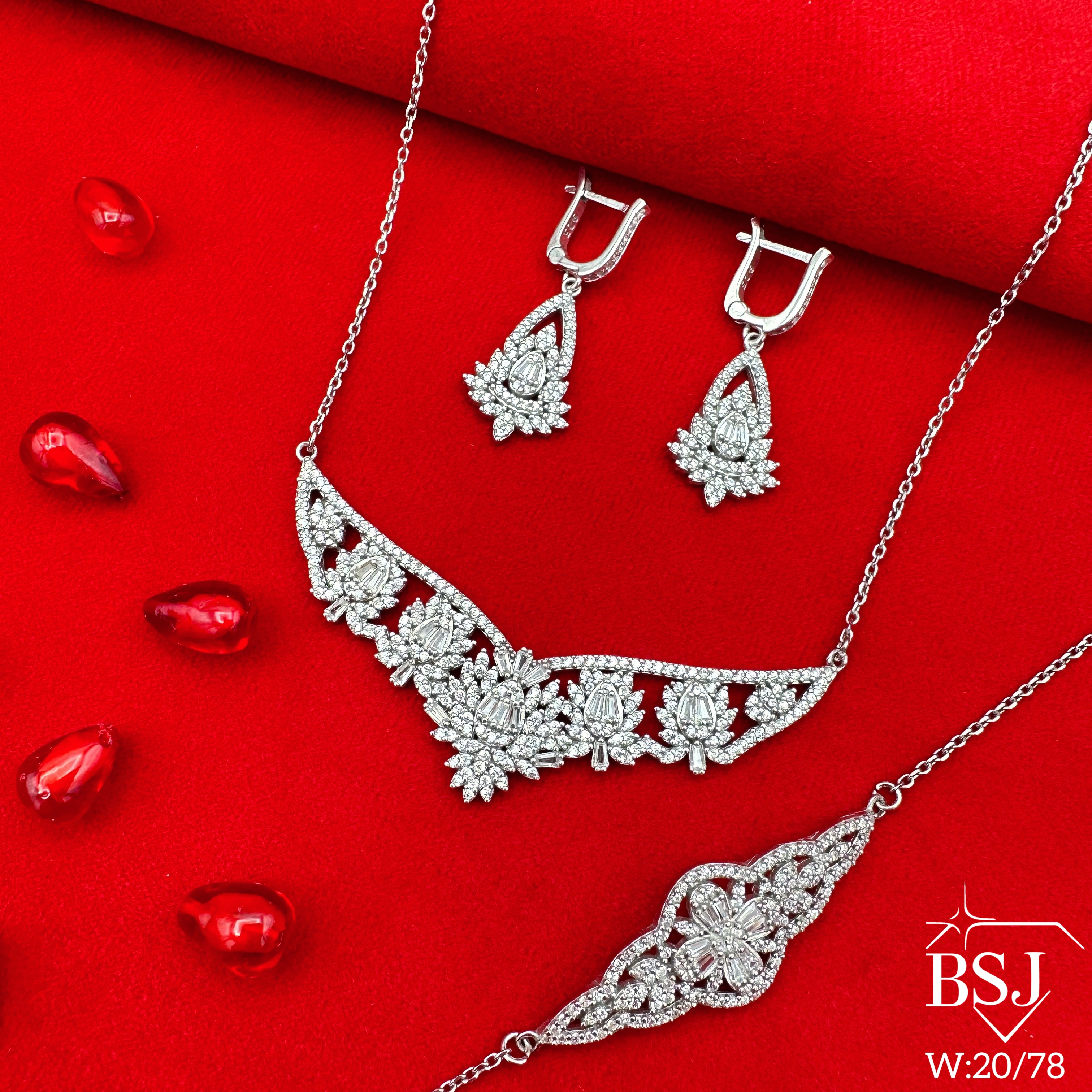 سرویس نقره جواهری زنانه BSJ_S595 از سرویس های زنجیری ساخته شده از نقره با عیار 925 می باشد.سنگ های به کار رفته در آن برلیان و امرالد از جنس اتمی زیرکونیا می باشند که به صورت میکروستینگ مخراج کاری شده اند و در برابر ضربه مقاوم اند.آبکاری دو مرحله ای رودیوم (طلا سفید)، سبب کیفیت بی نظیر دوام رنگ آن شده است و به دلیل عدم استفاده از نیکل در ساختار آن، بدون حساسیت بوده و با پوست حساس سازگار است.به دلیل کیفیت فوق العاده و درخشش عالی سنگ ها، تفاوتی با نمونه طلا ندارد.وزن سرویس +-20.78 گرم می باشد.