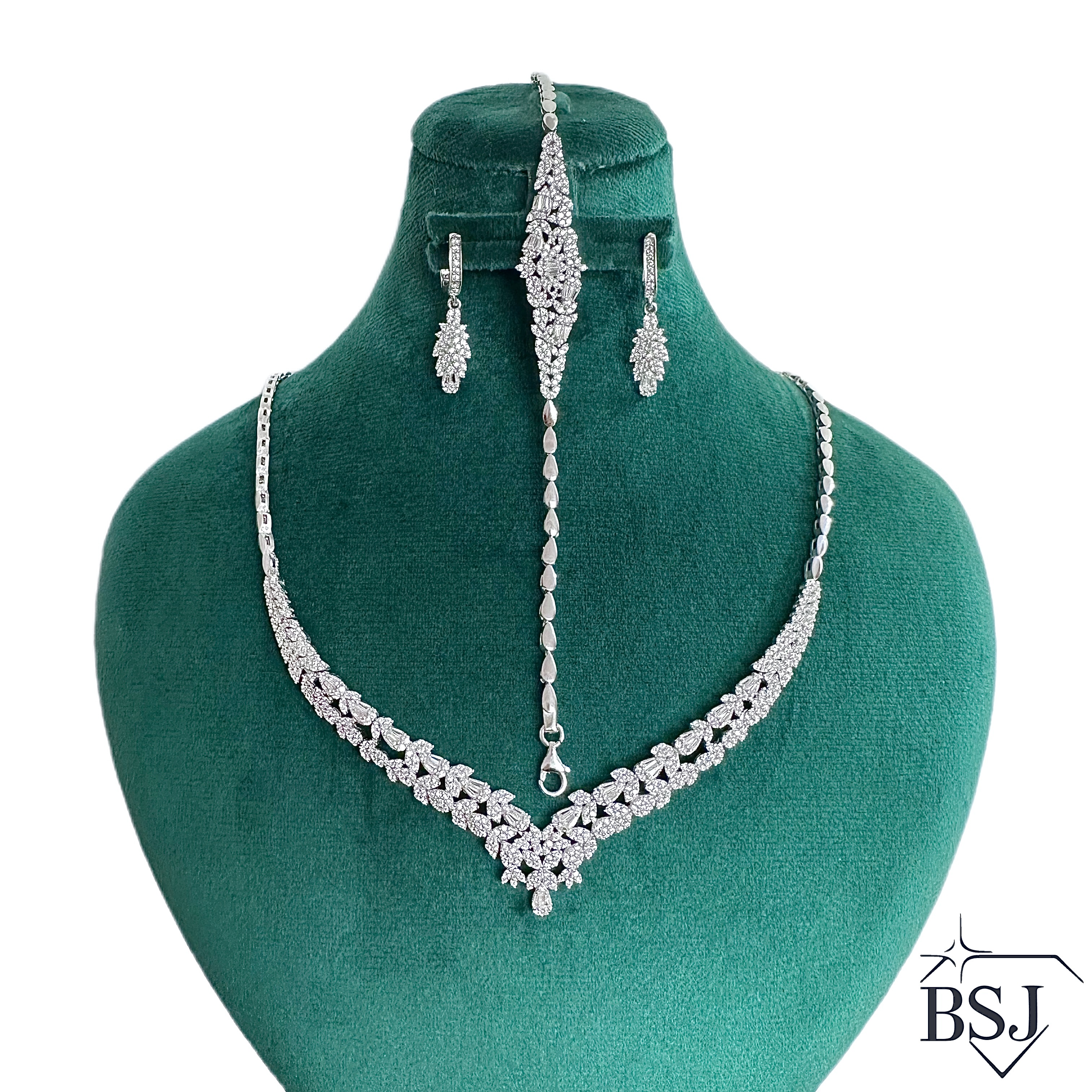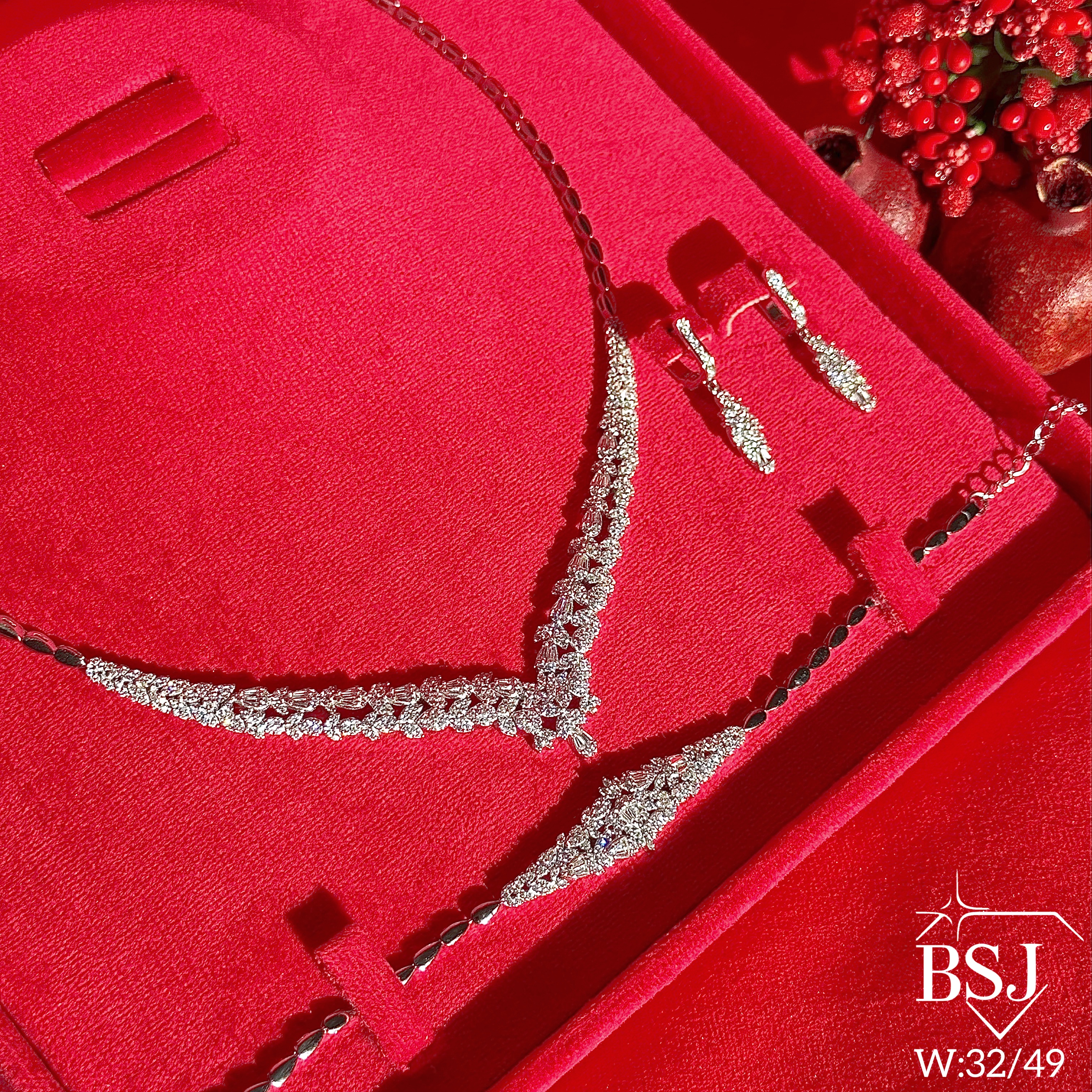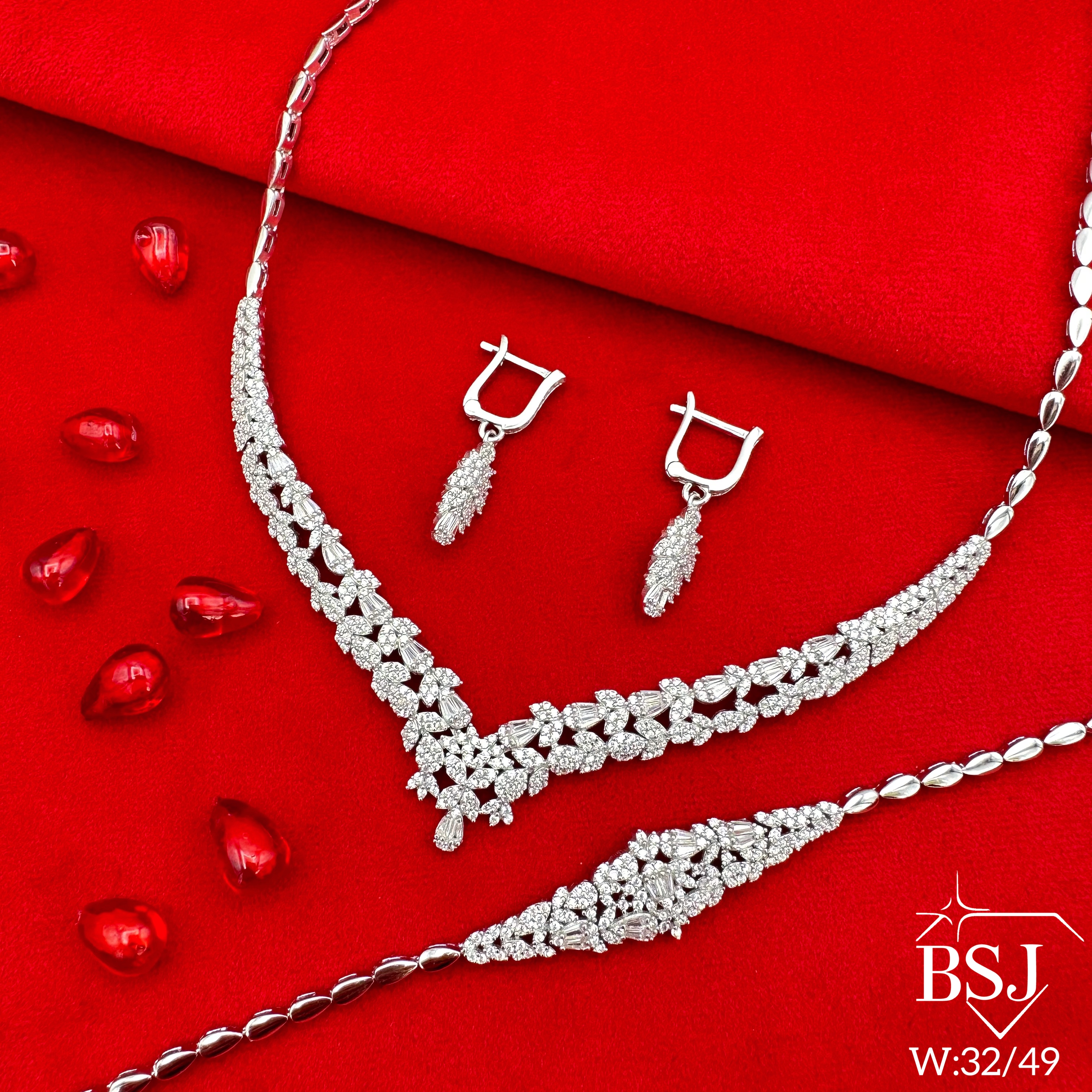 سرویس نقره جواهری زنانه BSJ_S597 از سرویس های اعیانی ساخته شده از نقره با عیار 925 می باشد.سنگ های به کار رفته در آن برلیان و امرالد از جنس اتمی زیرکونیا می باشند که به صورت میکروستینگ مخراج کاری شده اند و در برابر ضربه مقاوم اند.آبکاری دو مرحله ای رودیوم (طلا سفید)، سبب کیفیت بی نظیر دوام رنگ آن شده است و به دلیل عدم استفاده از نیکل در ساختار آن، بدون حساسیت بوده و با پوست حساس سازگار است.به دلیل کیفیت فوق العاده و درخشش عالی سنگ ها، تفاوتی با نمونه طلا ندارد.وزن سرویس +-32.49 گرم می باشد.